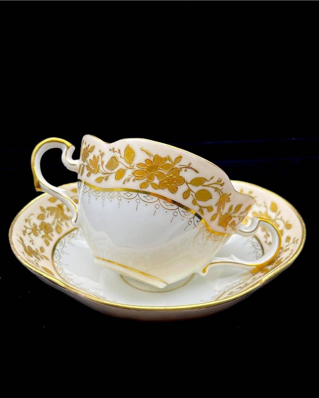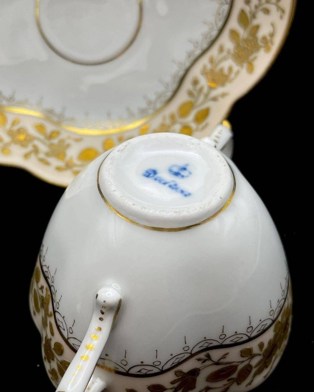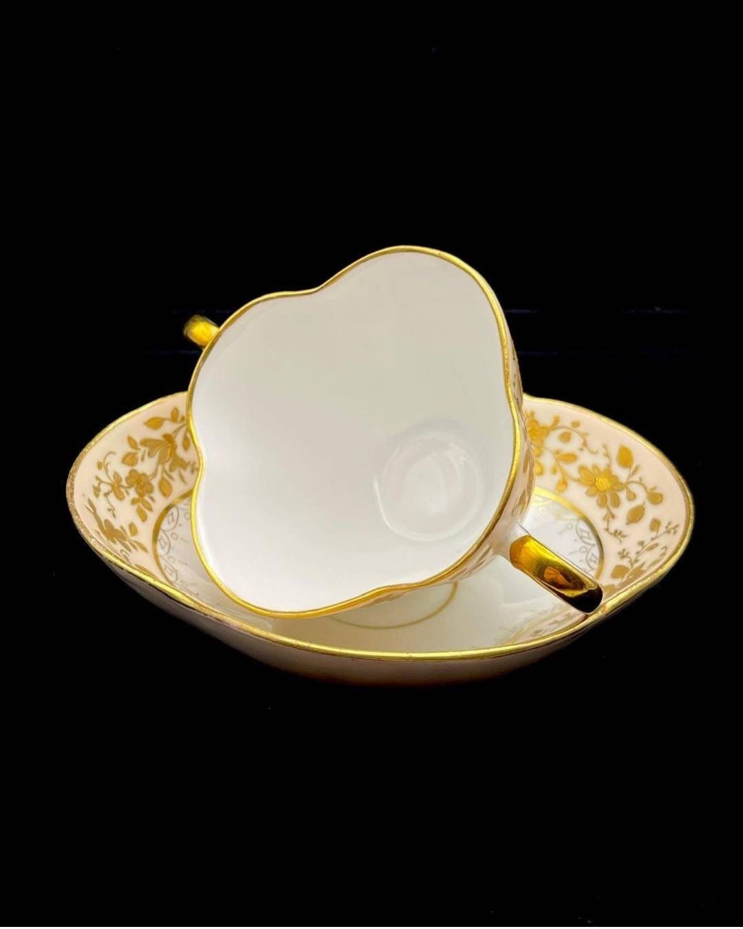 Antique hand painted Donath Dresden quatrefoil bouillon cups and saucers is in very good condition with no chips, cracks, crazing, or stains. Circa 1880s, the gold decorations remain crisp, bright, and intact. The pieces are white with a pinkish hued tan band decorated with gold floral and vine motifs. Each piece is marked on the bottom with the Blue Crown Donath Dresden mark. The saucers are 5-1/4” by 4-3/4”. The cups are 3-1/4” by 3-1/4” excluding handles. This is a beautiful set with little evidence of any use.
