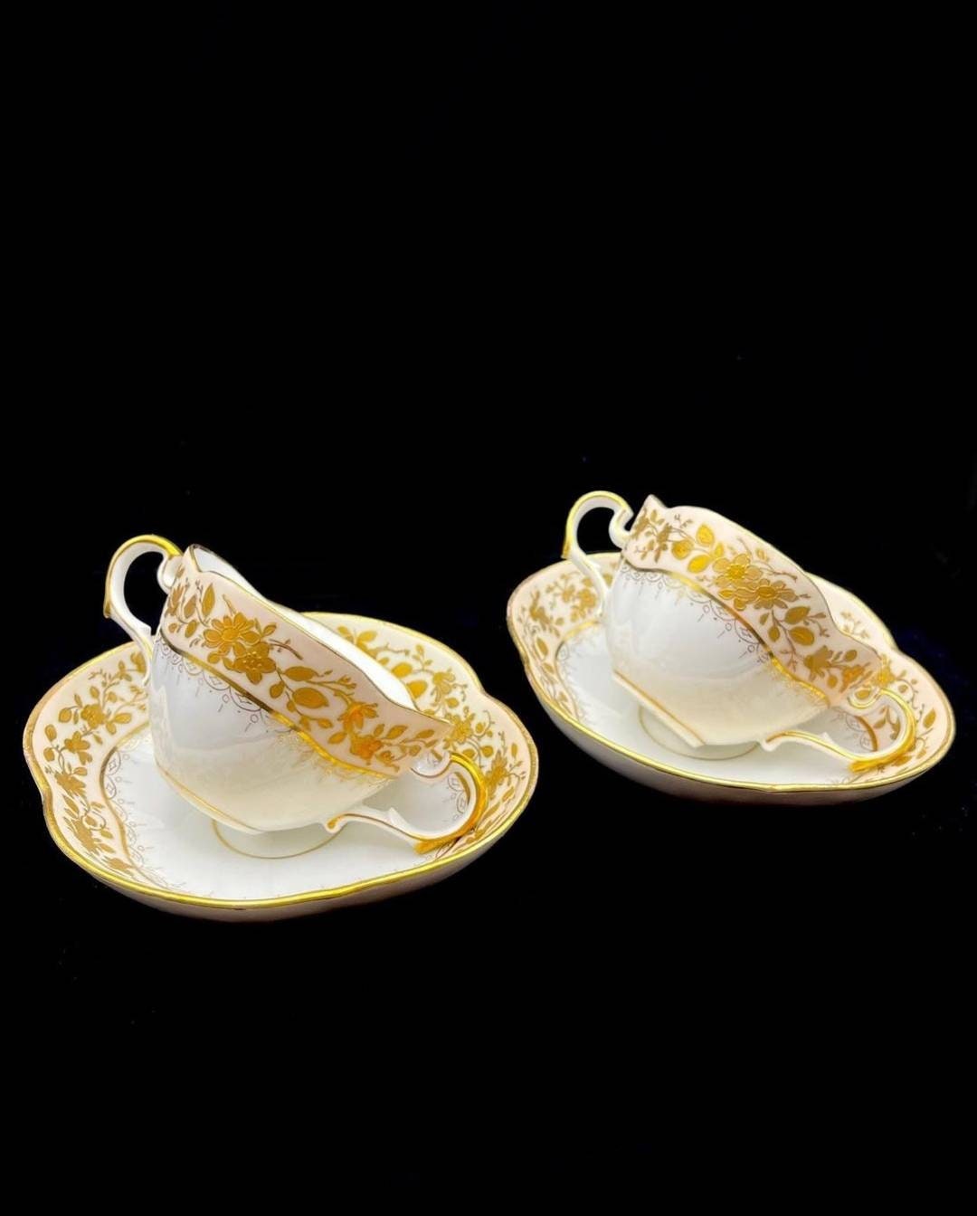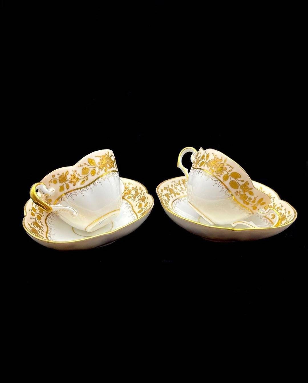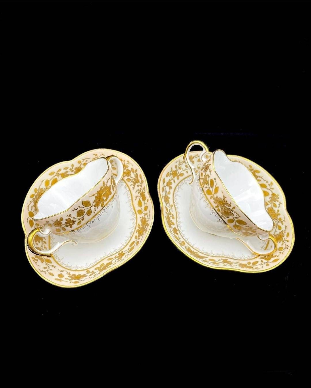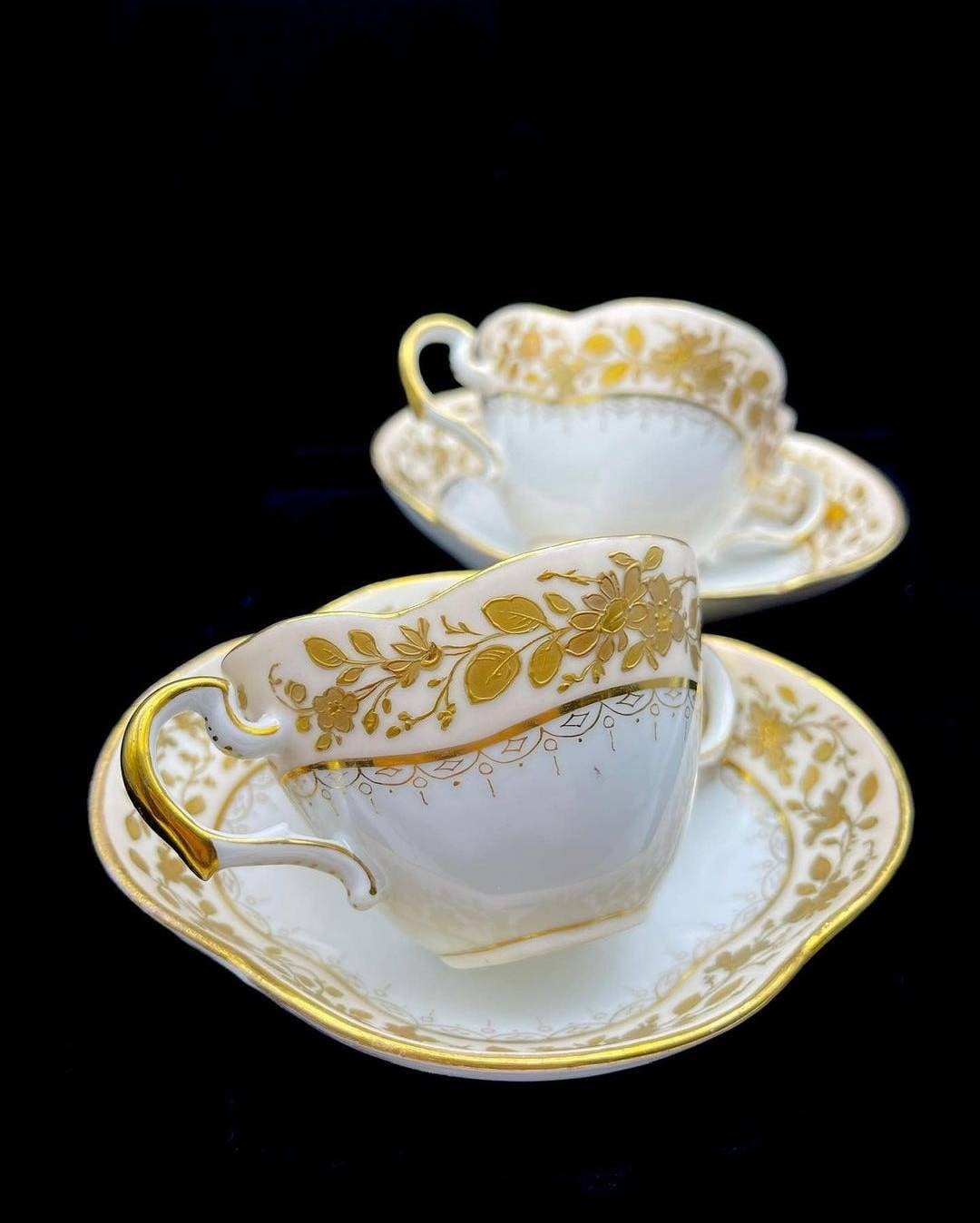 Antique hand painted Donath Dresden quatrefoil bouillon cups and saucers is in very good condition with no chips, cracks, crazing, or stains. Circa 1880s, the gold decorations remain crisp, bright, and intact. The pieces are white with a pinkish hued tan band decorated with gold floral and vine motifs. Each piece is marked on the bottom with the Blue Crown Donath Dresden mark. The saucers are 5-1/4” by 4-3/4”. The cups are 3-1/4” by 3-1/4” excluding handles. This is a beautiful set with little evidence of any use.