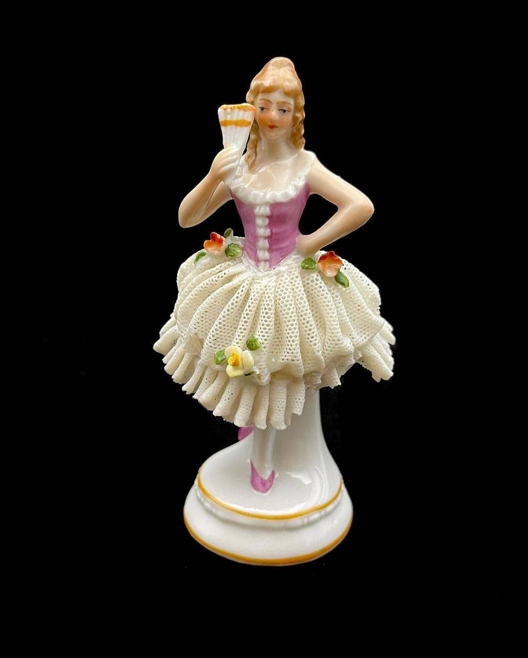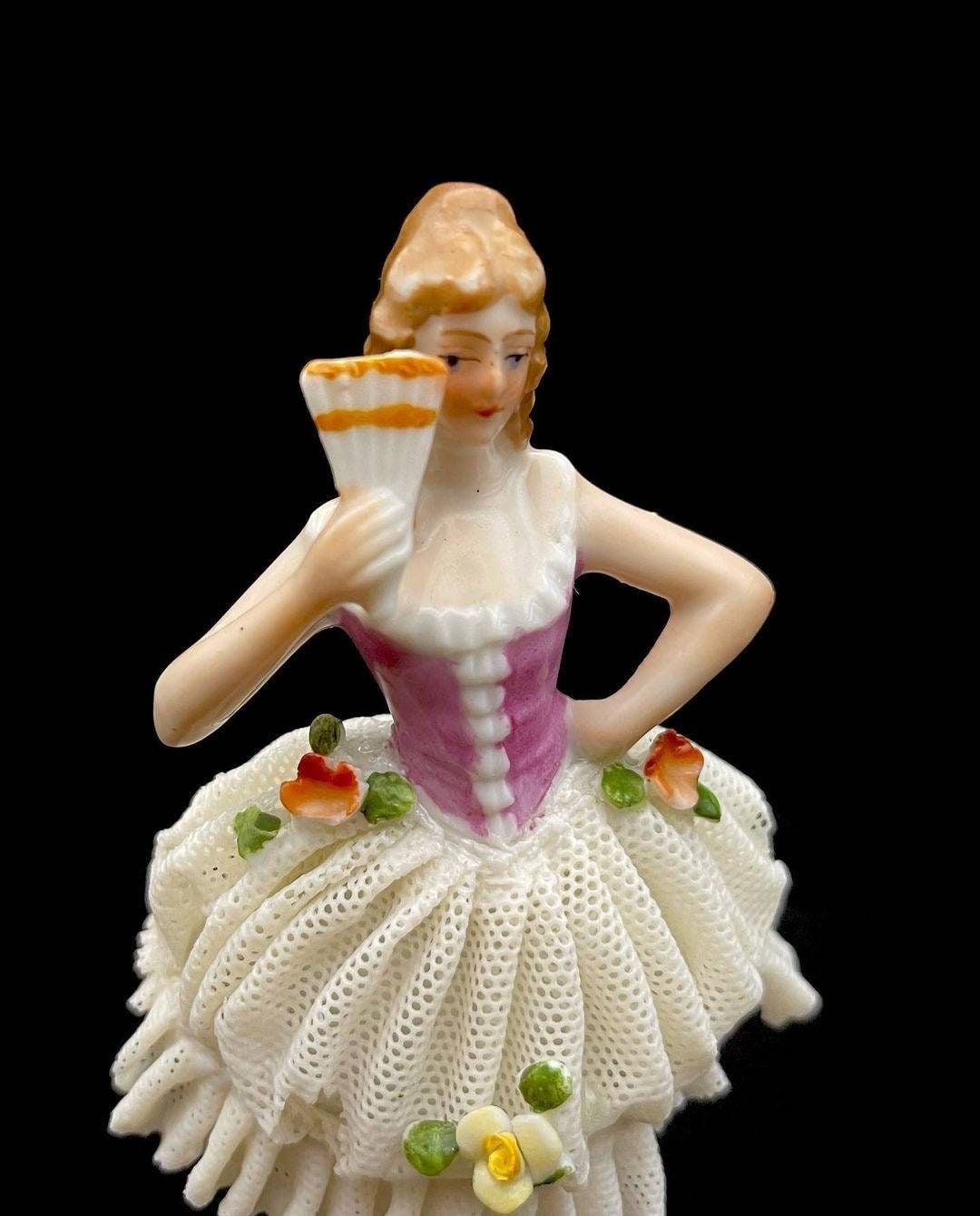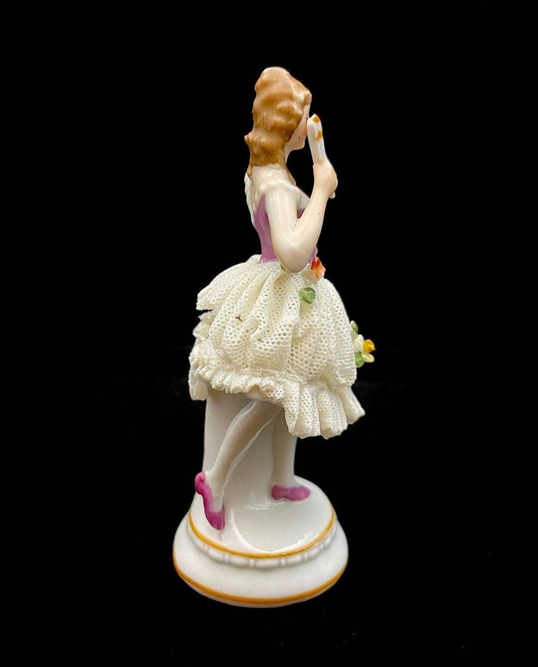 Vintage German Sitzendorf Lace Porcelain Figurine. The mark was used after 1918. She has all her fingers with no damage noted on them. She has a lace dress and have some damage to the lace. Please see the photos showing the damage. There are many lace porcelain marks but Sitzendorf is very rare.