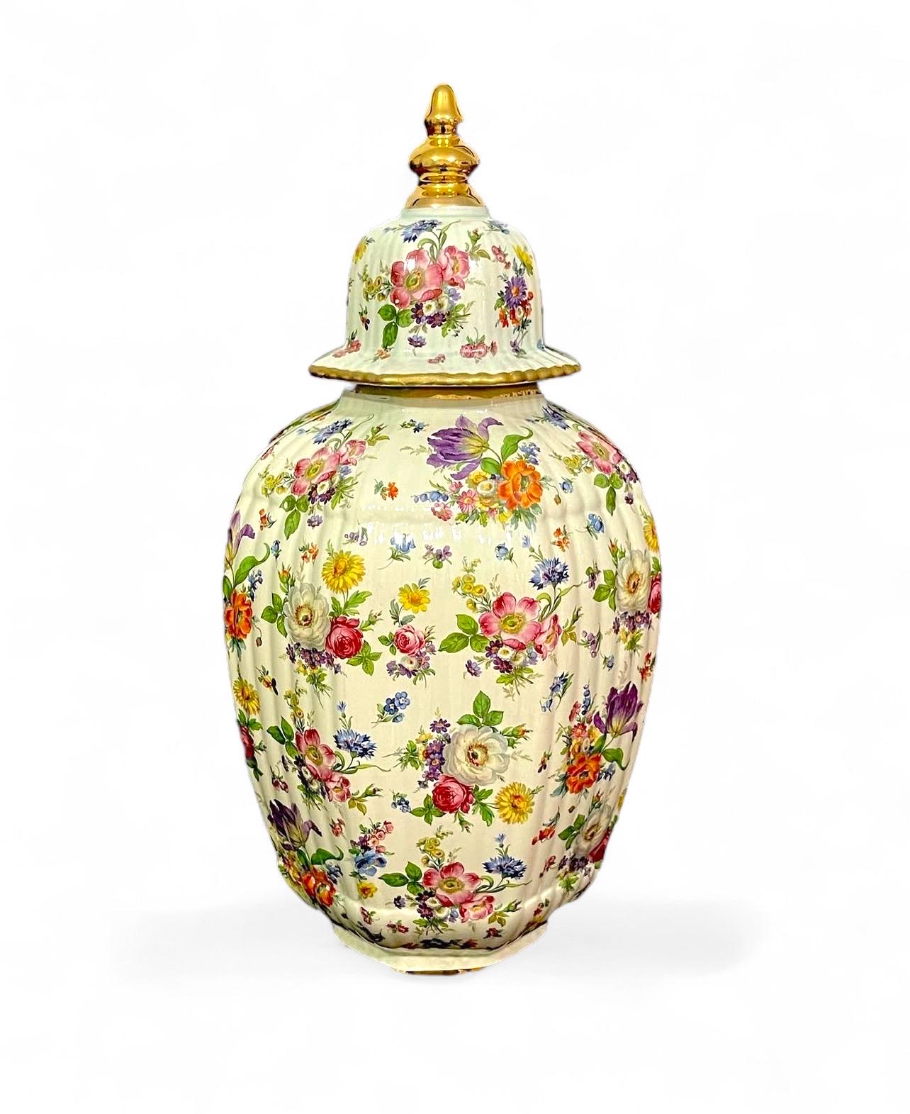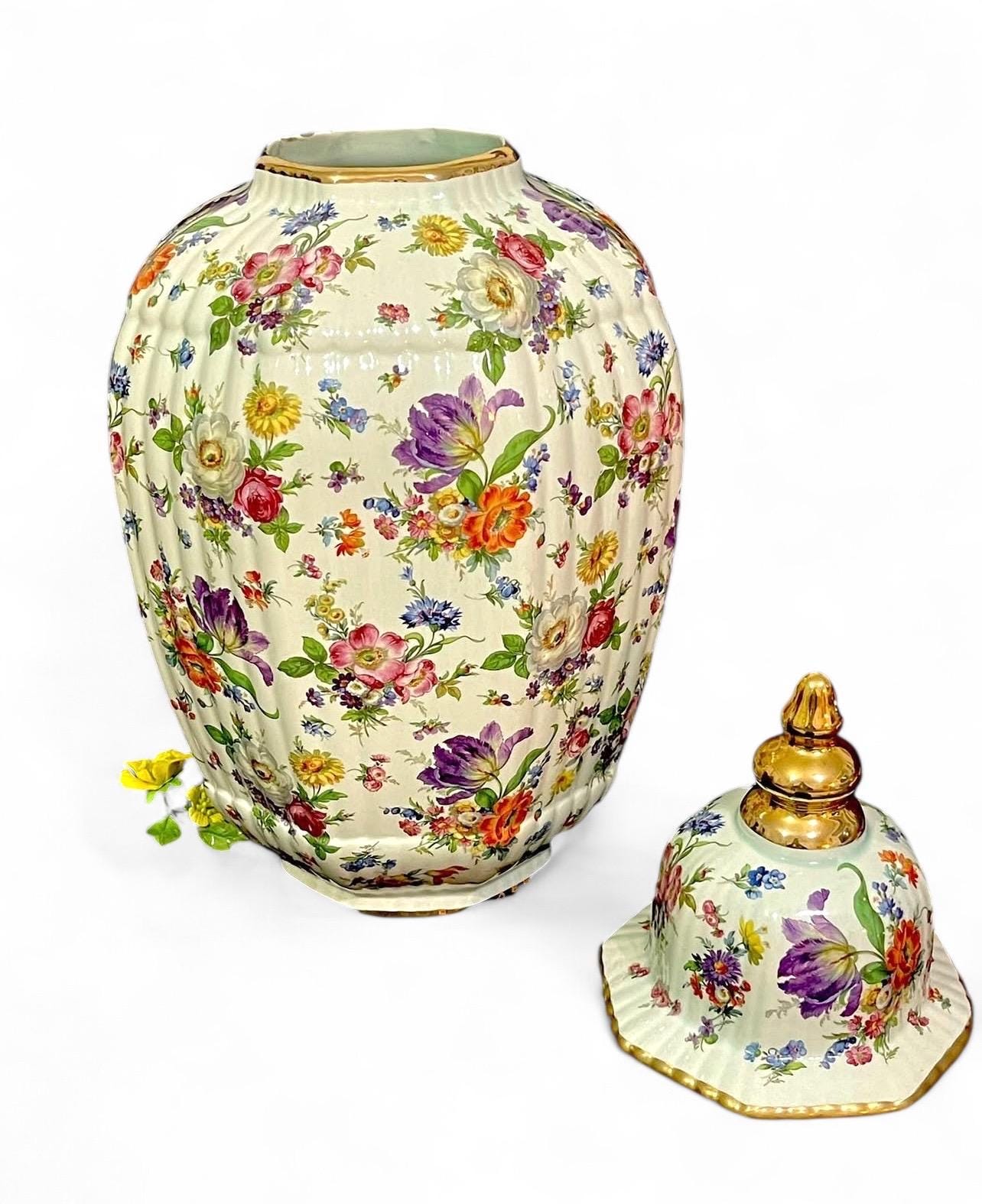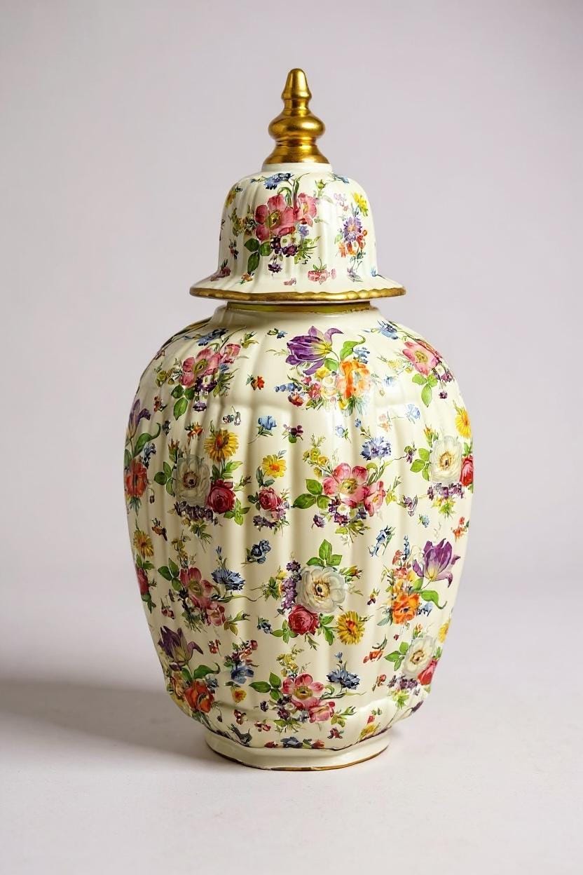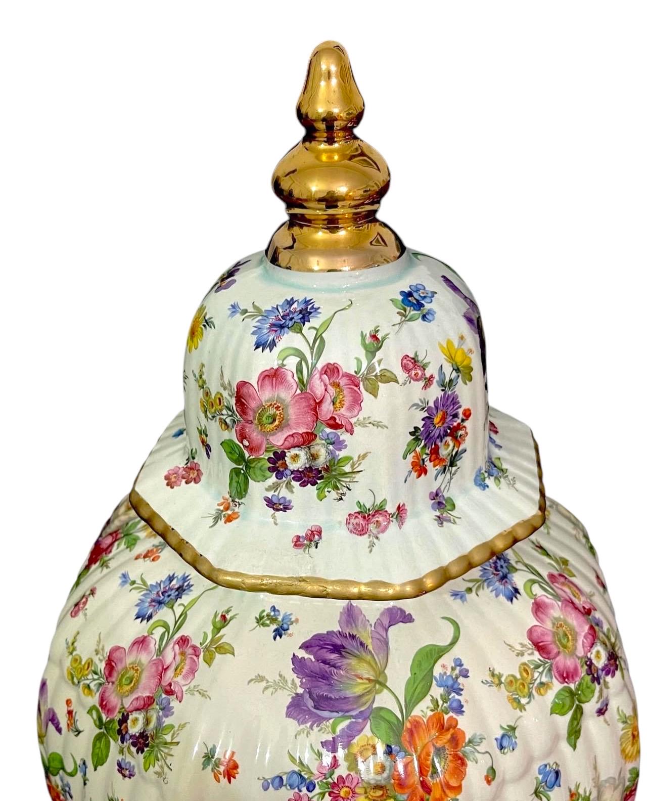 • Hand-Painted Floral Motifs: Vivid and detailed flower patterns covering the surface. • Gold Accents: Gilded highlights on the rim, lid, and base for an elegant finish. • Size: 51 cm (20 inches) in total height with lid. • Condition: Excellent antique condition; no chips, cracks, or repairs.
