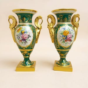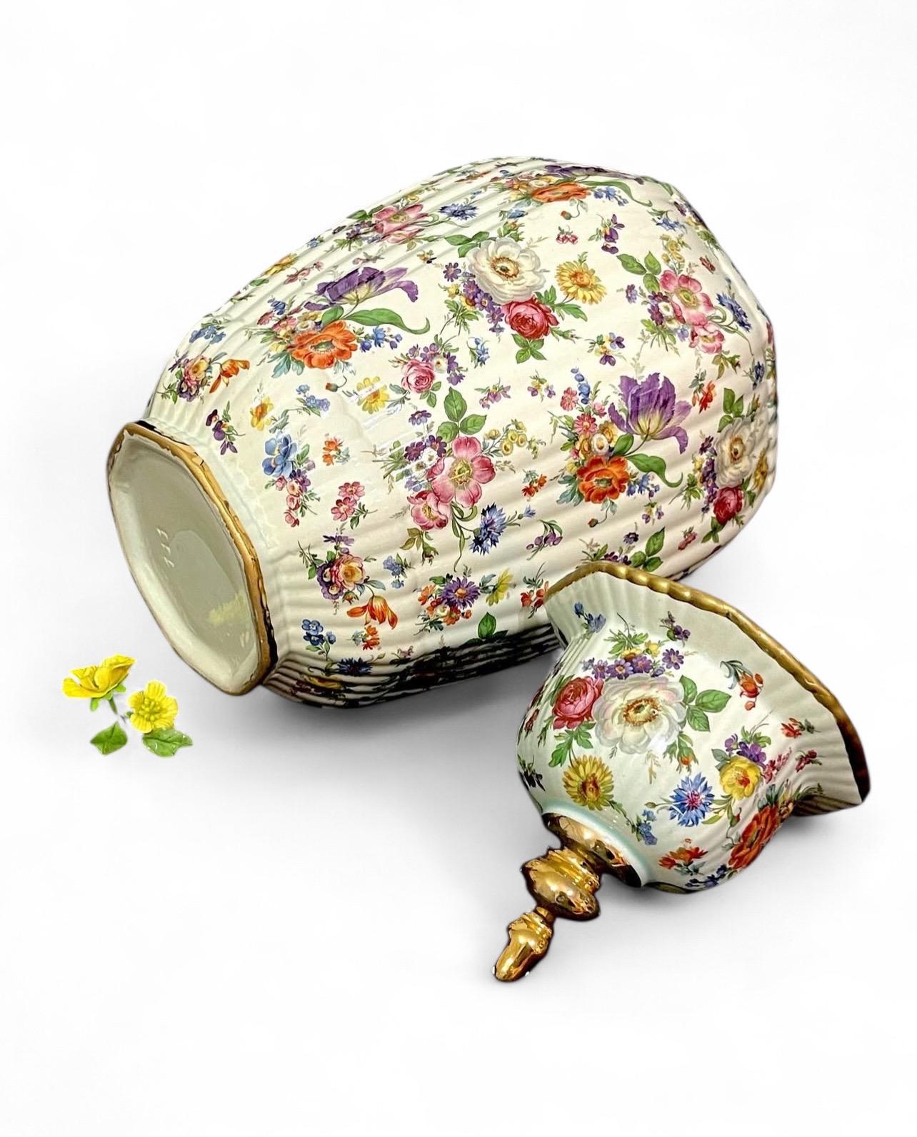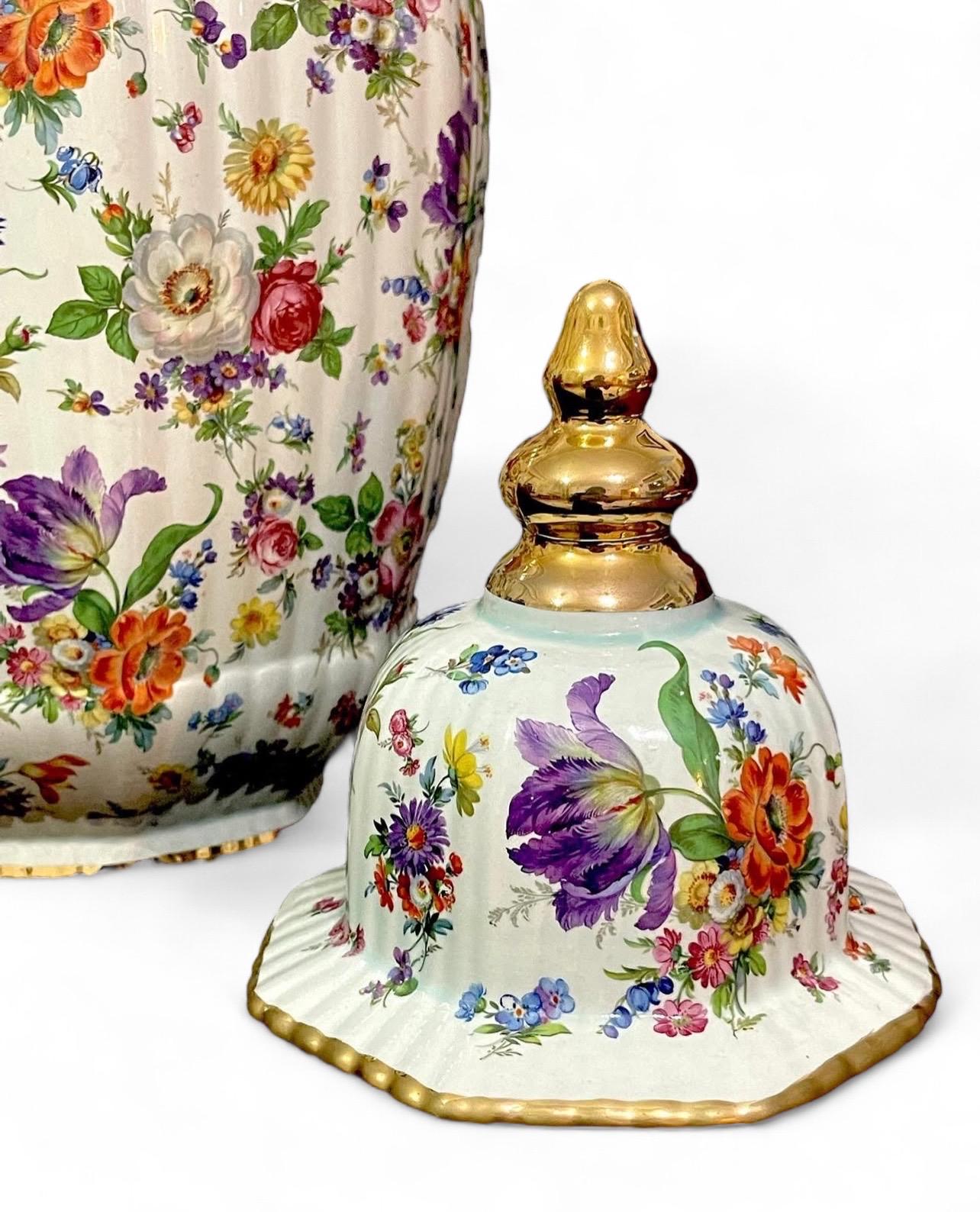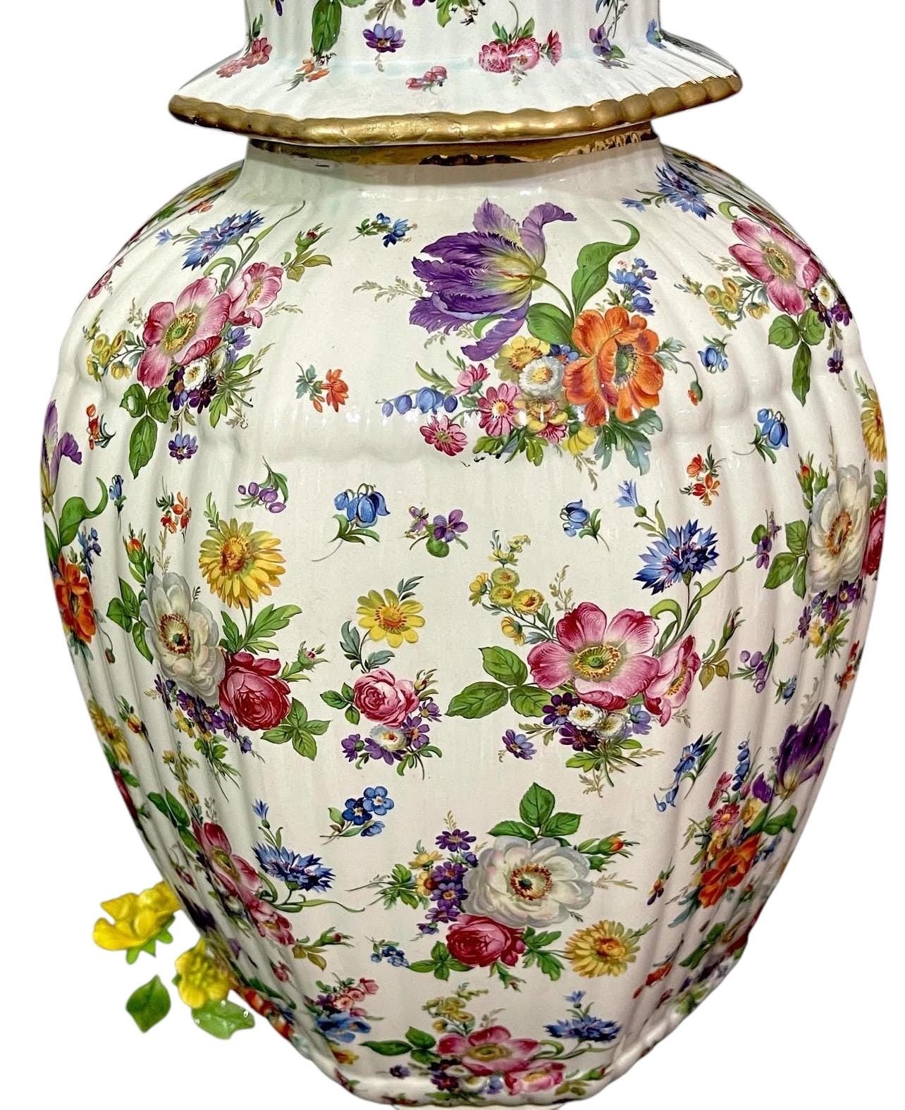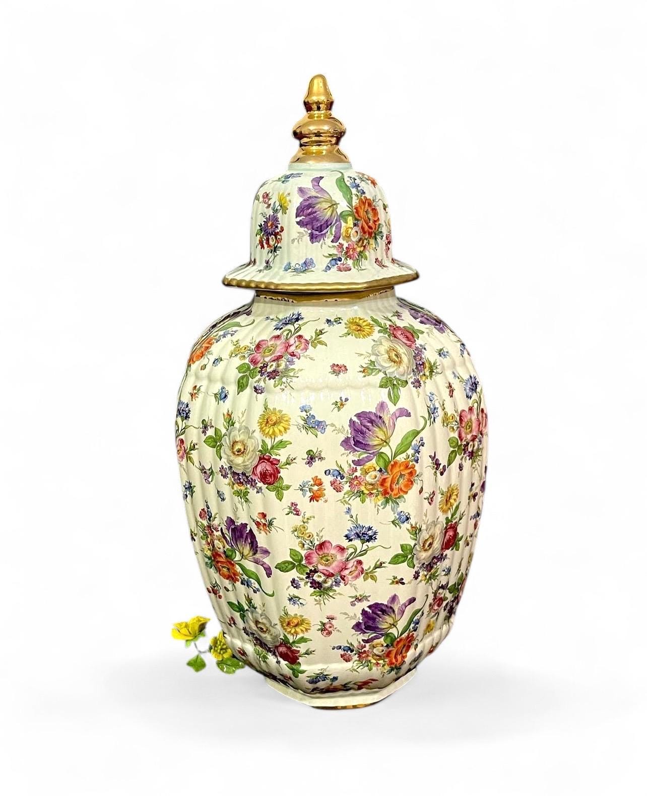 • Hand-Painted Floral Motifs: Vivid and detailed flower patterns covering the surface. • Gold Accents: Gilded highlights on the rim, lid, and base for an elegant finish. • Size: 51 cm (20 inches) in total height with lid. • Condition: Excellent antique condition; no chips, cracks, or repairs.