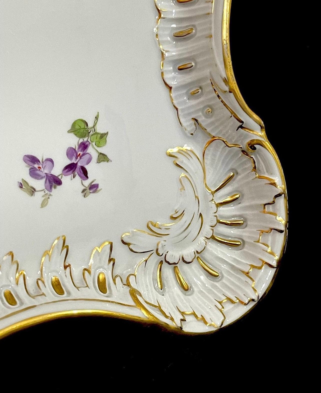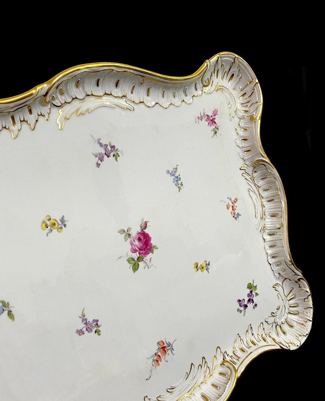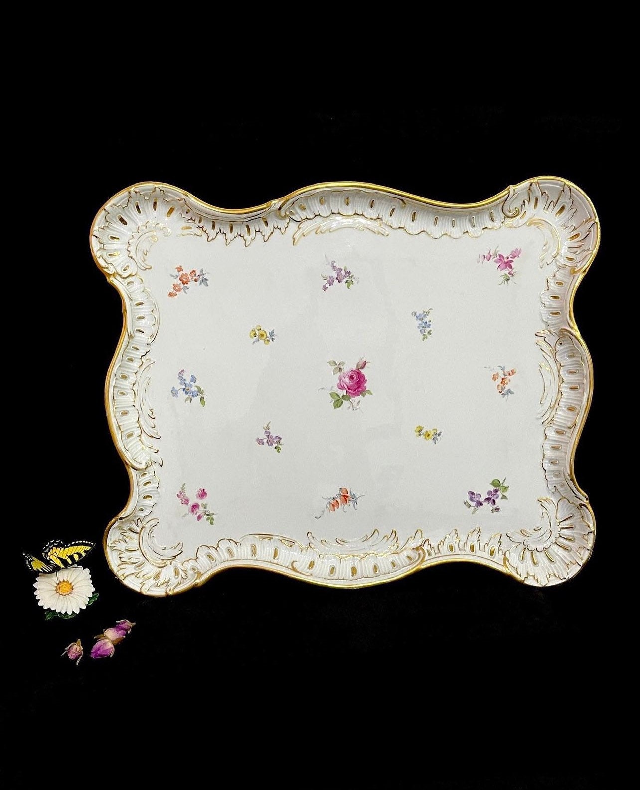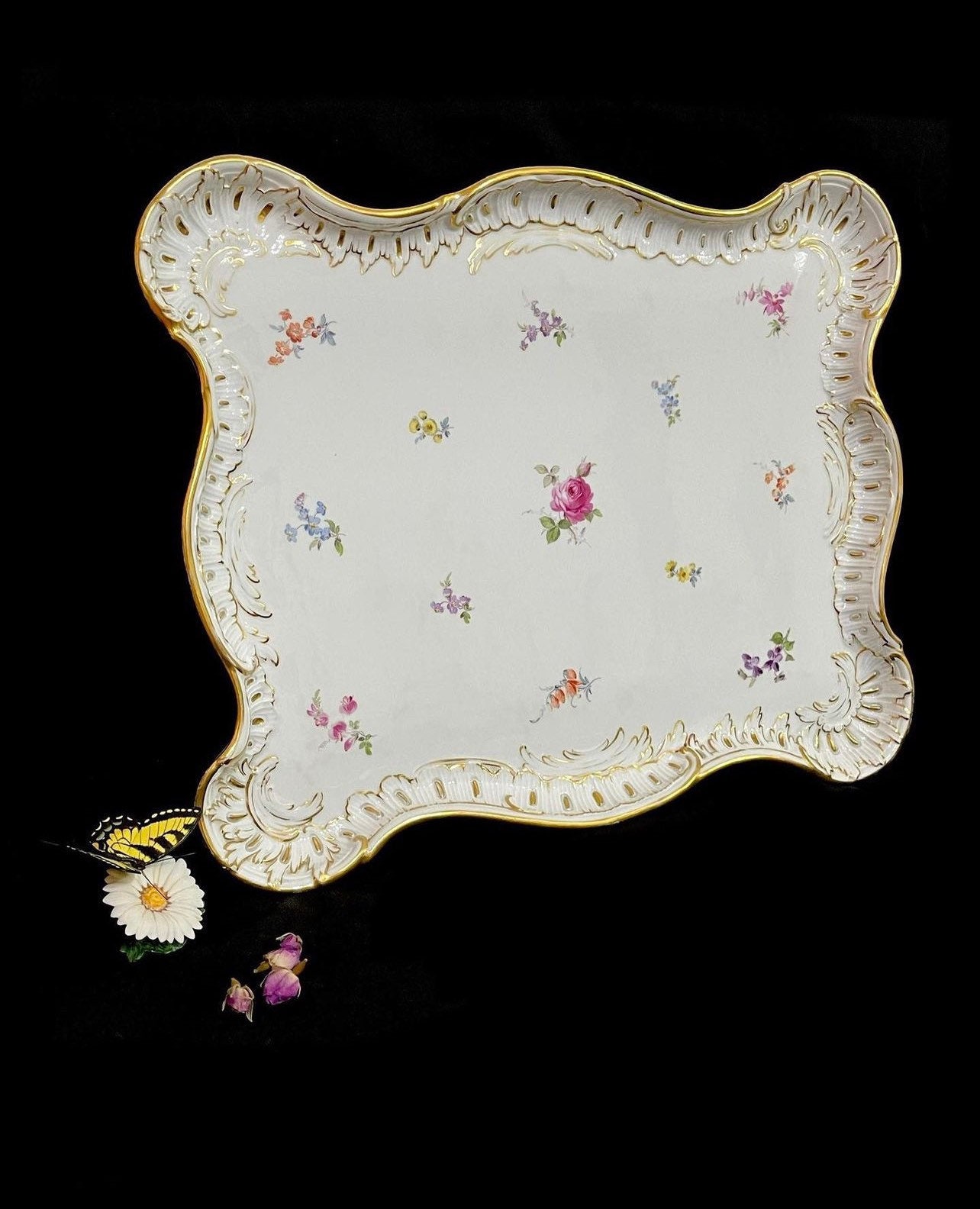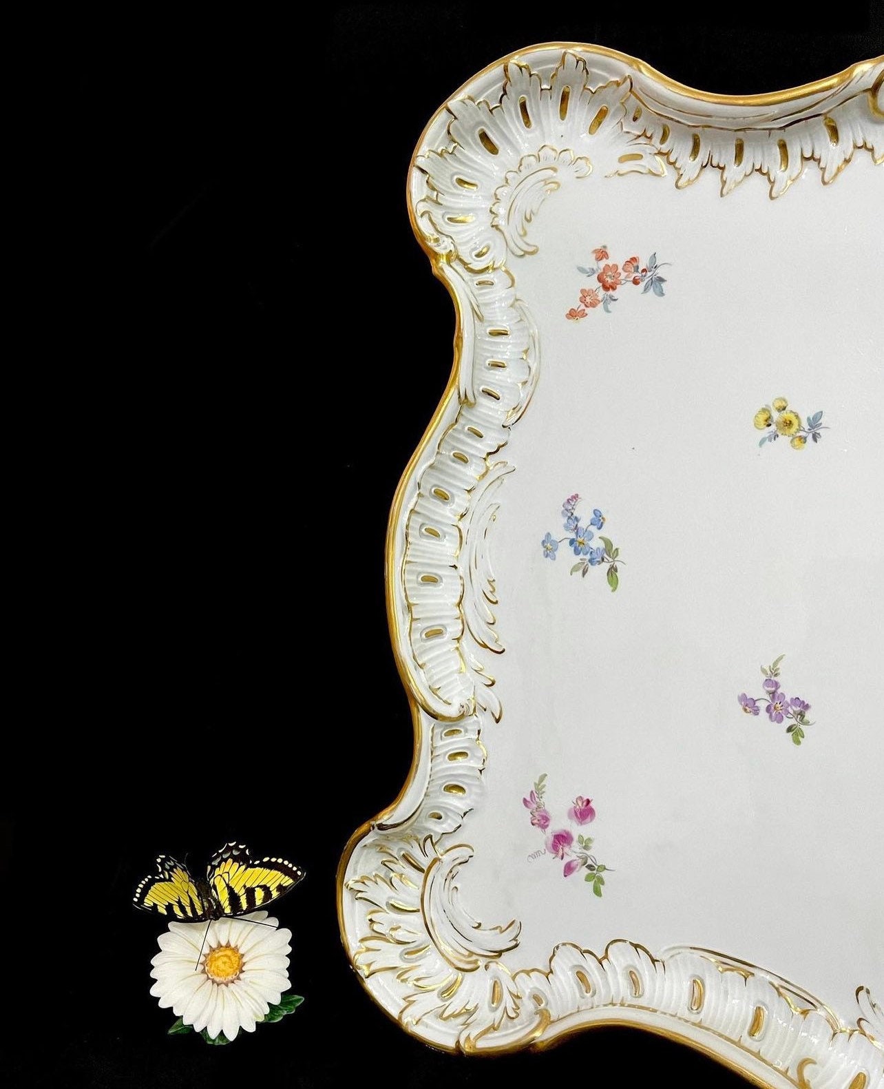 Extremely rare, very large German Meissen porcelain tray with various flowers and butterflies. The edges are fancy, scalloped and gold gilt. Hand made and hand painted.