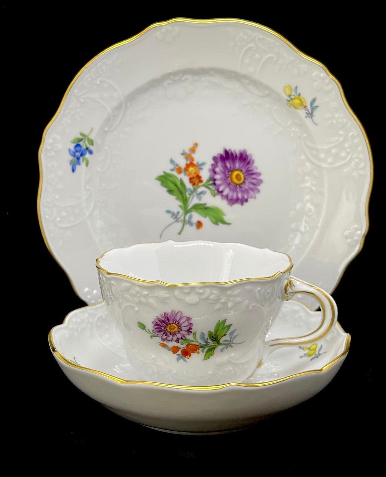 This beautiful tea cups features gorgeous relief porcelain, beautiful hand painted floral sprays and scalloped rims. They are marked on the underside with the makers mark dating to 1934 - 1945.