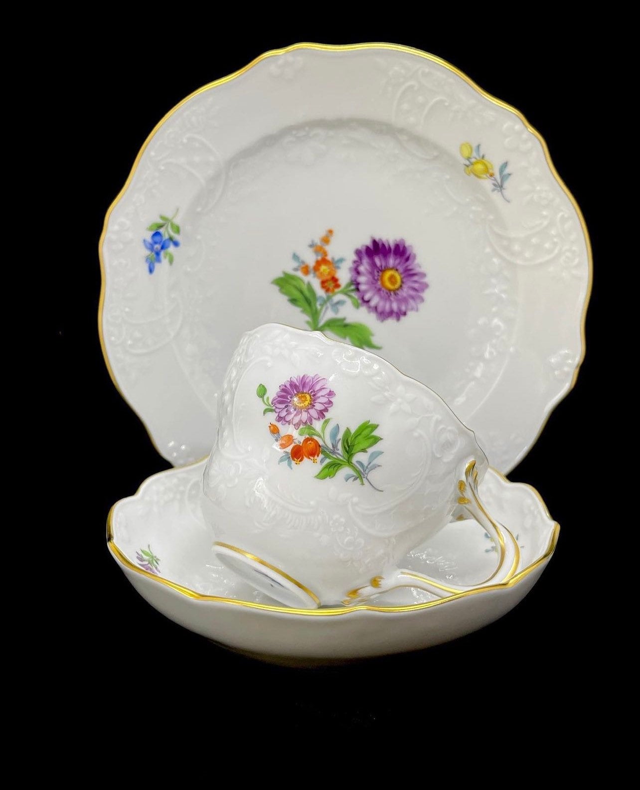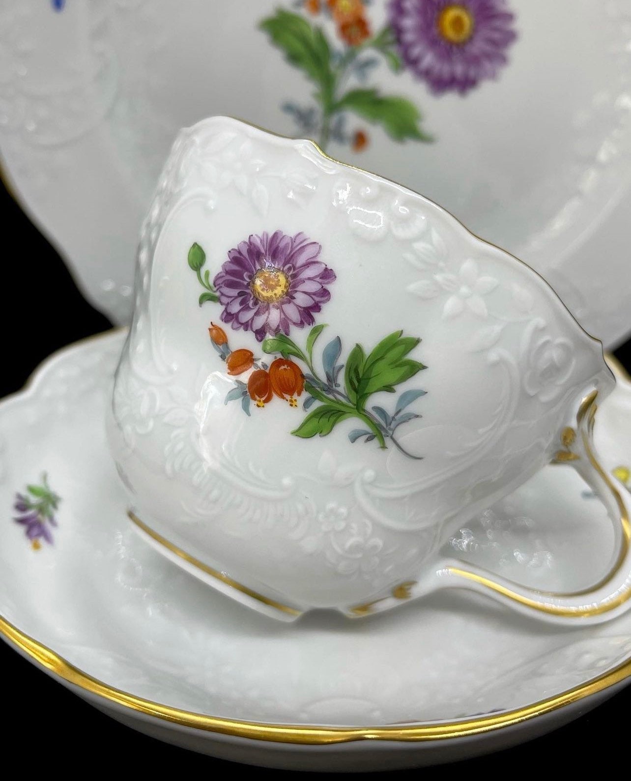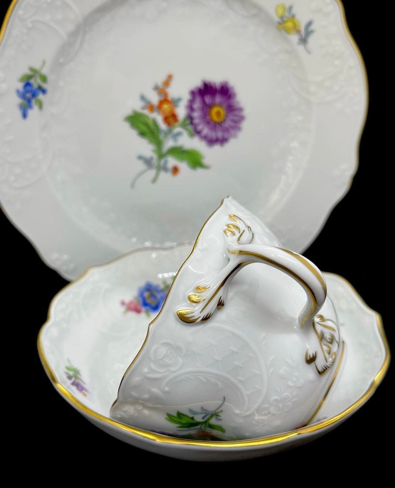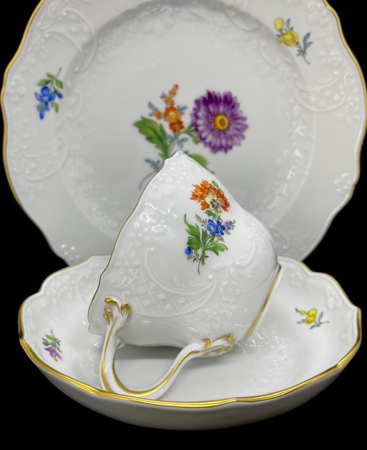 All have exquisite paintings, and in addition to the cup and the saucer, it has a gorgeous plate with high rims which truly makes this plate a beautiful and unique piece, good as a collectible display item, or as a serve ware for small appetizers or even as a wall plate.