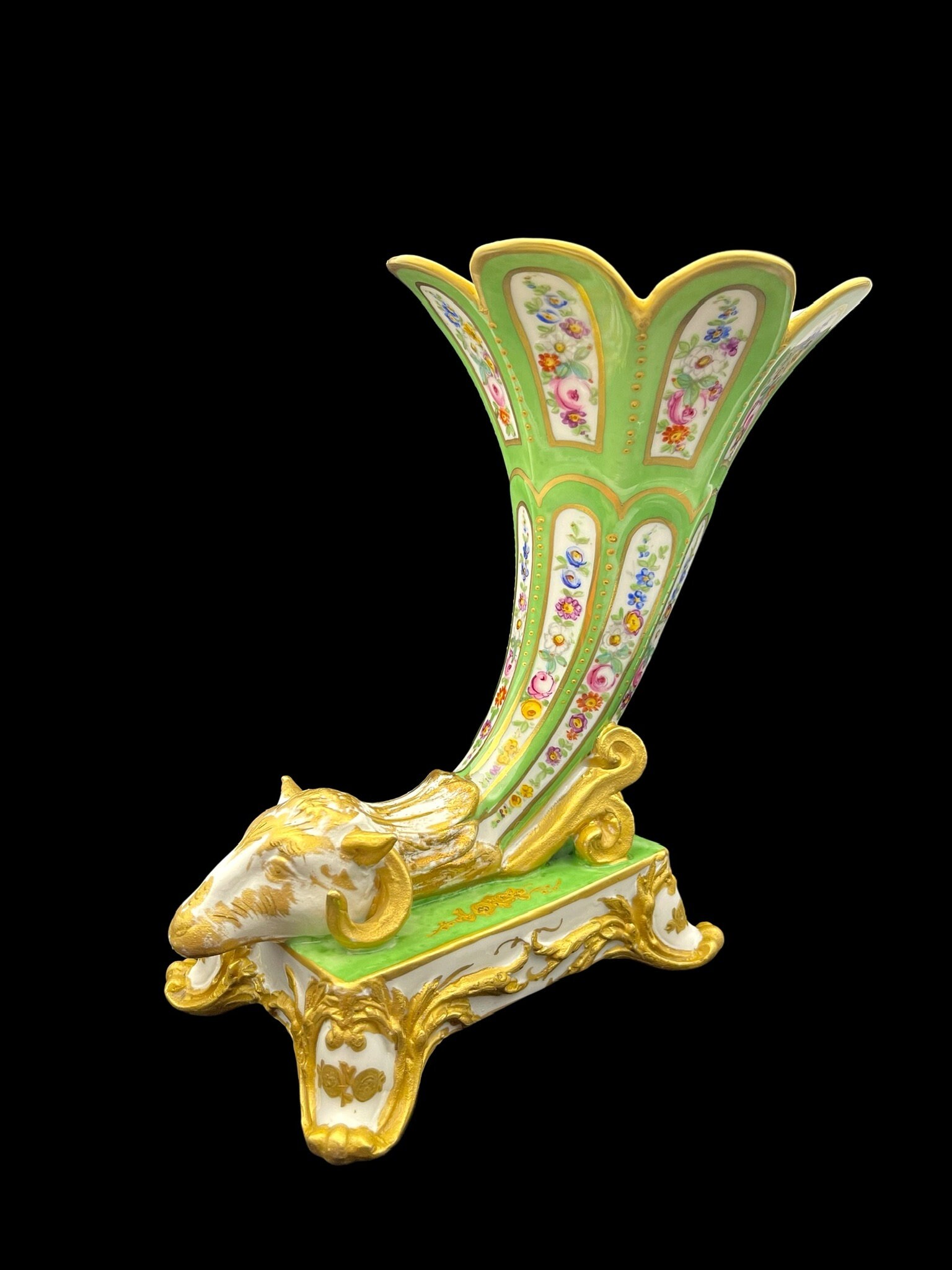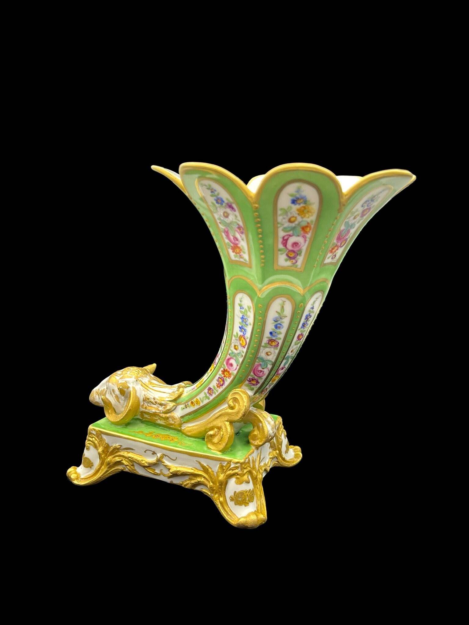 This French masterpiece is a true collector's item, made entirely by hand and adorned with intricate relief and gold leaf details. The vase features a beautiful cornucopia shape and is generously sized at 17cm in height and 20cm in width.