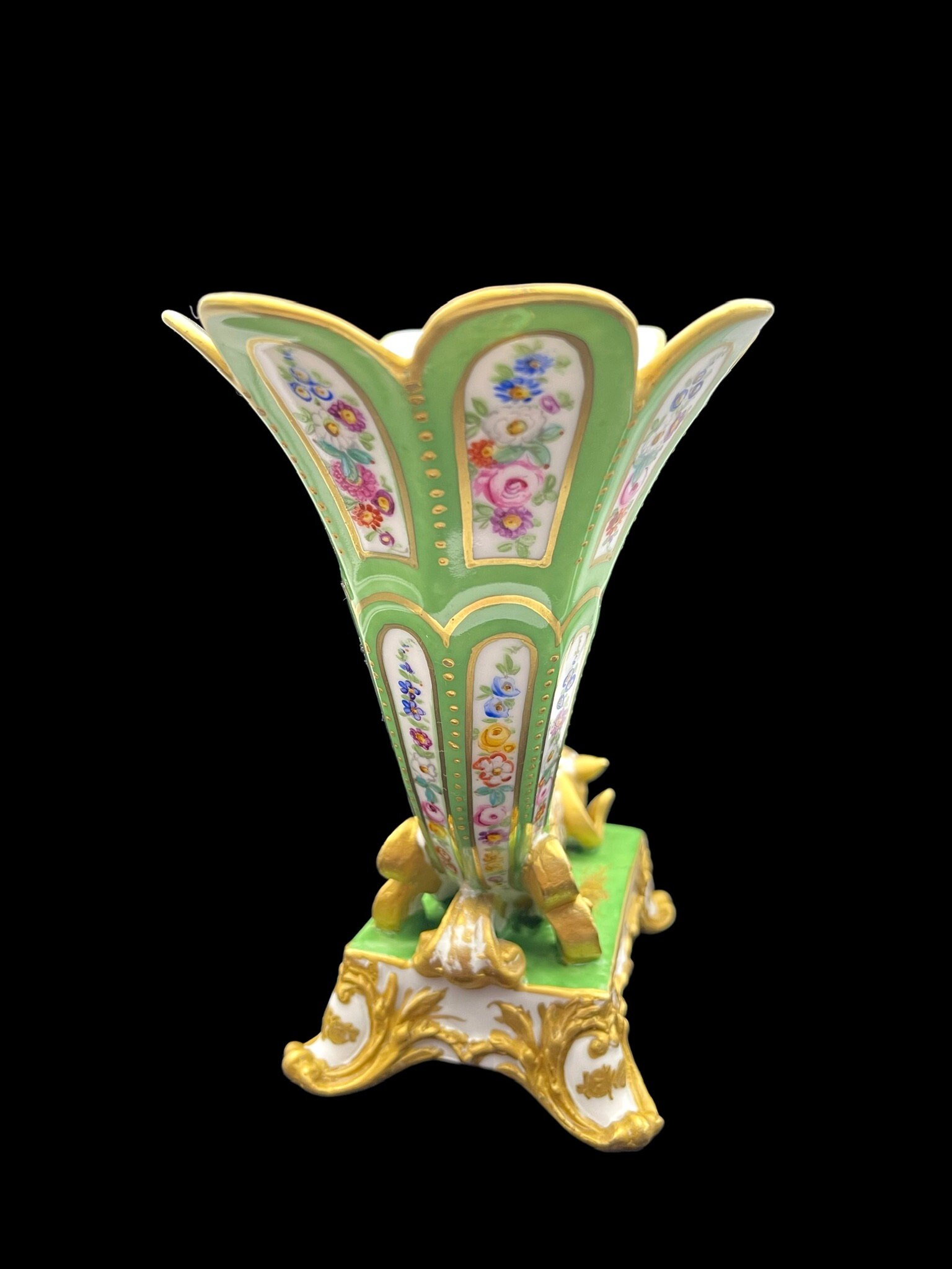 The vase boasts a flawless condition, without any signs of wear, tear or damage. It's been beautifully painted with exquisite patterns that are evident from both sides. The porcelain is absolutely spotless, shining brilliantly in its magnificence.