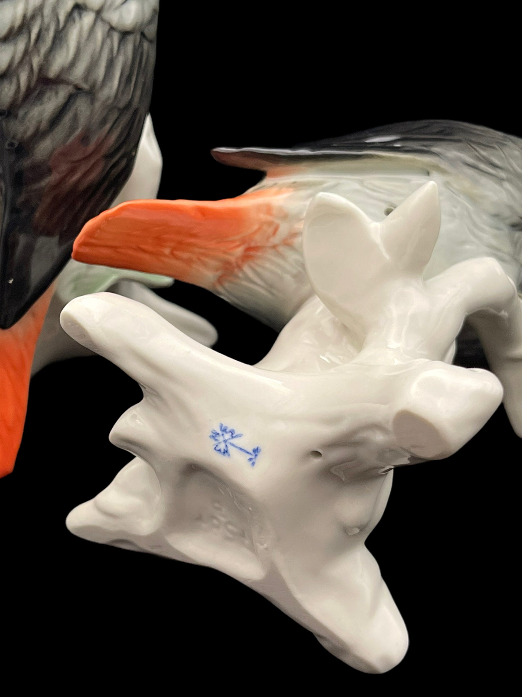 This beautiful pair of vintage gray parrots porcelain figurines is a must-have for any collector. Made in Germany, these figurines are stamped with the Karl Ens mark, showcasing the expert craftsmanship of this renowned porcelain manufacturer. Standing at a height of 15.5 cm, these figurines are meticulously hand-painted and feature intricate relief work, making them a stunning addition to any collection. They are in pristine condition, free from any signs of damage or wear, making them a rare find.