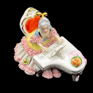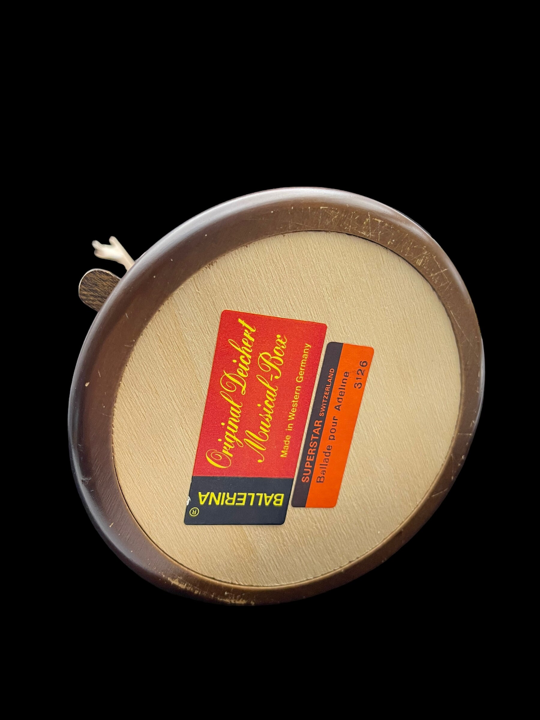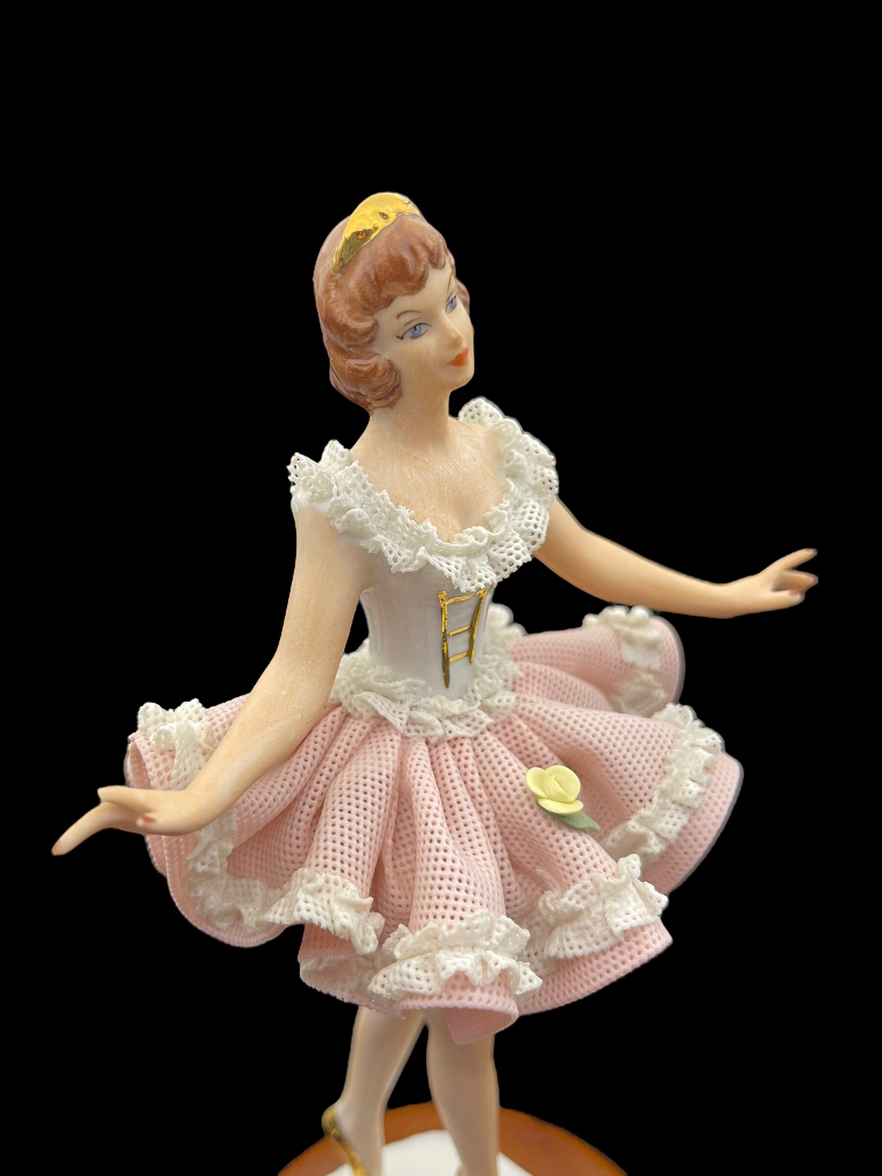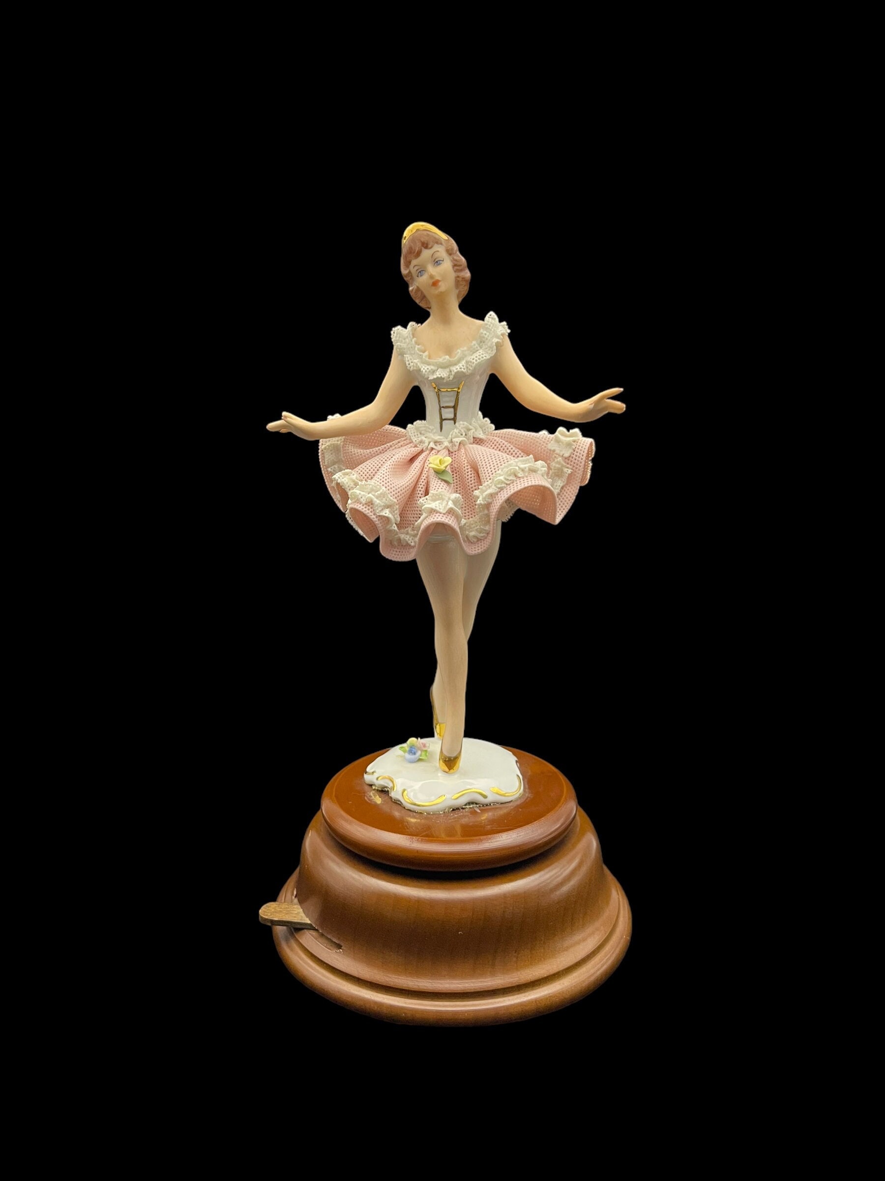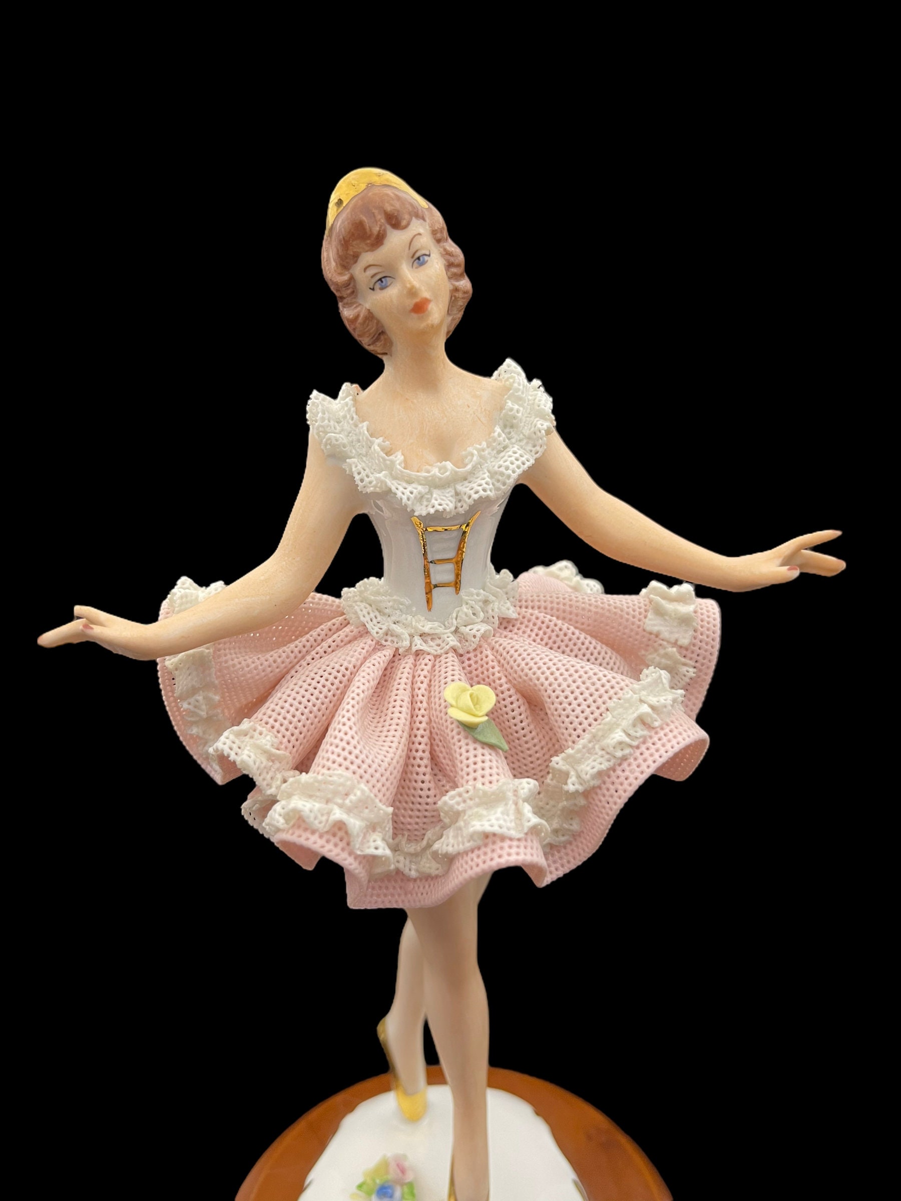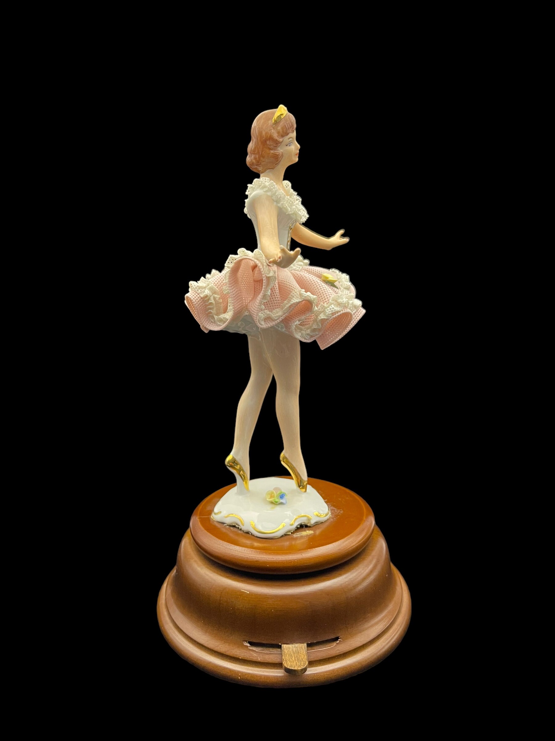 Presenting a stunning vintage German-made porcelain ballerina figure, meticulously handcrafted and hand-painted, showcasing a beautifully detailed lace skirt. Standing proudly on a wooden base featuring a built-in music box, this exquisite piece is an ideal addition to any antique or figurine collection.