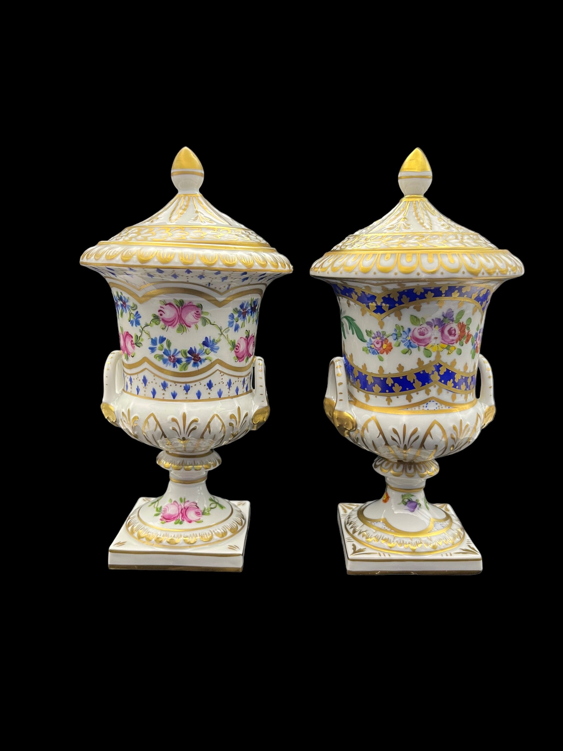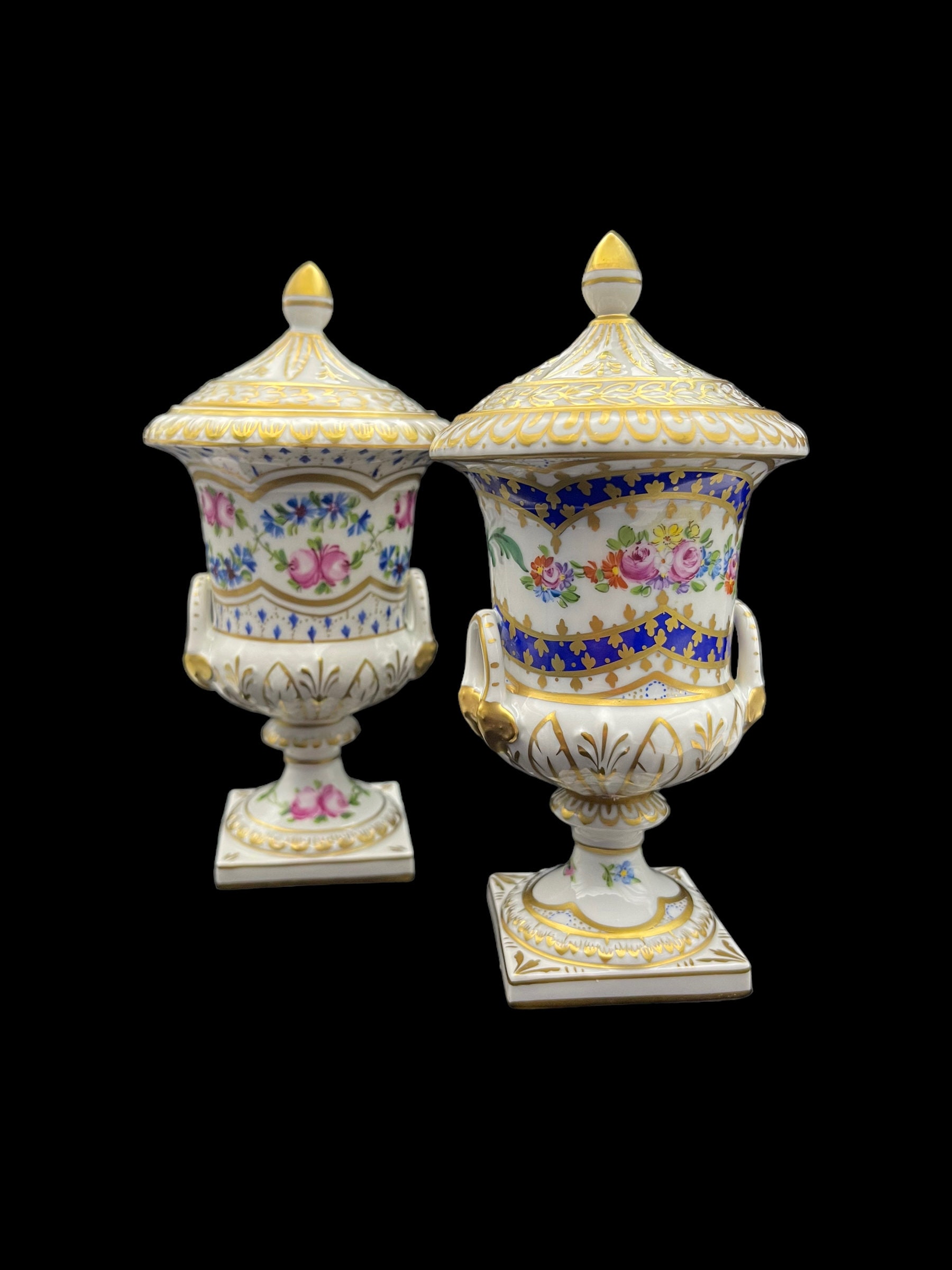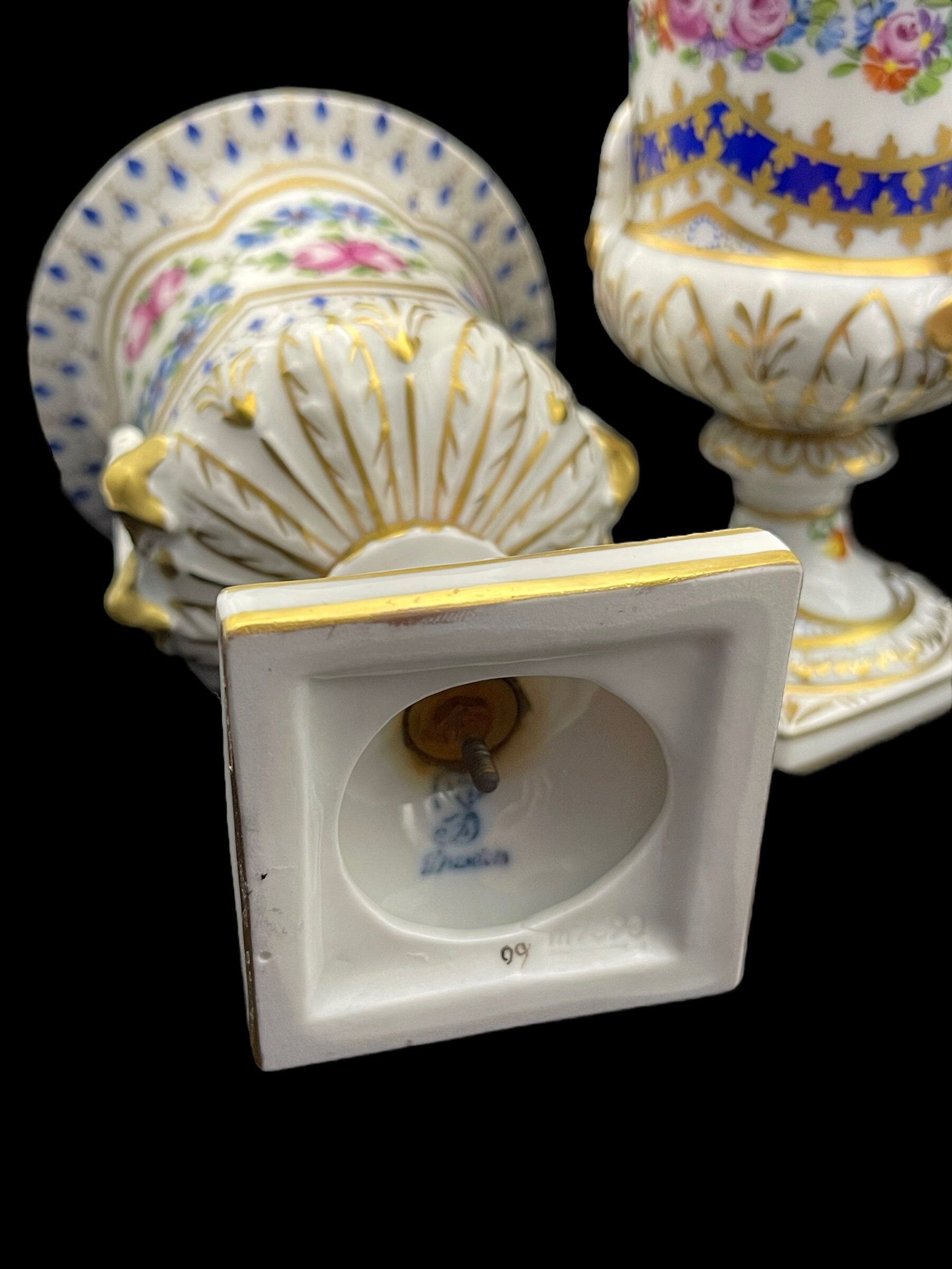 This listing features an exclusive pair of Dresden Carl Thieme Potschappel vases, renowned for their high antique and collectible value. Crafted in Germany, these stunning pieces boast exquisite hand-painted detailing and an elaborate relief workmanship.