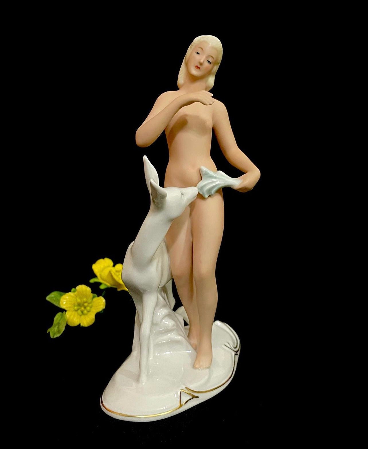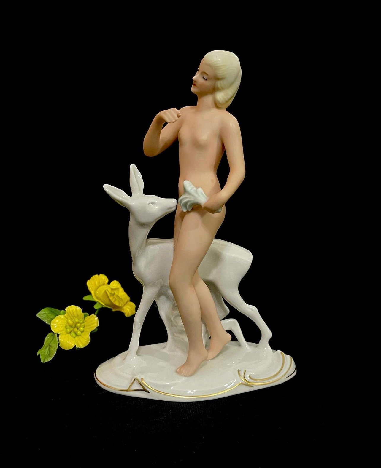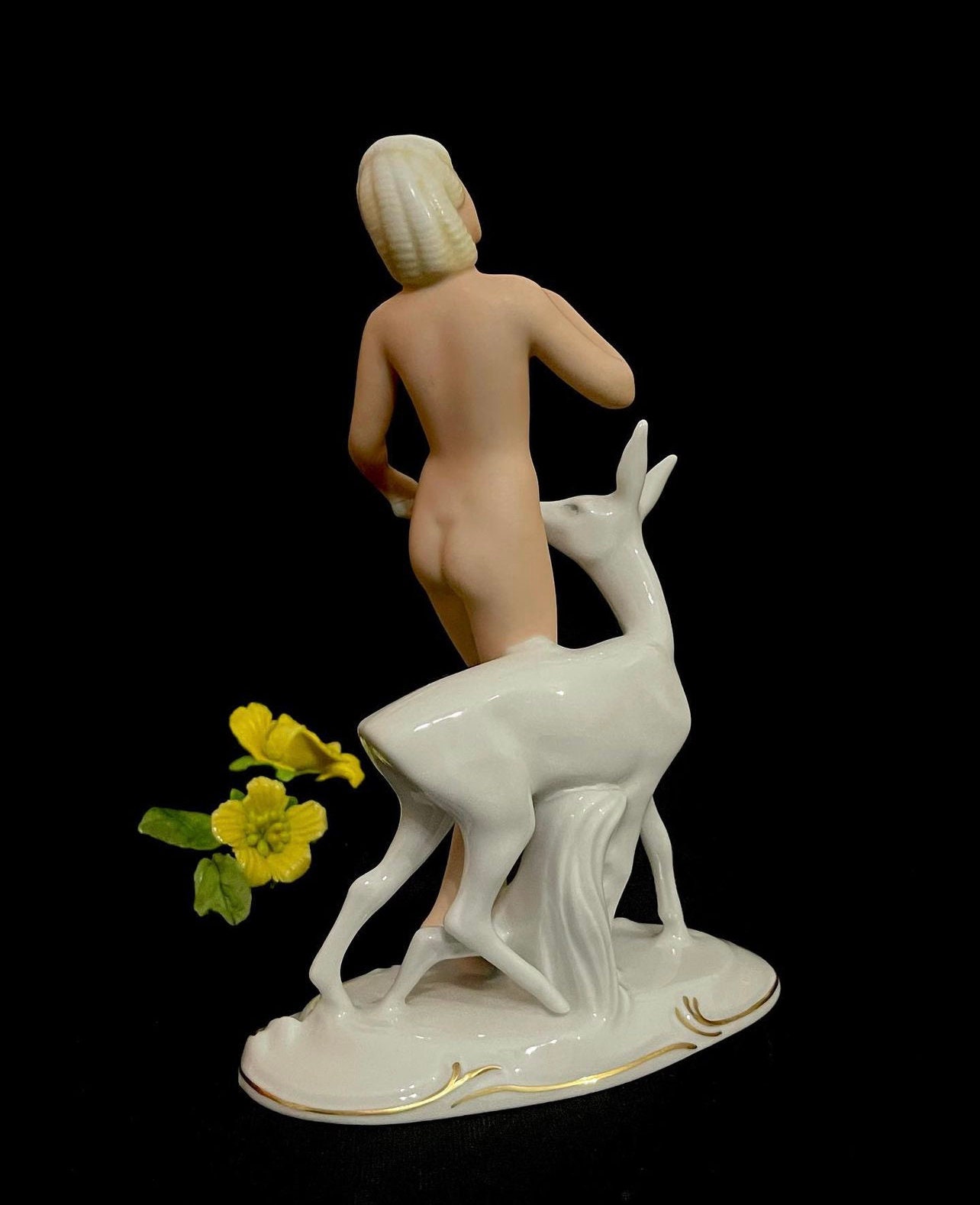 The figurine features a beautiful nude blonde lady, tenderly feeding a white deer. The piece is entirely handmade, and expertly painted, with relief detailing accentuating the artistry involved in its creation. The figurine stands 17.5 cm tall (approximately 6.9 inches), making it a charming addition to any display setting.