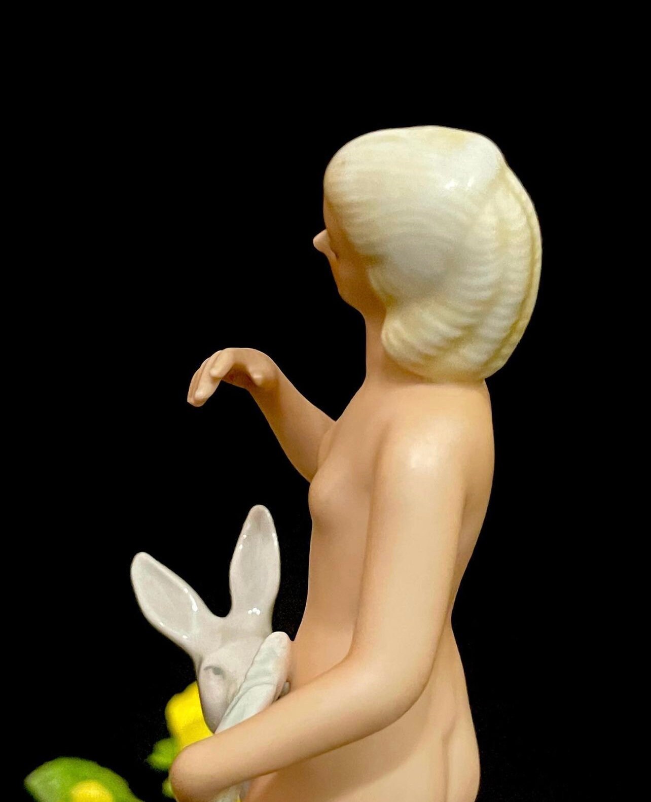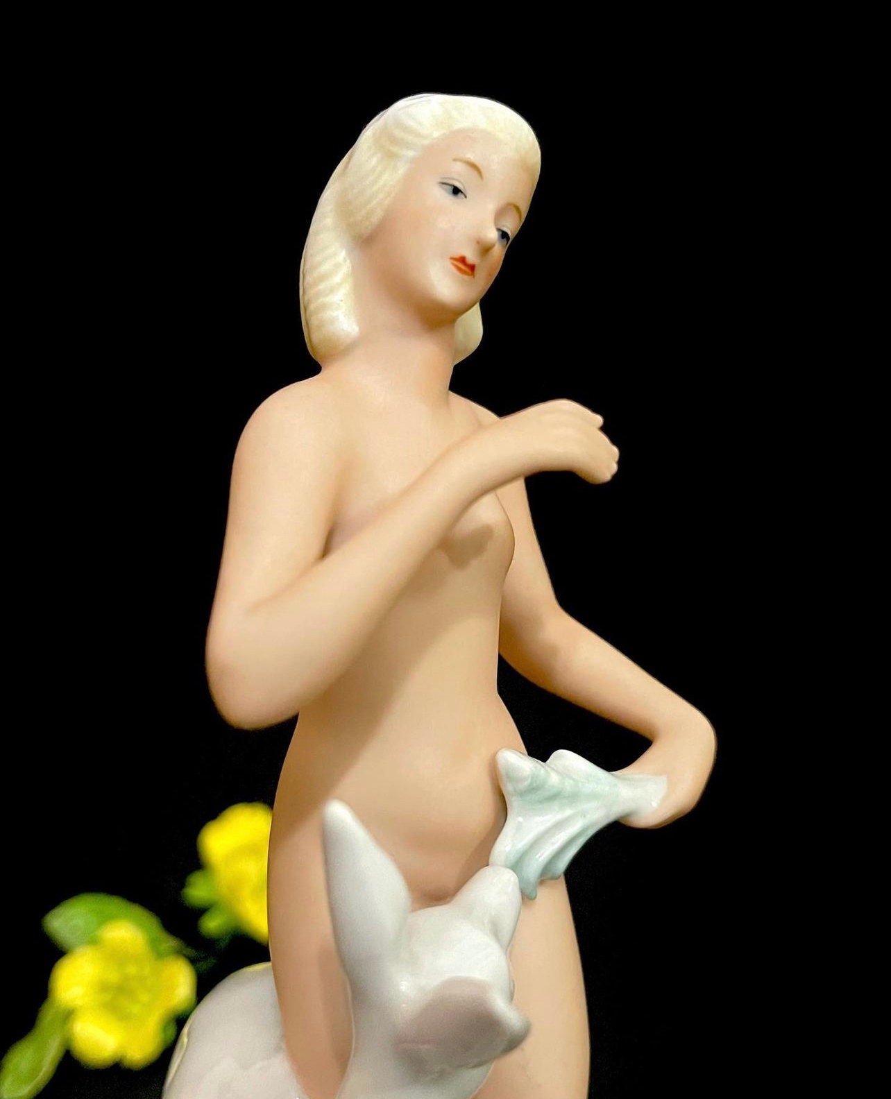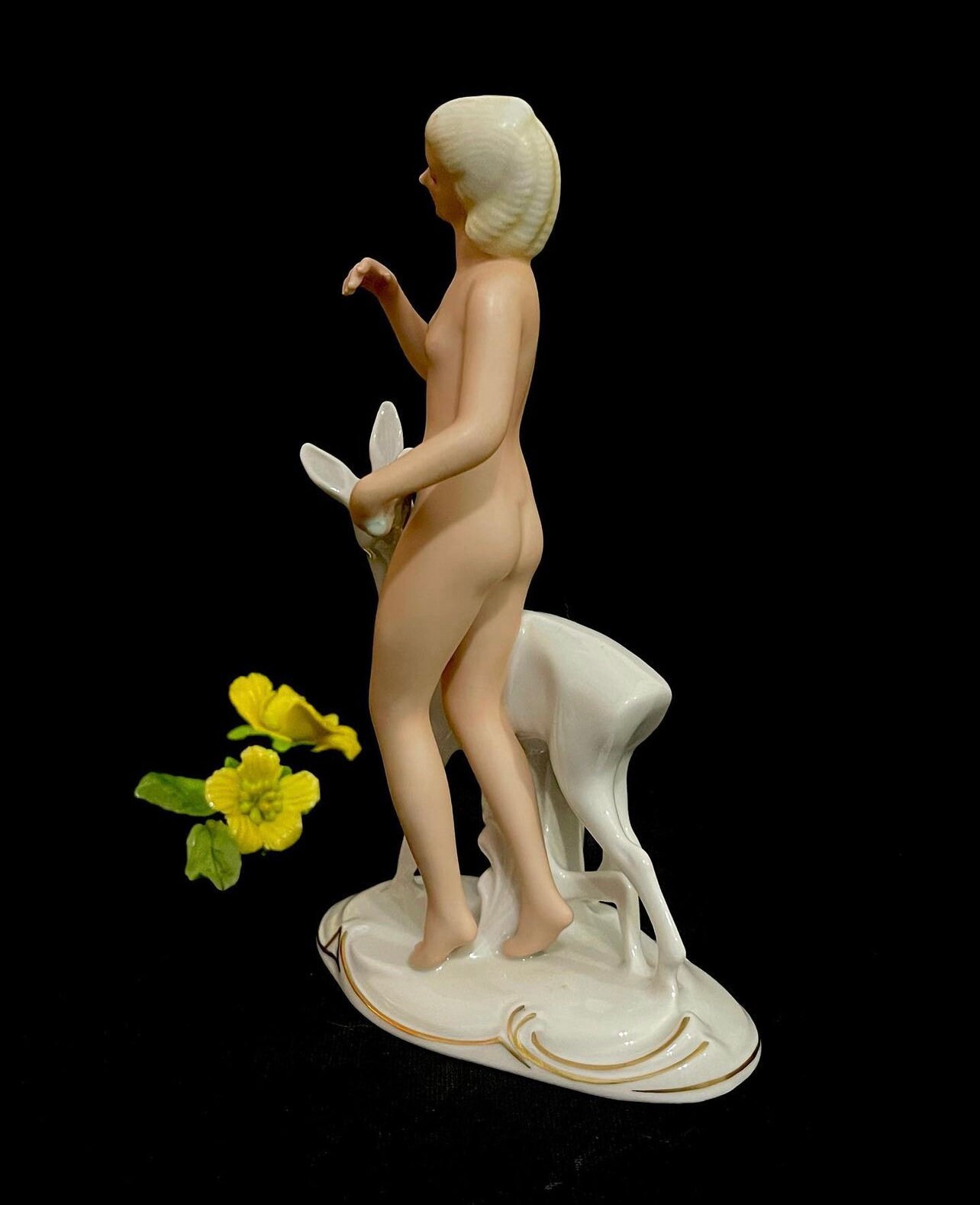 The figurine features a beautiful nude blonde lady, tenderly feeding a white deer. The piece is entirely handmade, and expertly painted, with relief detailing accentuating the artistry involved in its creation. The figurine stands 17.5 cm tall (approximately 6.9 inches), making it a charming addition to any display setting.