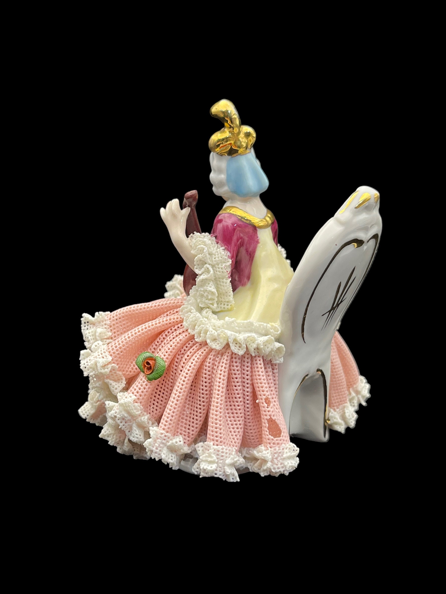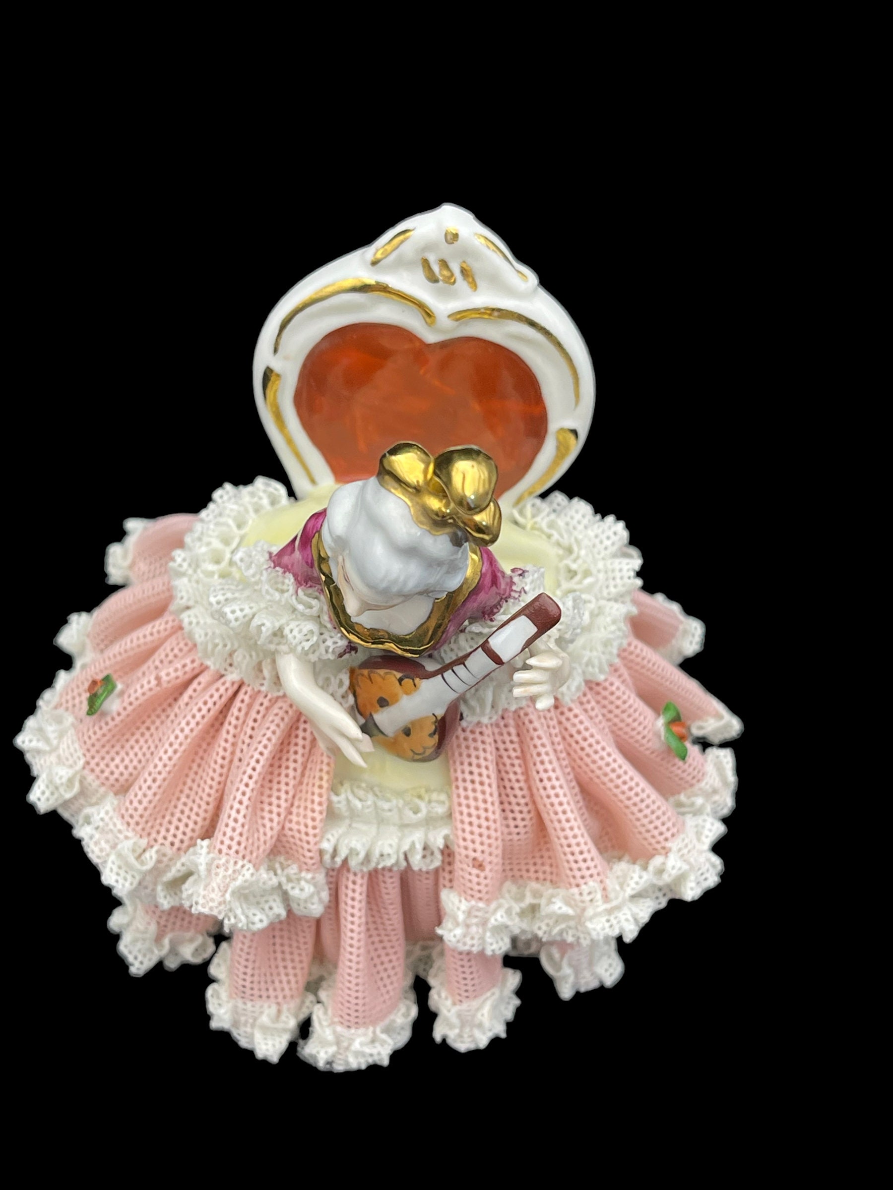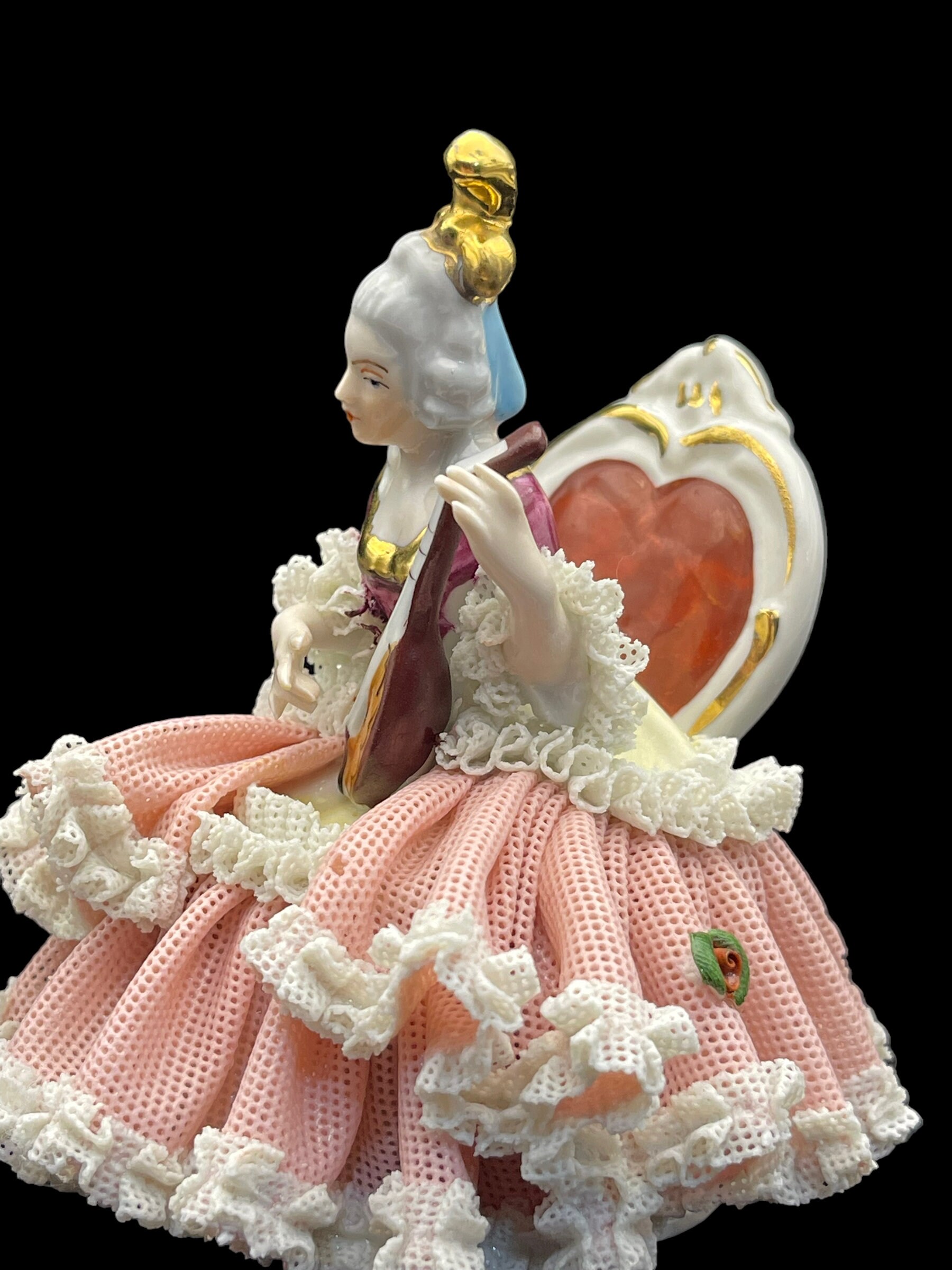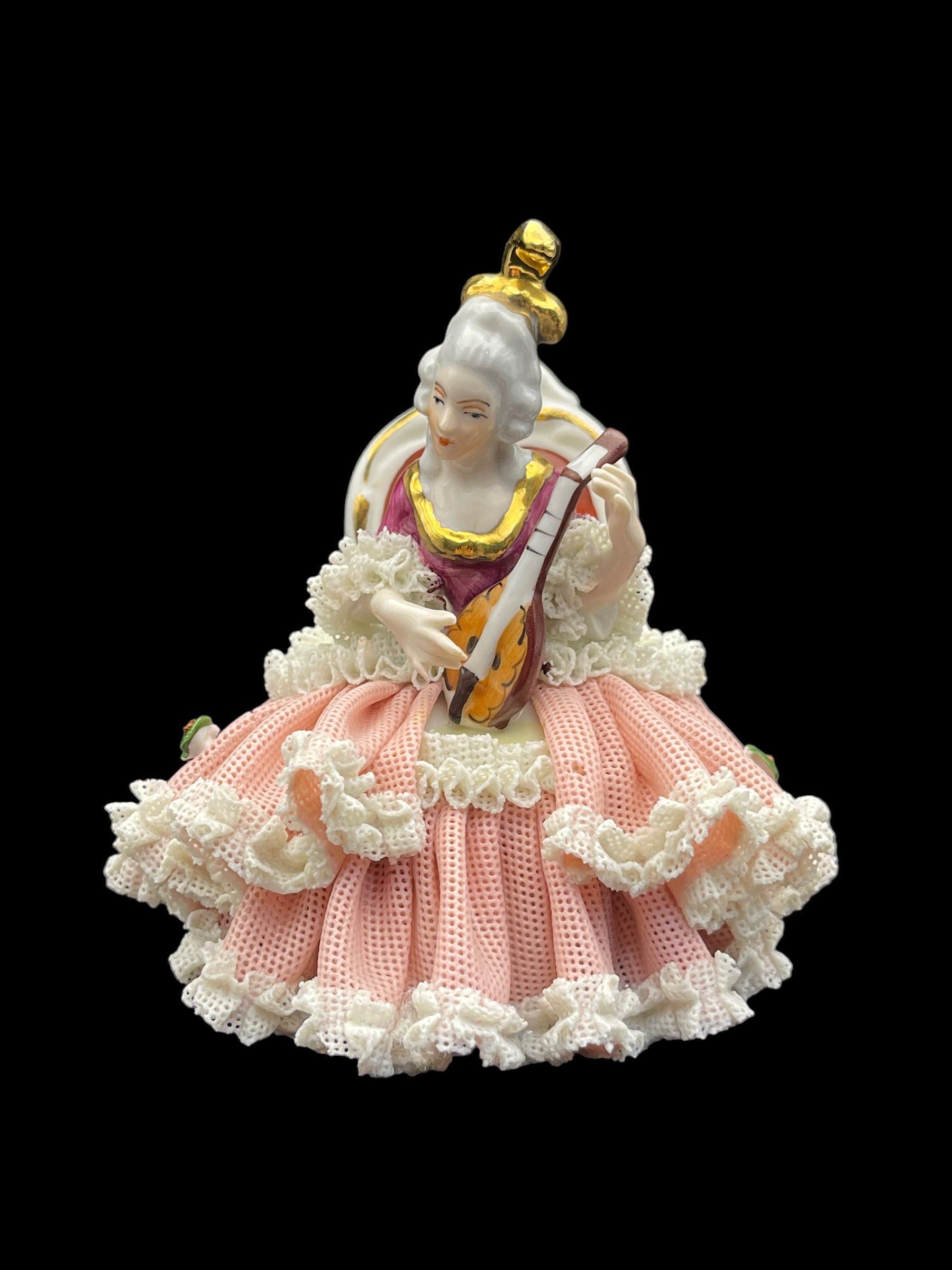 Introducing a hand-painted porcelain figurine from the renowned German manufacturer Wilhelm Rittirsch Dresden. This lady musician is delicately crafted with a lace design, adding a unique touch to the piece.