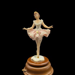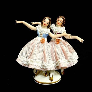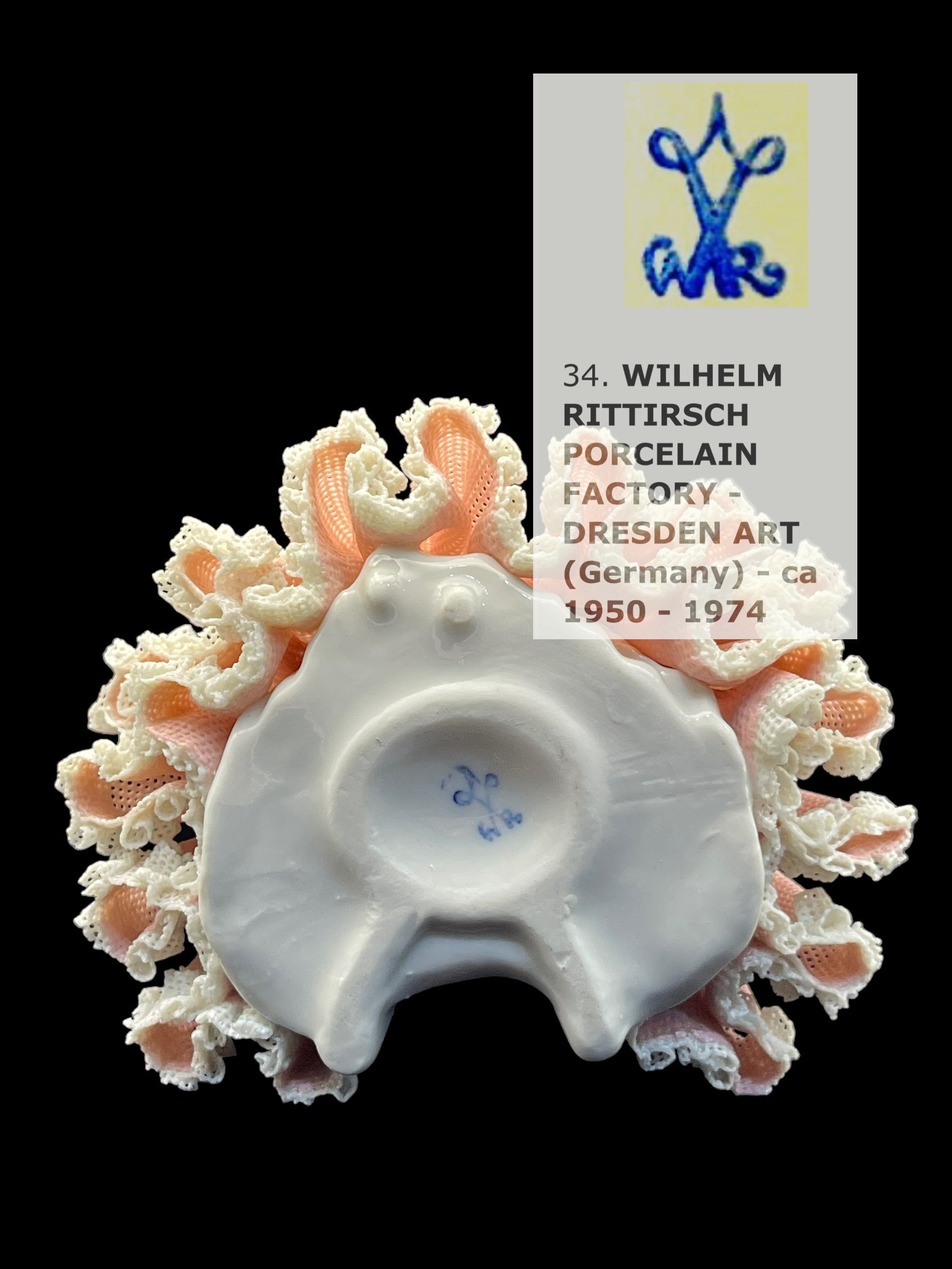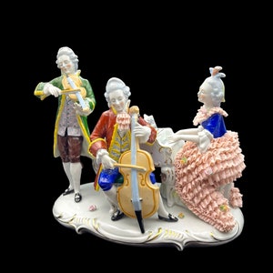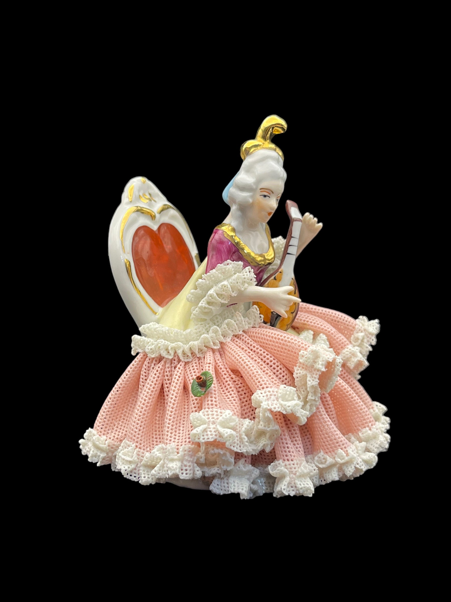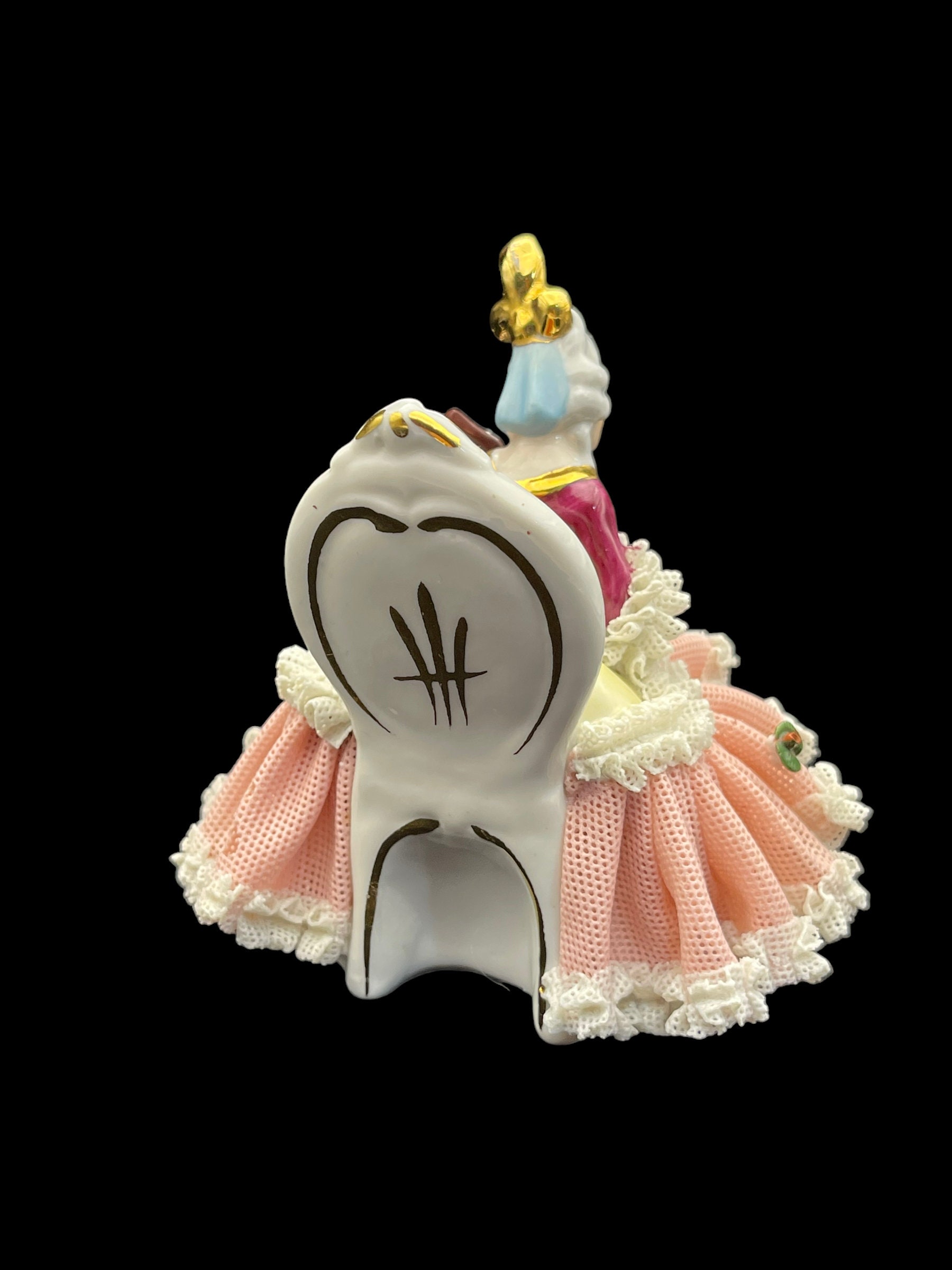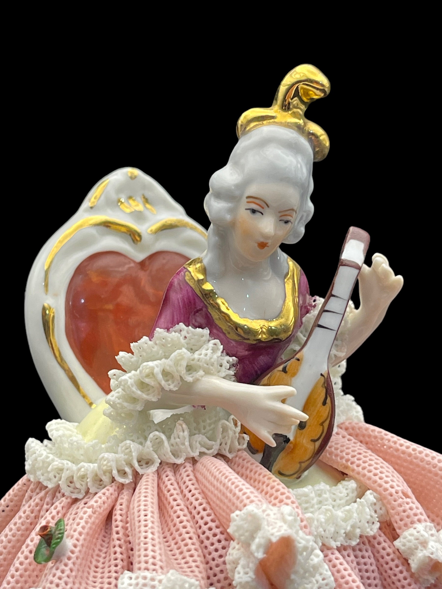 Introducing a hand-painted porcelain figurine from the renowned German manufacturer Wilhelm Rittirsch Dresden. This lady musician is delicately crafted with a lace design, adding a unique touch to the piece.