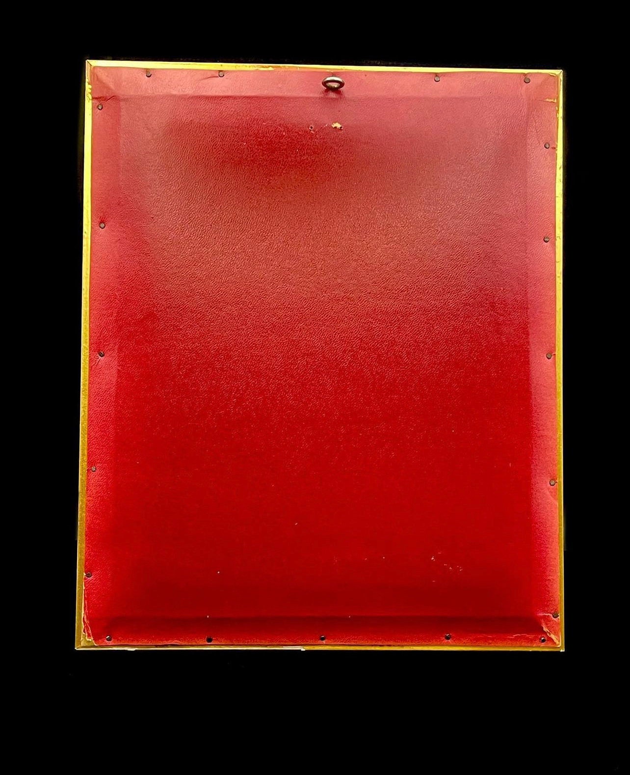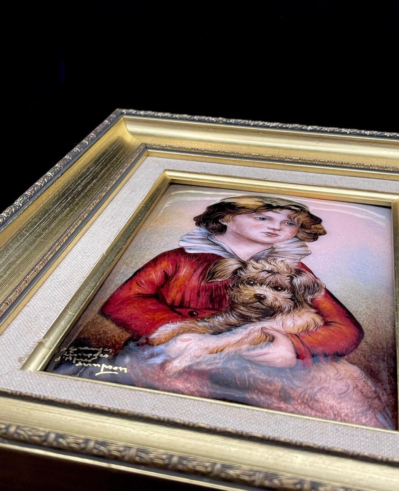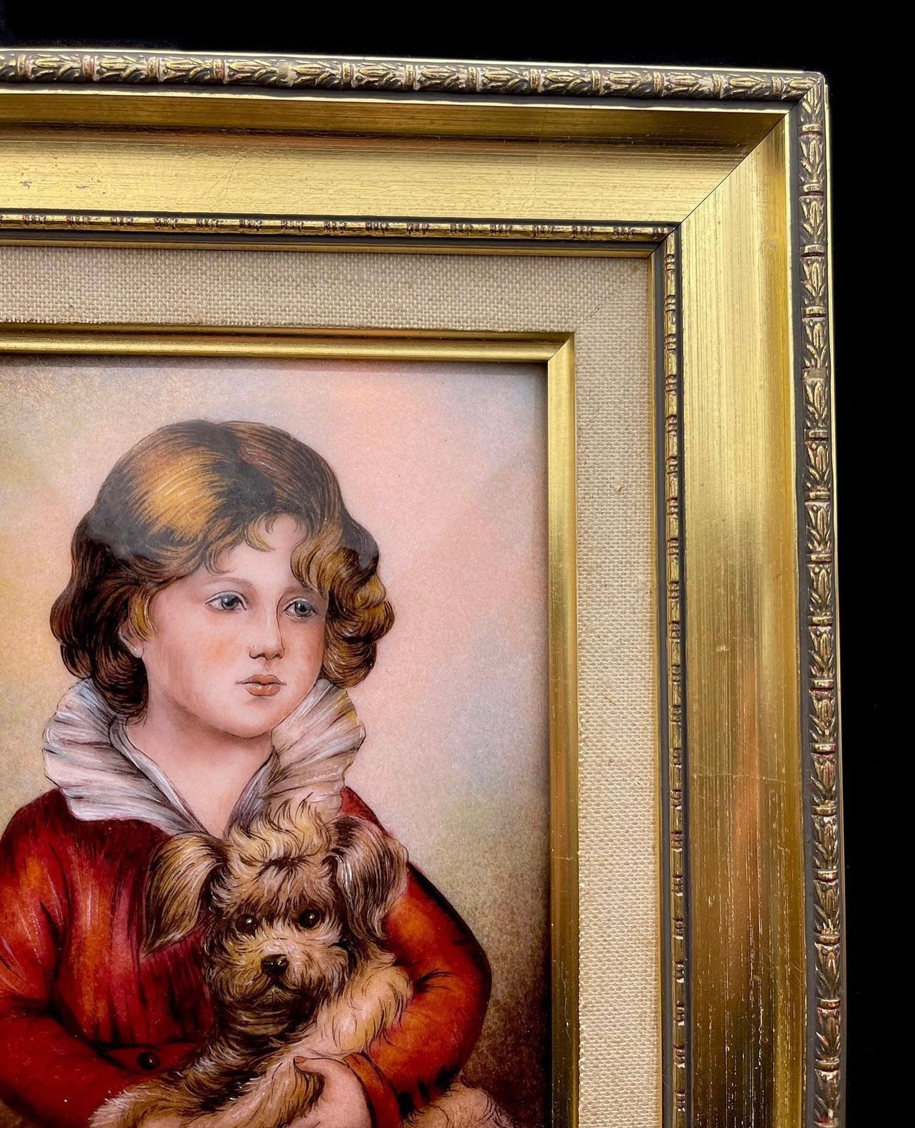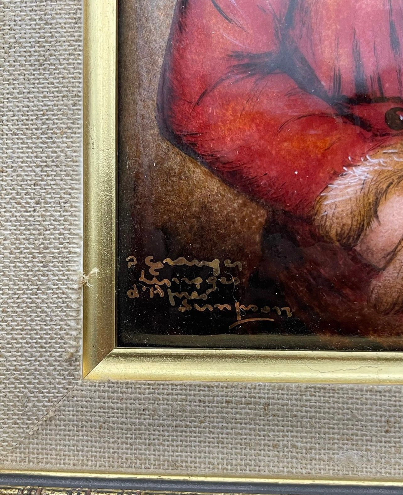 The enamel painting is expertly crafted in Limoges area on a copper base, showcasing intricate details and exquisite enameling techniques. It is elegantly presented in a wooden frame, complete with a hanging ring on the reverse side. This collectible piece holds significant value and is in flawless condition, free from any signs of wear or damage.