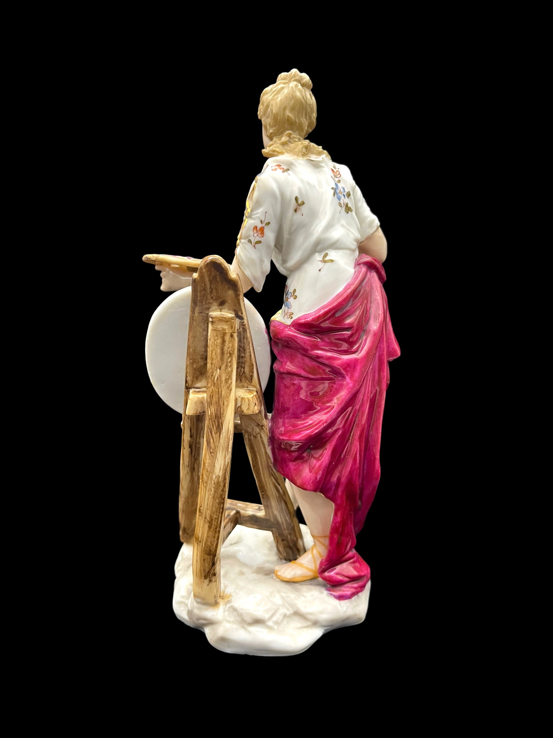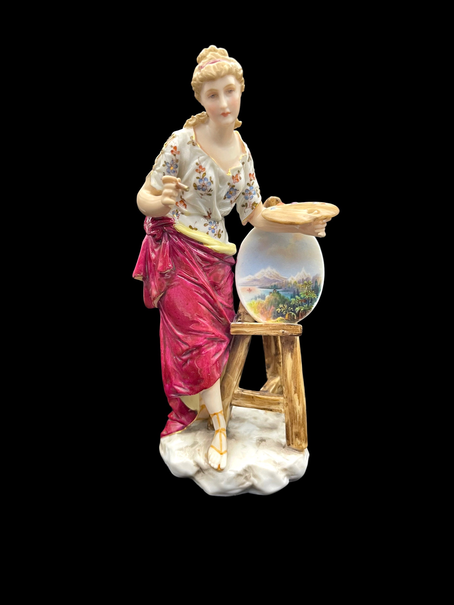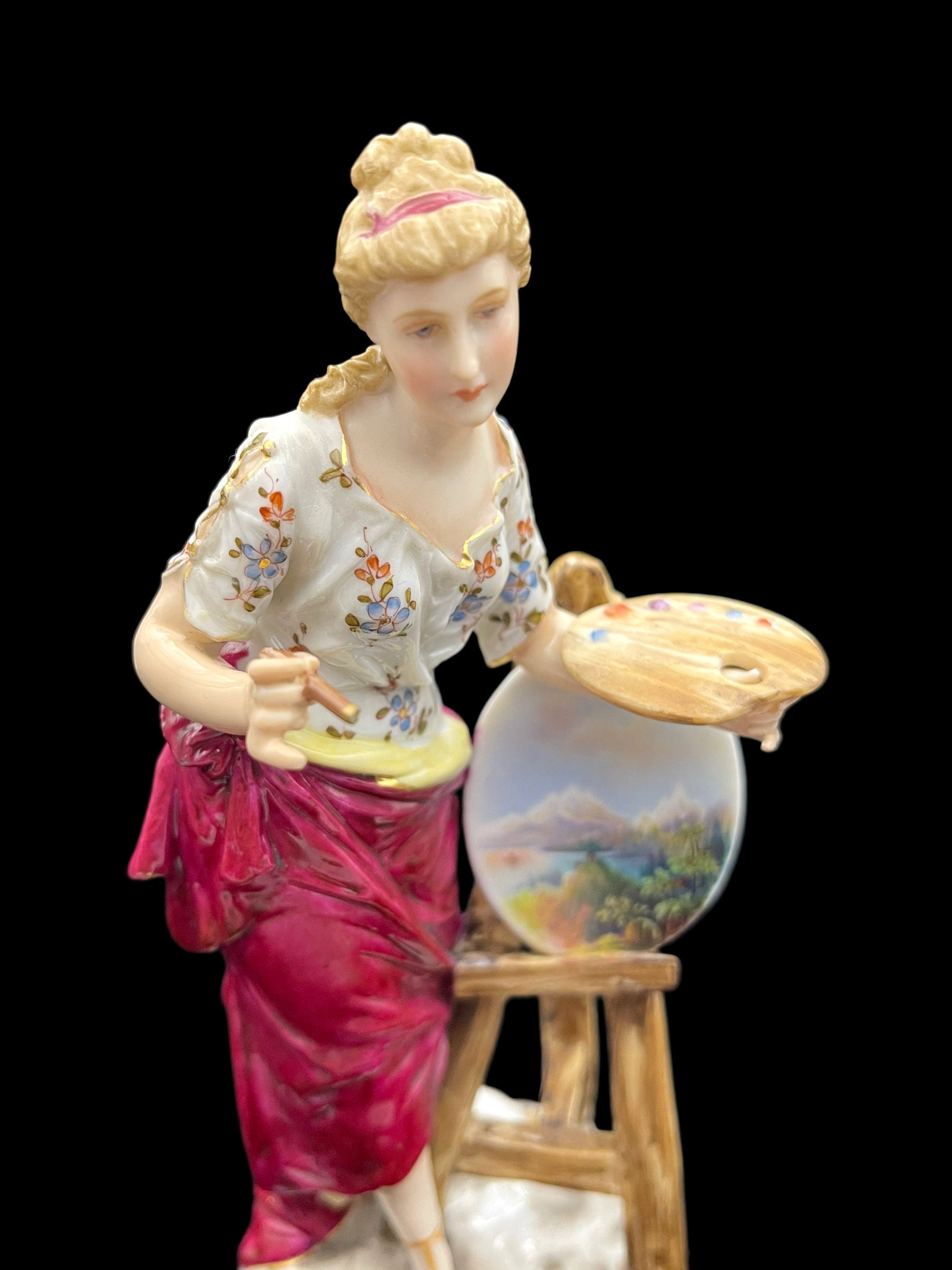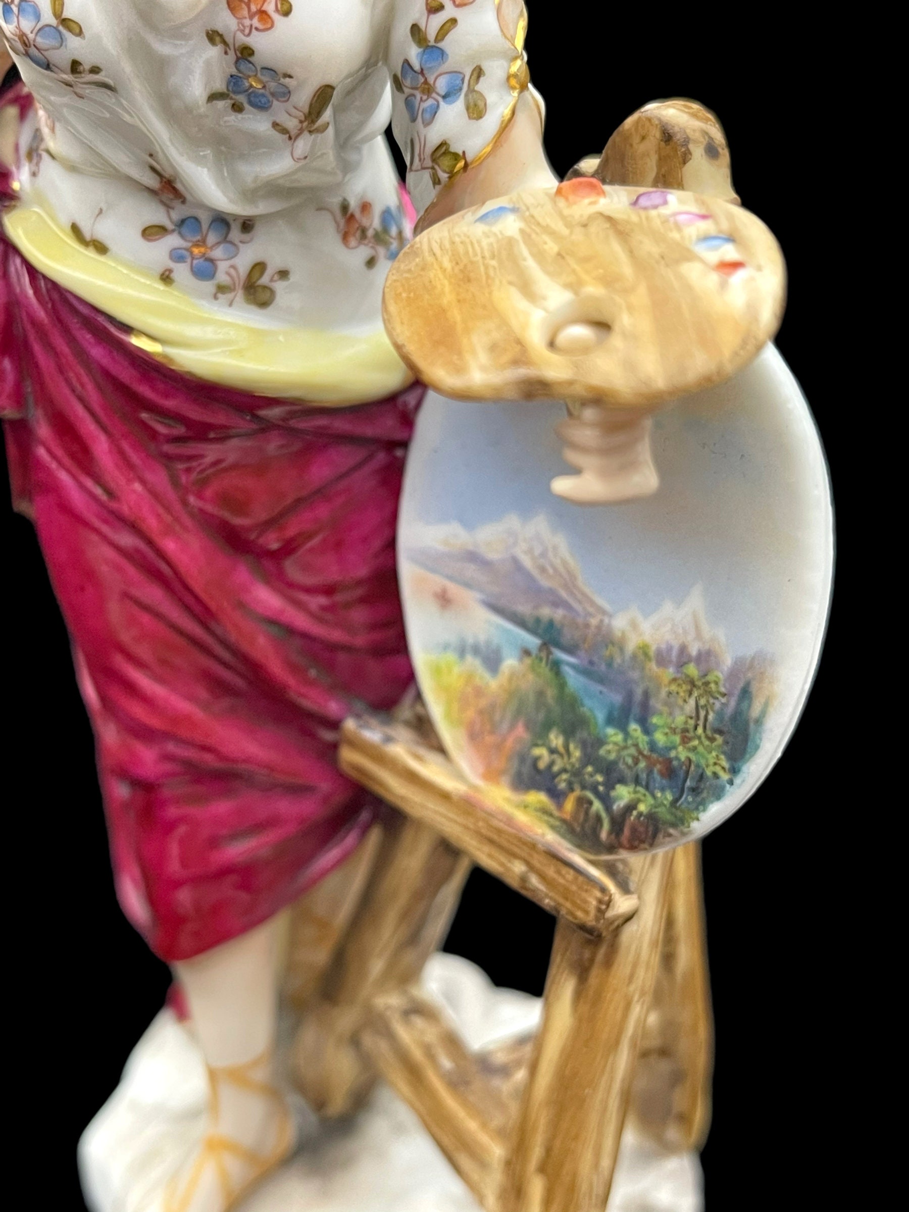 This figurine represents a female artist, immersed in the process of painting. In a remarkable testament to the maker’s skill and attention to detail, even the landscape on the artist’s canvas has been meticulously rendered.