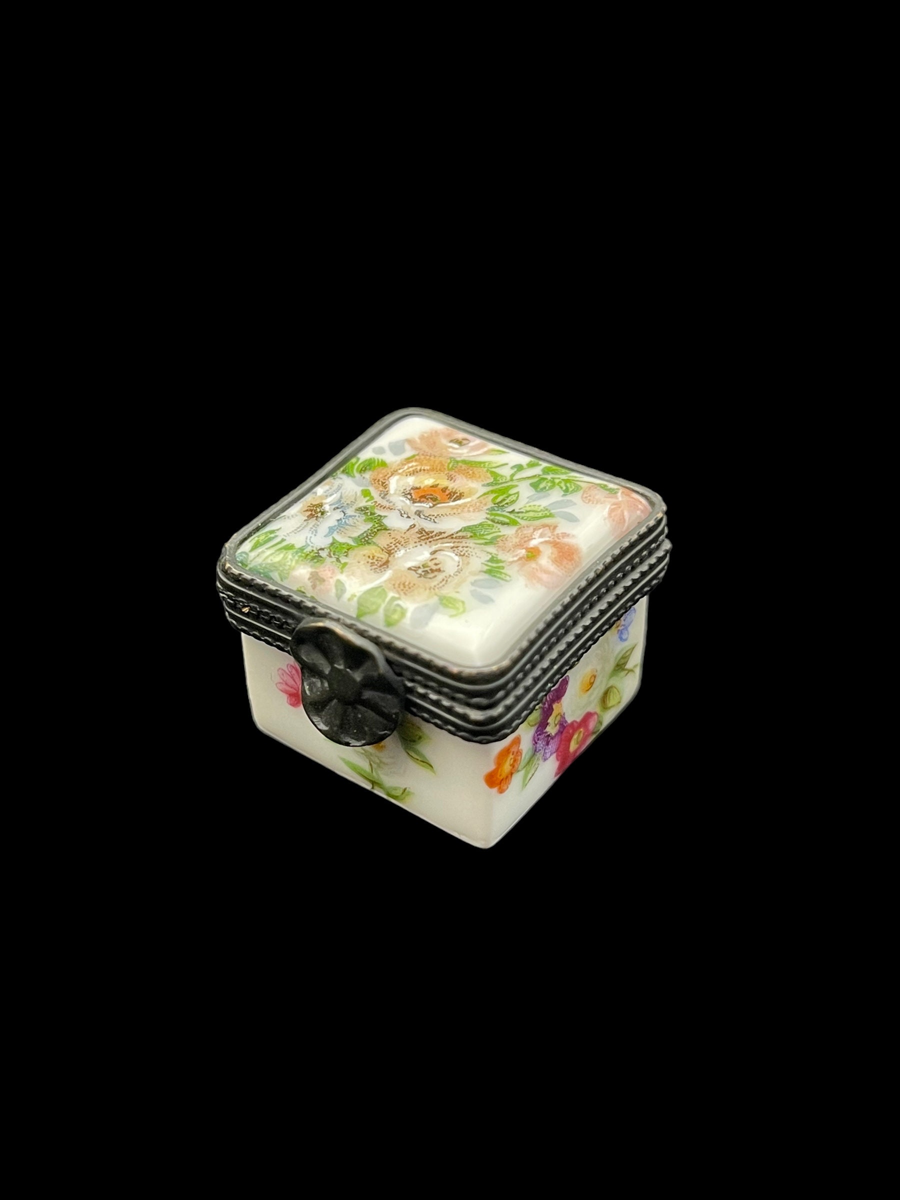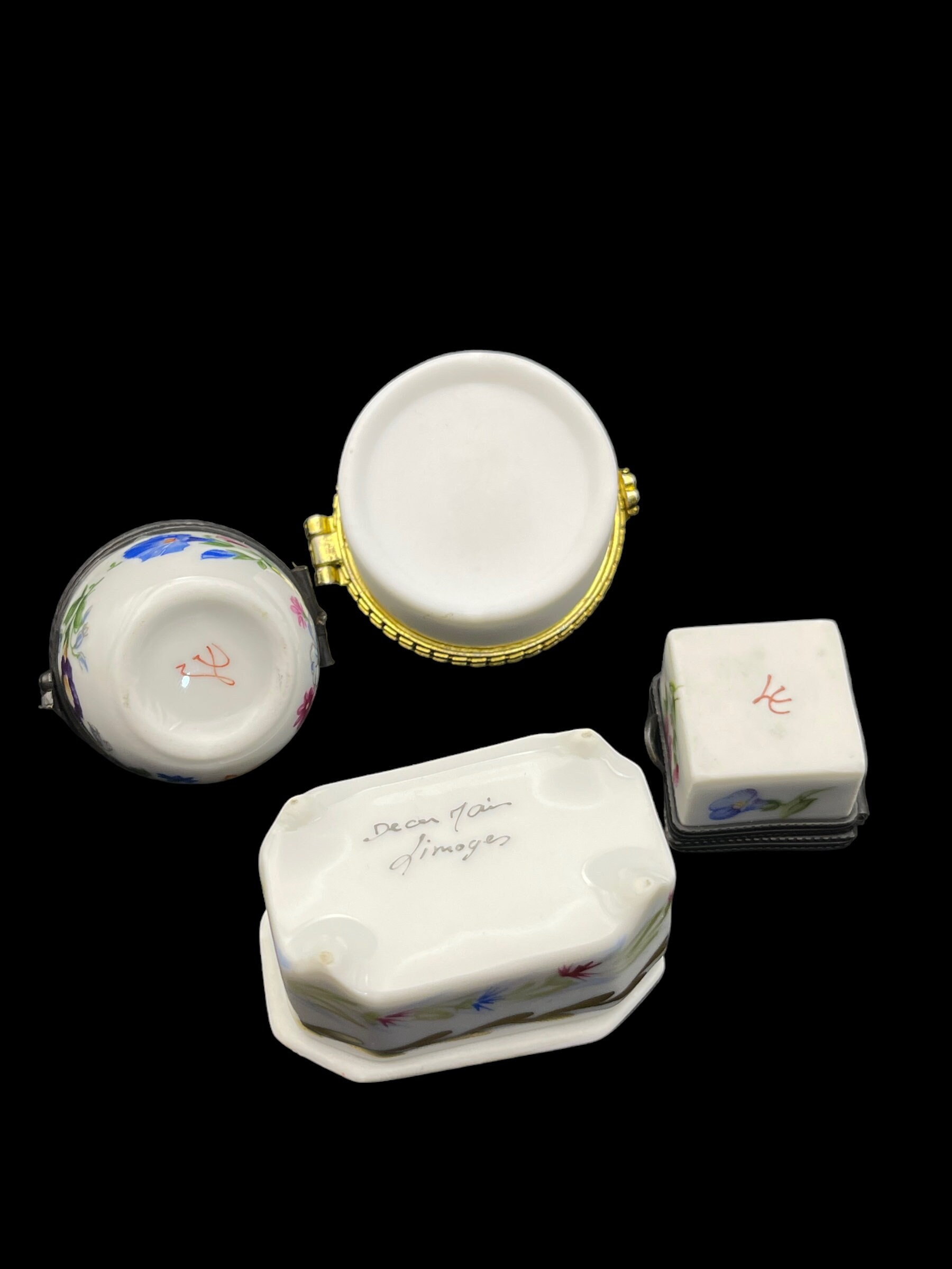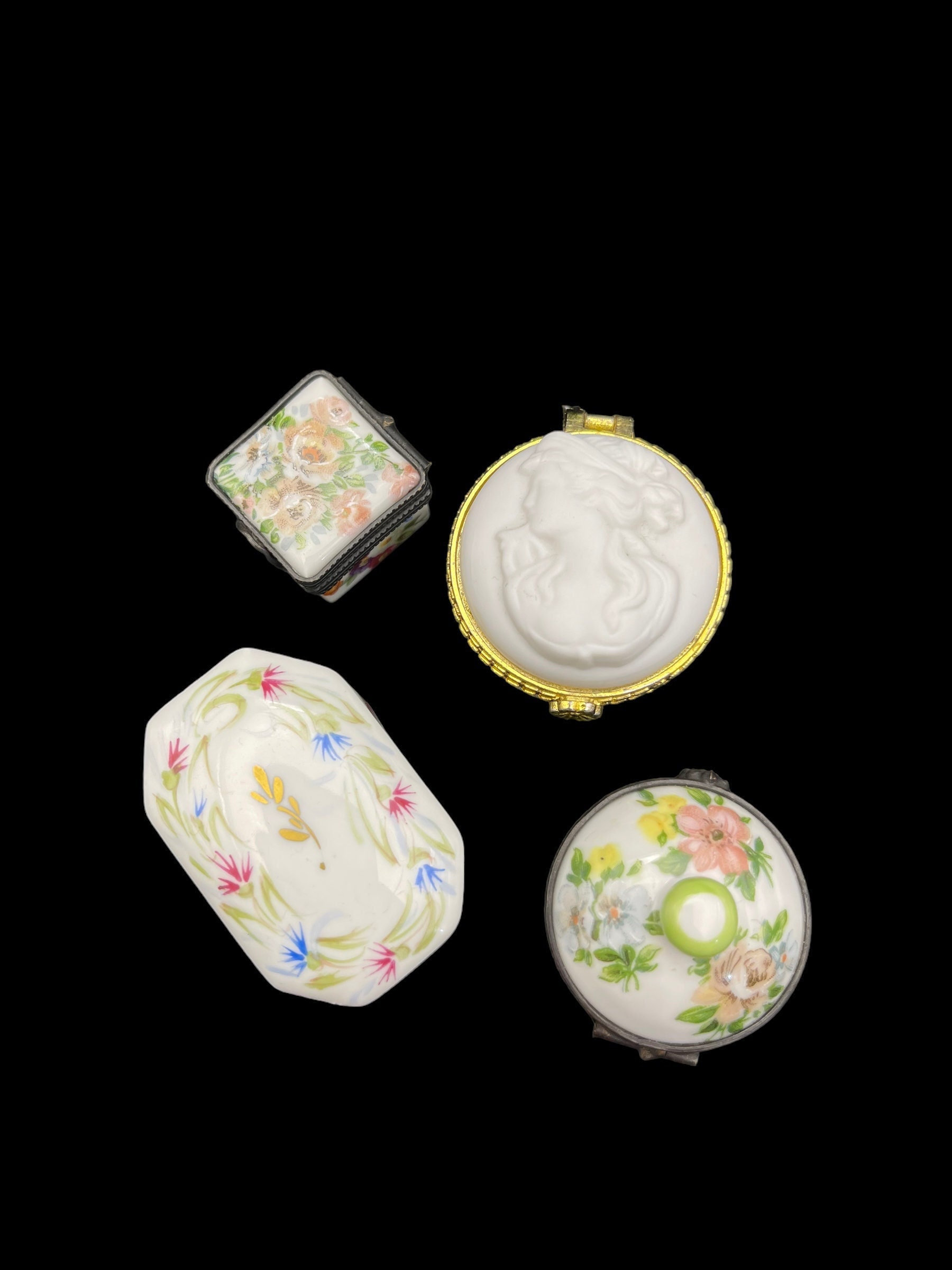Welcome to a collection of four unique hand-painted French porcelain pill boxes. Each trinket box is a work of art in its own right, displaying delicate flower motifs painted by hand.