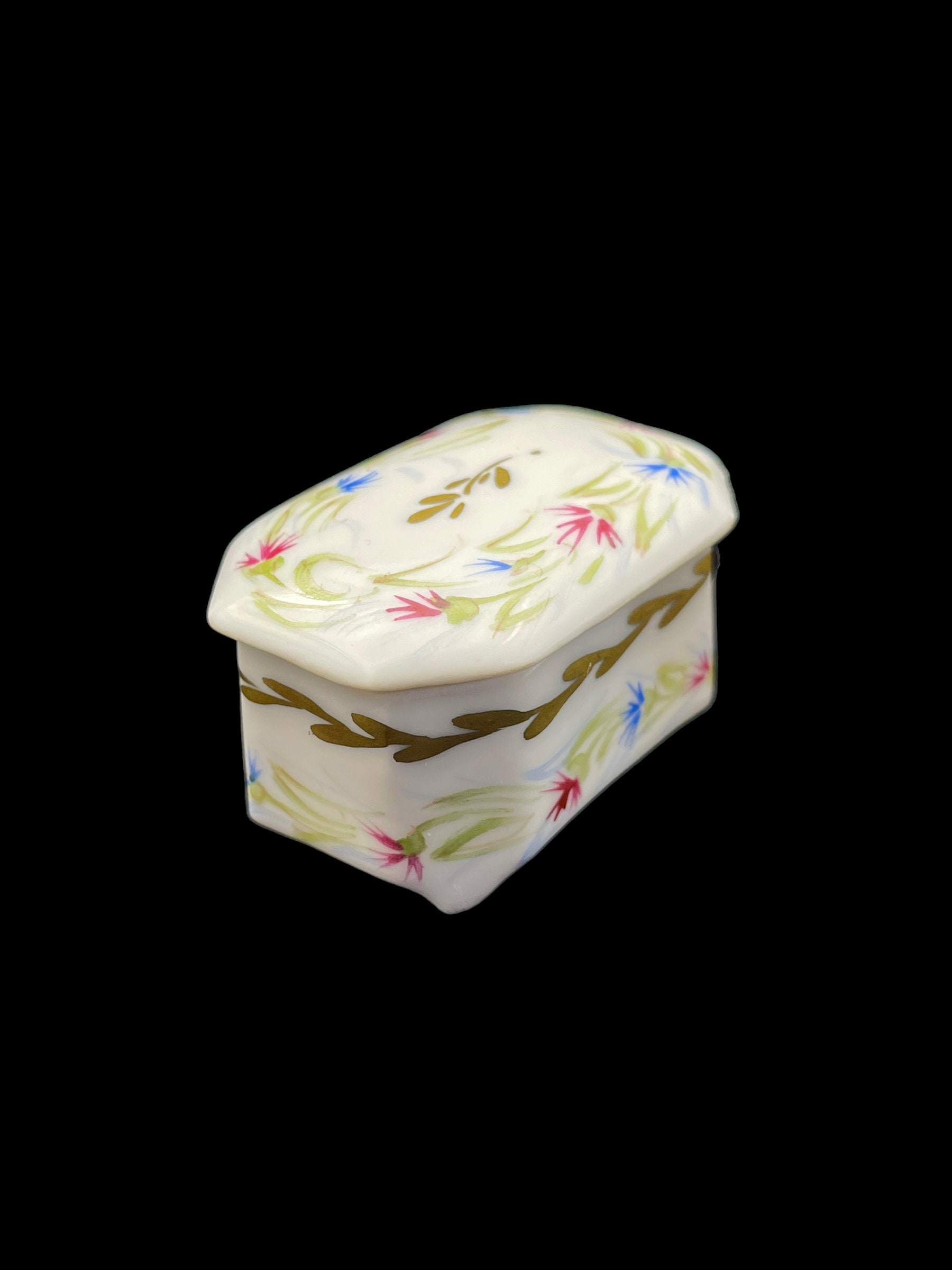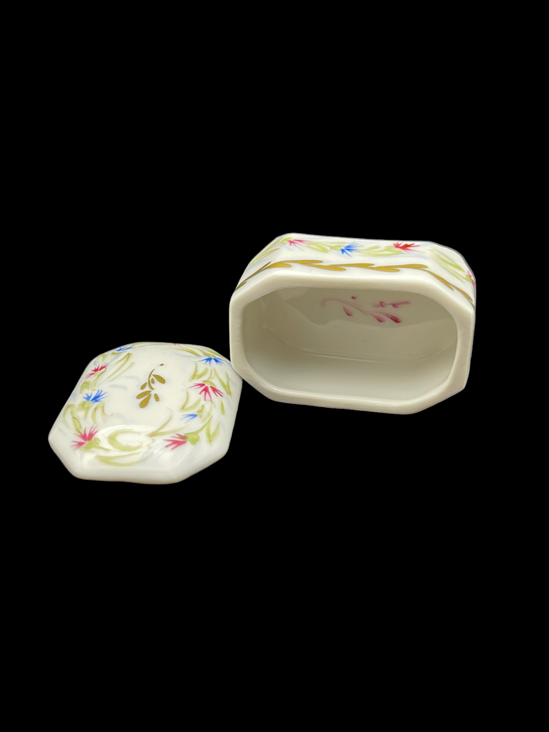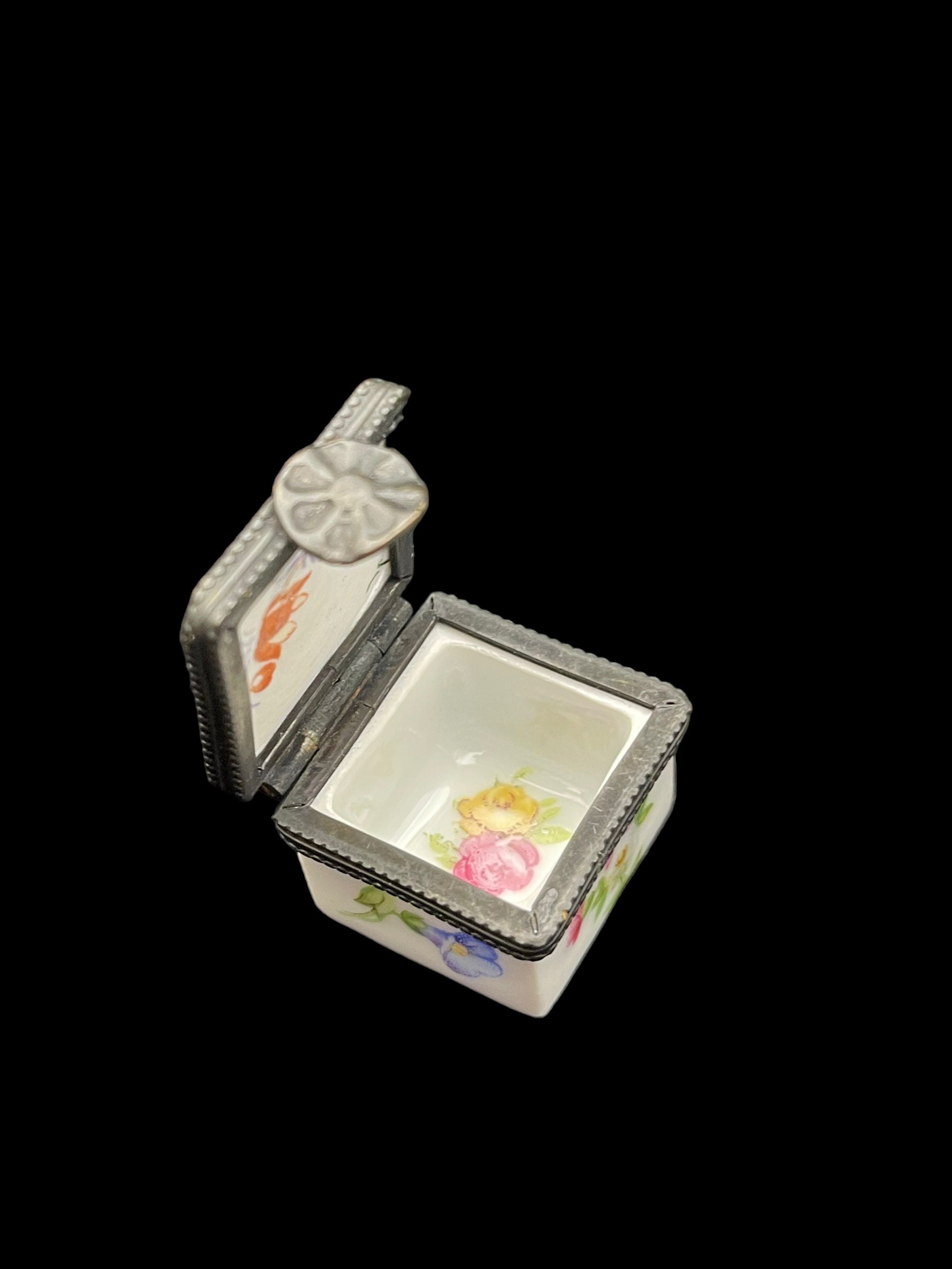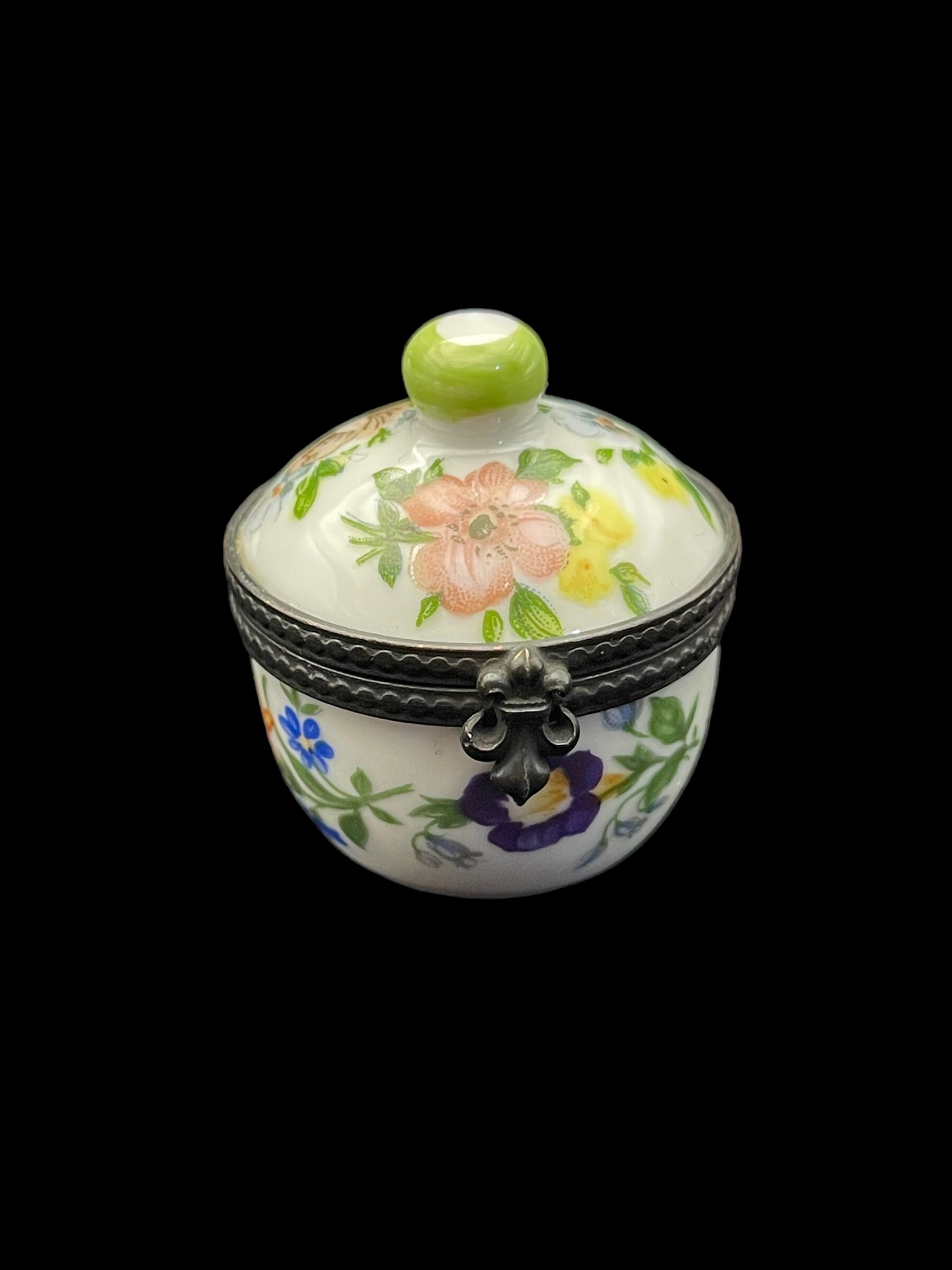 Welcome to a collection of four unique hand-painted French porcelain pill boxes. Each trinket box is a work of art in its own right, displaying delicate flower motifs painted by hand.
