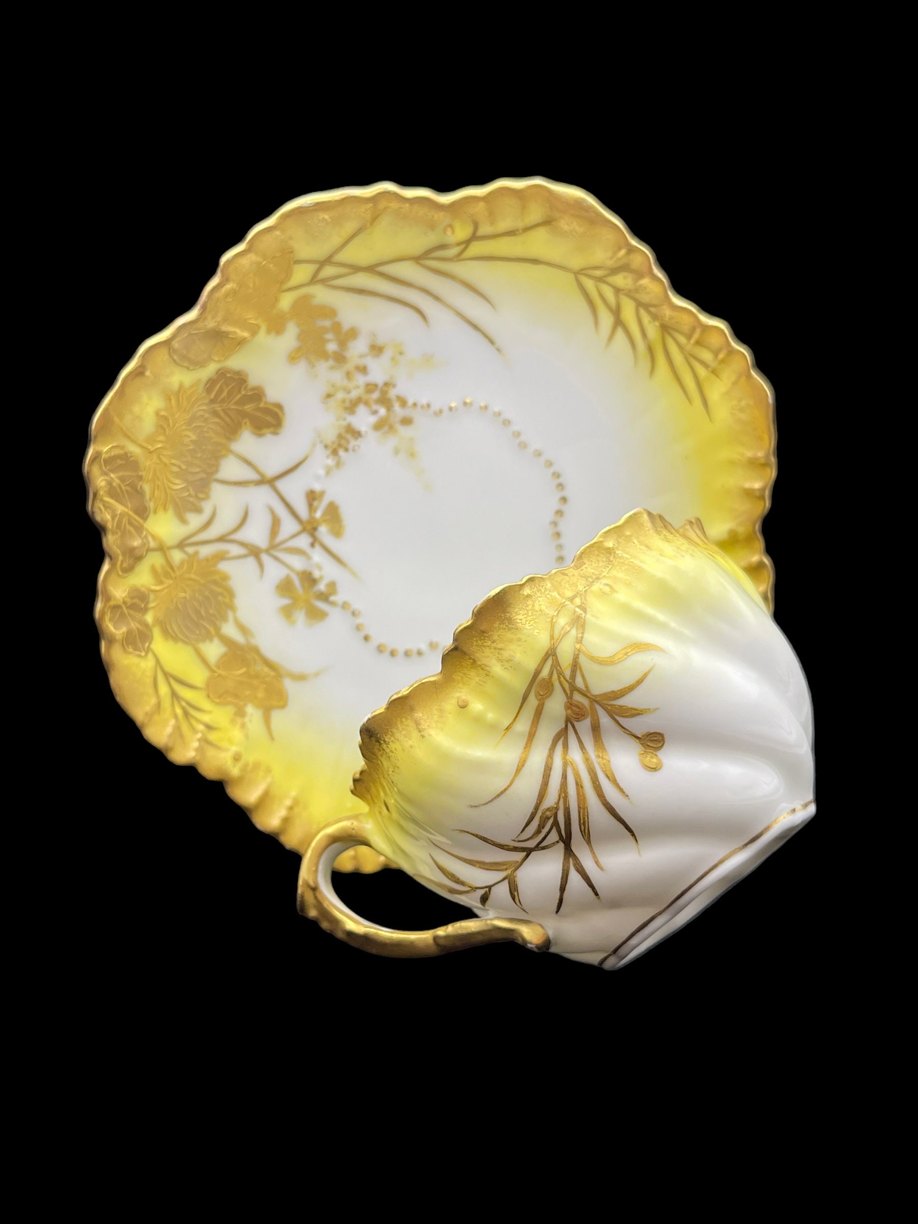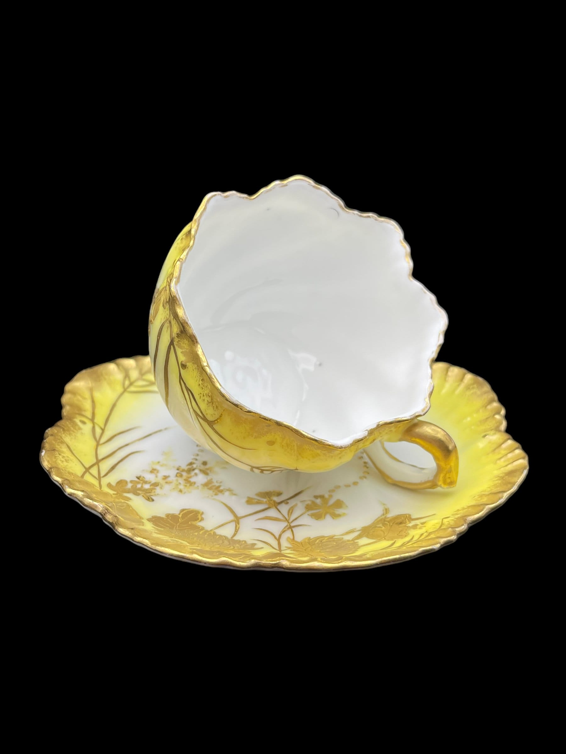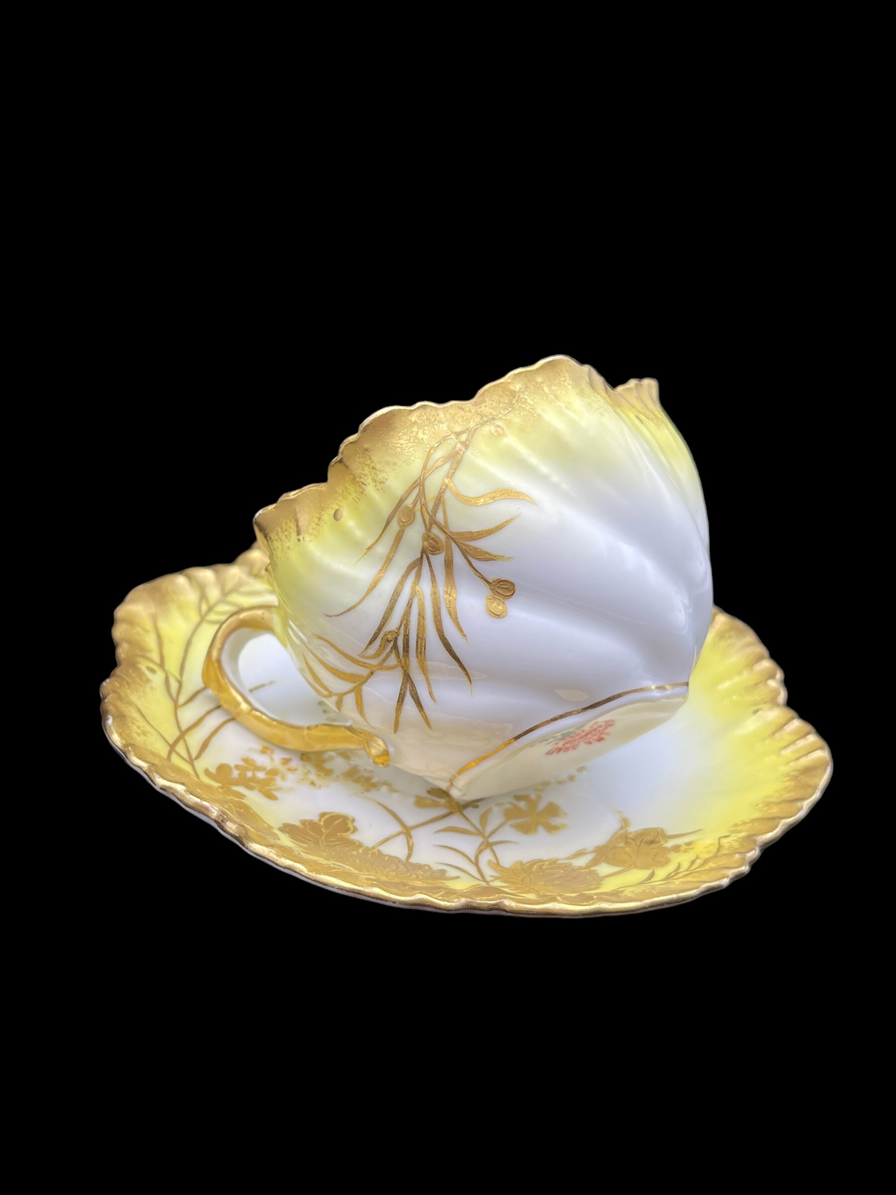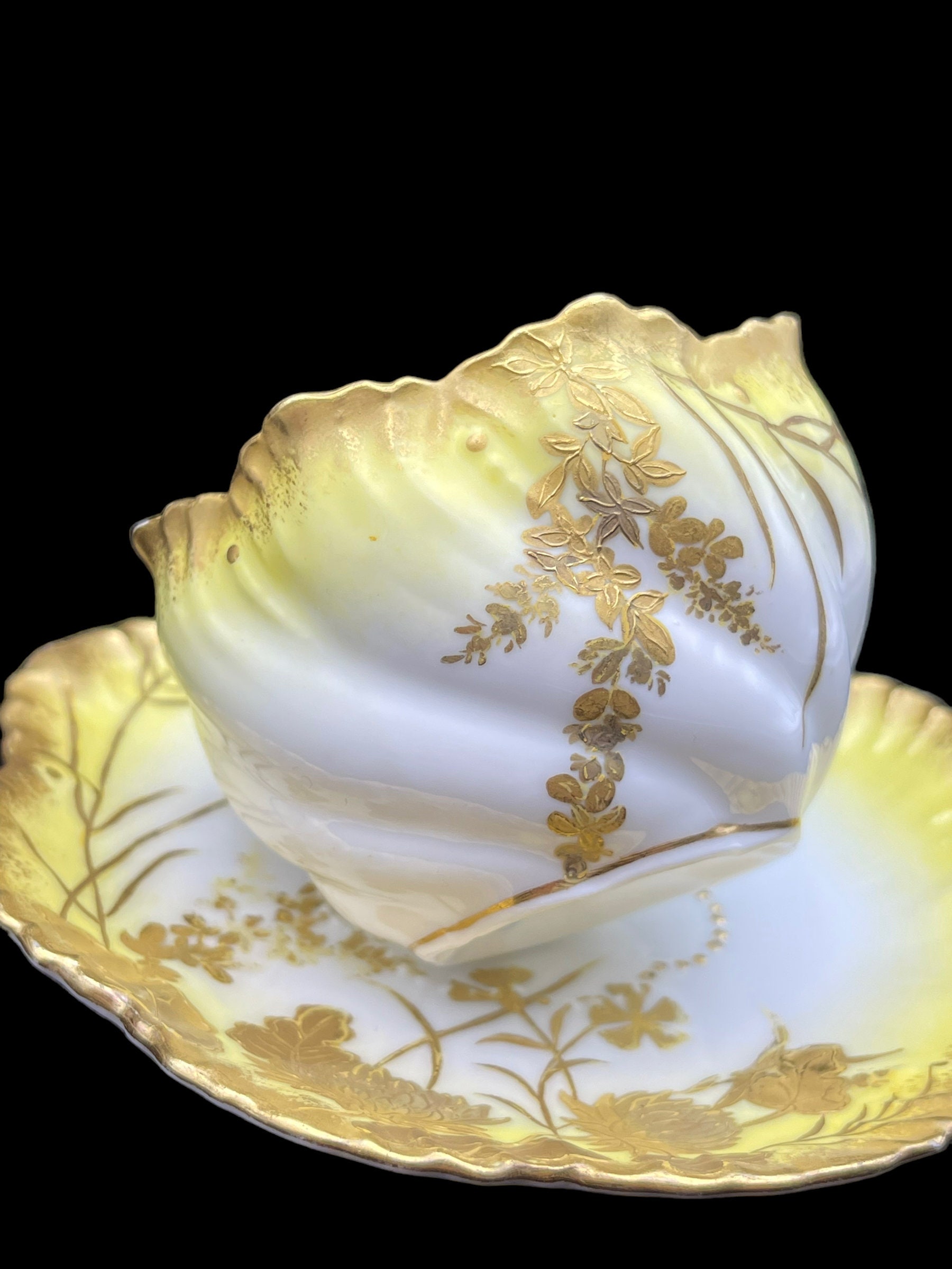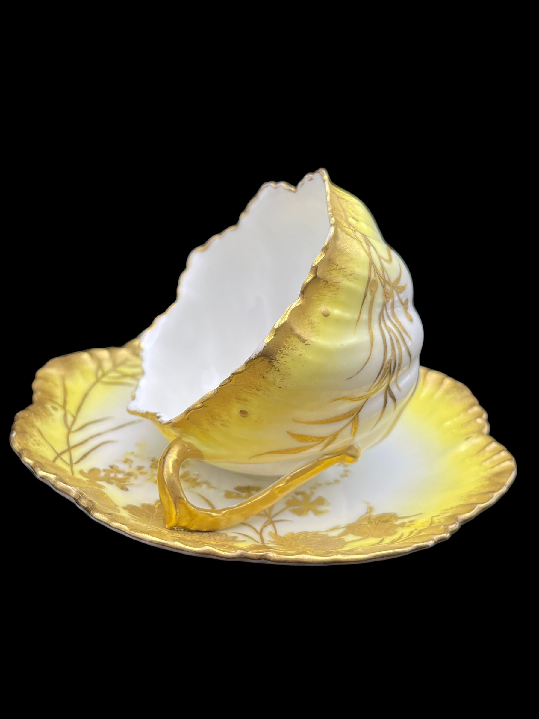 Antique Laternier Limoges Handcrafted Shell-Shaped Teacup with Delicate Floral Gold Overlay & Hand-Painted Accents, Circa 1891-1914