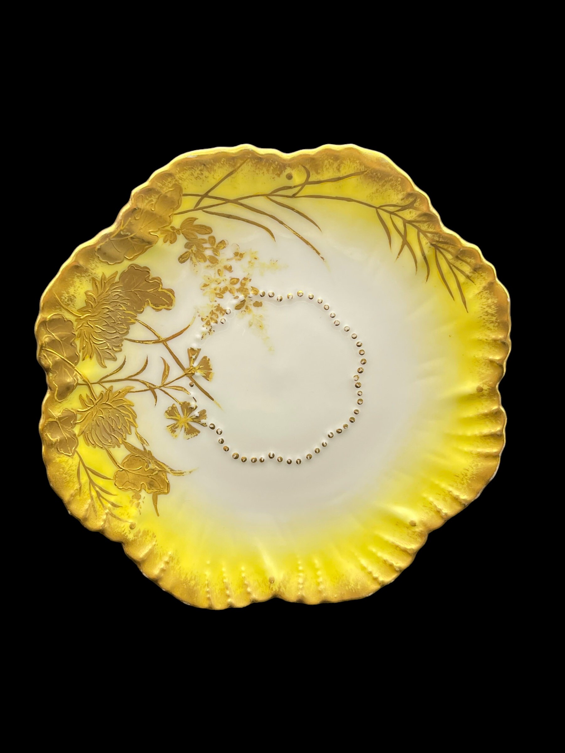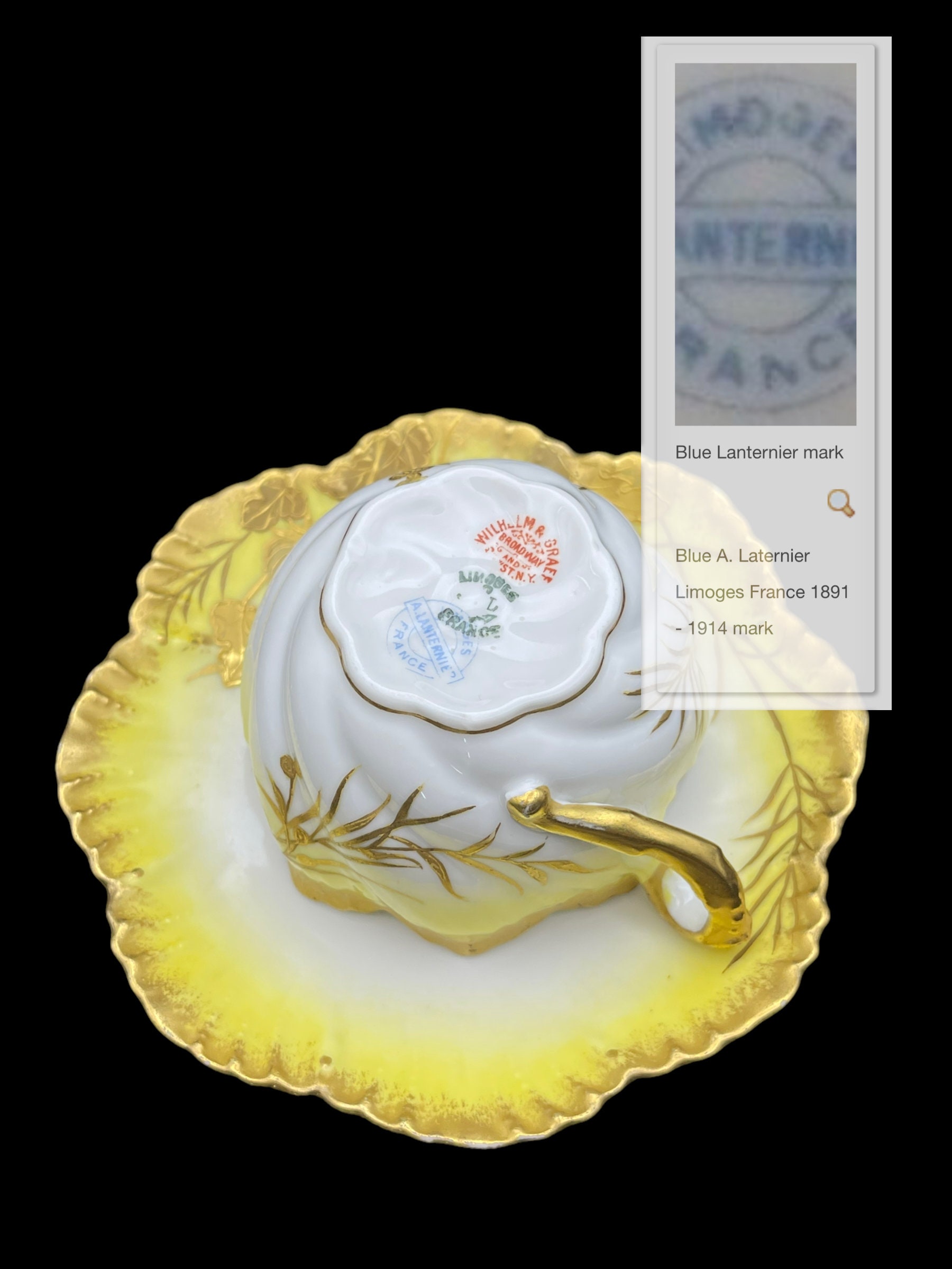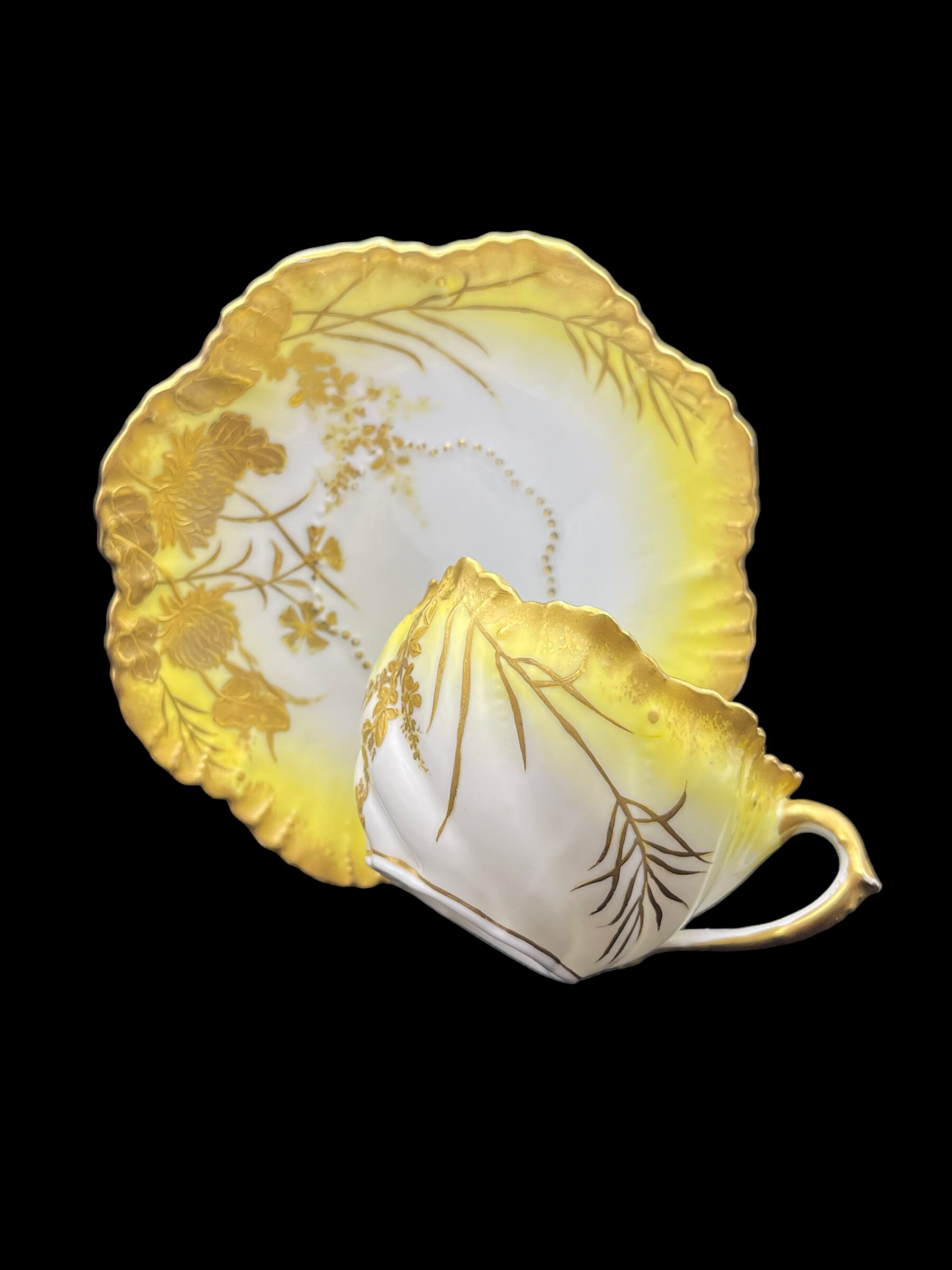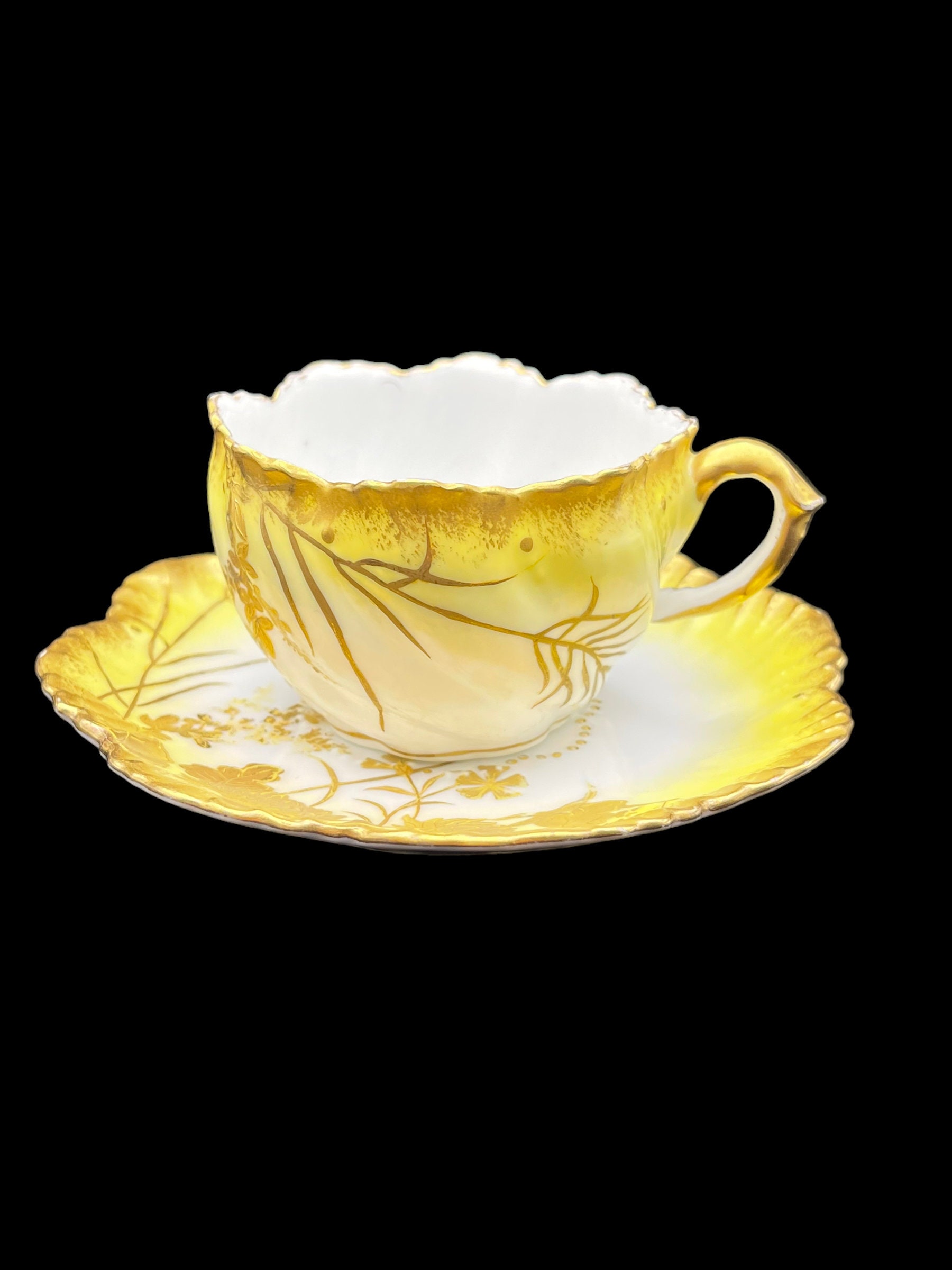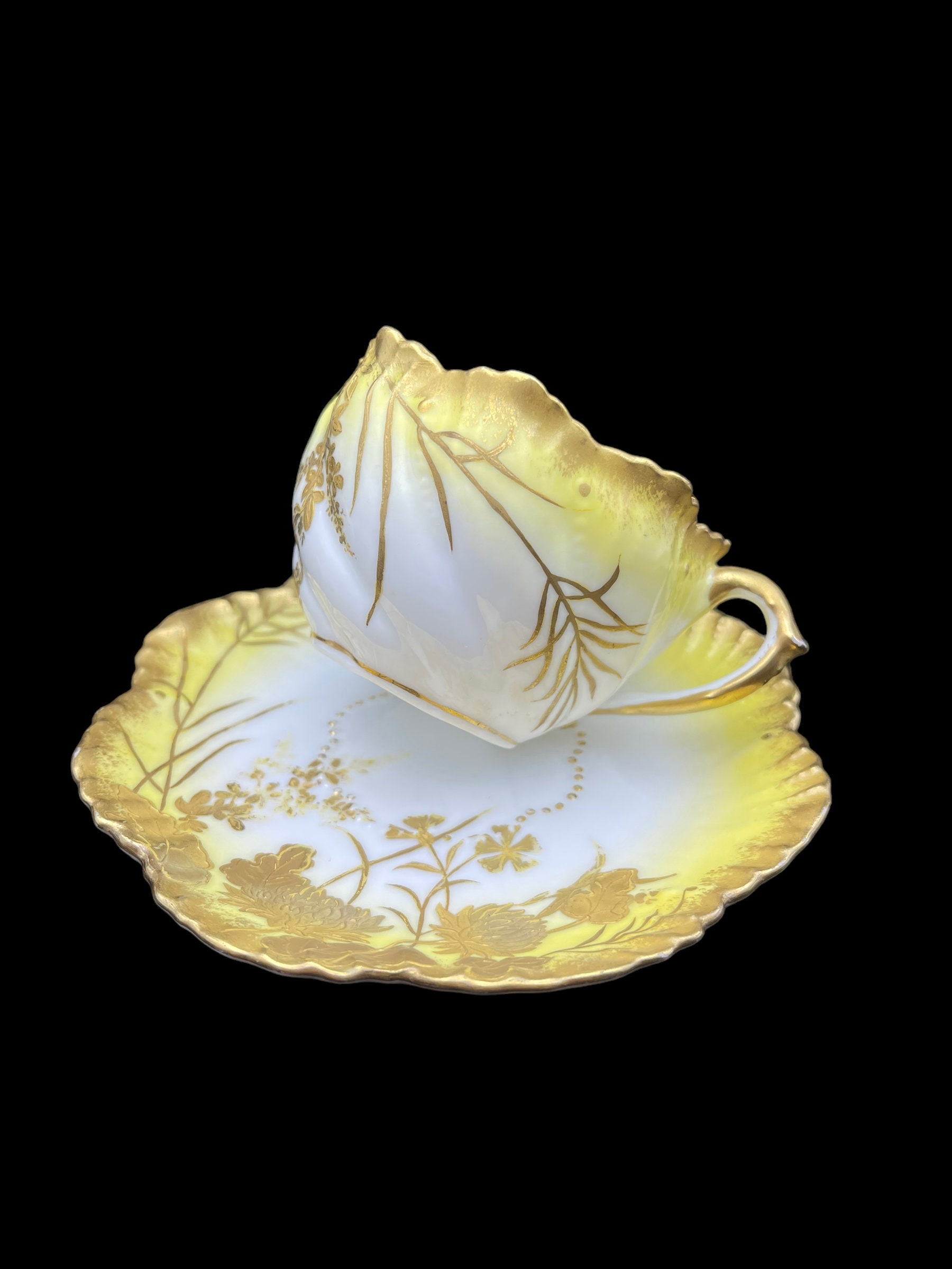 Antique Laternier Limoges Handcrafted Shell-Shaped Teacup with Delicate Floral Gold Overlay & Hand-Painted Accents, Circa 1891-1914