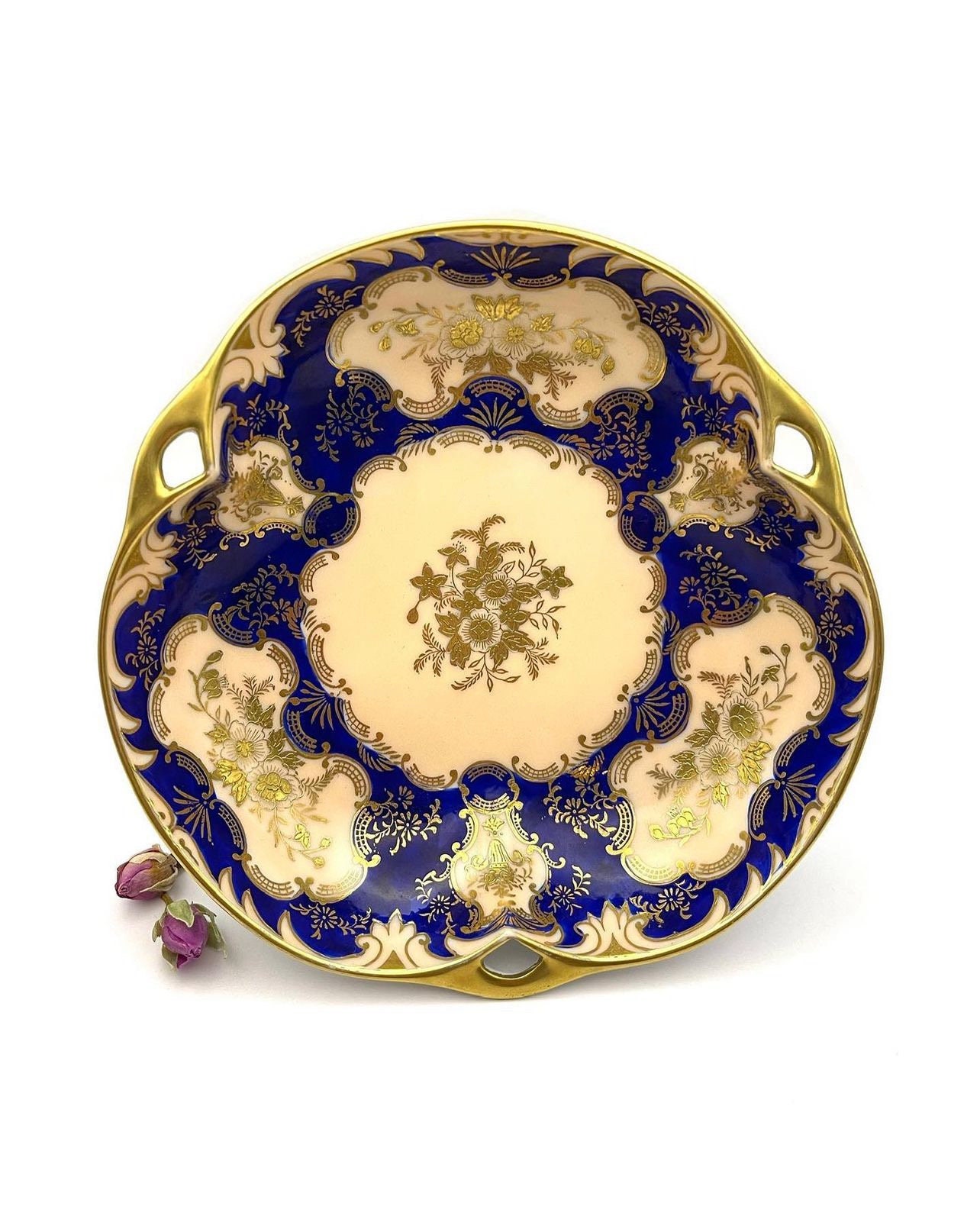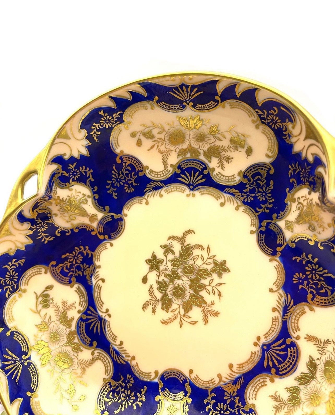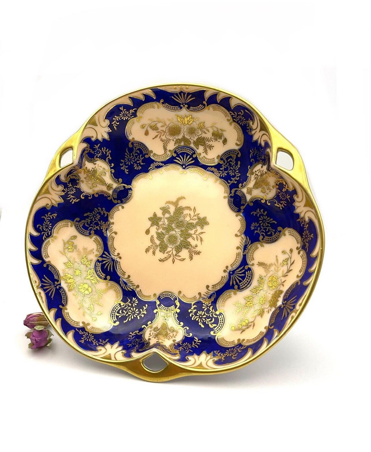 Rich cobalt blue sets the stage for the embossed gold that intricately details the bowl’s exterior, with a raised texture that adds depth and grandeur. The central cream canvas, highlighted by an ornate gold floral arrangement, offers a striking contrast that accentuates the craftsmanship.