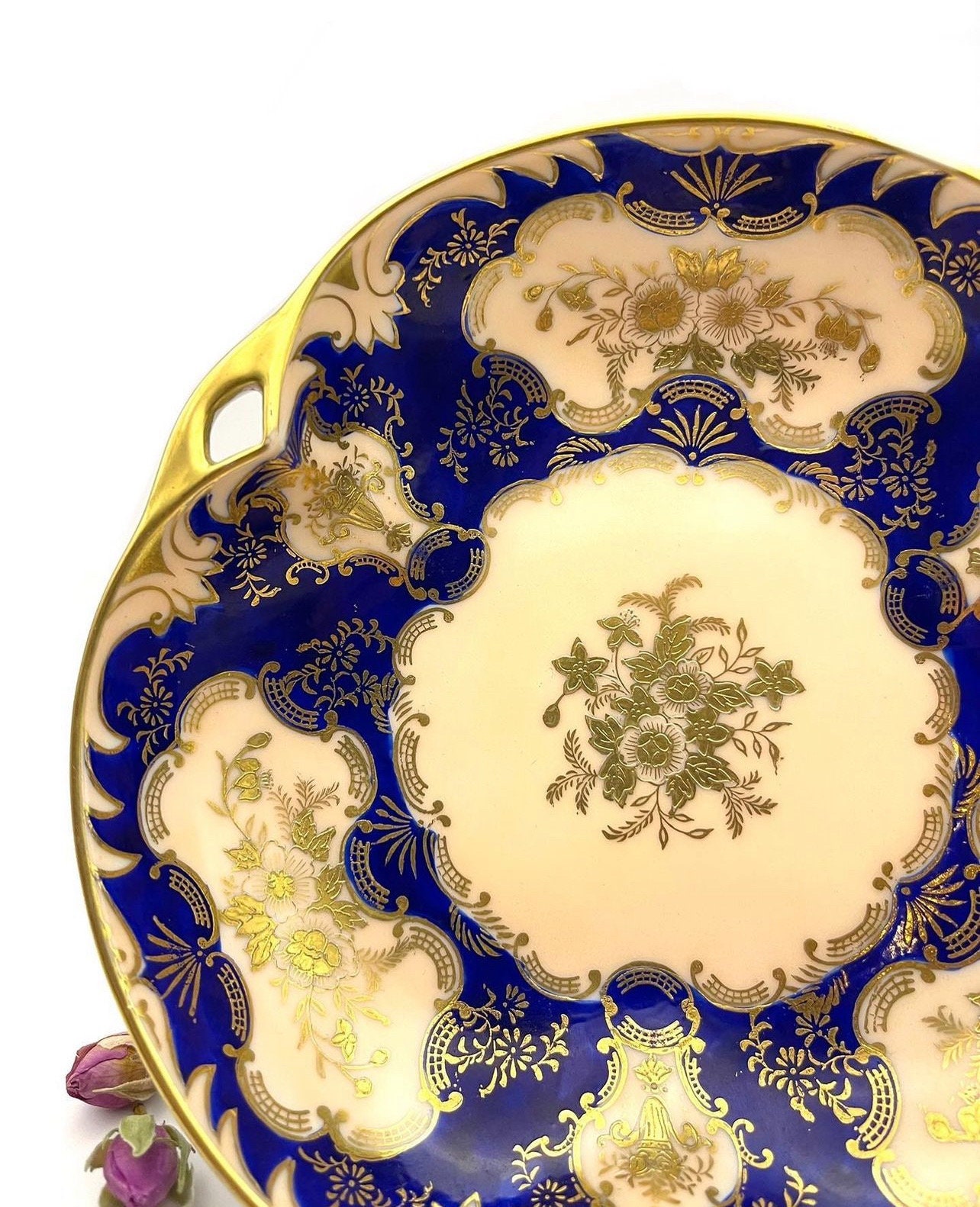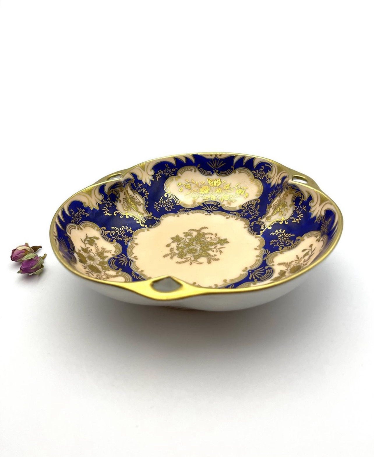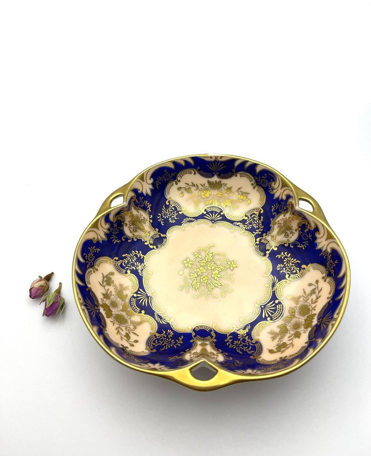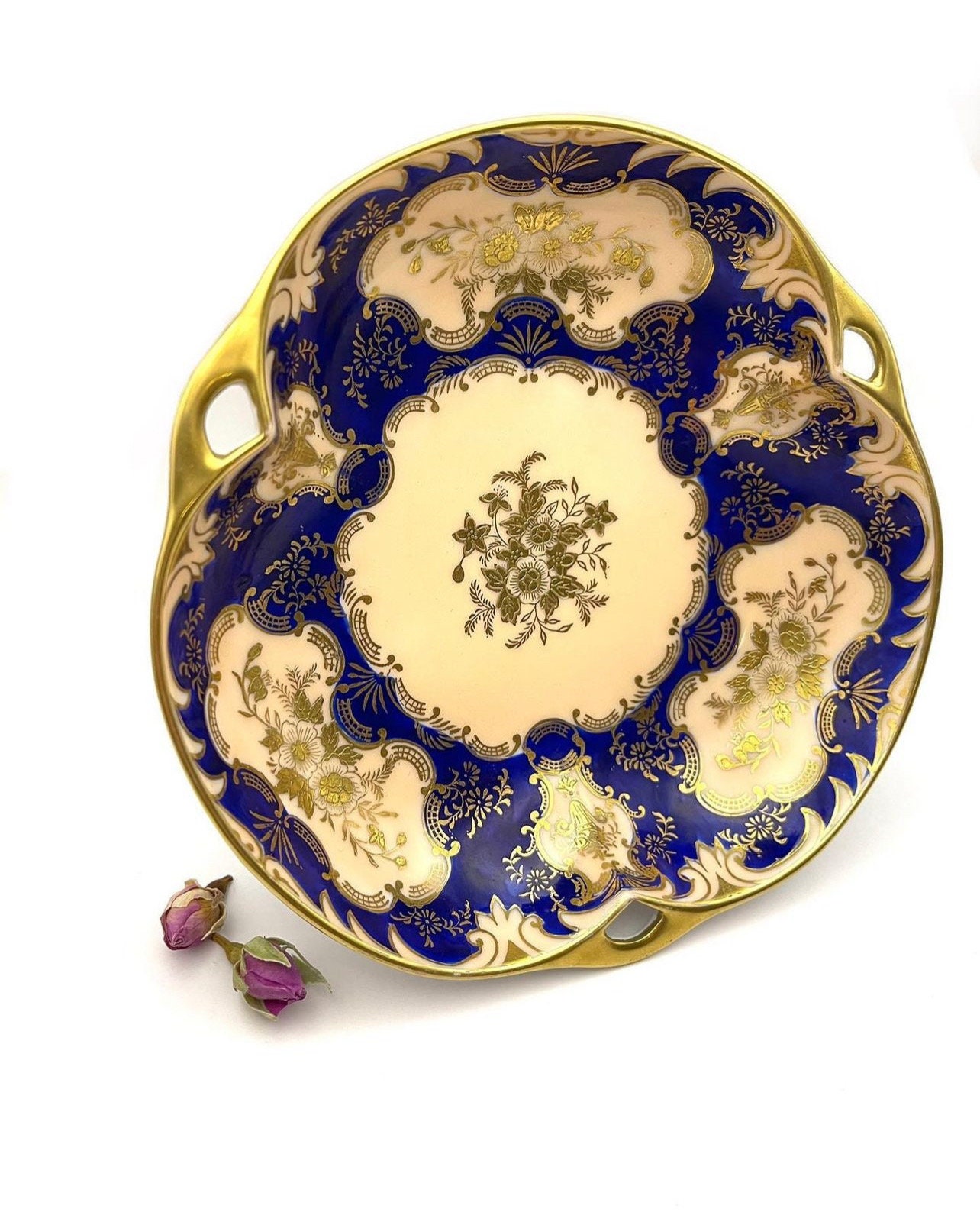 Rich cobalt blue sets the stage for the embossed gold that intricately details the bowl’s exterior, with a raised texture that adds depth and grandeur. The central cream canvas, highlighted by an ornate gold floral arrangement, offers a striking contrast that accentuates the craftsmanship.