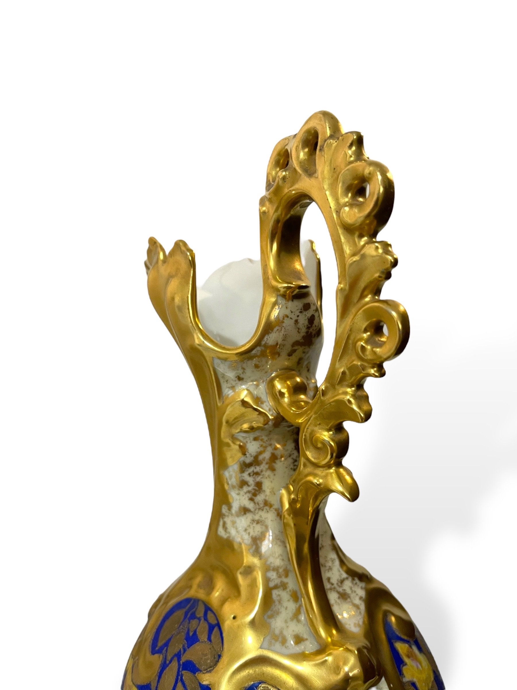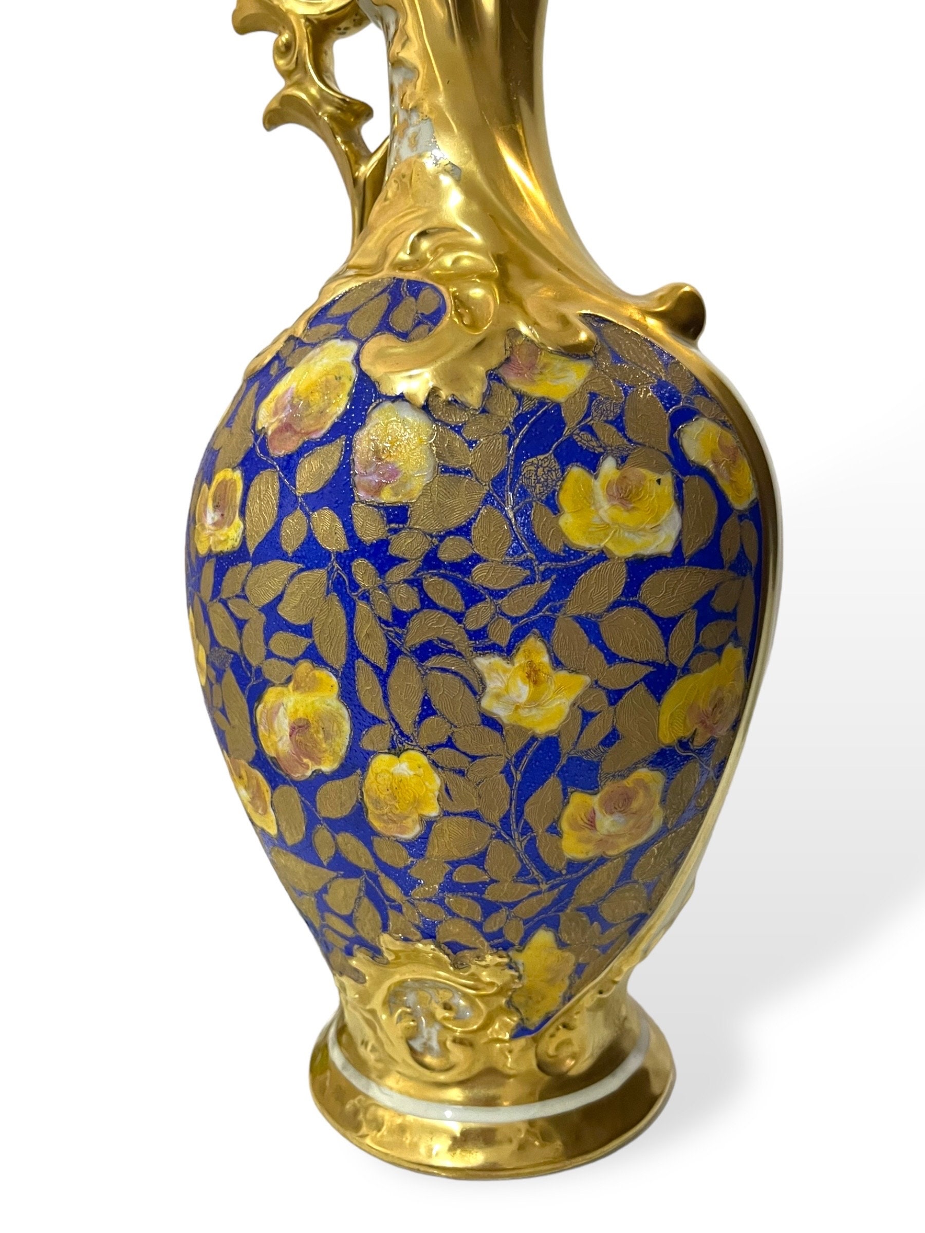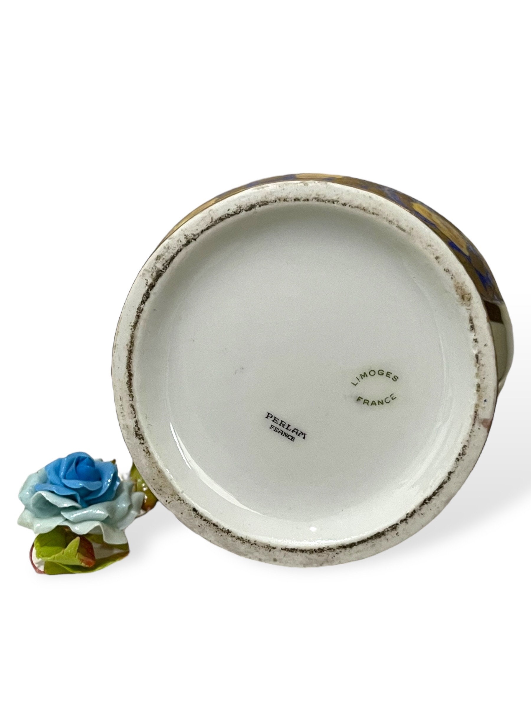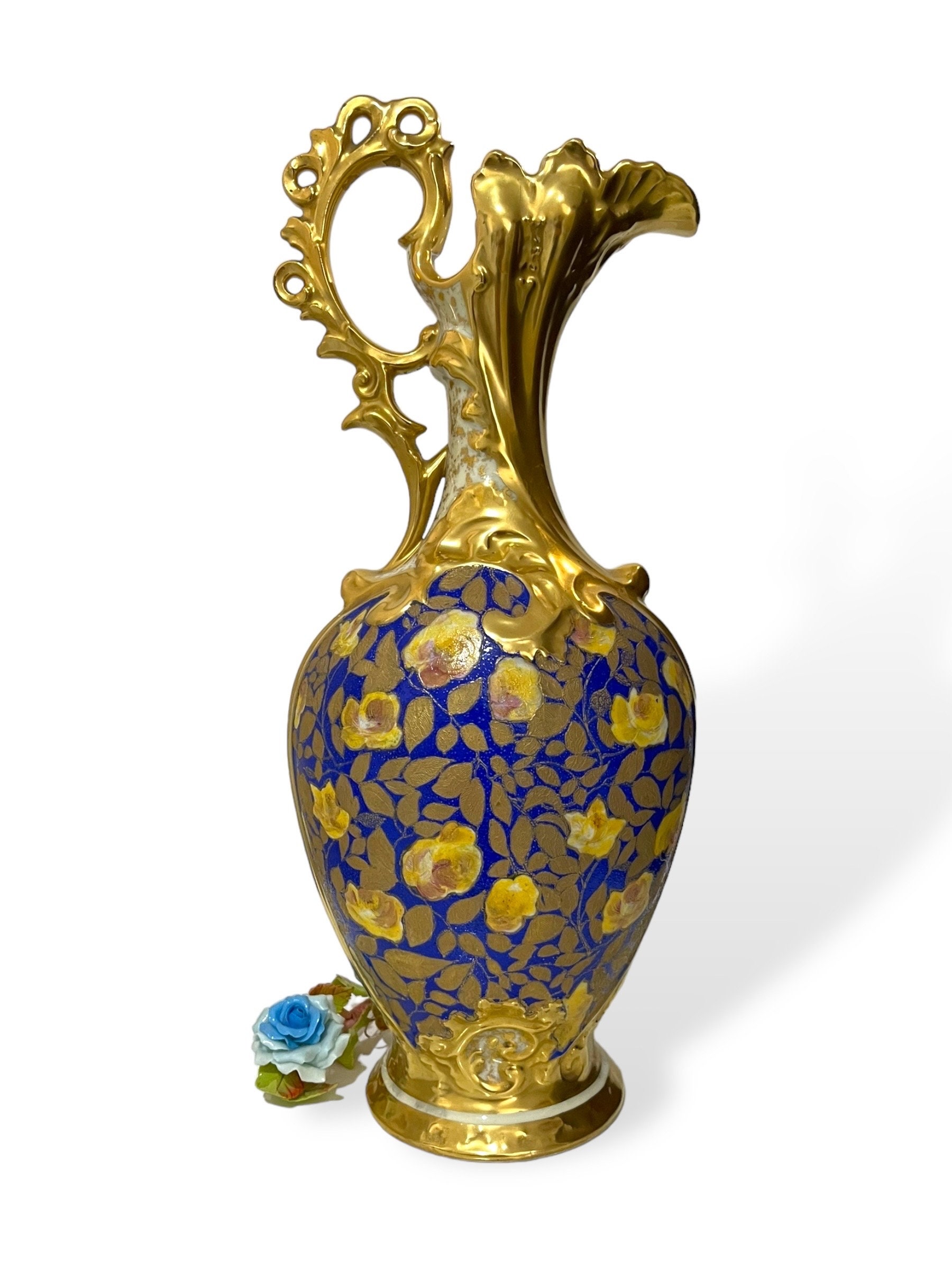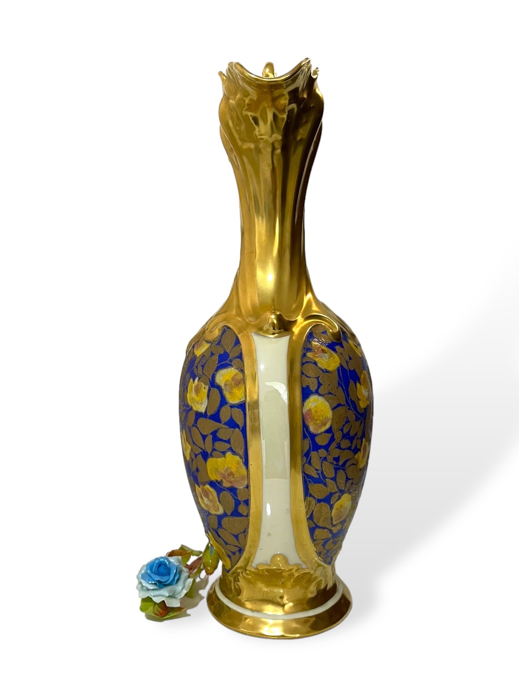This striking early 20th-century French Limoges vase, adorned with gold gilding, is a true masterpiece of handcrafted artistry. Standing tall at 40 cm (approximately 15.75 inches), its vibrant cobalt blue surface is elegantly highlighted with hand-painted golden florals. The vase carries the prestigious Limoges mark, a testament to its authenticity and quality. In impeccable condition, this piece is a collector’s dream and an opulent addition to any refined décor.