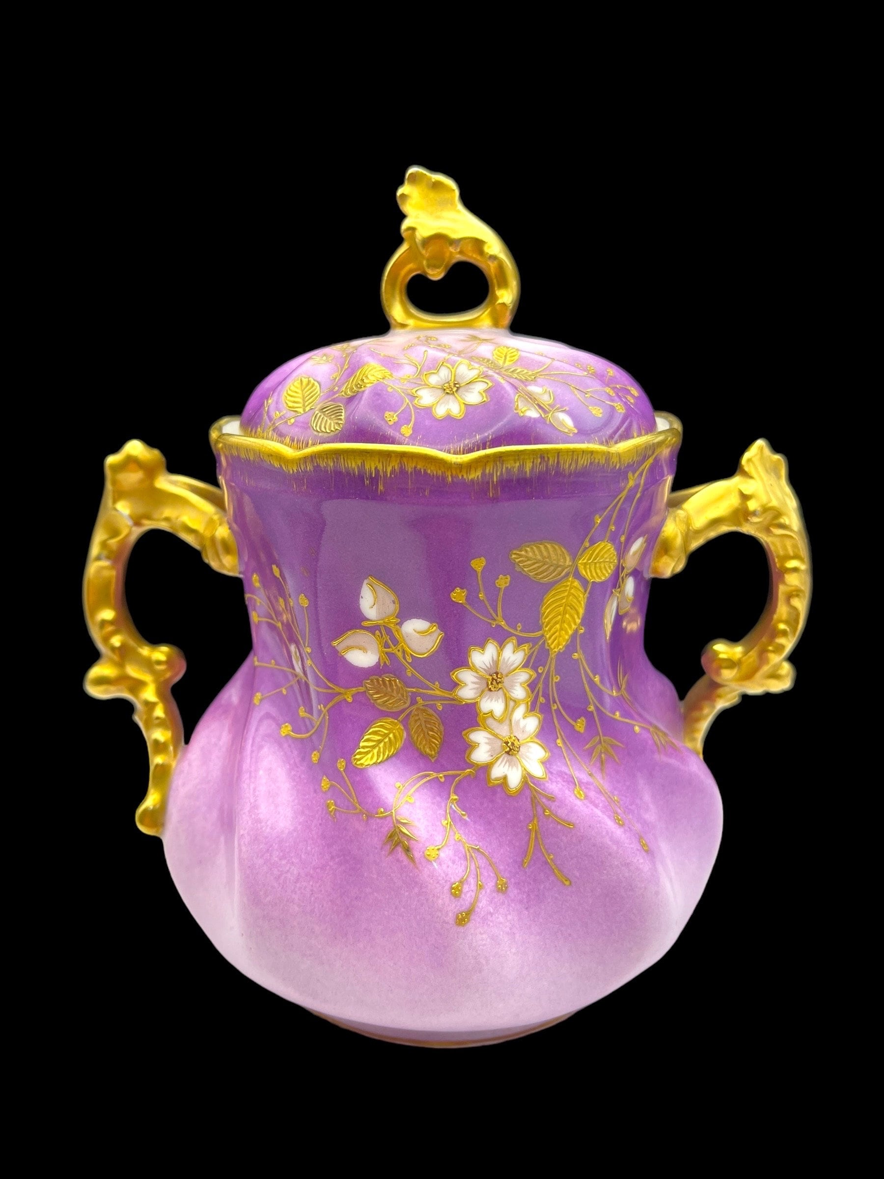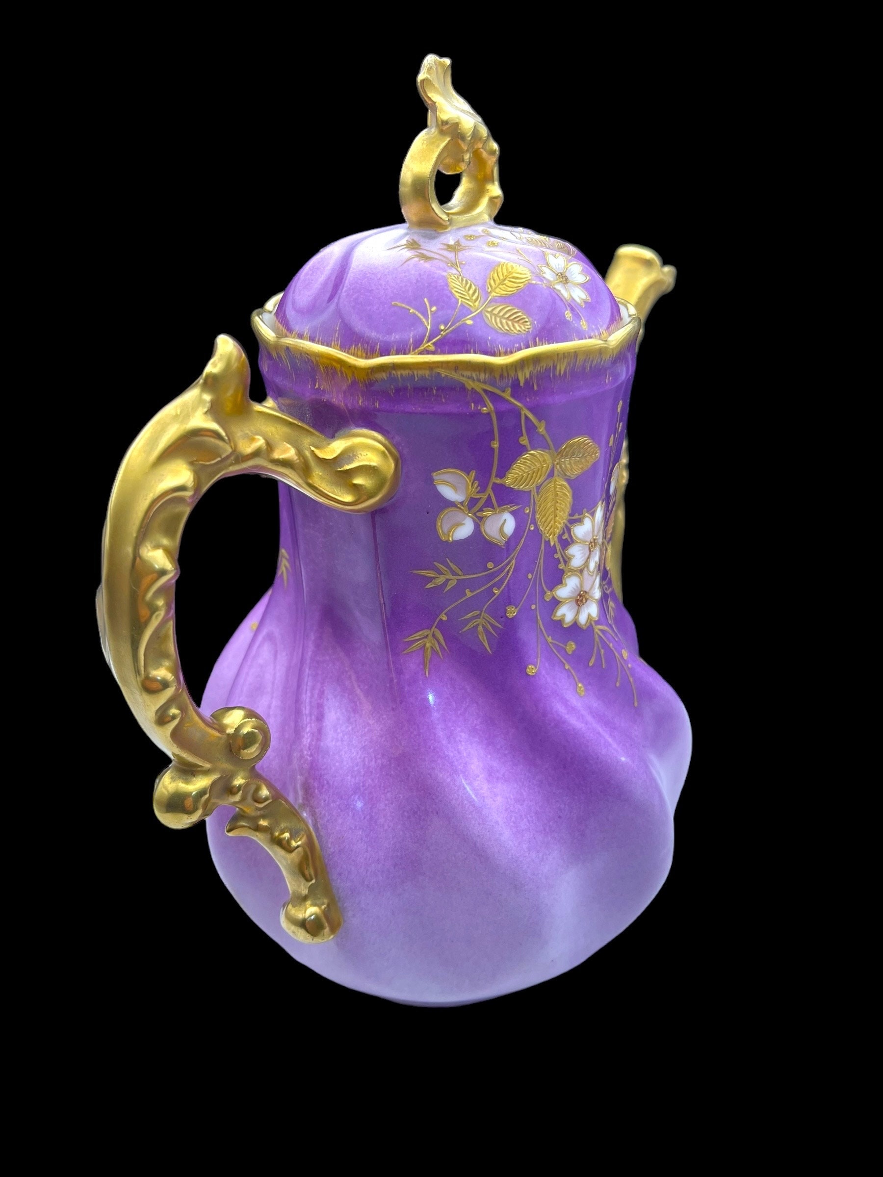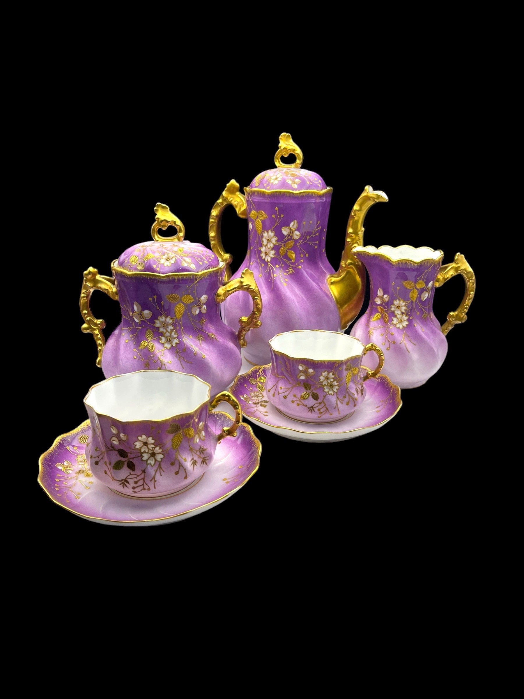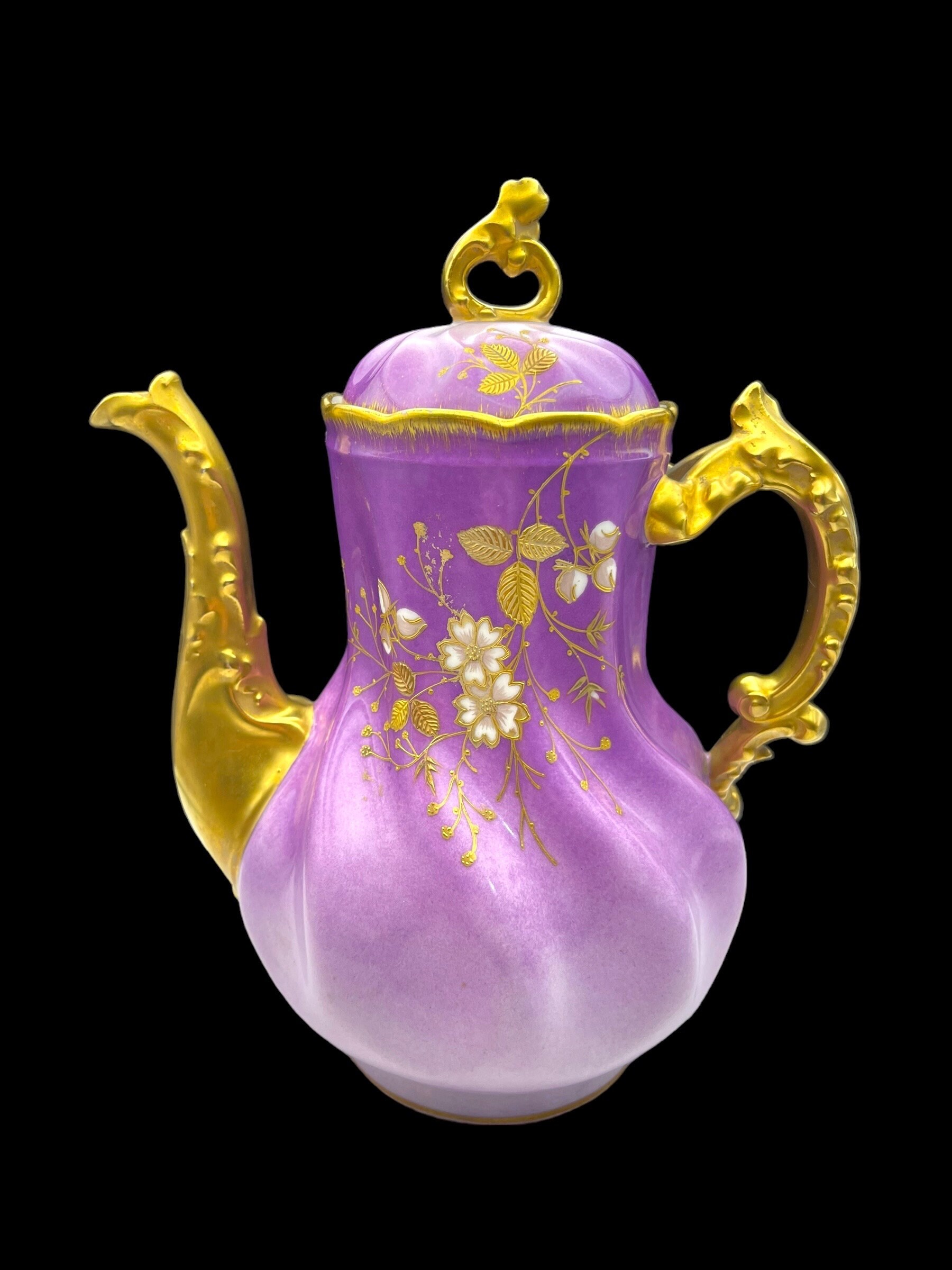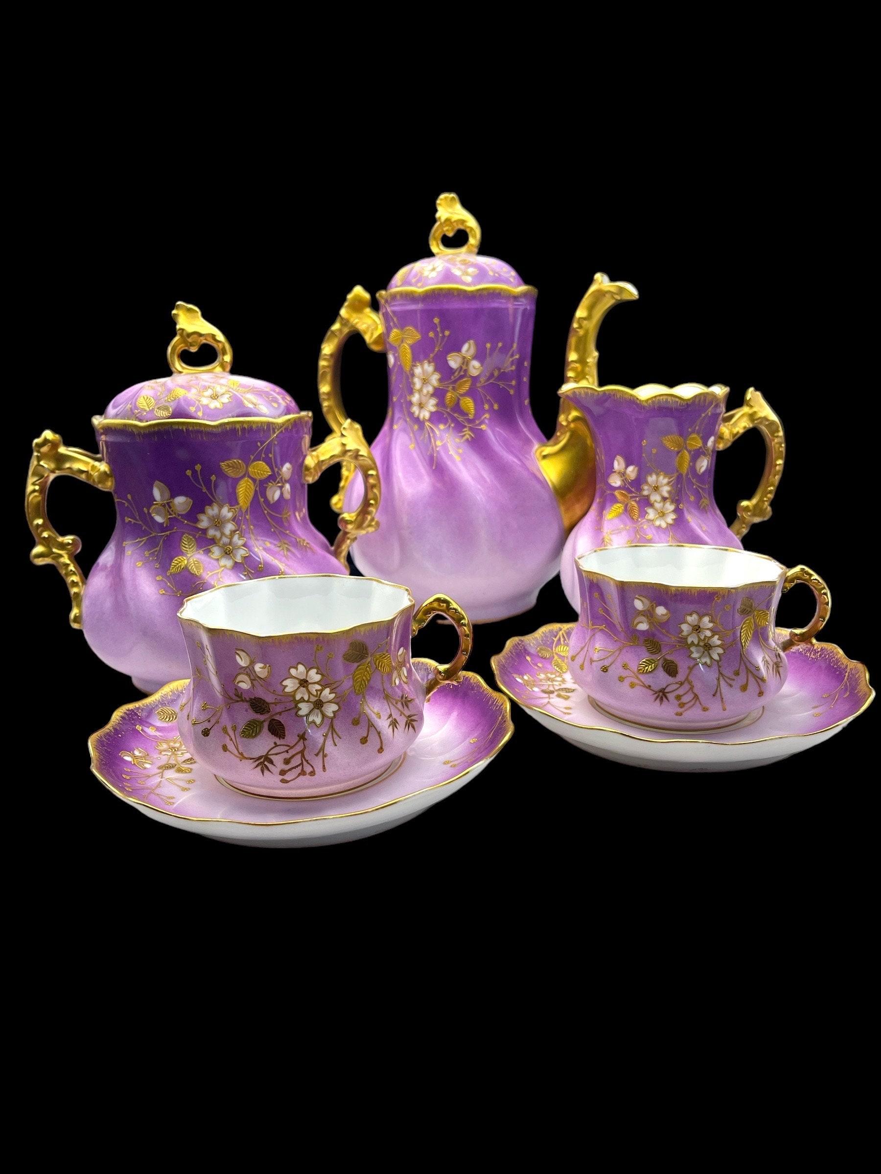 This resplendent collection features a teapot, sugar bowl, creamer, and two tea cups, all dressed in a sumptuous lilac hue adorned with gold accents and delicate floral motifs. The teapot and serving pieces are graced with intricate gold handles and spouts, their curves and flourishes invoking the artistry of the era. The cups, edged with gold that shows tender signs of wear, whisper tales of past gatherings, while the sugar bowl bears a discreet hairline crack, a testament to its venerable history. The flaw is superficial, leaving the integrity and functionality of the bowl intact.