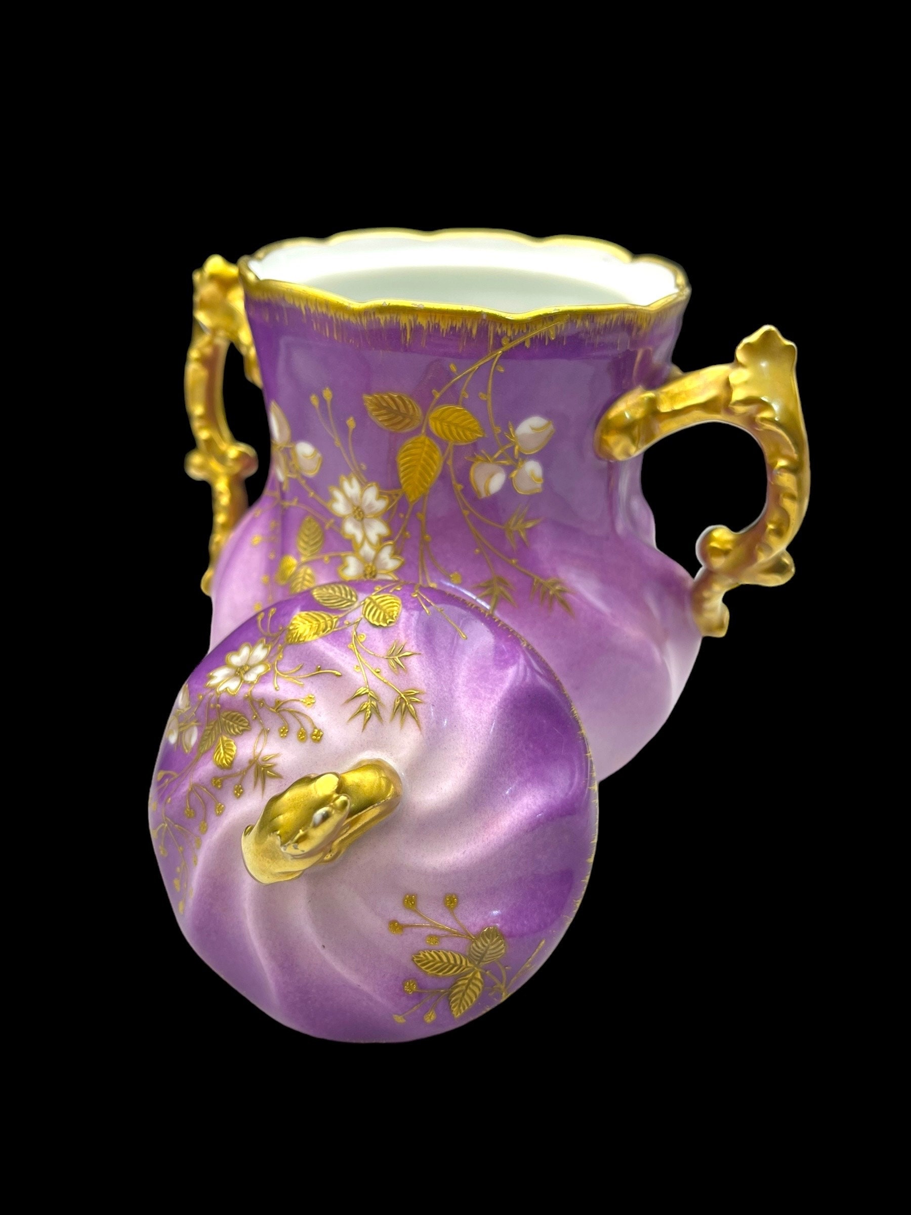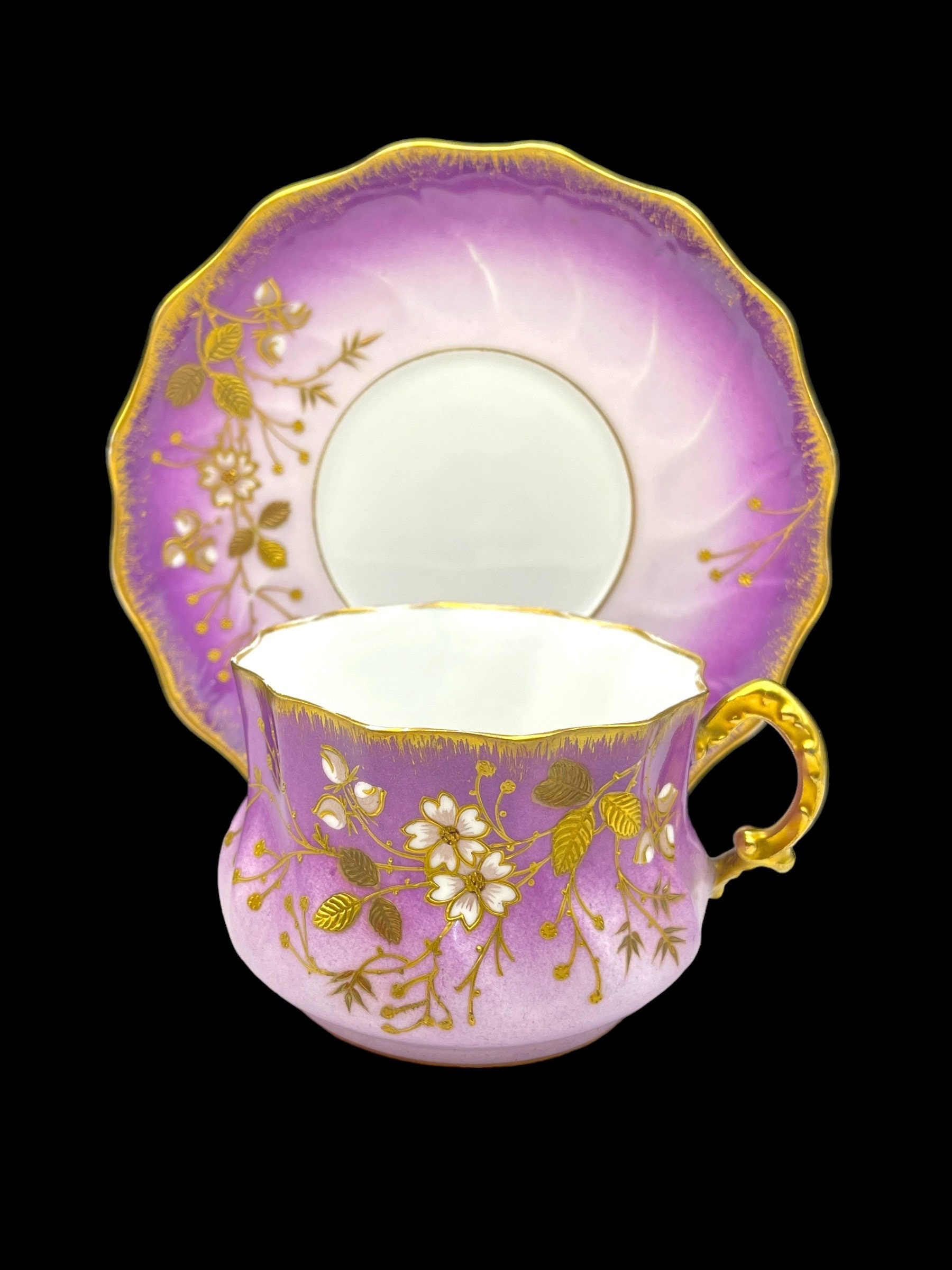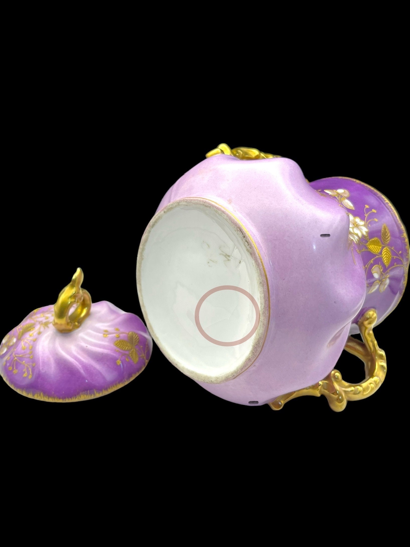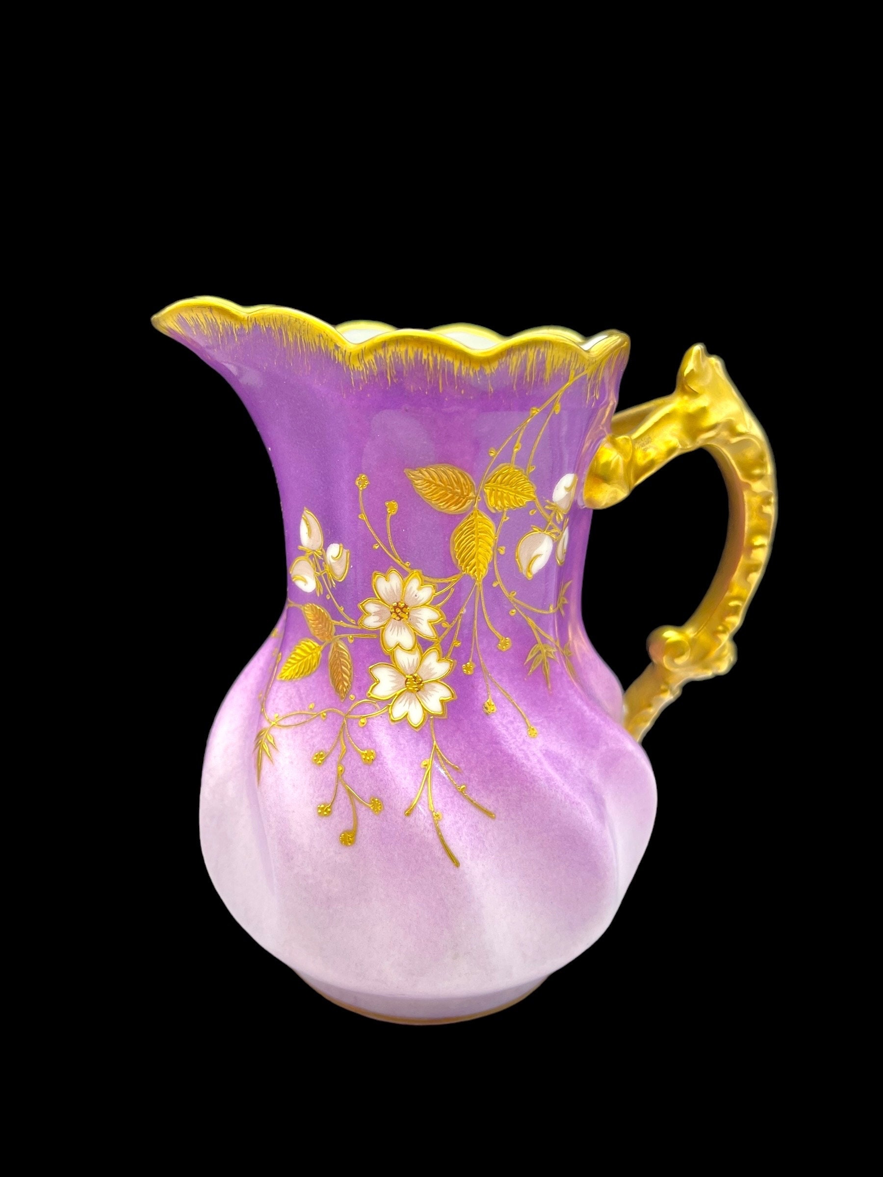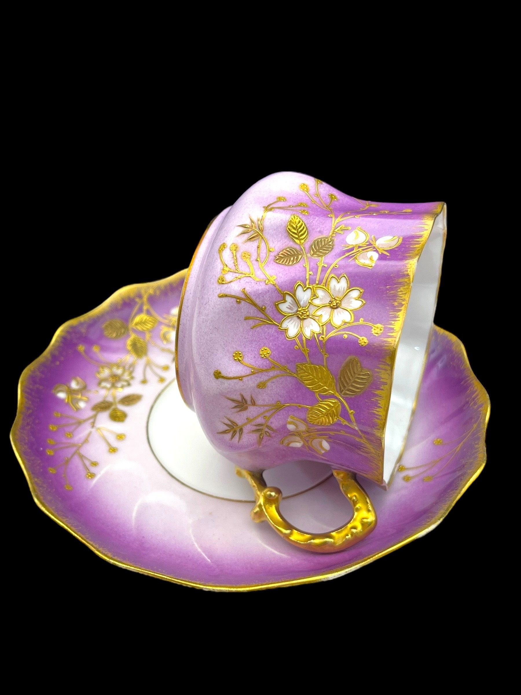 This resplendent collection features a teapot, sugar bowl, creamer, and two tea cups, all dressed in a sumptuous lilac hue adorned with gold accents and delicate floral motifs. The teapot and serving pieces are graced with intricate gold handles and spouts, their curves and flourishes invoking the artistry of the era. The cups, edged with gold that shows tender signs of wear, whisper tales of past gatherings, while the sugar bowl bears a discreet hairline crack, a testament to its venerable history. The flaw is superficial, leaving the integrity and functionality of the bowl intact.