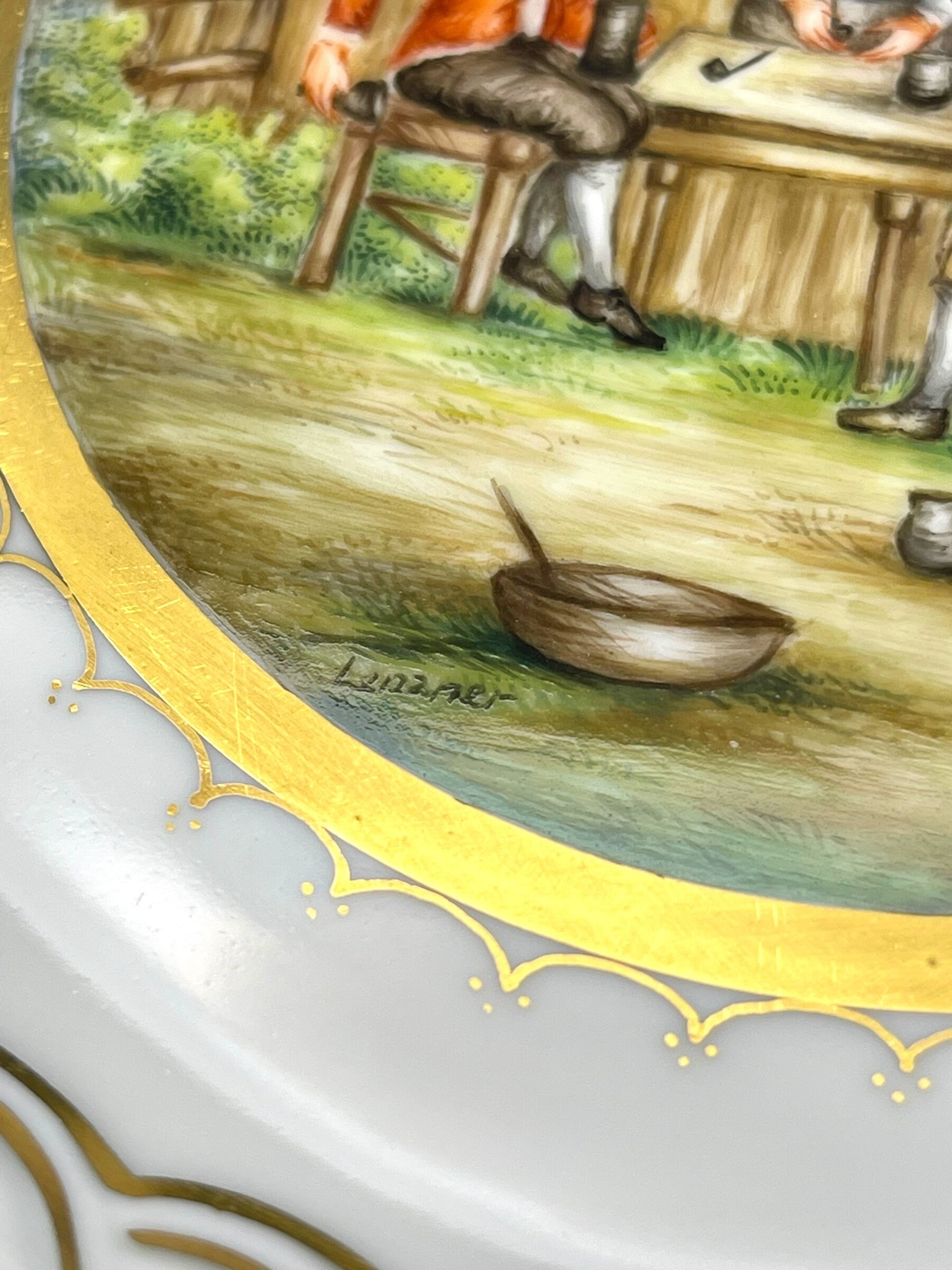 This exquisite antique Carl Thieme Potschappel Dresden German porcelain plate features a beautifully reticulated rim and intricate hand-painted scenes. Measuring 23.5 cm (9.25 inches) in diameter, the plate showcases vibrant floral patterns and a central scene depicting three figures in a pastoral setting.