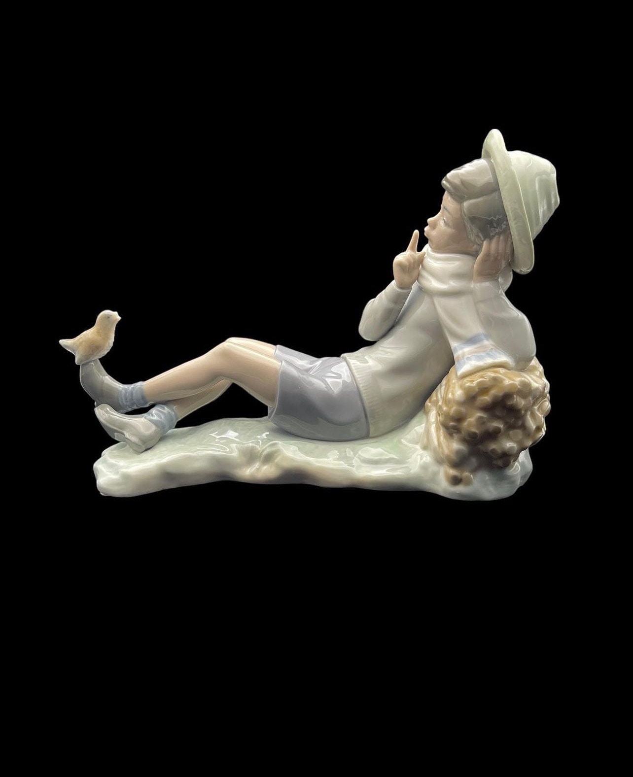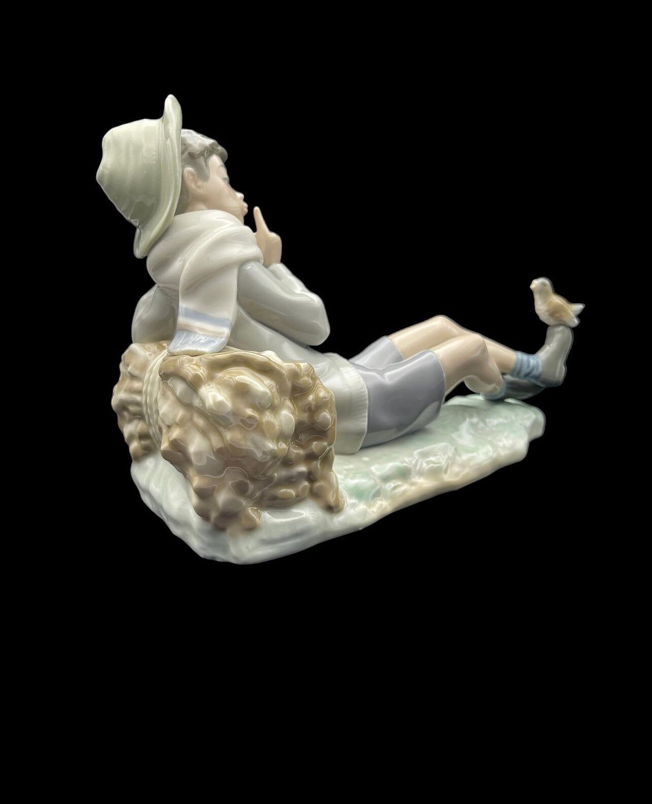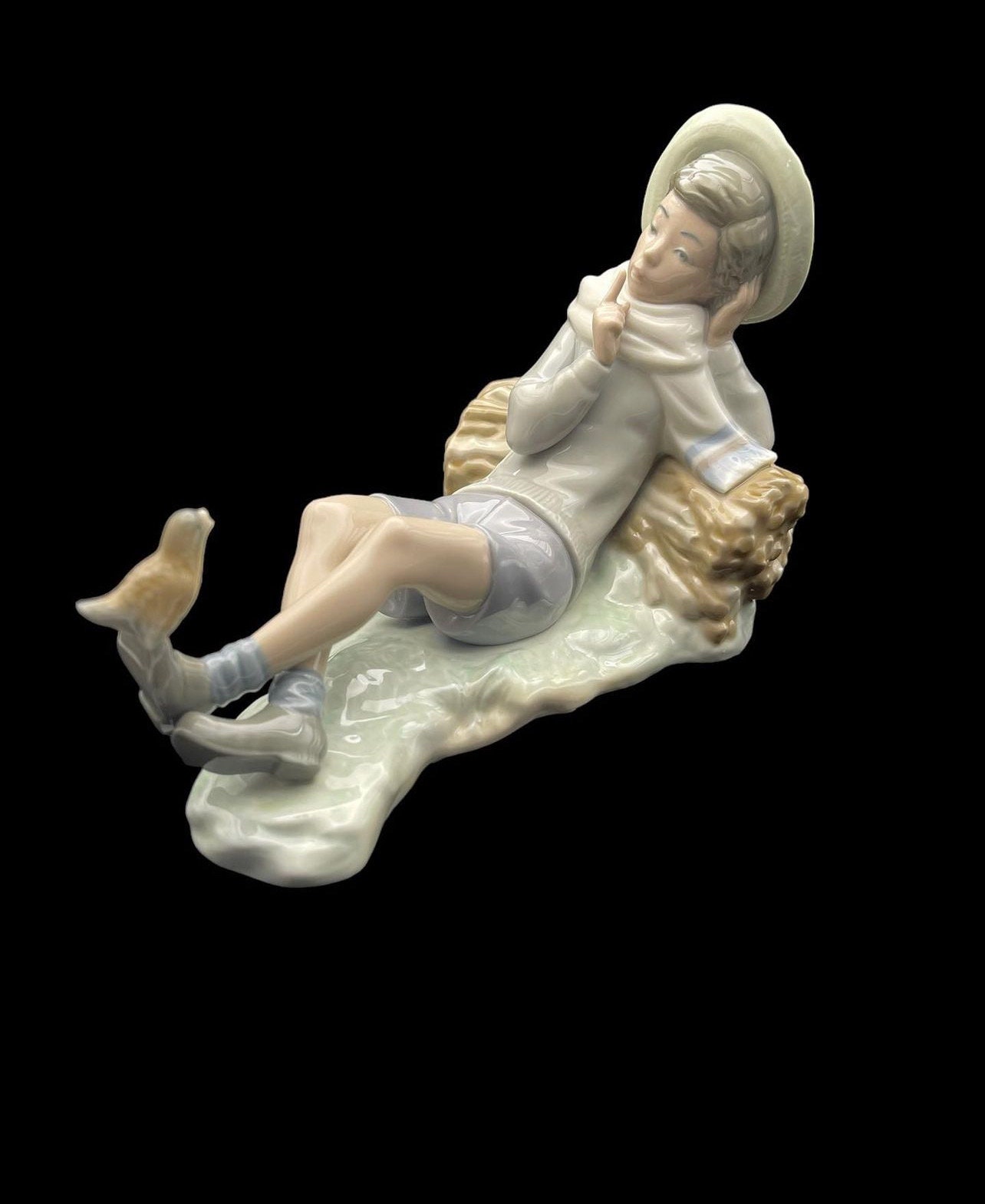 The figurine depicts a serene pastoral scene where a shepherd boy, dressed in a hat and casual clothing, gently interacts with a bird perched on his outstretched foot. The delicate features and soothing pastel colors bring a sense of calm and nostalgia. This rare and beautiful piece would make a perfect addition to any collection or a thoughtful gift for a special occasion.