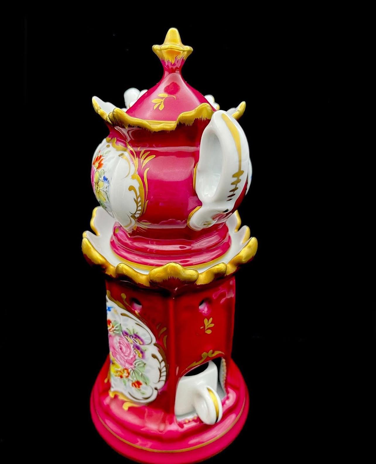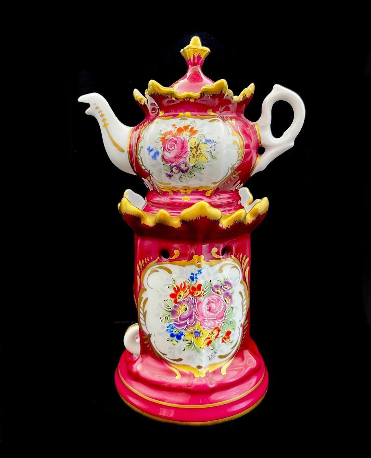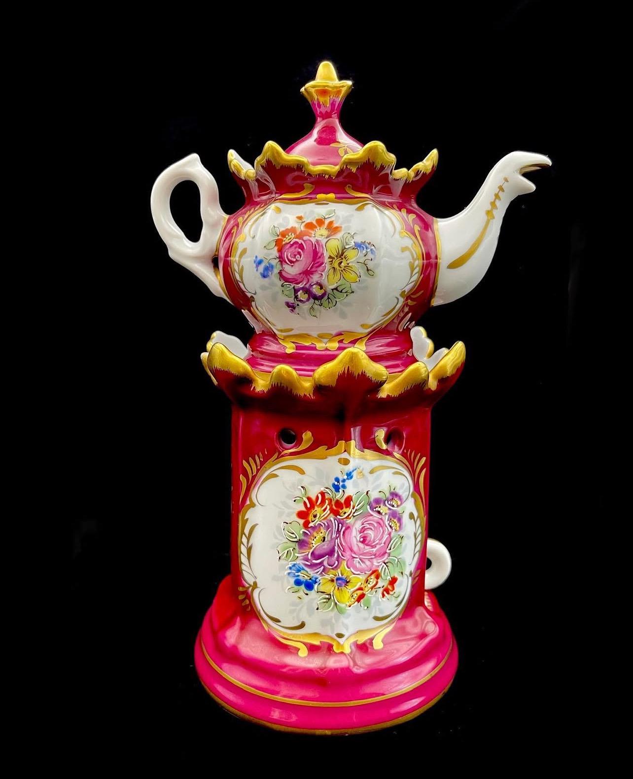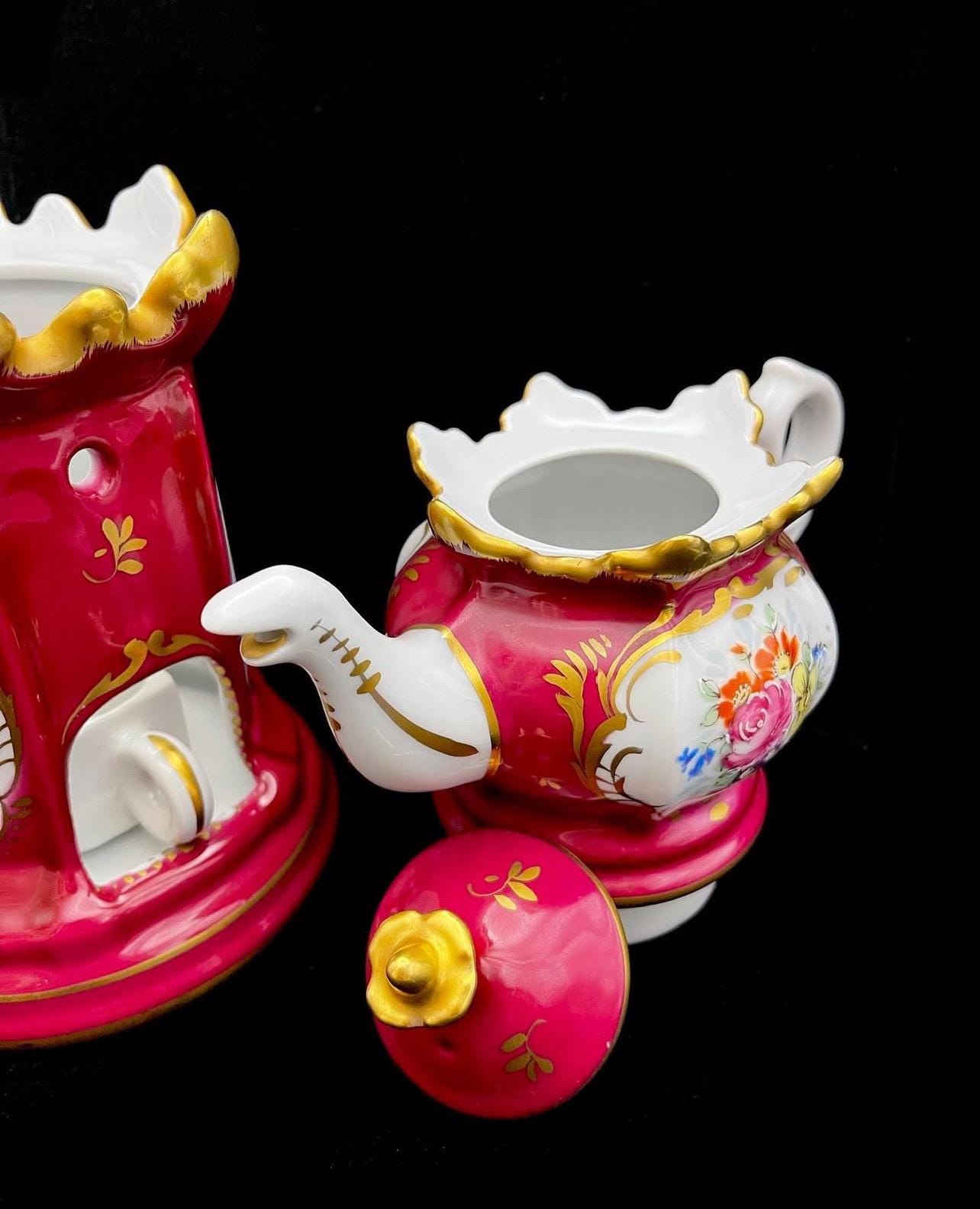 Entirely hand-painted with vibrant floral motifs and adorned with liquid gold gilt, this piece features intricate relief detailing and a built-in warmer with a handle, making it both functional and decorative.