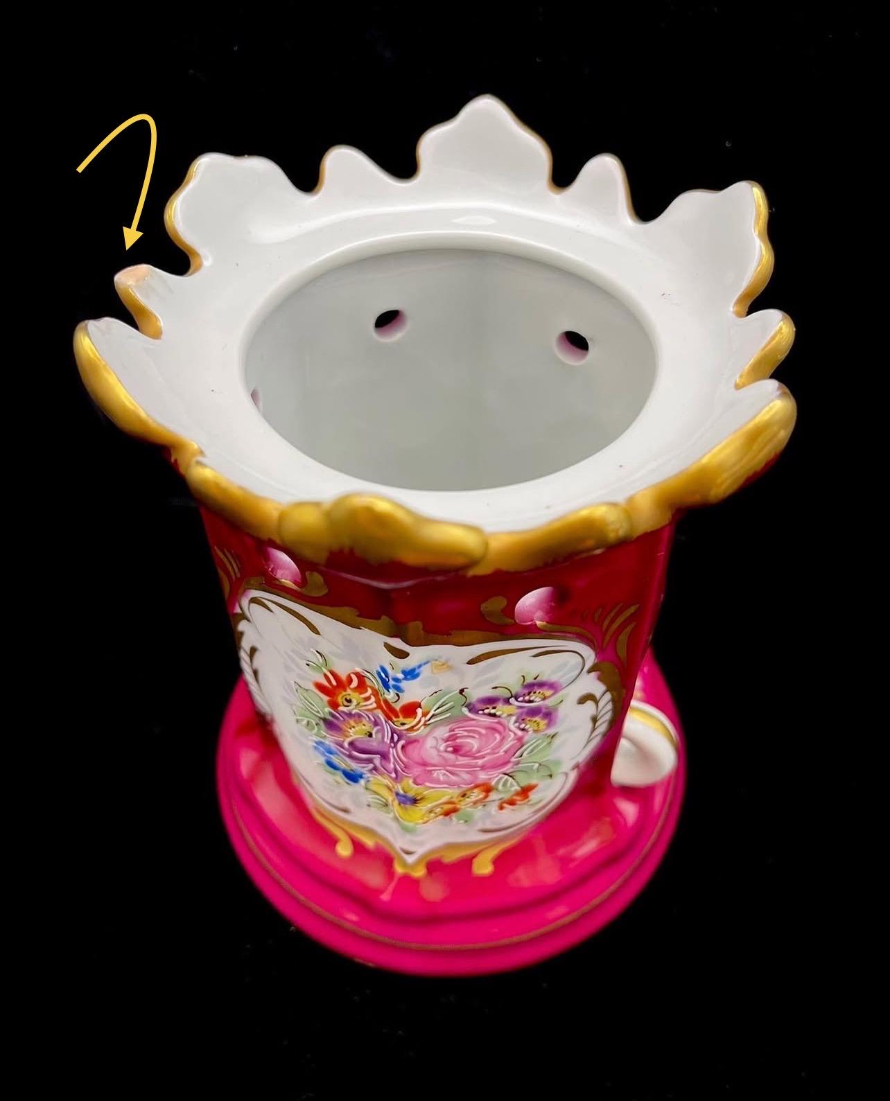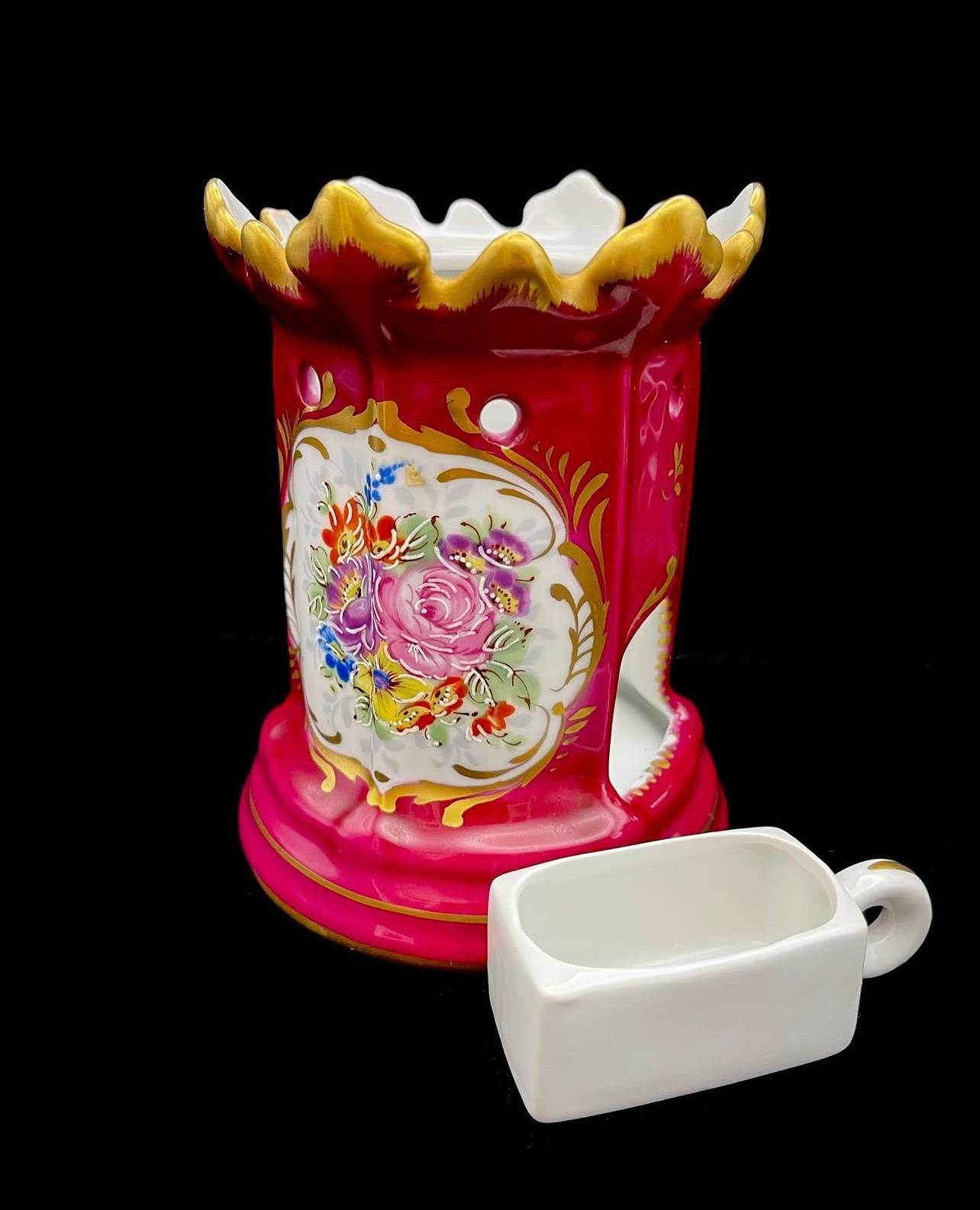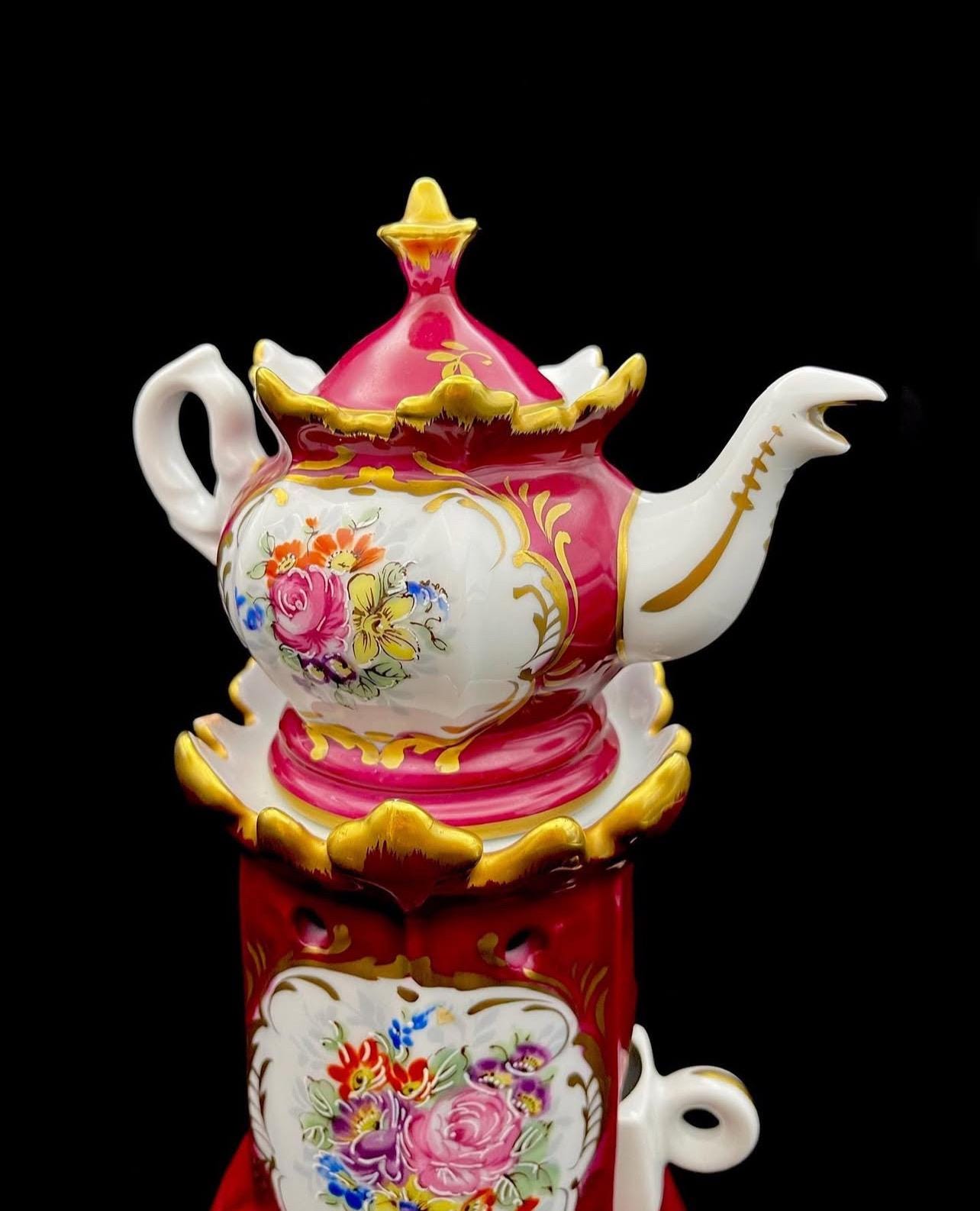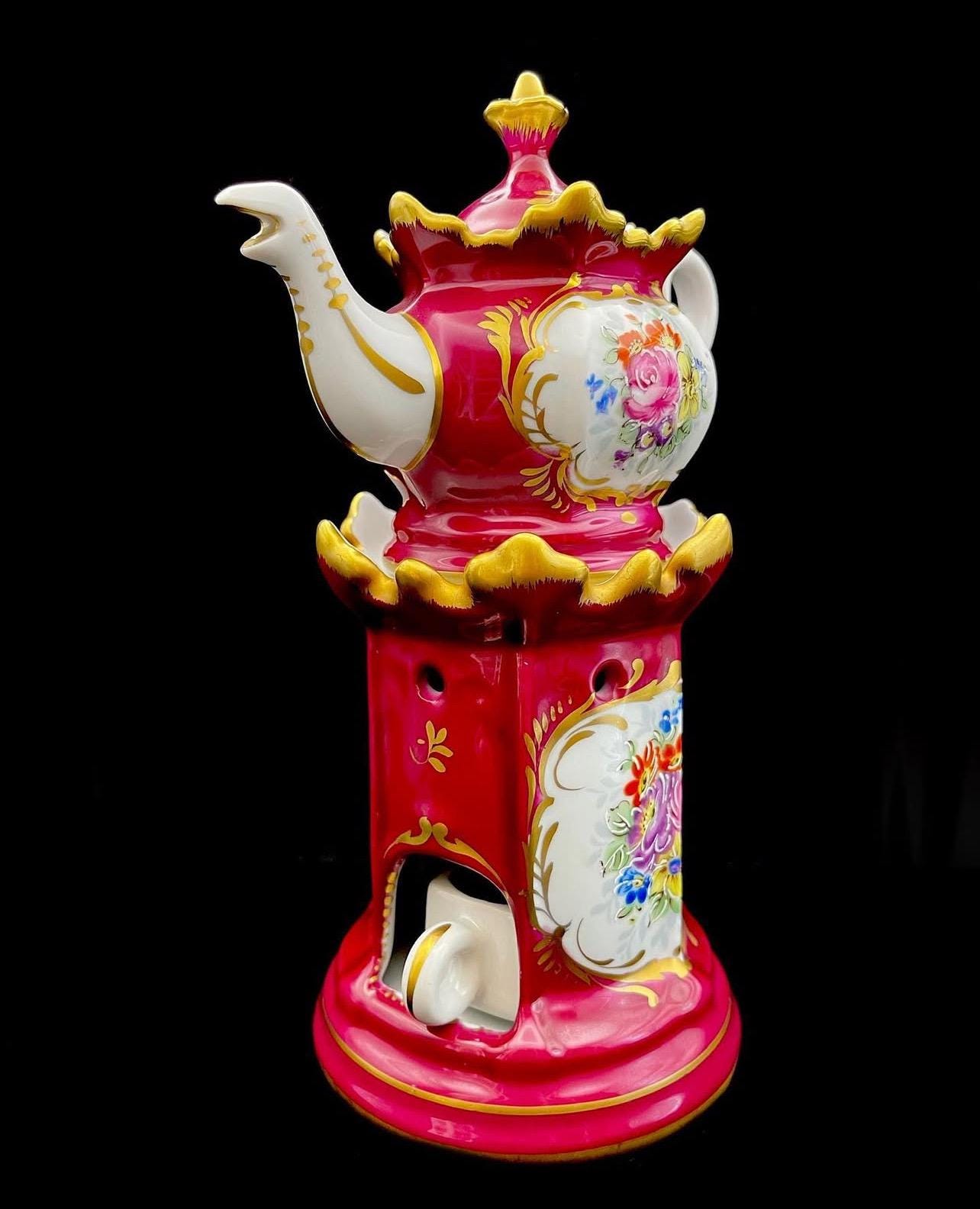 Entirely hand-painted with vibrant floral motifs and adorned with liquid gold gilt, this piece features intricate relief detailing and a built-in warmer with a handle, making it both functional and decorative.