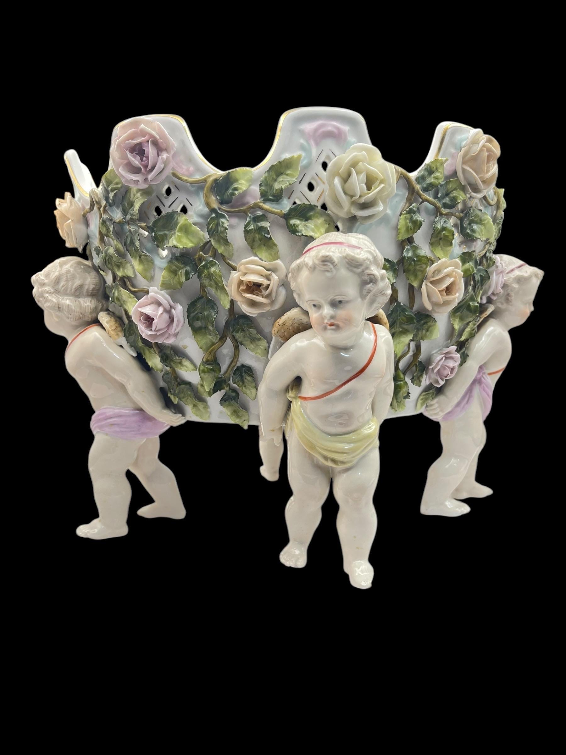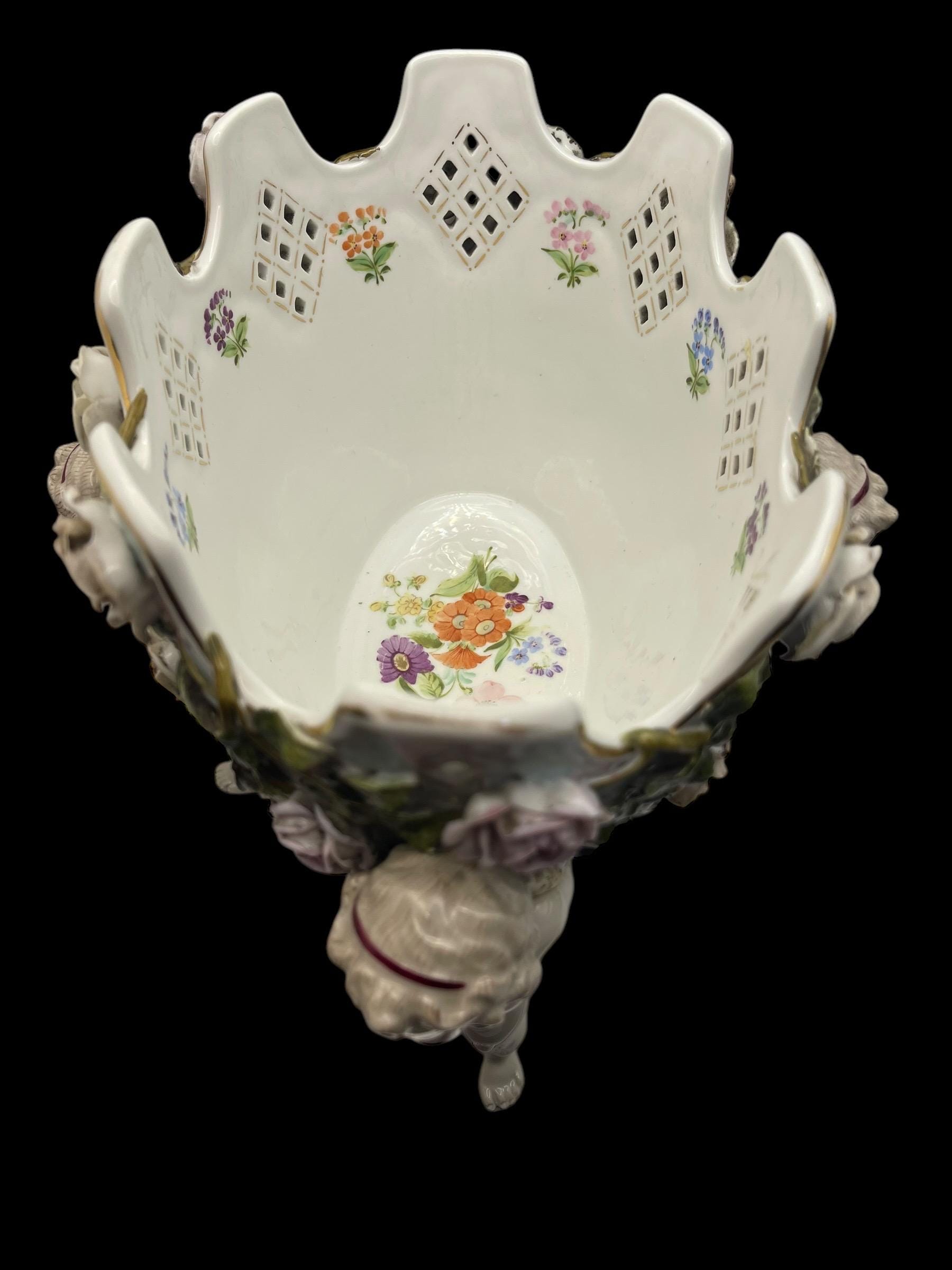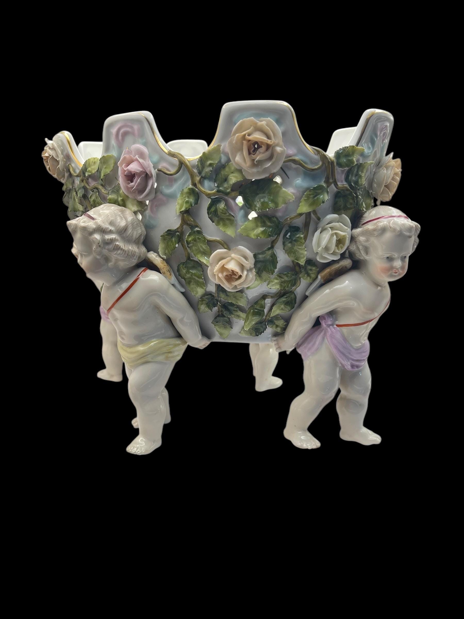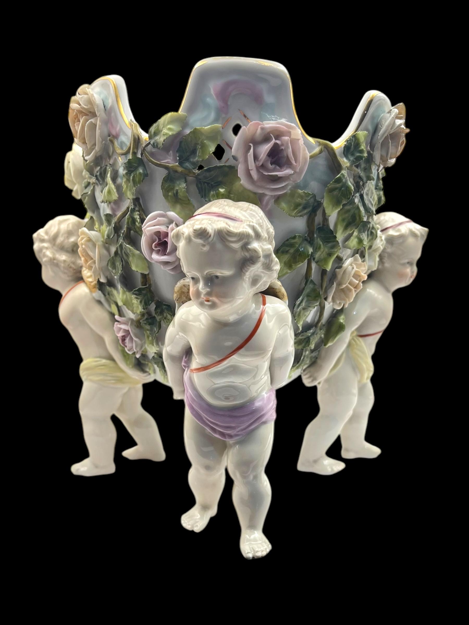 This stunning Sitzendorf porcelain centerpiece features an intricate design adorned with cherubs, hand-painted flowers, and beautifully detailed gilded accents.