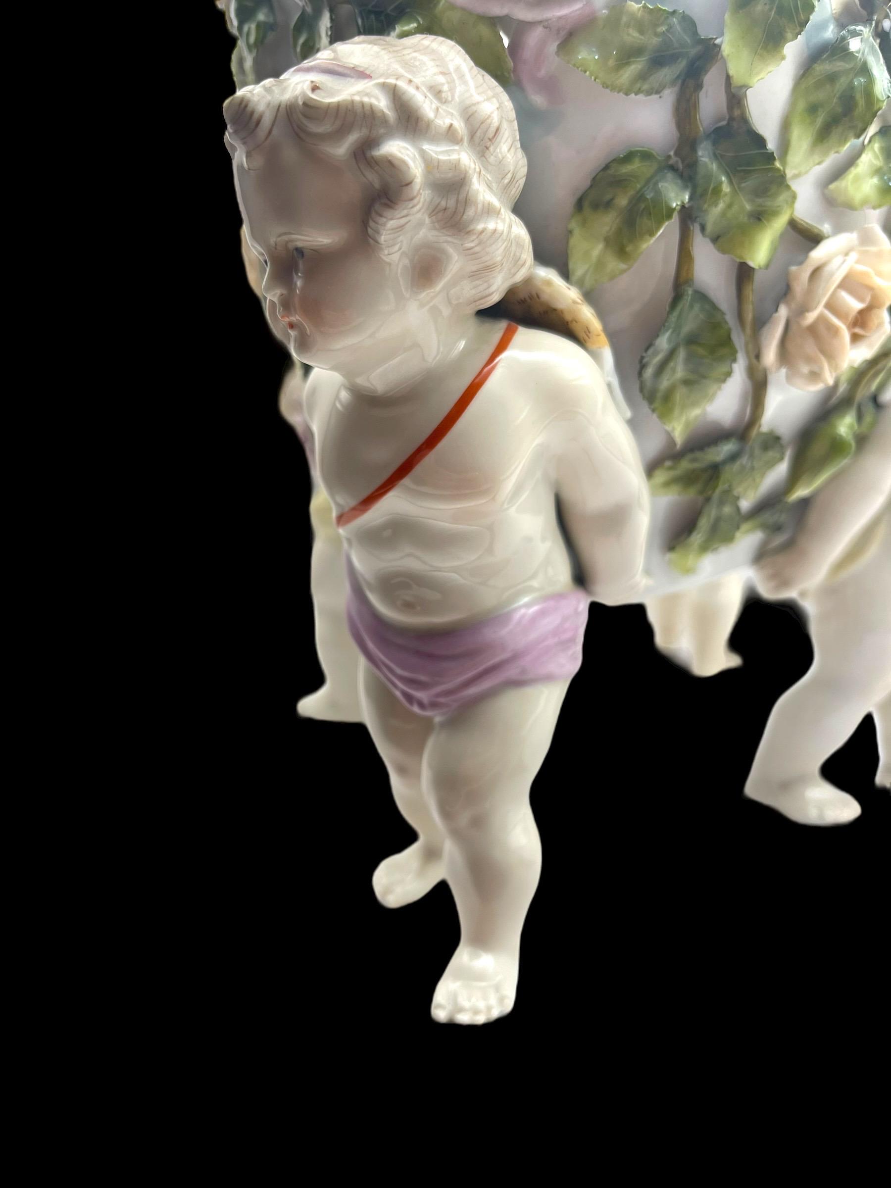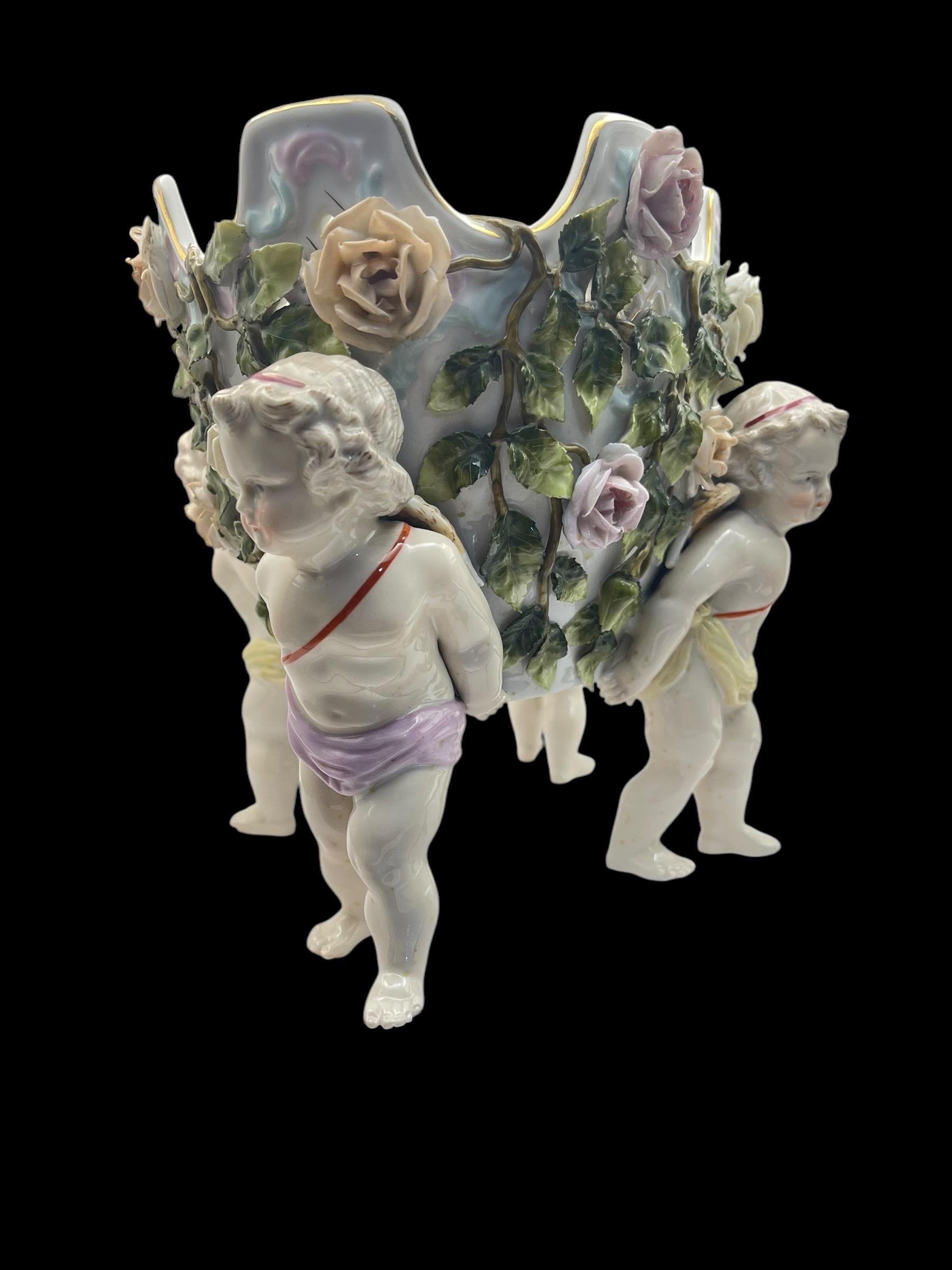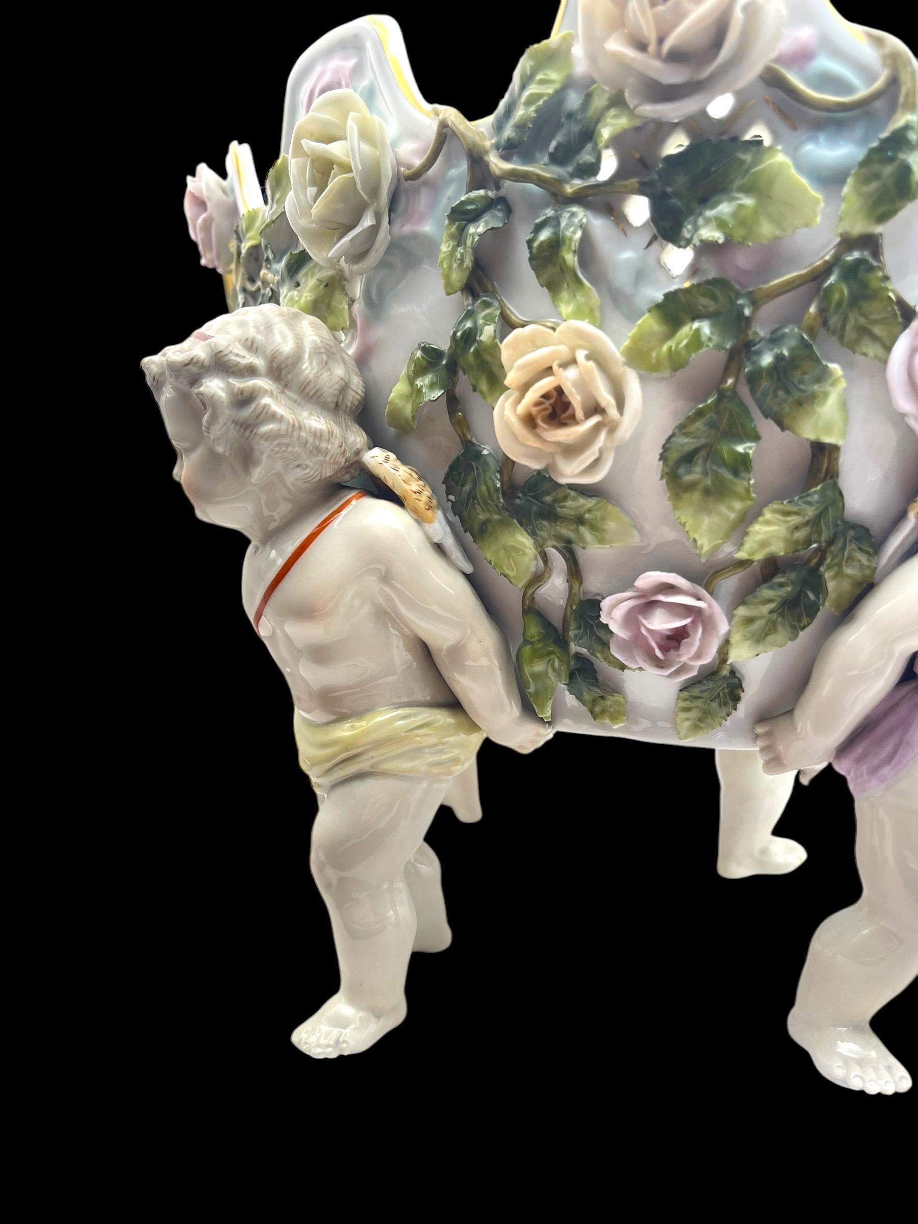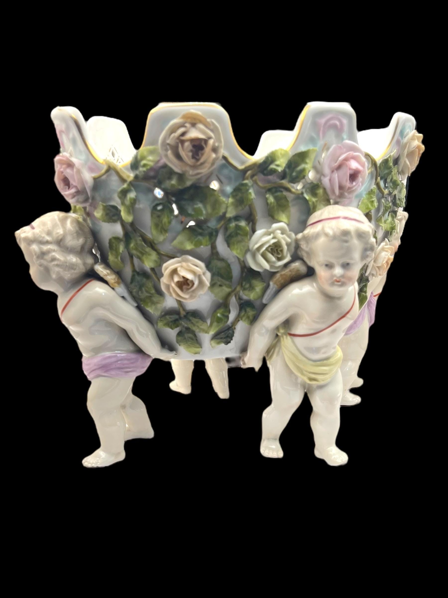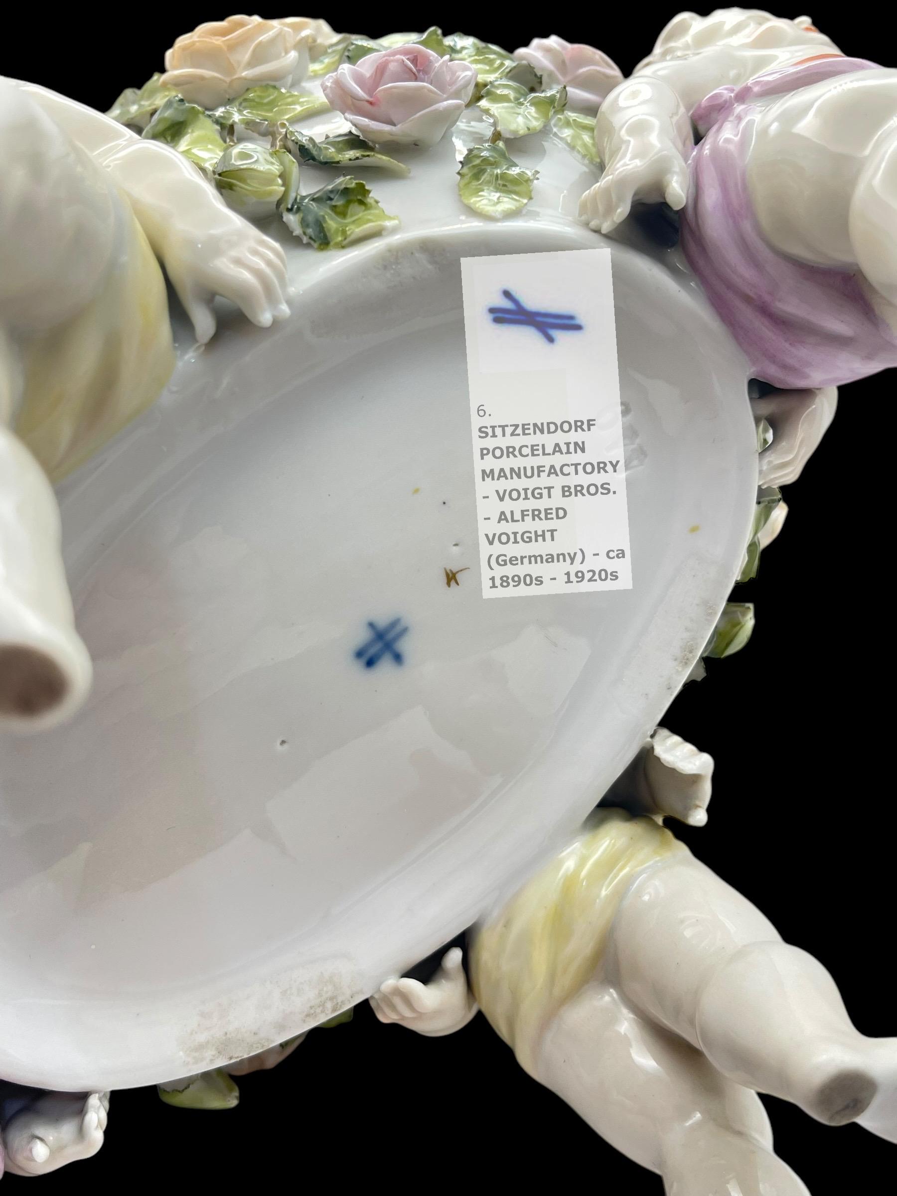 This stunning Sitzendorf porcelain centerpiece features an intricate design adorned with cherubs, hand-painted flowers, and beautifully detailed gilded accents.