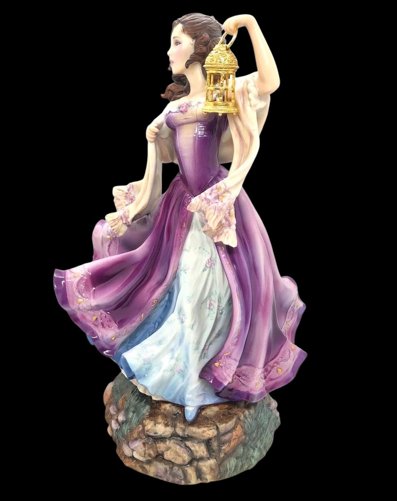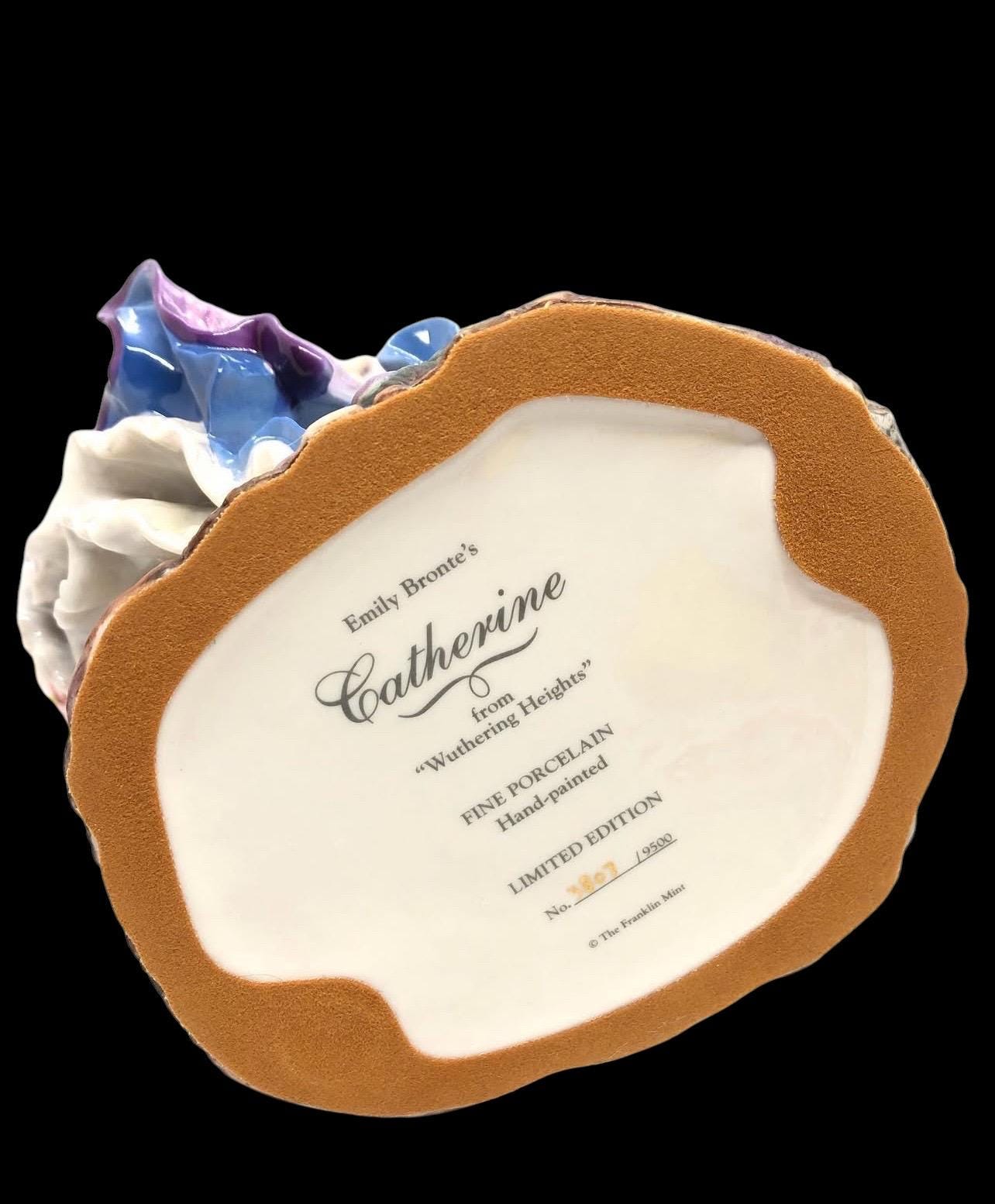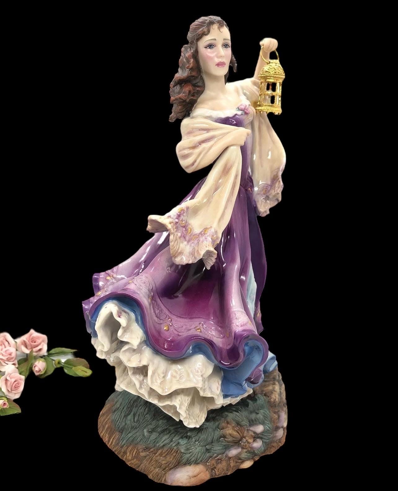Key Features: • Large Size: Stands 28.5 cm (11.2 inches) tall, making it a striking display piece. • Franklin Mint Quality: Known for their fine porcelain artistry and attention to detail. • Limited Edition: Individually numbered #3803 of 9500 on the base. • Beautiful Detailing: Flowing purple gown, delicate golden lantern, and lifelike expression. • Literary Inspiration: A tribute to Wuthering Heights, one of the greatest works of classic literature.
