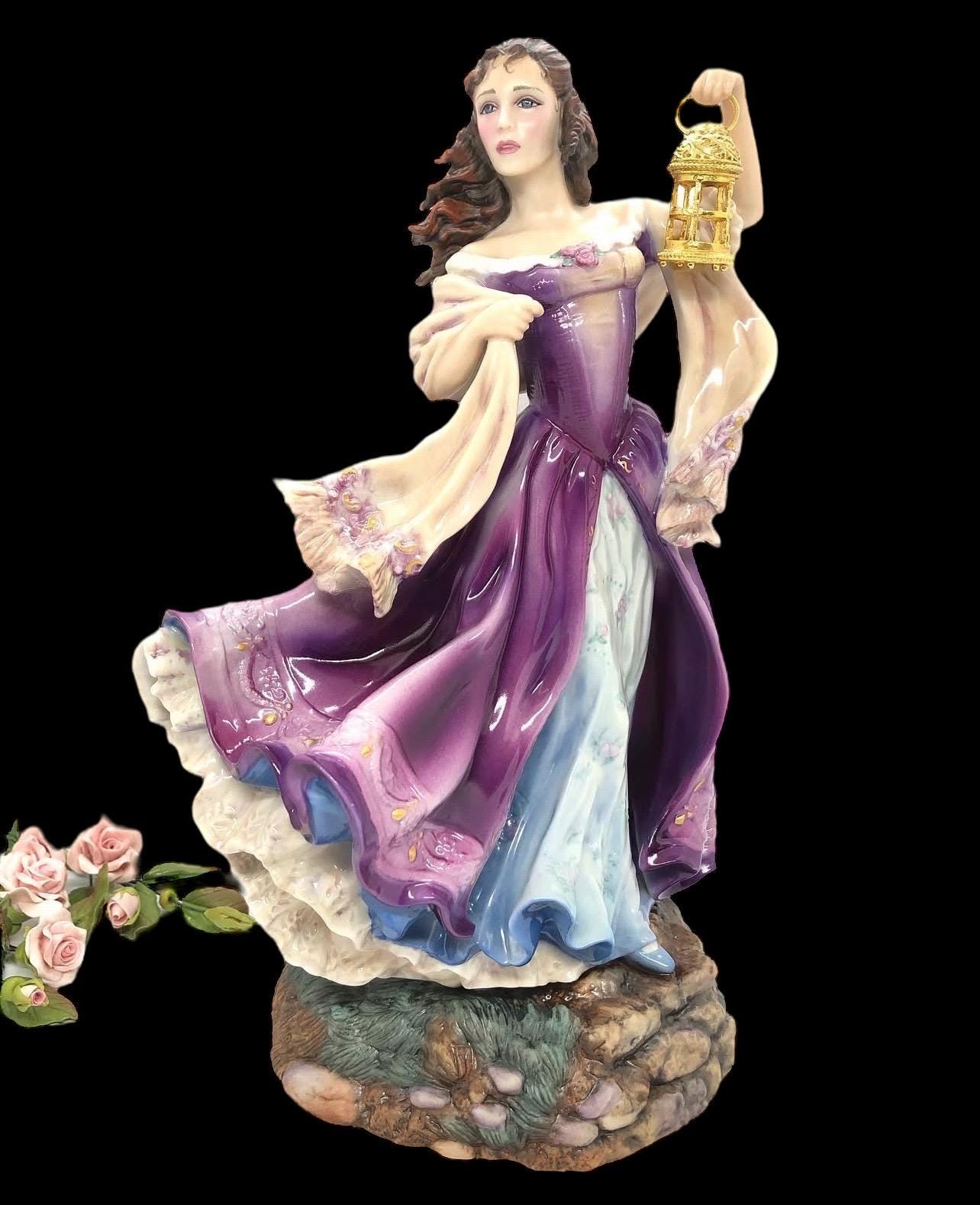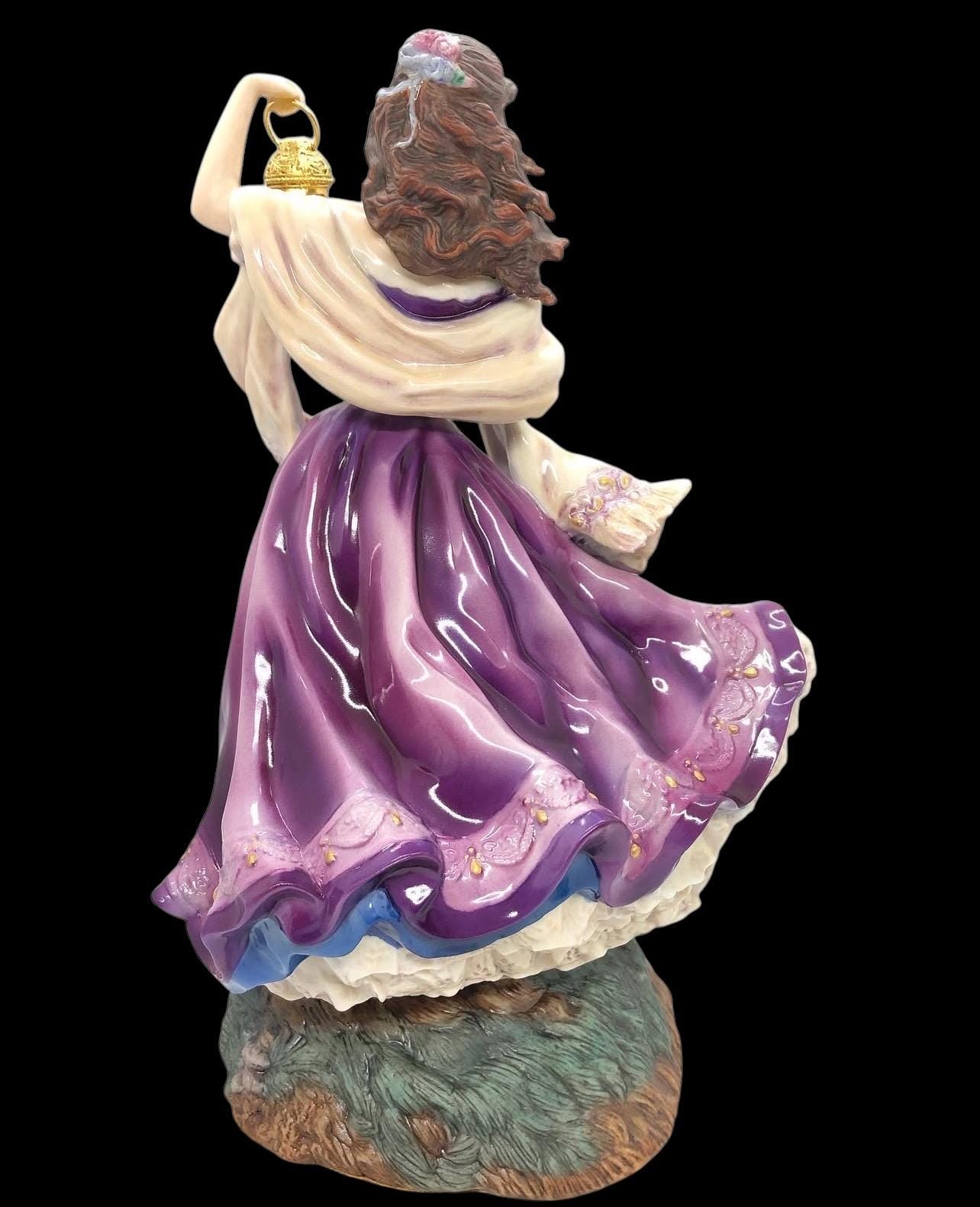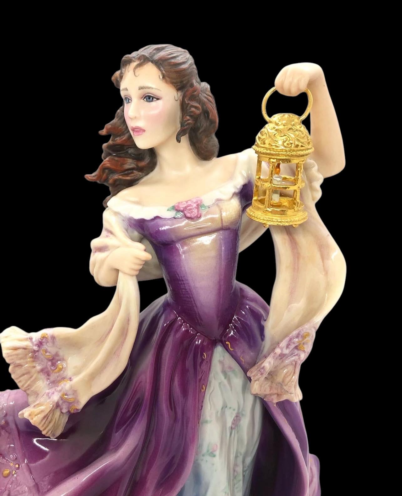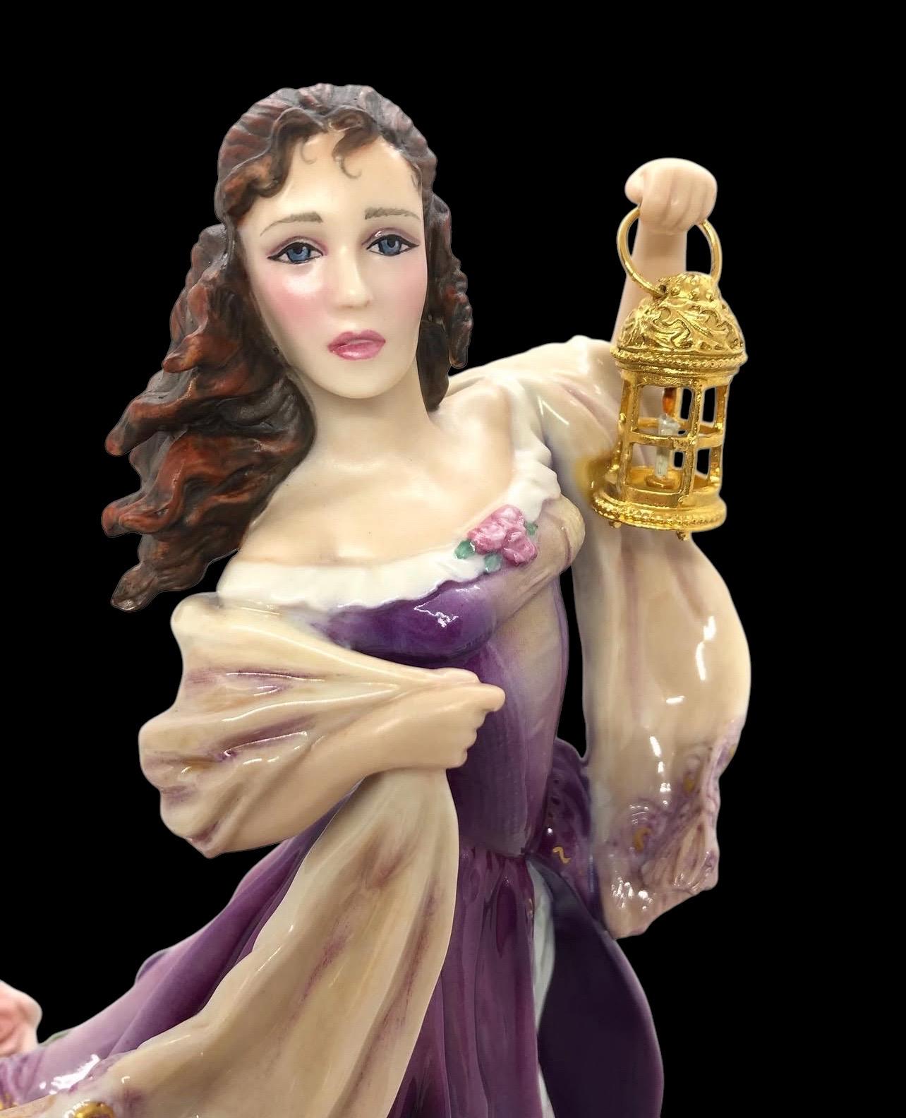 Key Features: • Large Size: Stands 28.5 cm (11.2 inches) tall, making it a striking display piece. • Franklin Mint Quality: Known for their fine porcelain artistry and attention to detail. • Limited Edition: Individually numbered #3803 of 9500 on the base. • Beautiful Detailing: Flowing purple gown, delicate golden lantern, and lifelike expression. • Literary Inspiration: A tribute to Wuthering Heights, one of the greatest works of classic literature.