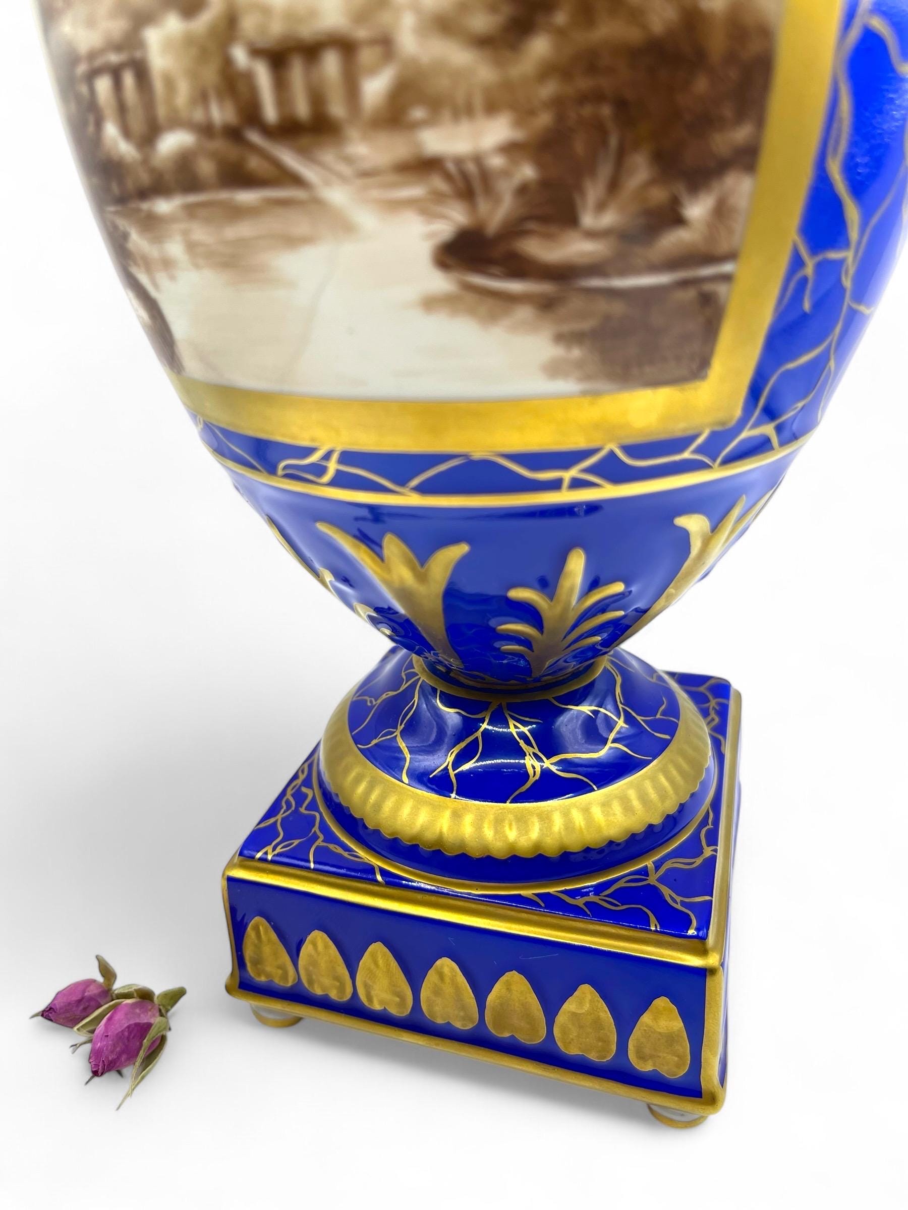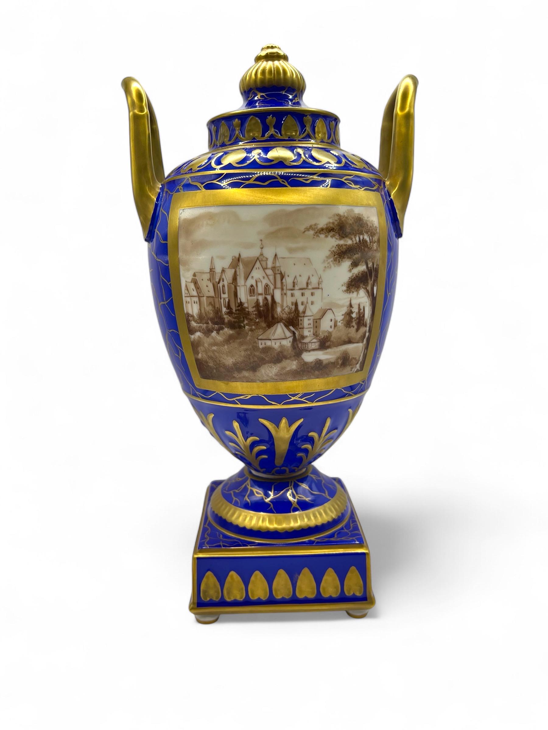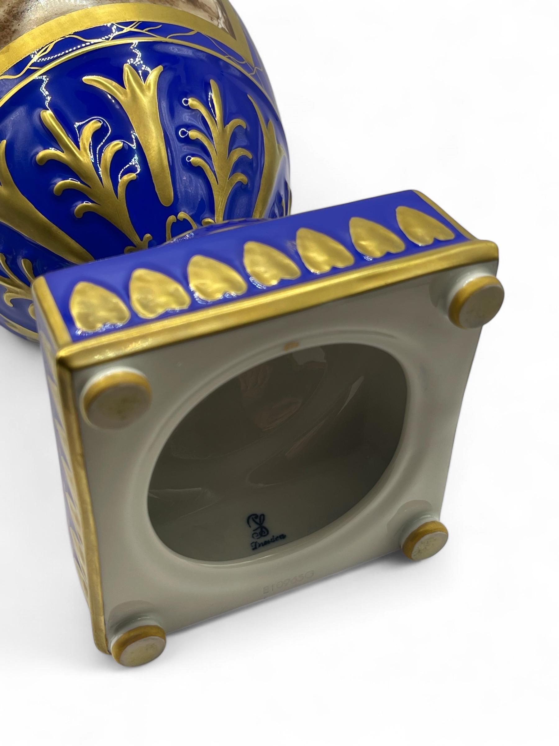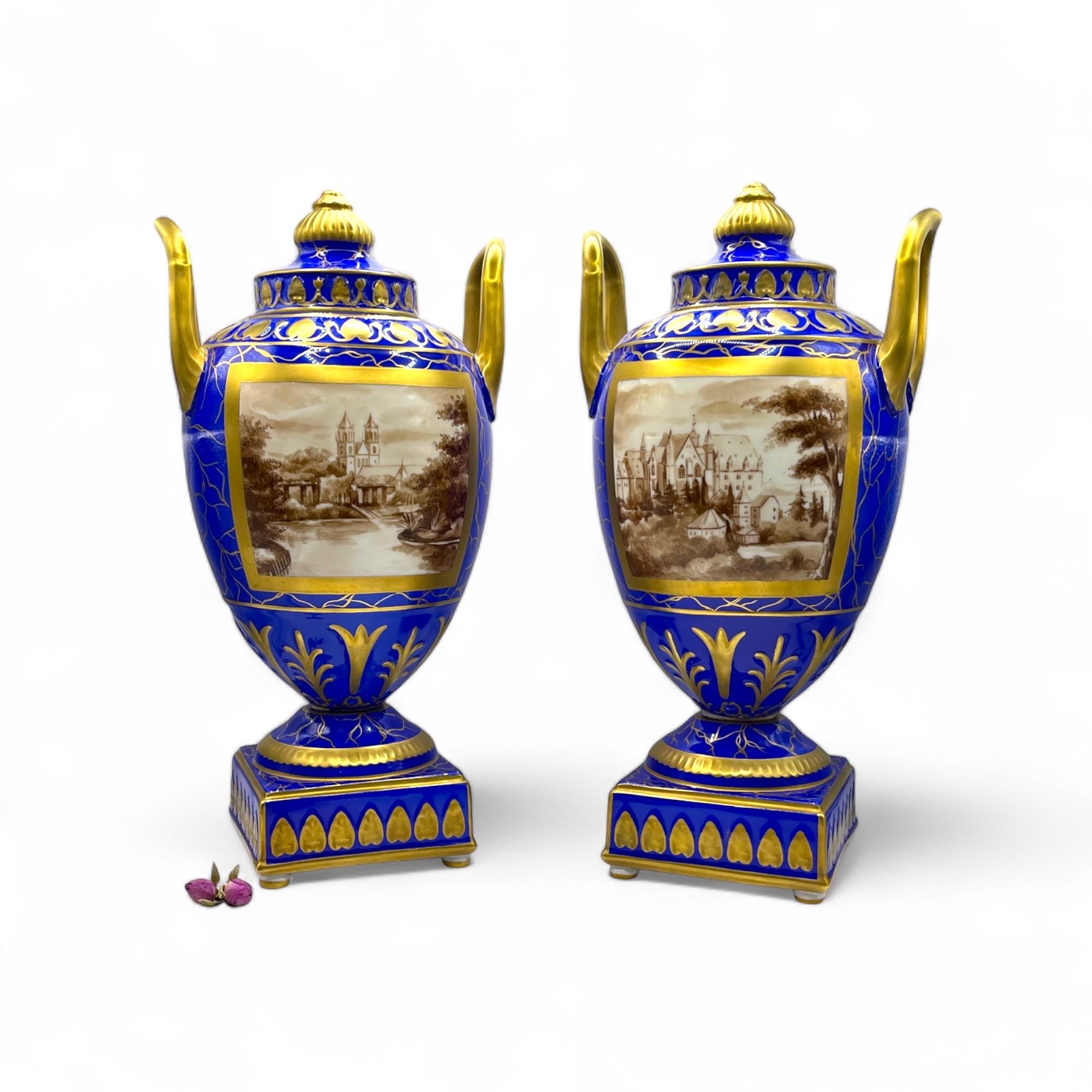 This magnificent pair of Carl Thieme Potschappel Dresden porcelain urns showcases exceptional craftsmanship and artistry. Adorned with rich cobalt blue backgrounds, elaborate gilded detailing, and beautifully hand-painted sepia-toned scenic panels, these urns are a testament to timeless elegance.