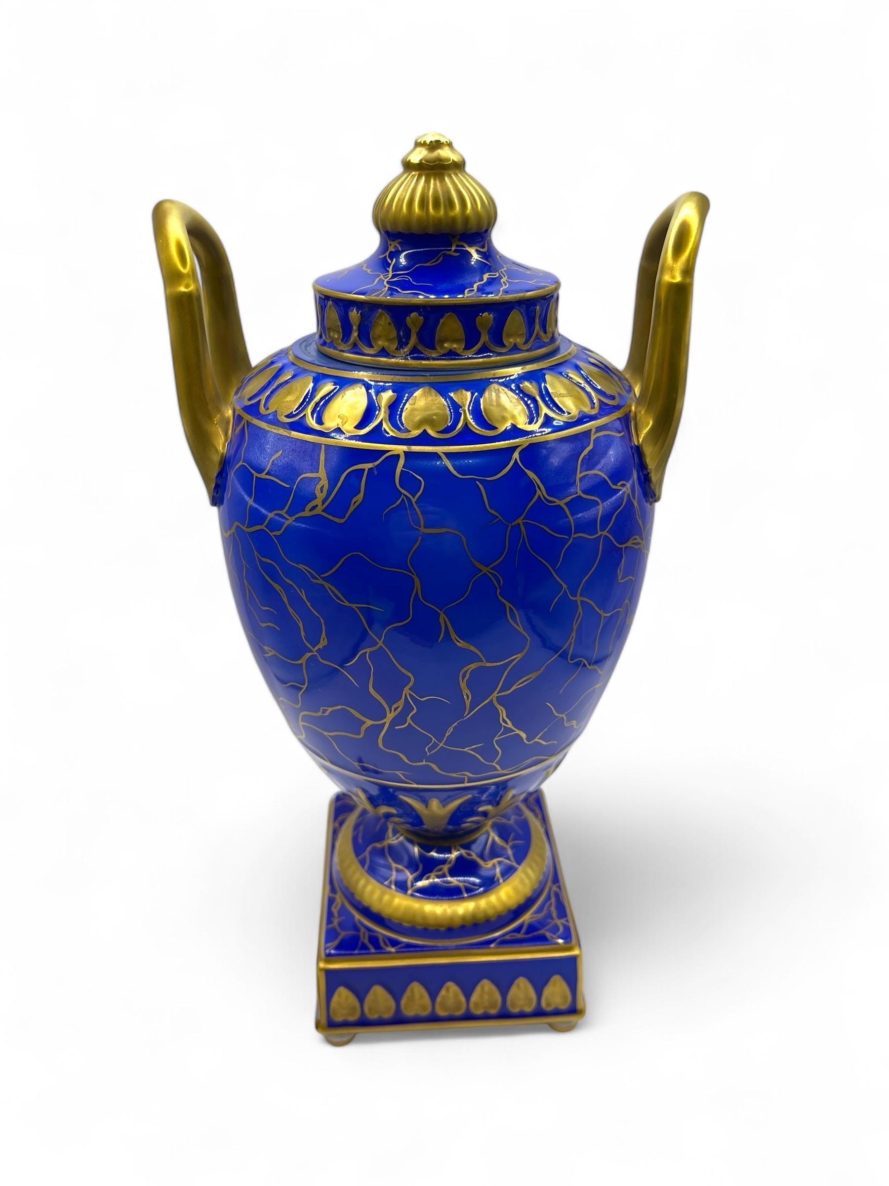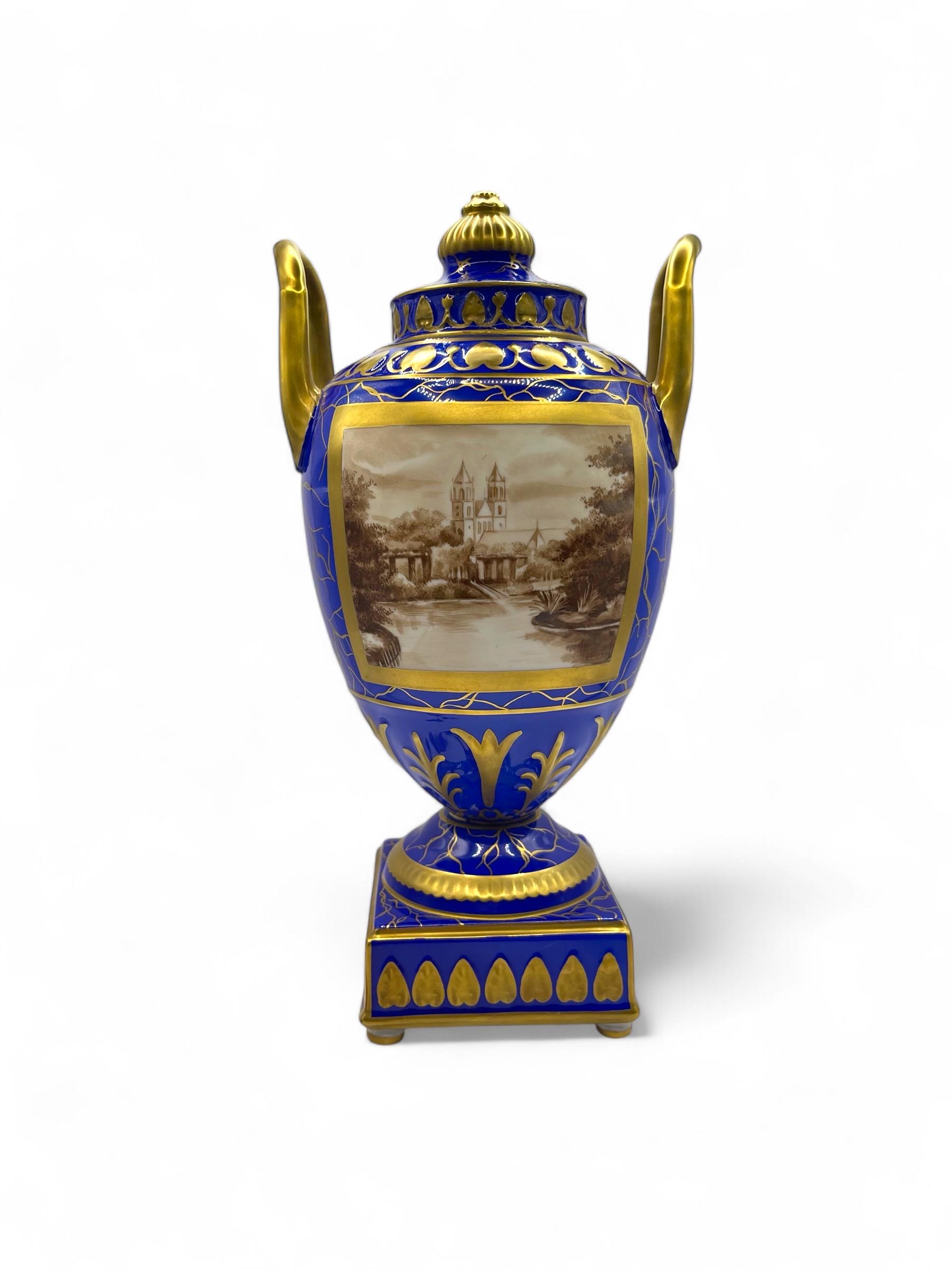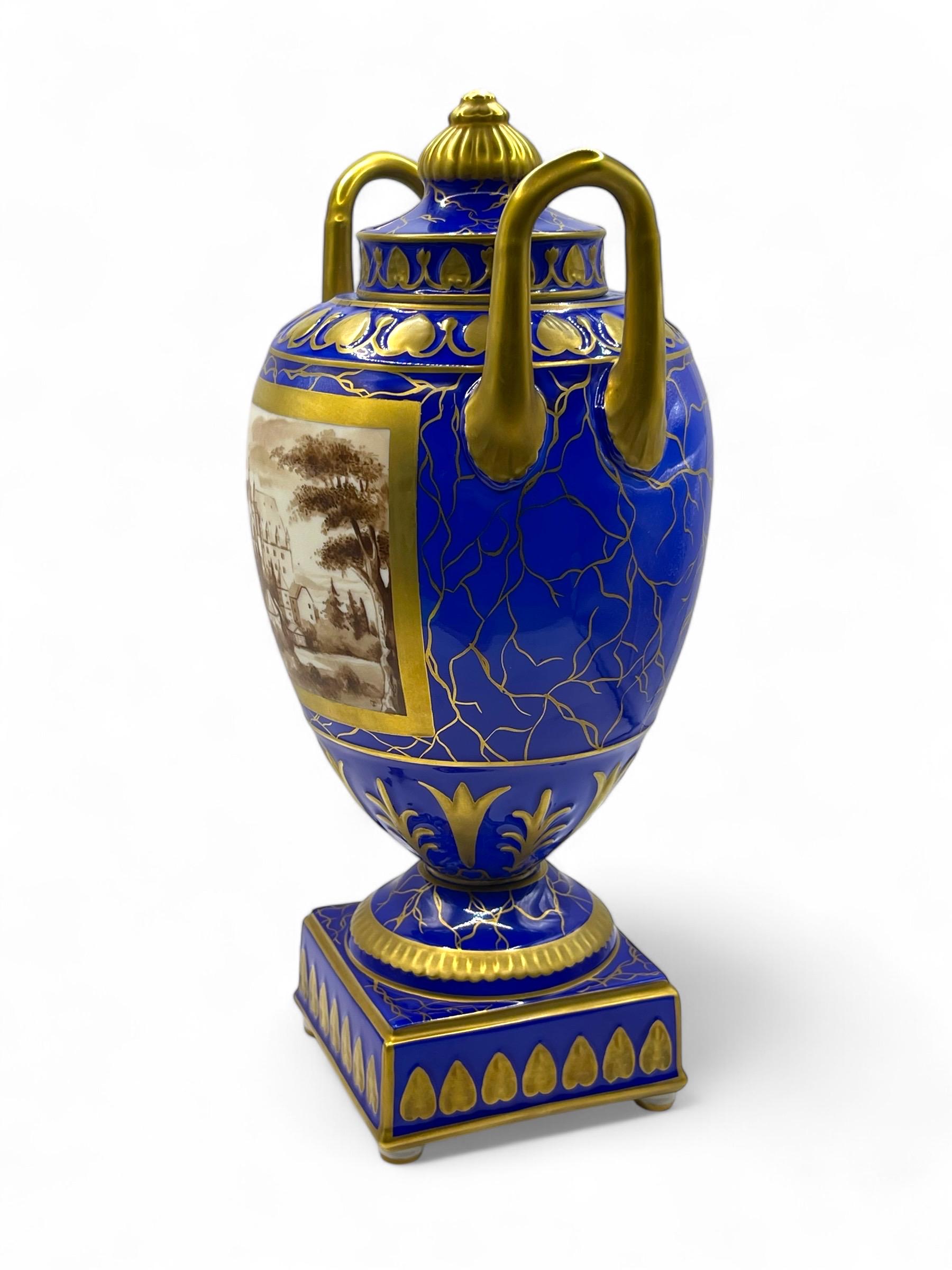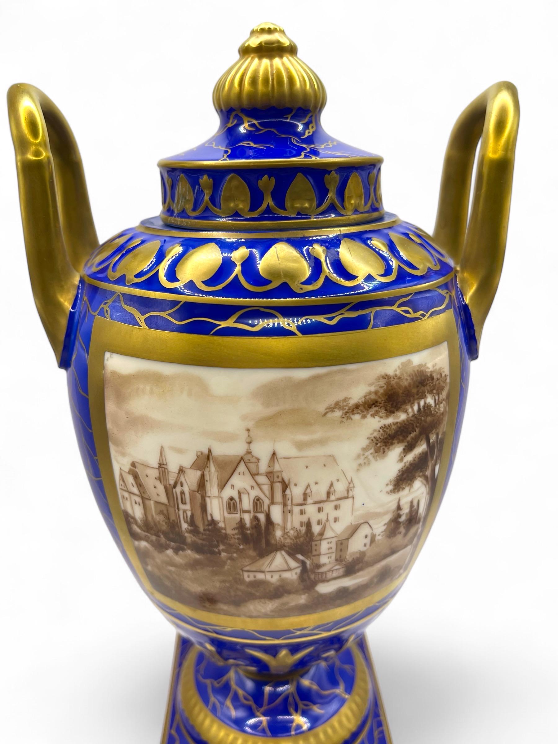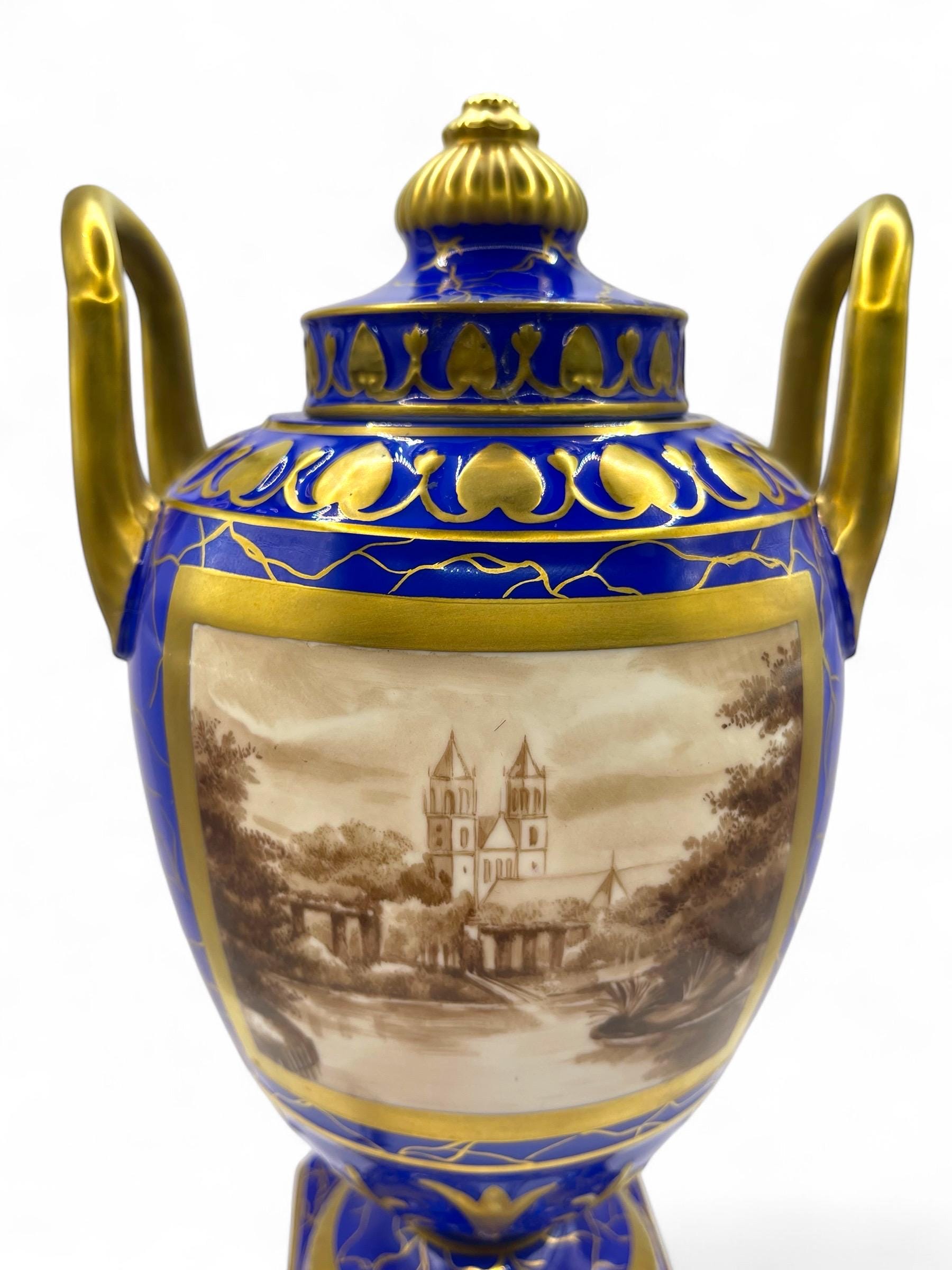 This magnificent pair of Carl Thieme Potschappel Dresden porcelain urns showcases exceptional craftsmanship and artistry. Adorned with rich cobalt blue backgrounds, elaborate gilded detailing, and beautifully hand-painted sepia-toned scenic panels, these urns are a testament to timeless elegance.