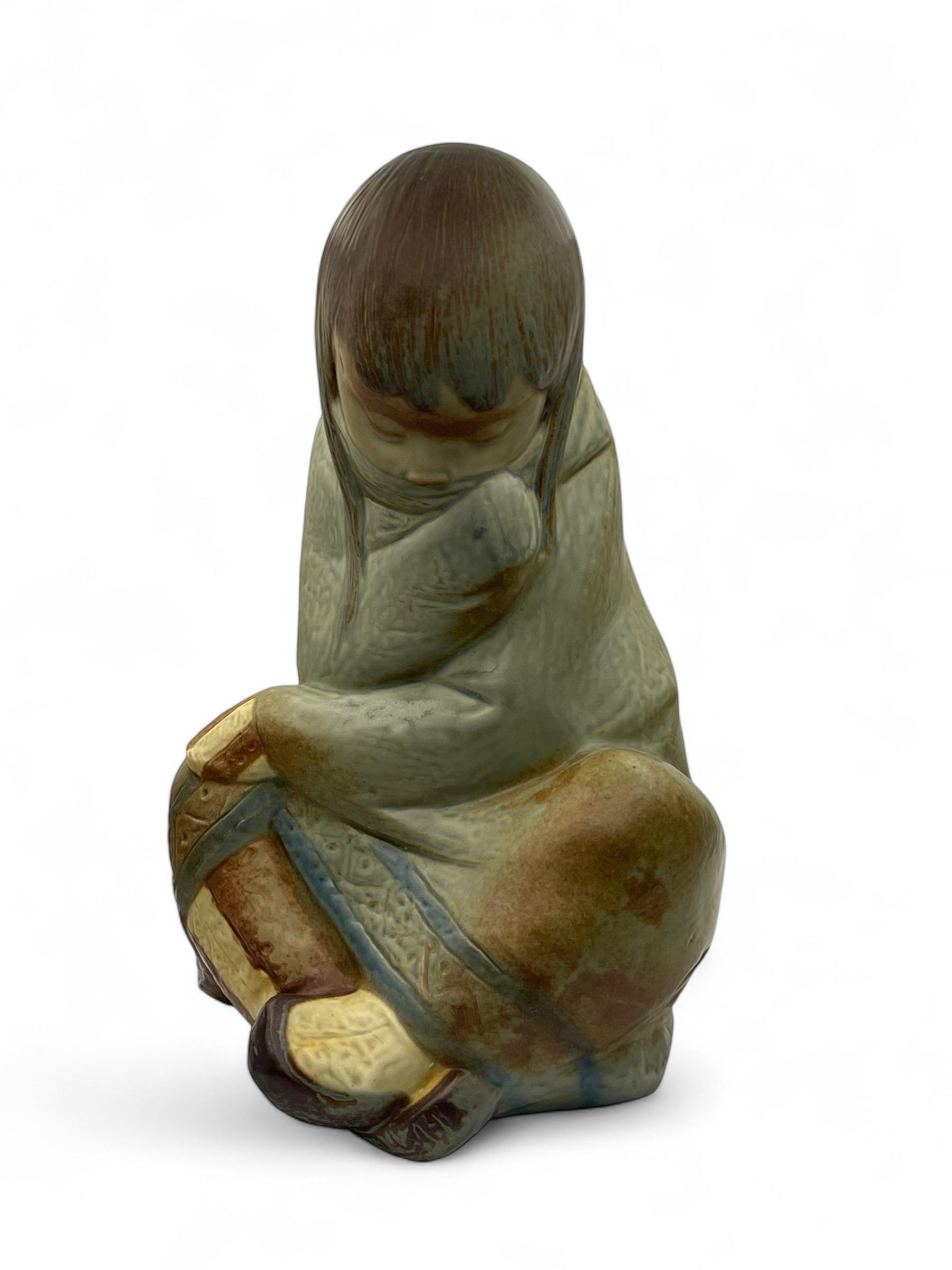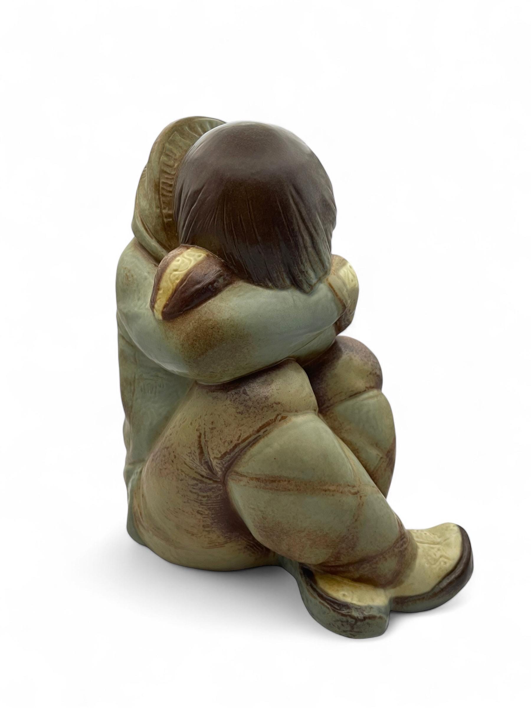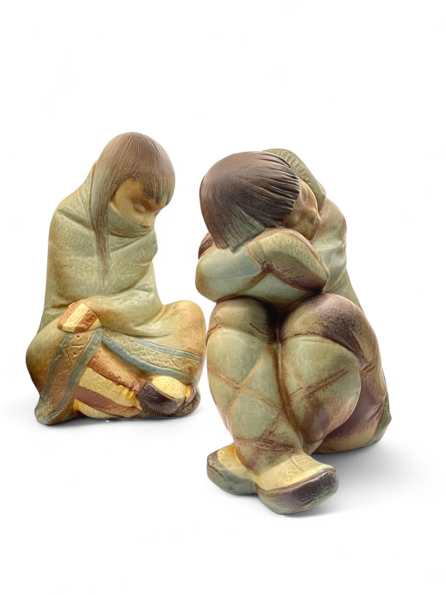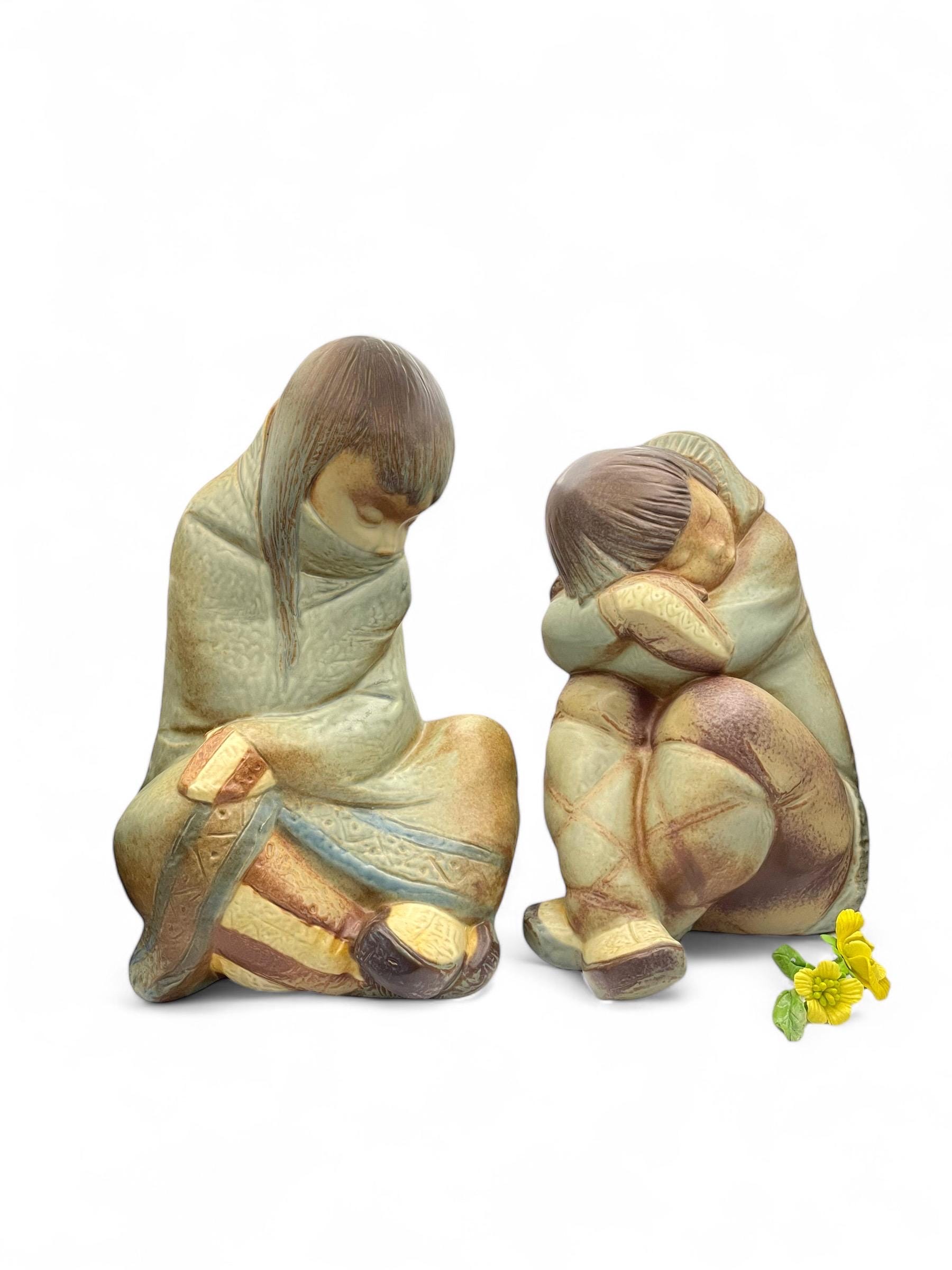 The figurines feature: • Hand-painted muted earth tones that create a lifelike texture. • Subtle matte and glazed finish for a unique visual appeal. • Intricate details in the traditional Eskimo attire and poses, evoking a serene and tranquil aesthetic.