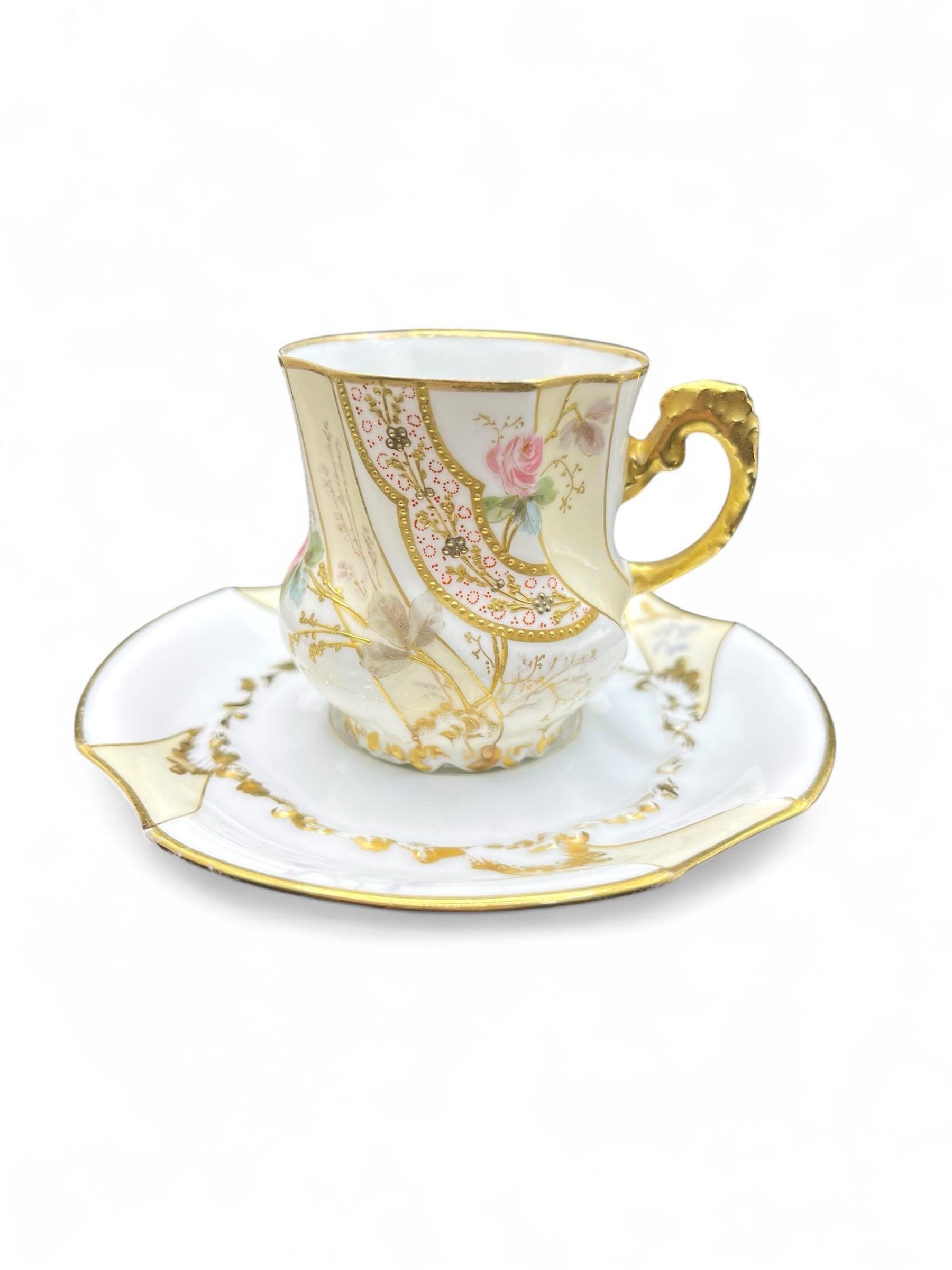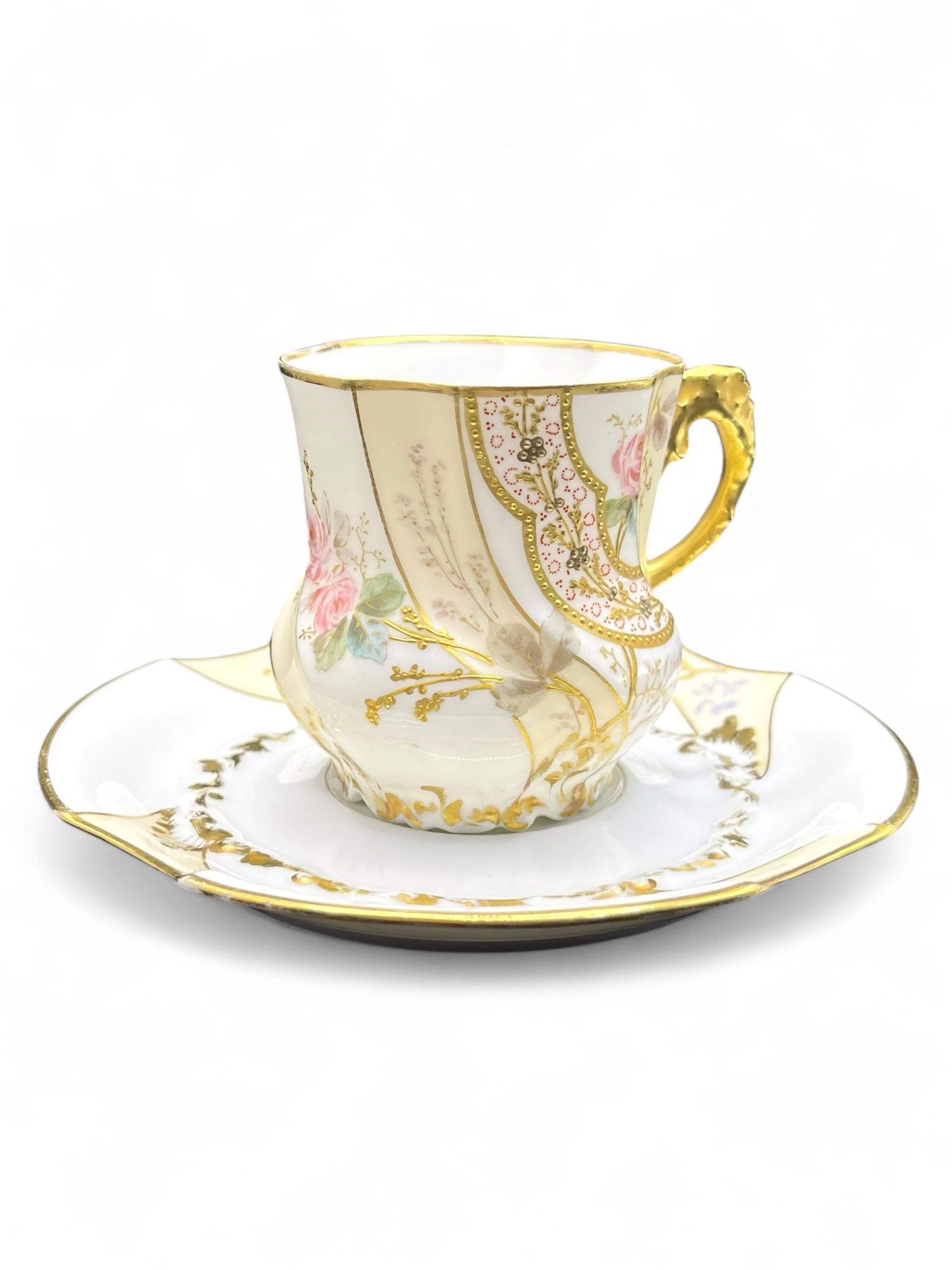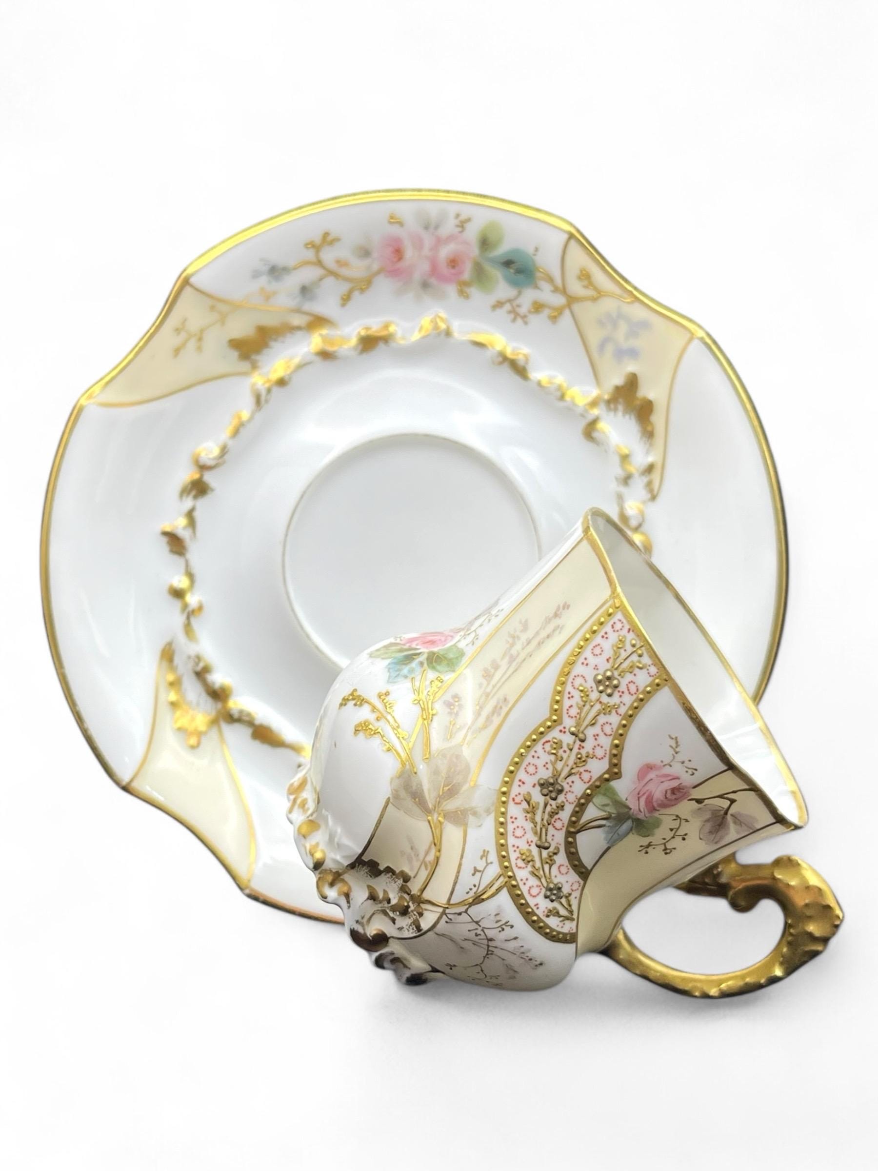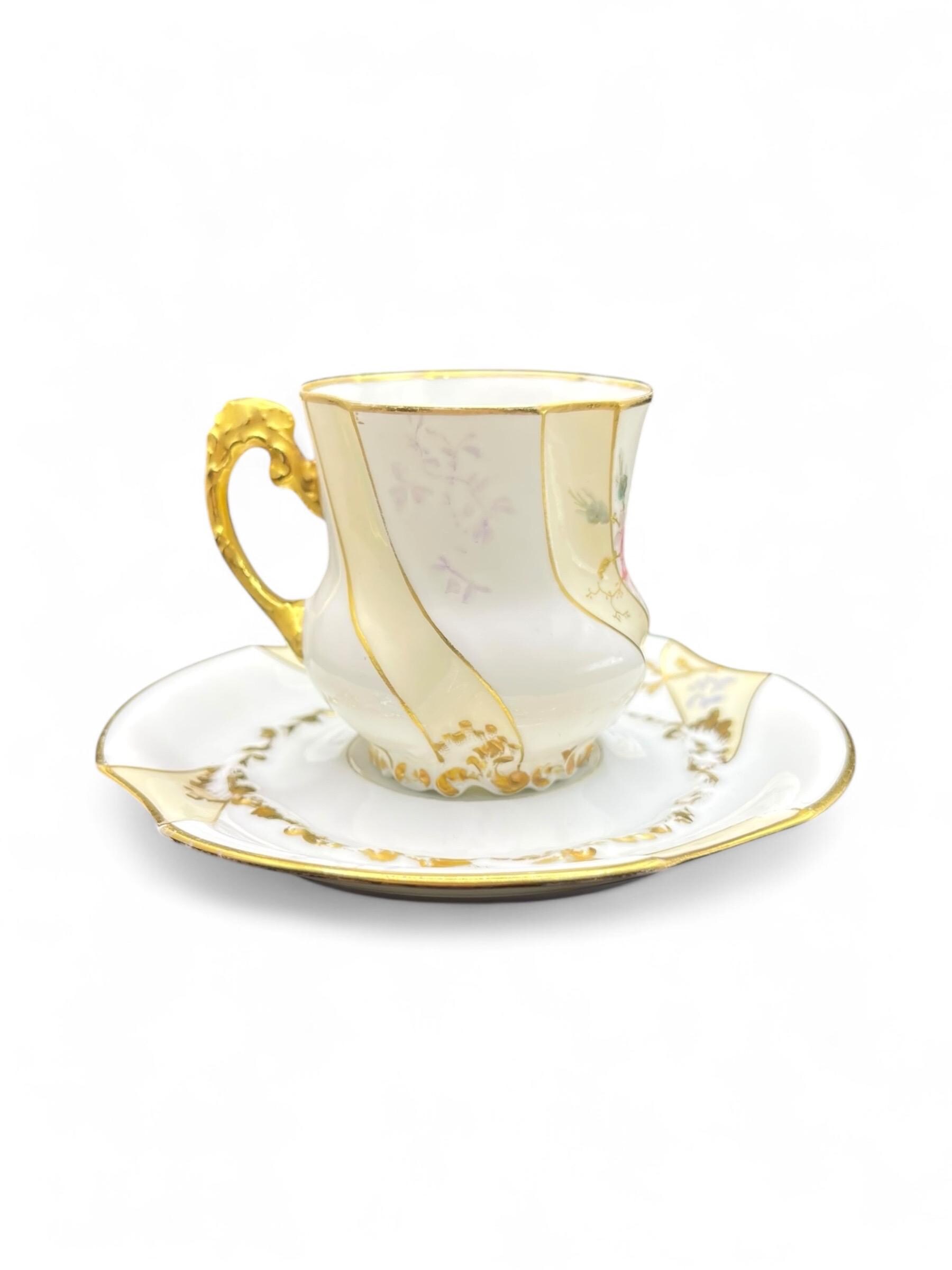 This elegant hand-painted porcelain cup and saucer feature a refined floral motif with gold accents and intricate detailing, reflecting the artistry commonly associated with Limoges porcelain.