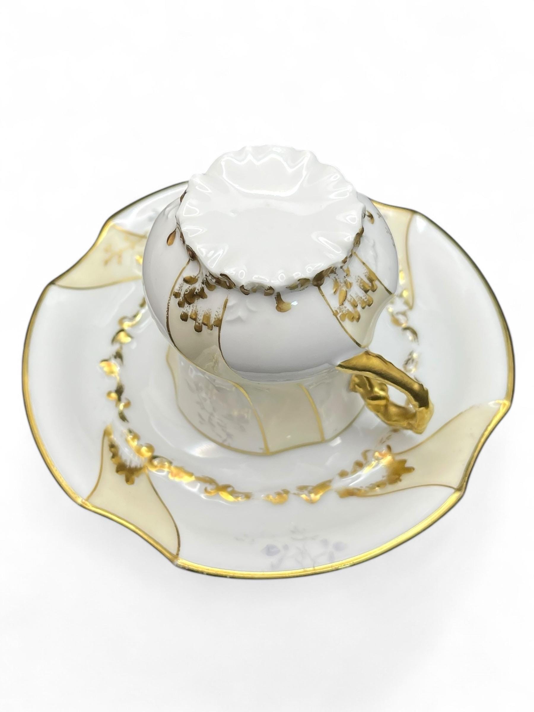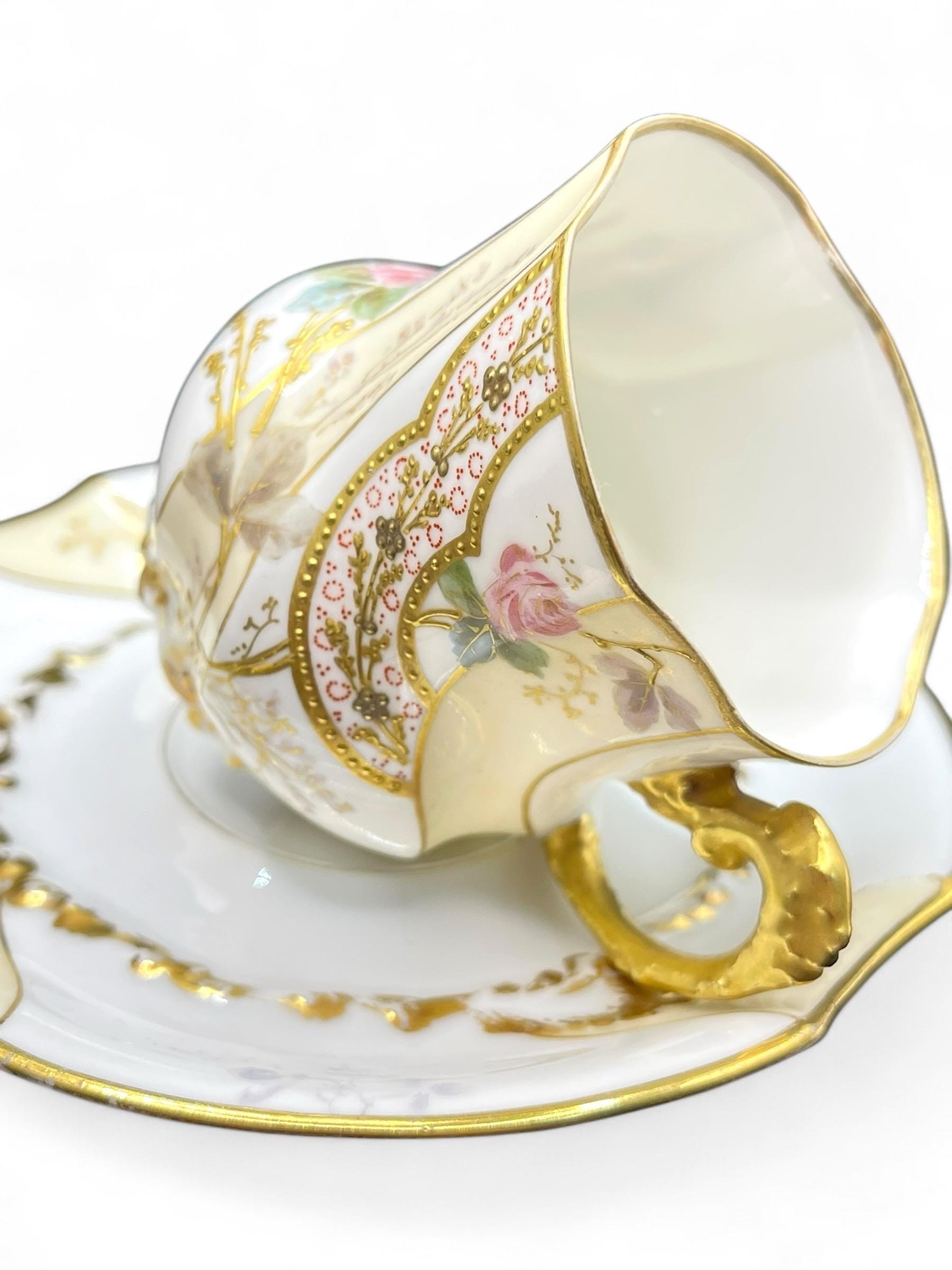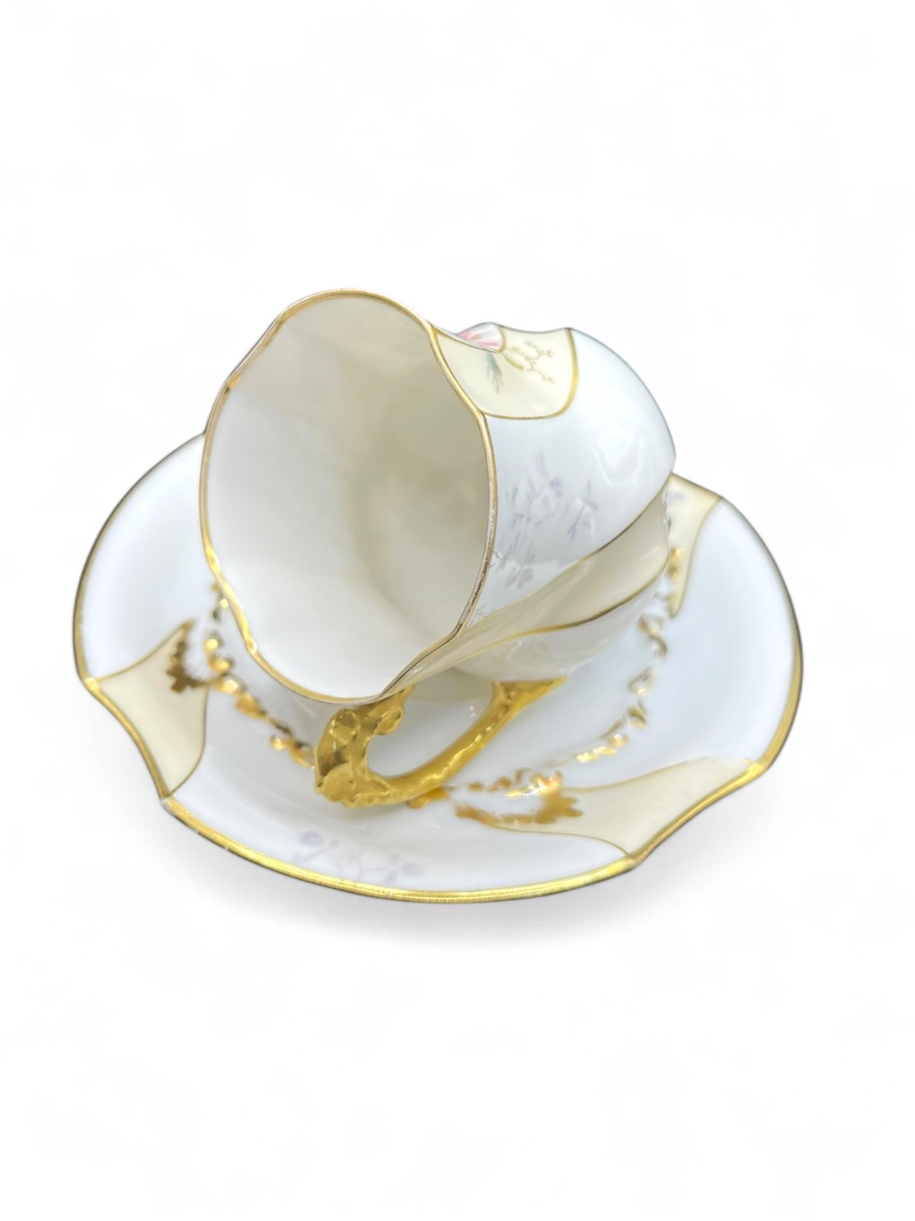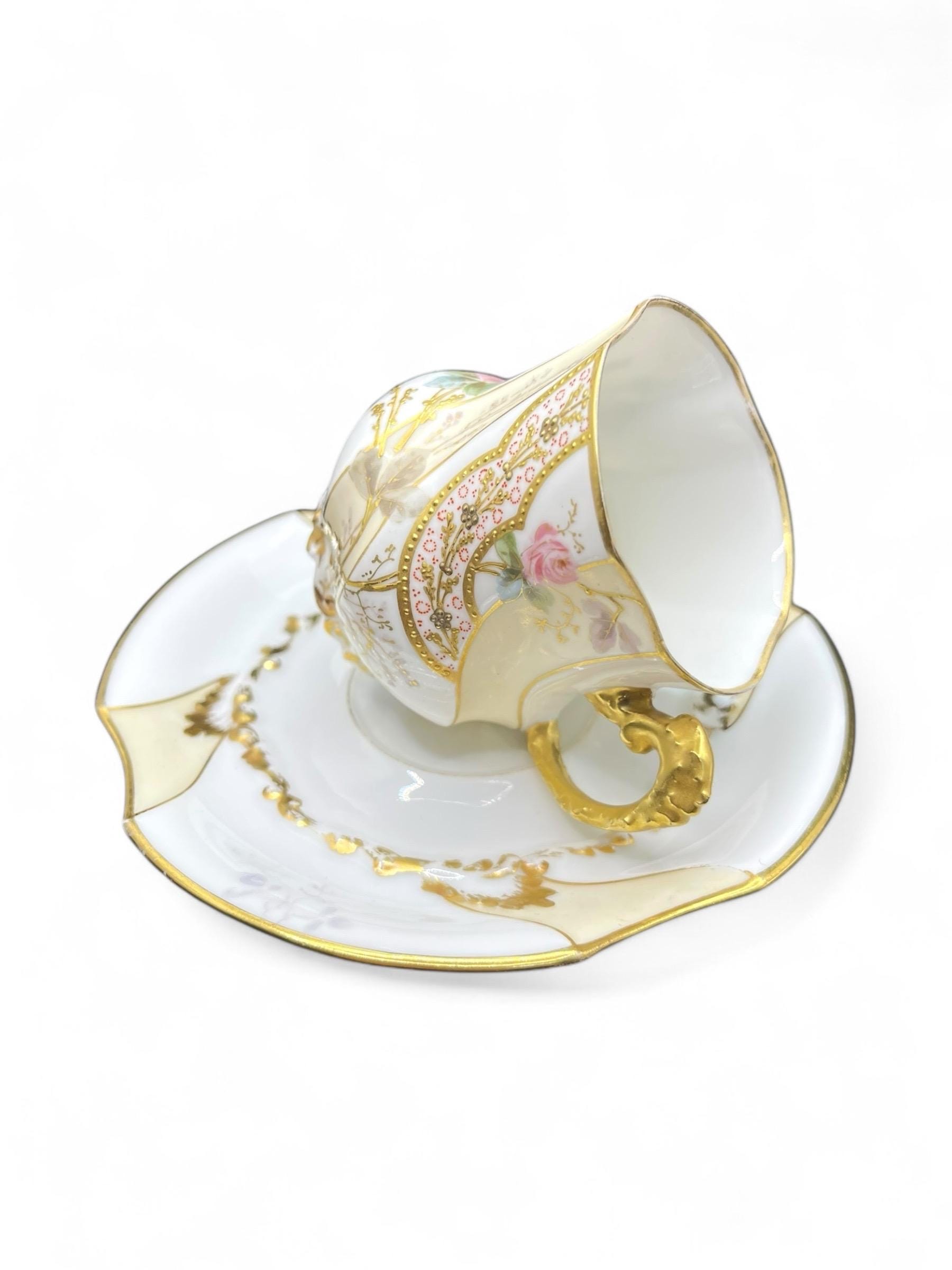 This elegant hand-painted porcelain cup and saucer feature a refined floral motif with gold accents and intricate detailing, reflecting the artistry commonly associated with Limoges porcelain.