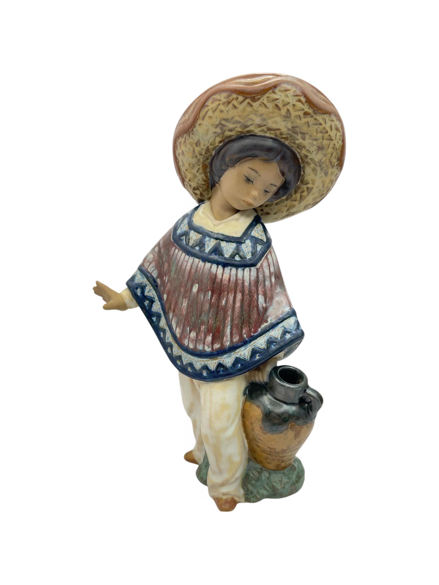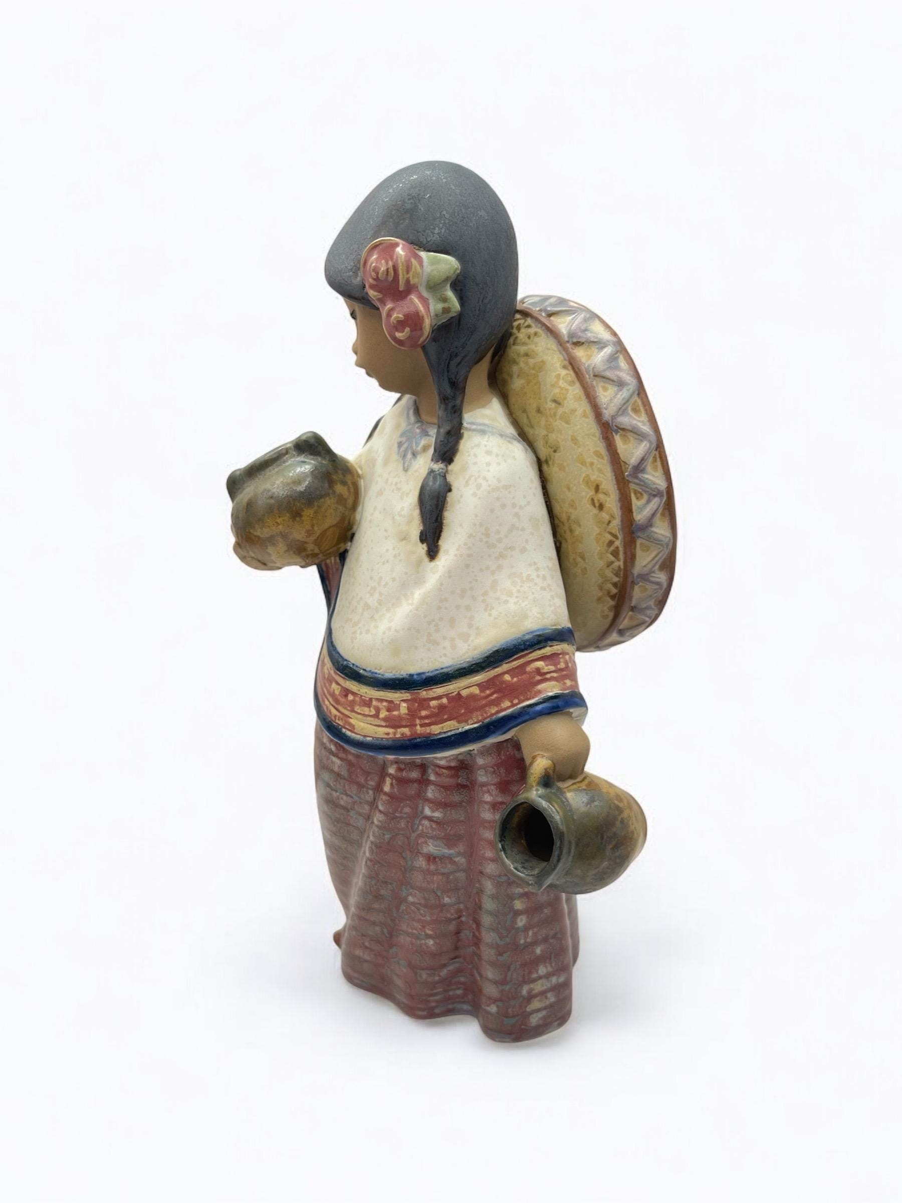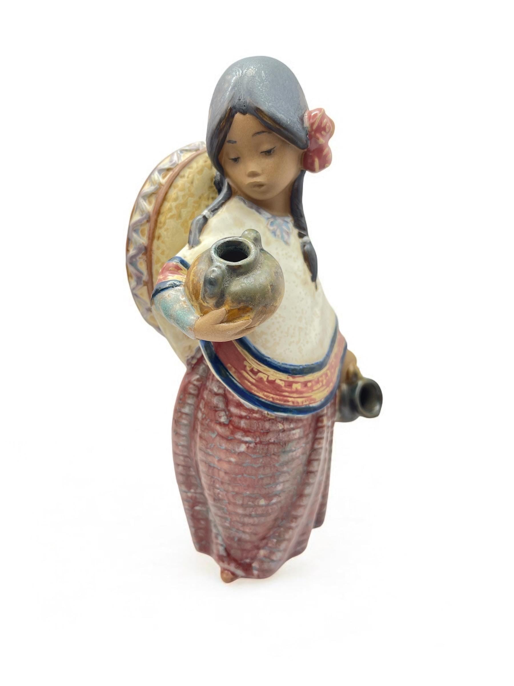 This beautiful Lladró figurine set features model number 2141 Pedro with Jug and model 2140 Pepita with Jugs, both rare and sought-after pieces for collectors. Made of high-quality porcelain, these figurines depict a young boy and girl dressed in traditional attire, each holding water jugs. The multicolor hand-painted design enhances their charm, adding a touch of elegance to any décor.