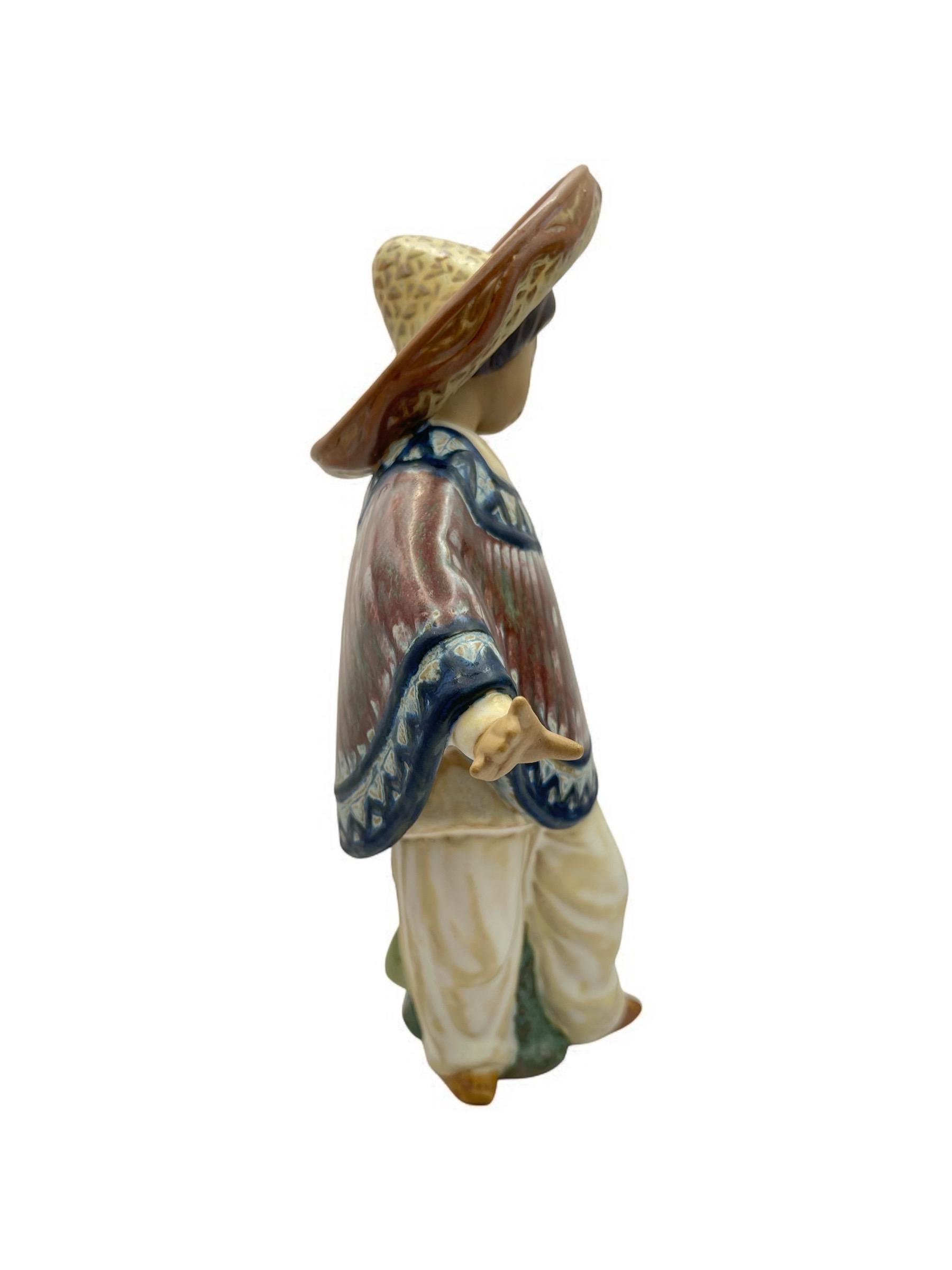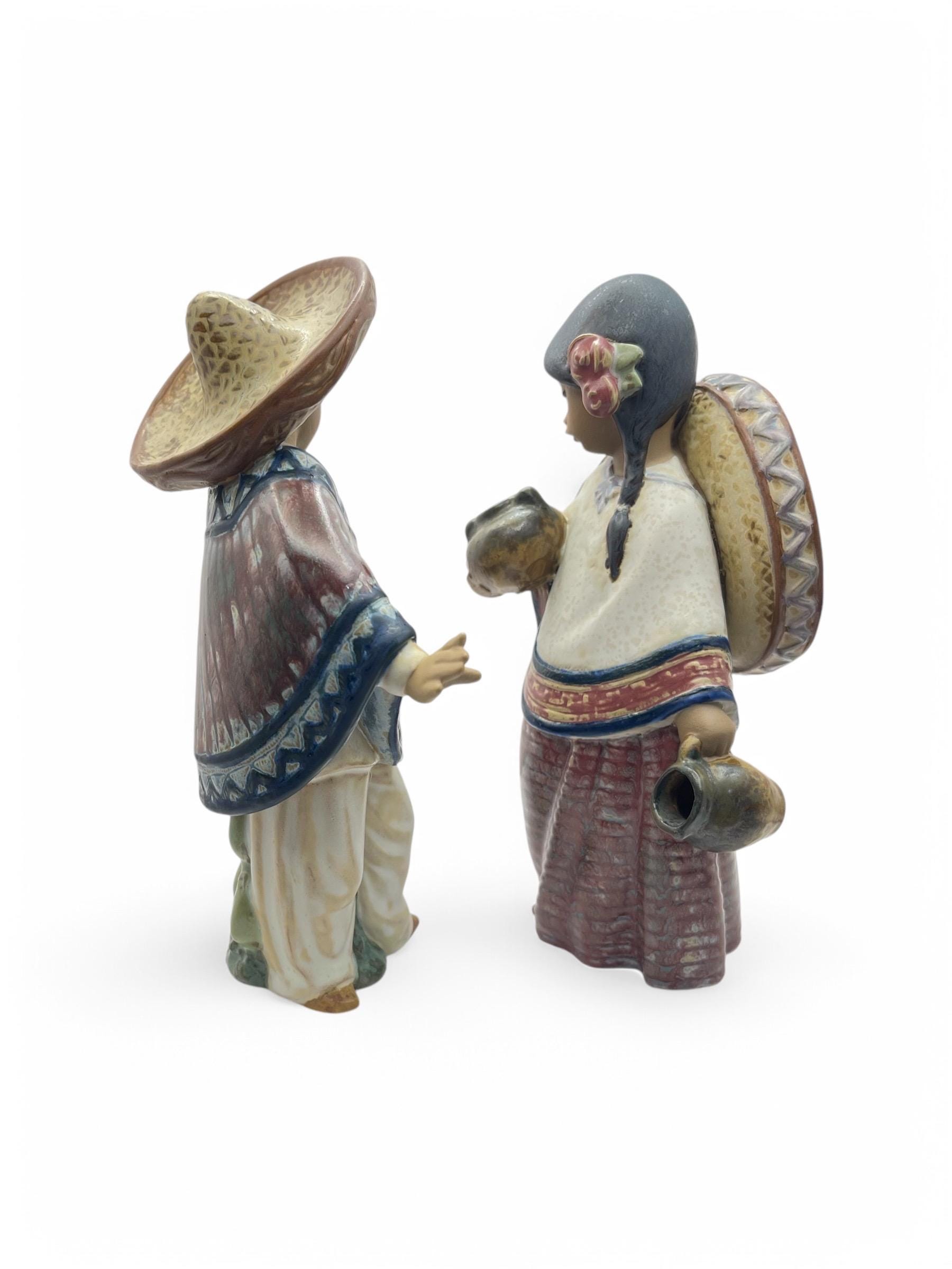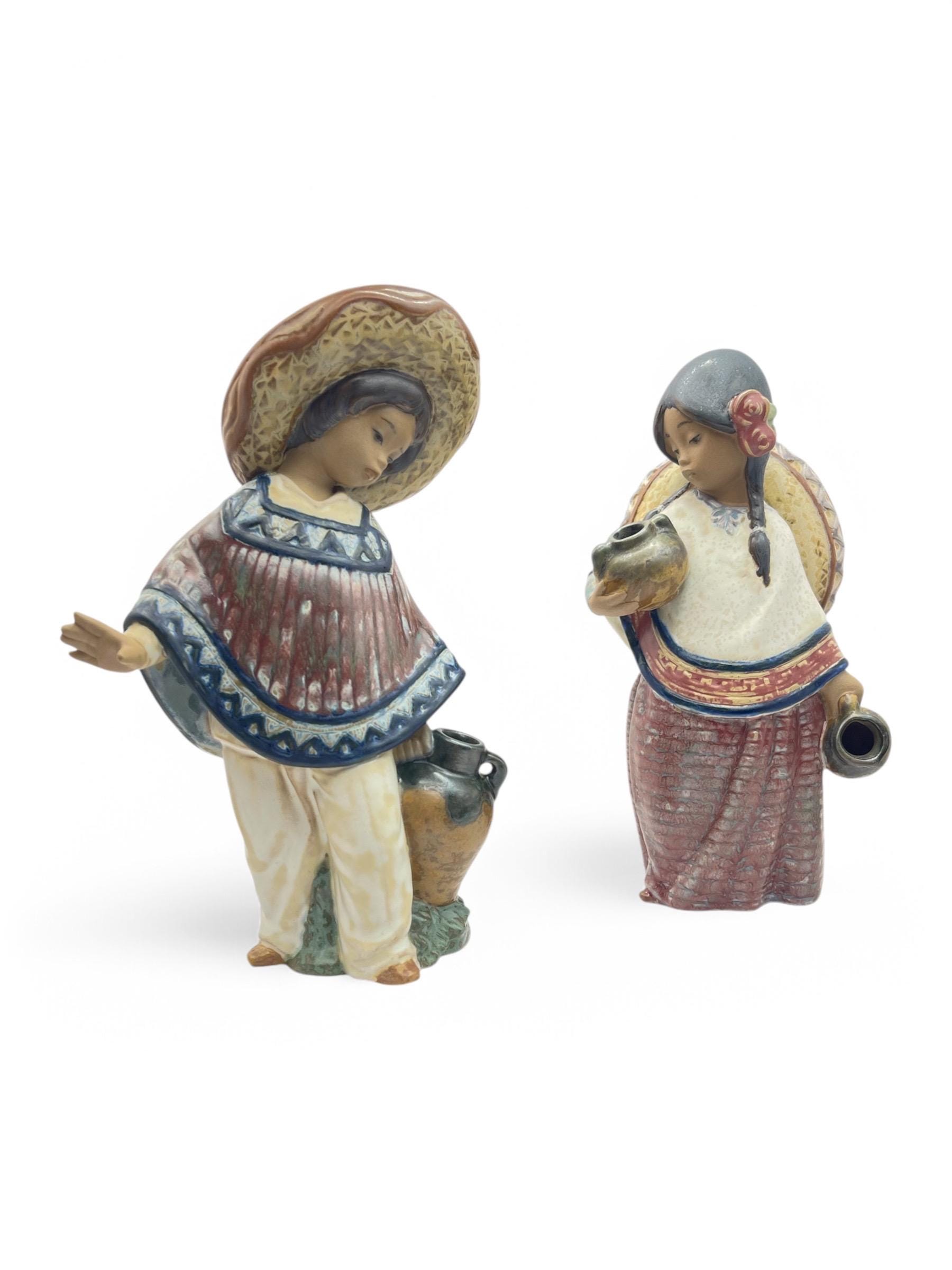 This beautiful Lladró figurine set features model number 2141 Pedro with Jug and model 2140 Pepita with Jugs, both rare and sought-after pieces for collectors. Made of high-quality porcelain, these figurines depict a young boy and girl dressed in traditional attire, each holding water jugs. The multicolor hand-painted design enhances their charm, adding a touch of elegance to any décor.