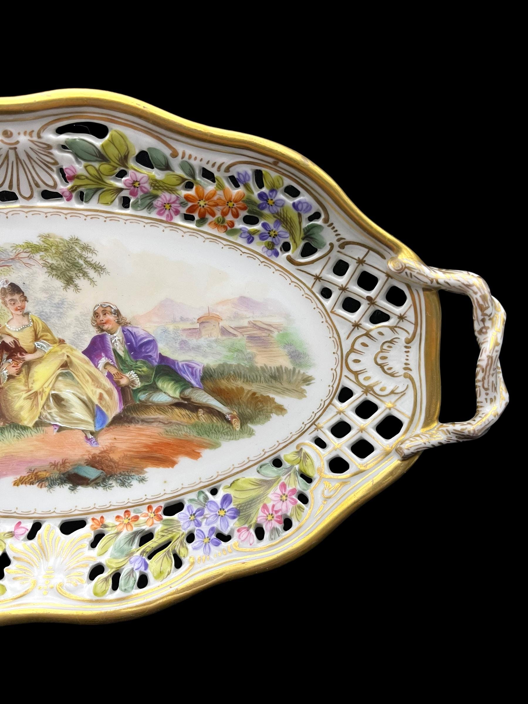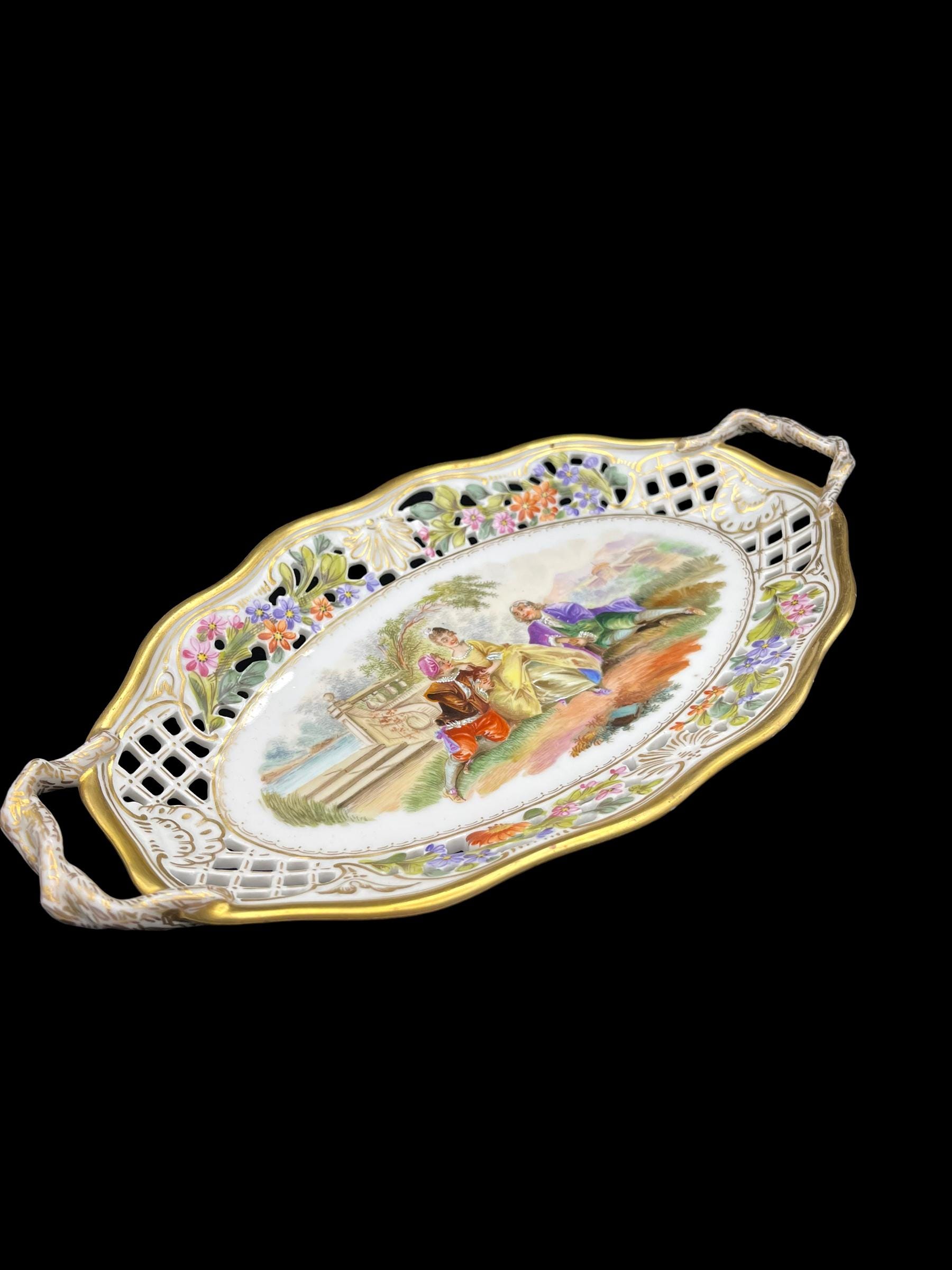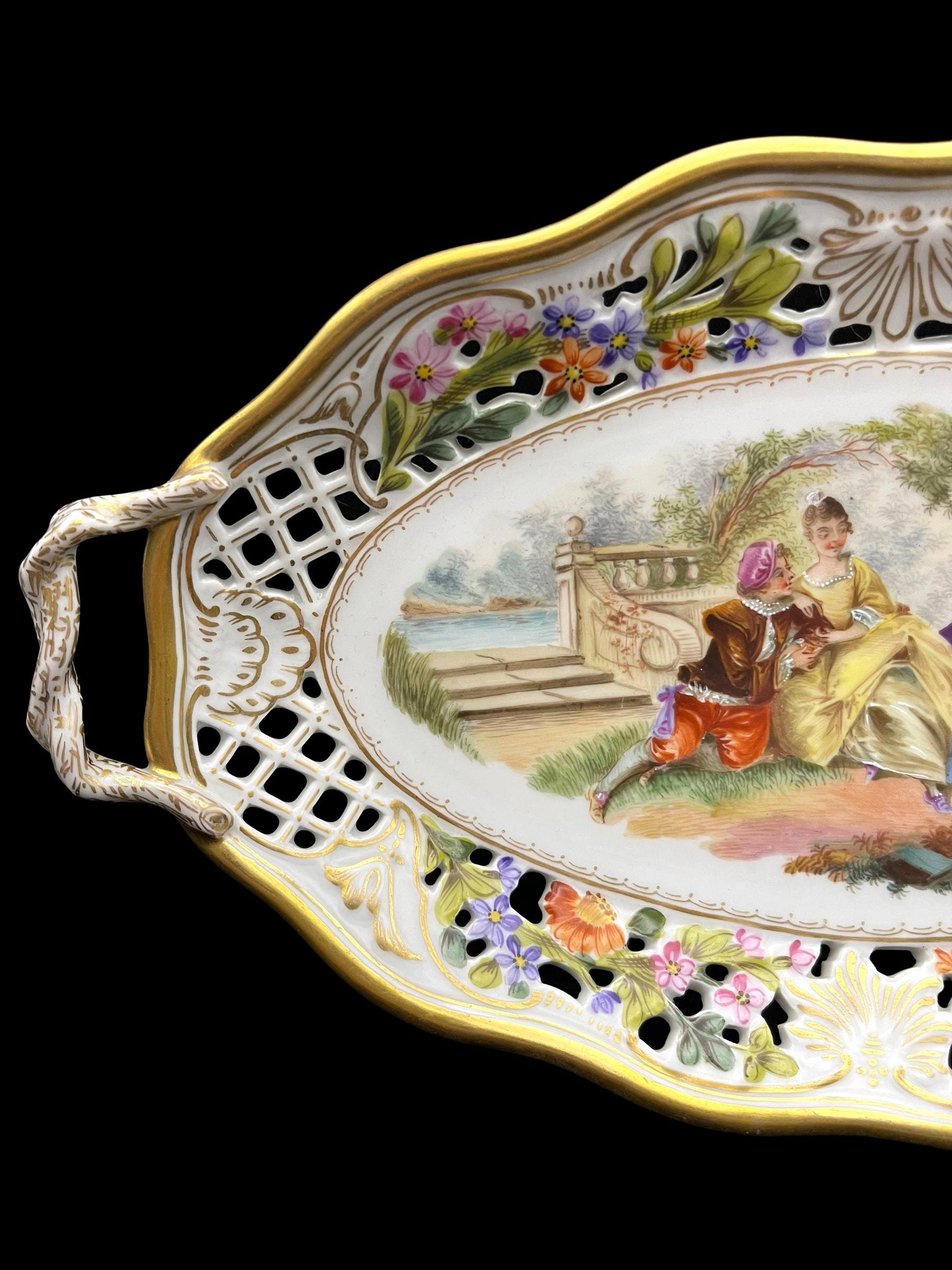 This exquisite Carl Thieme Potschappel Dresden porcelain tray, dating from the early 1900s, features a delicate reticulated design adorned with hand-painted floral motifs and a charming courting scene at its center. The vibrant colors and intricate detailing reflect the exceptional craftsmanship of Potschappel Dresden, making this a standout piece in any porcelain collection. The tray’s ornate handles add a touch of elegance, making it perfect for both display and functional use.