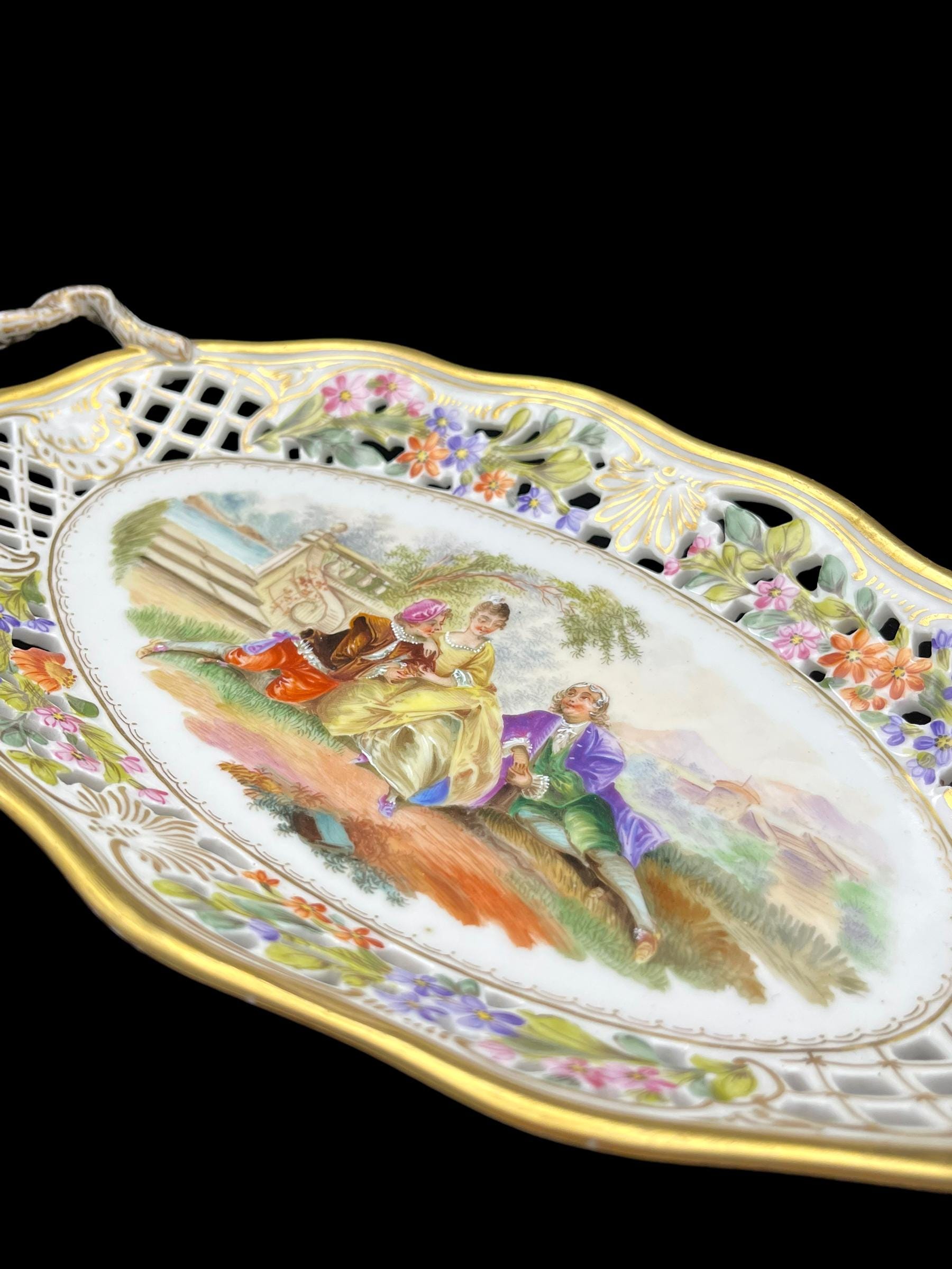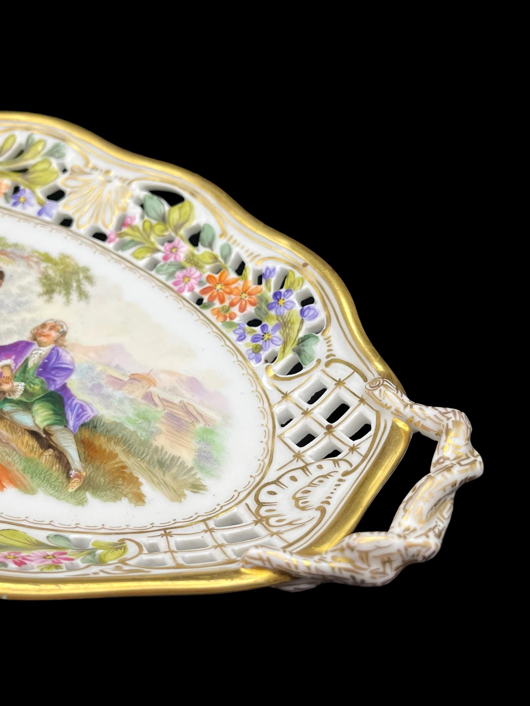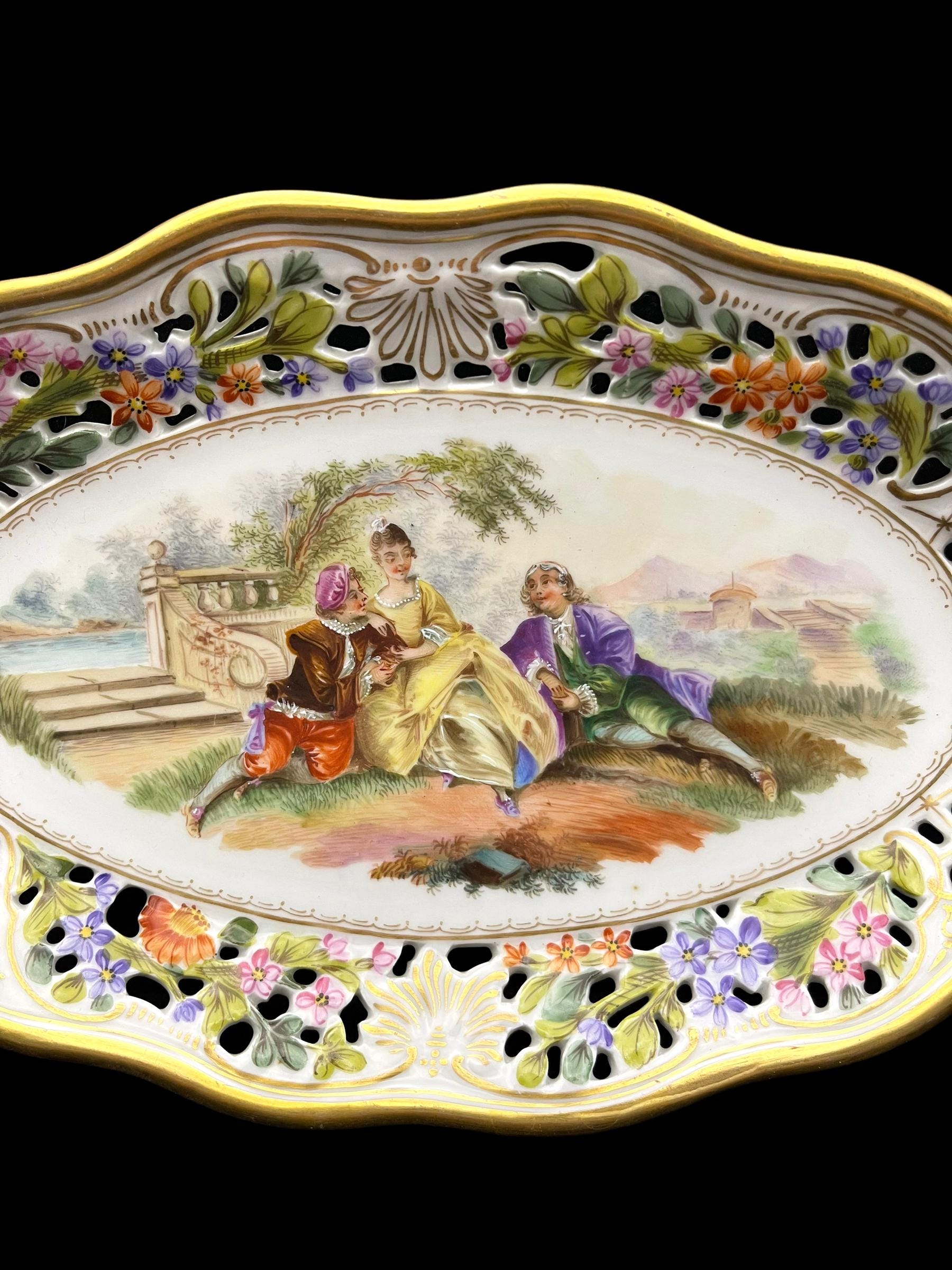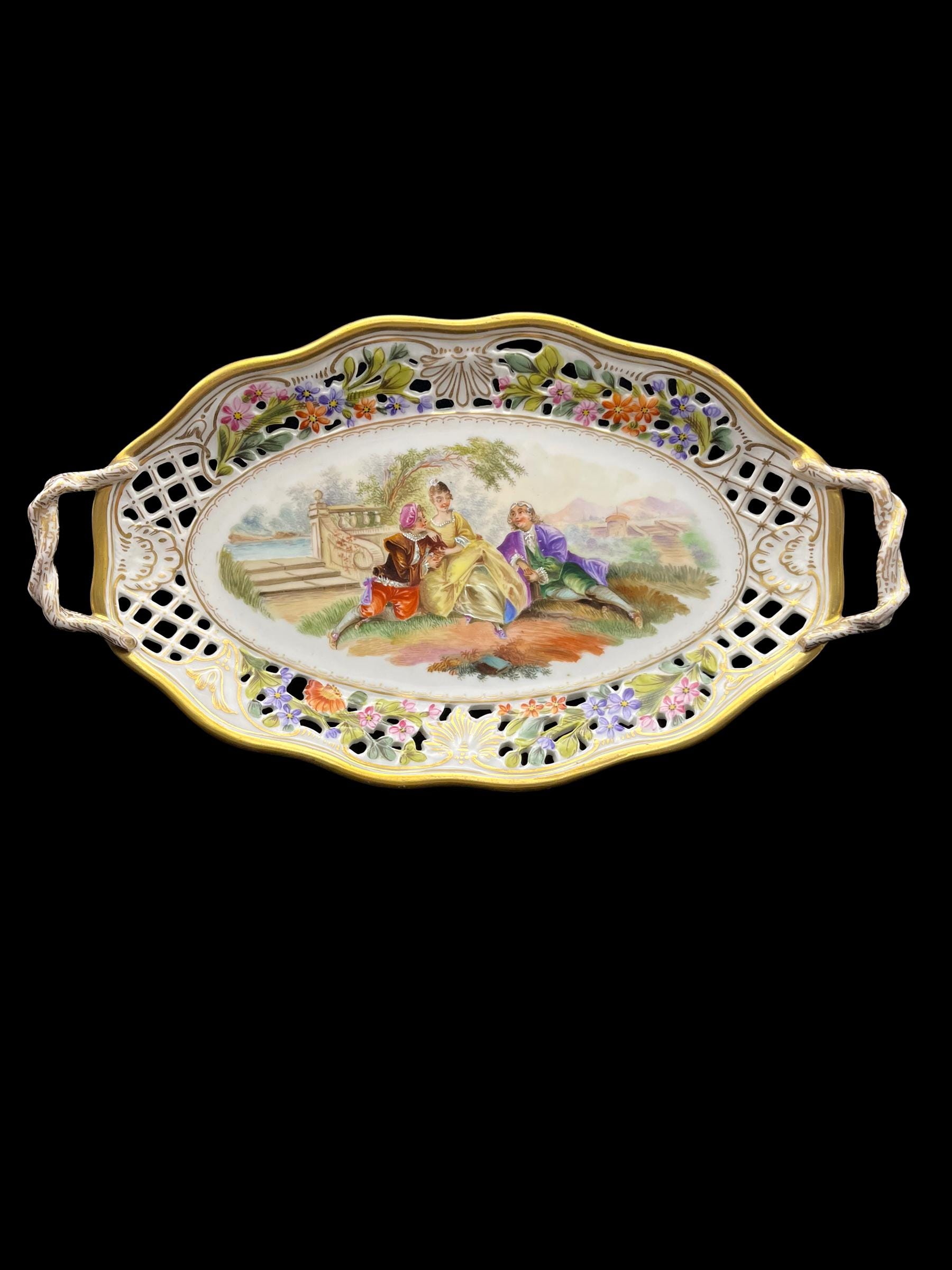 This exquisite Carl Thieme Potschappel Dresden porcelain tray, dating from the early 1900s, features a delicate reticulated design adorned with hand-painted floral motifs and a charming courting scene at its center. The vibrant colors and intricate detailing reflect the exceptional craftsmanship of Potschappel Dresden, making this a standout piece in any porcelain collection. The tray’s ornate handles add a touch of elegance, making it perfect for both display and functional use.