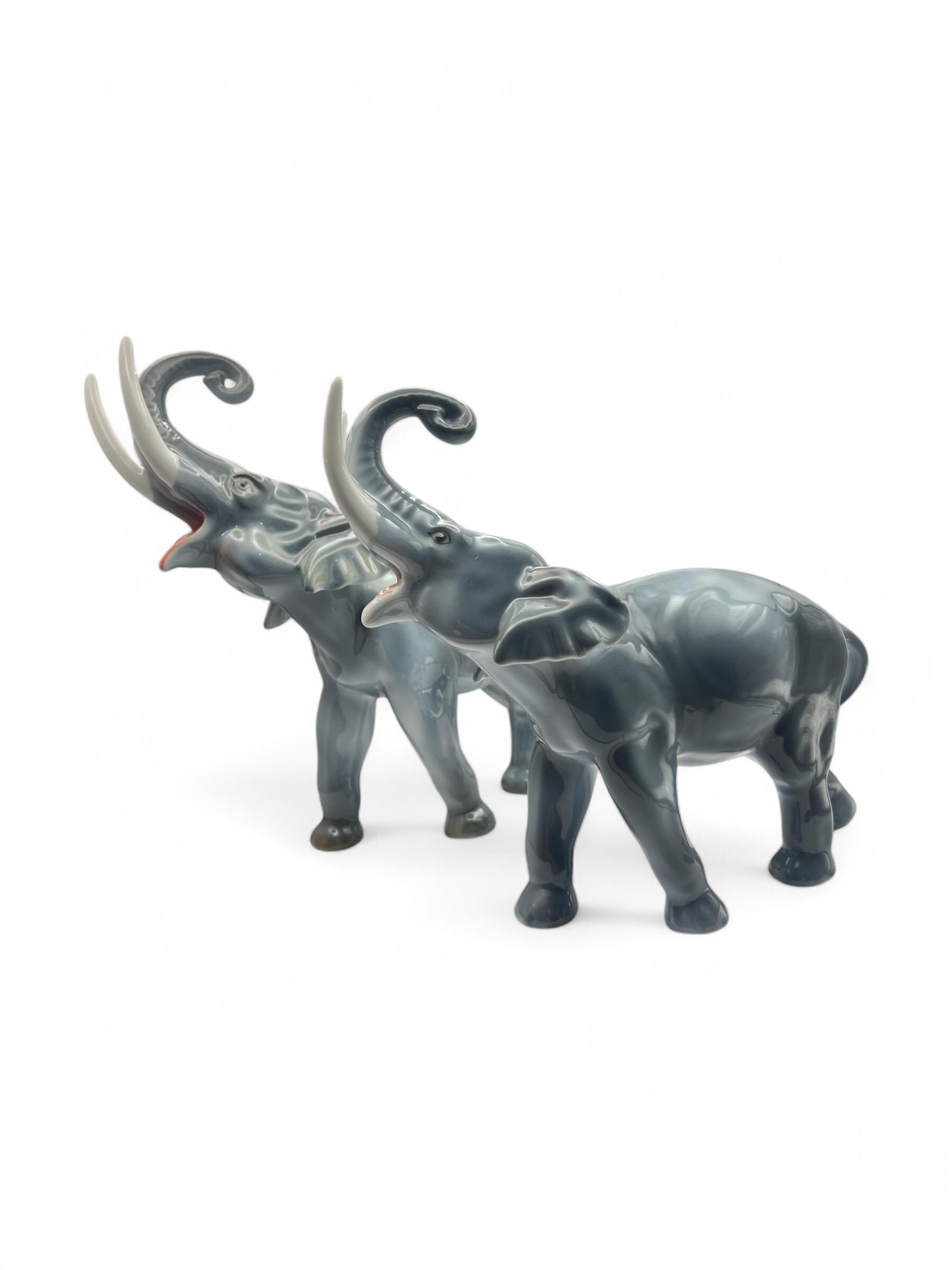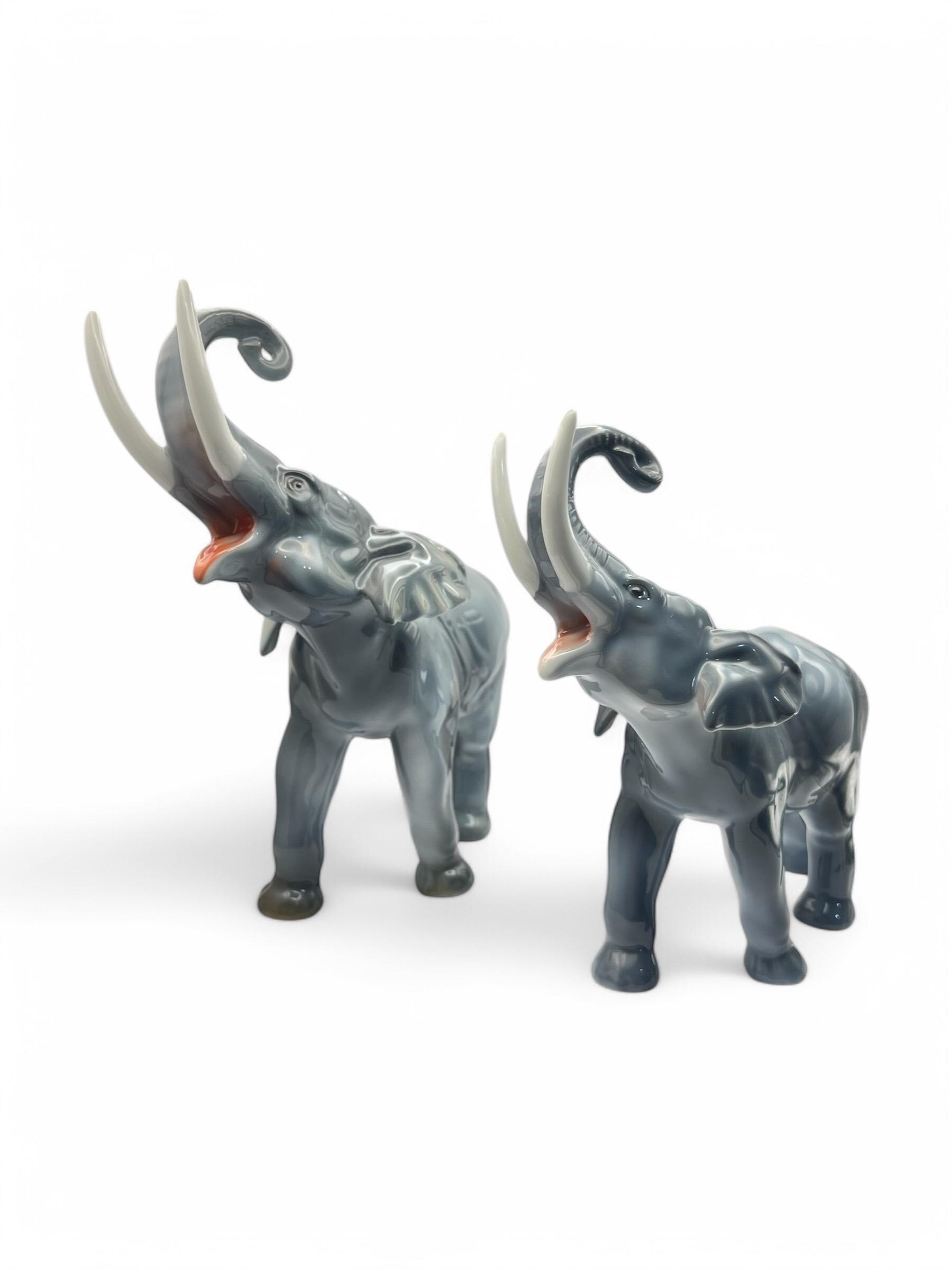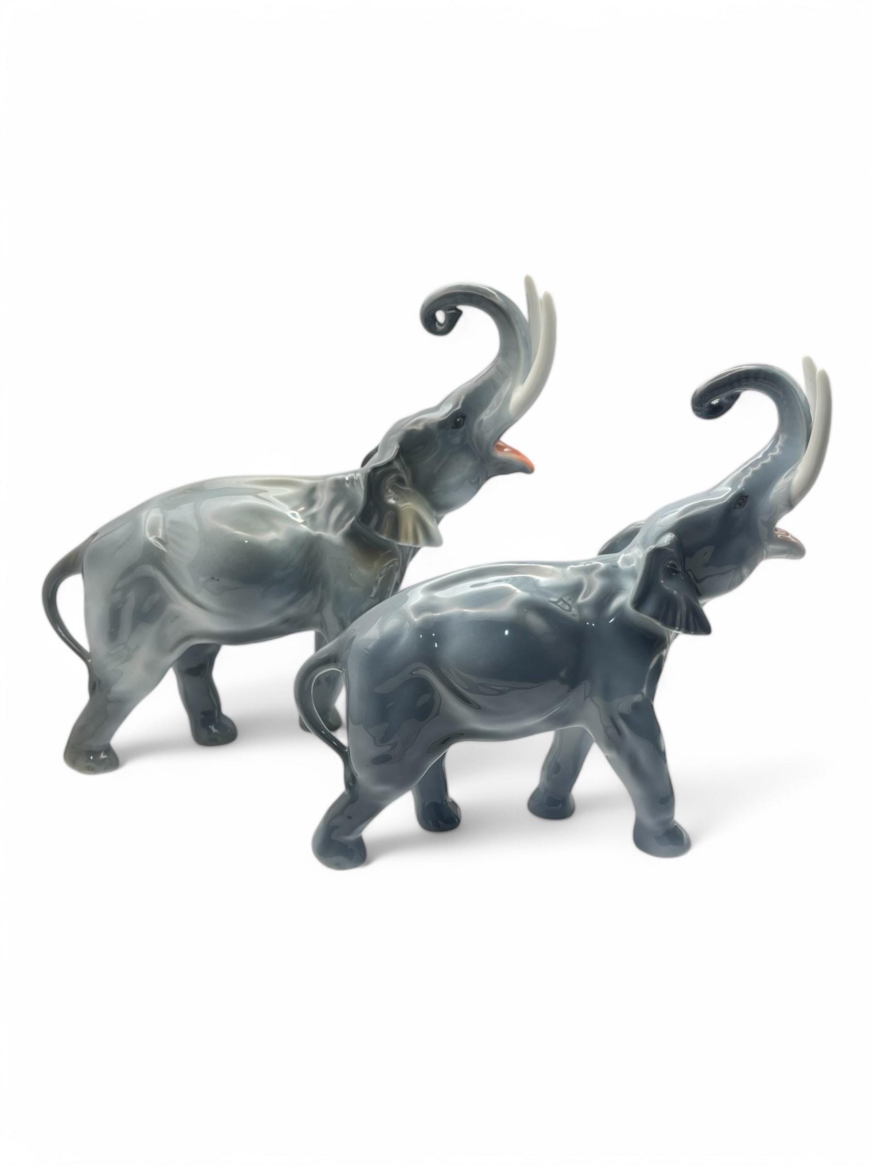 A refined pair of porcelain elephant figurines crafted by Wallendorf Schaubach Kunst of Germany, known for their exceptional craftsmanship and attention to detail. With trunks raised high, these elephants are said to bring good luck and positive energy to any space.