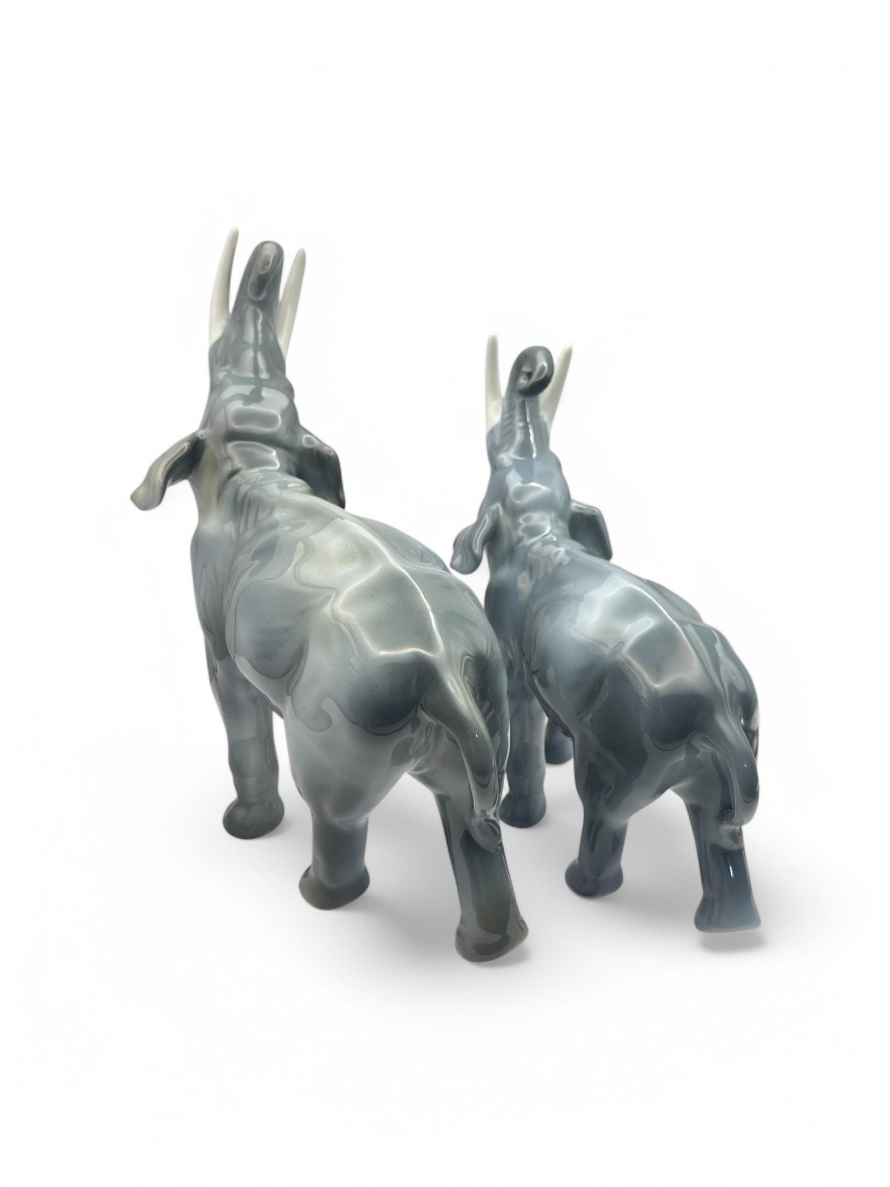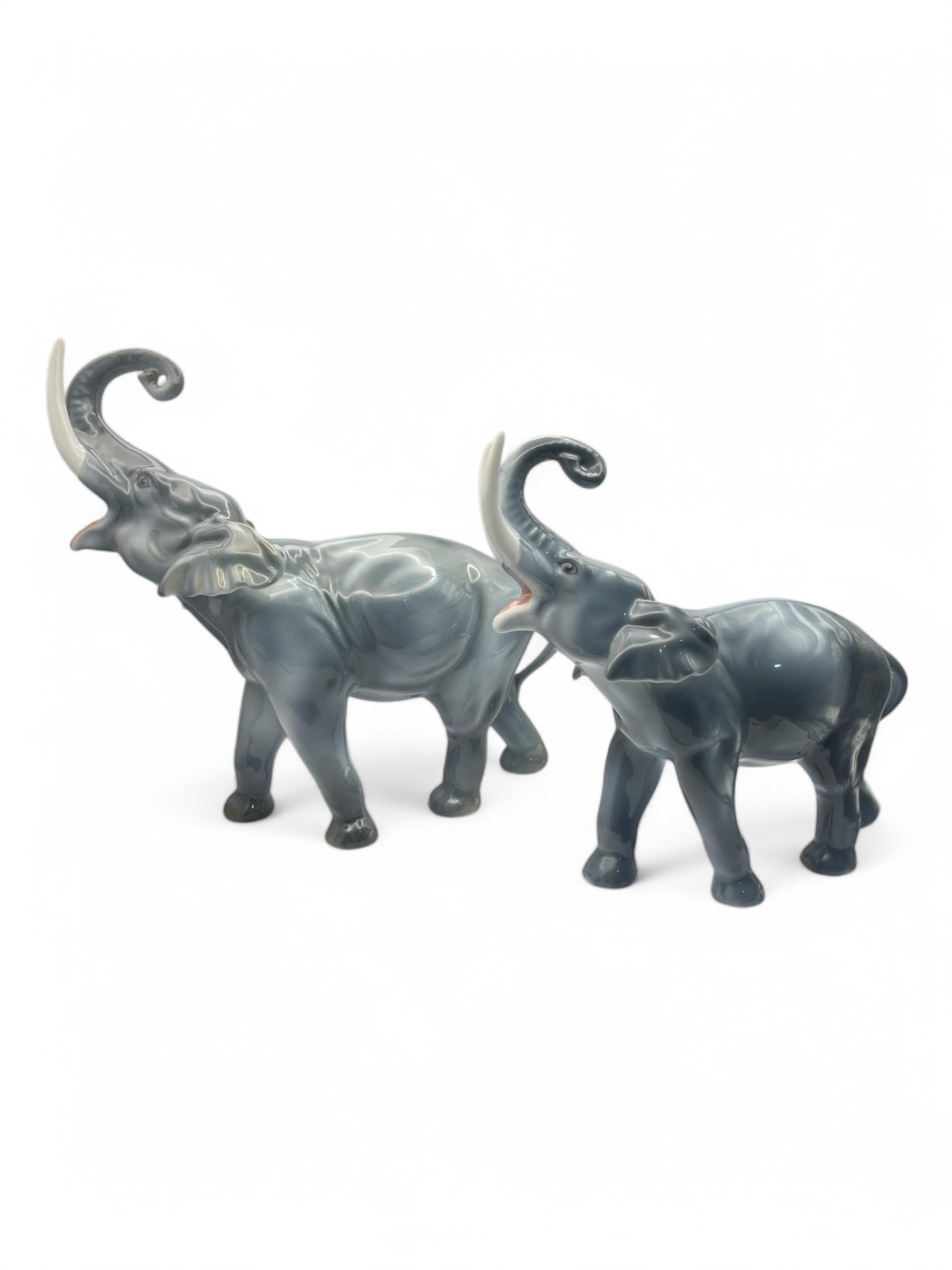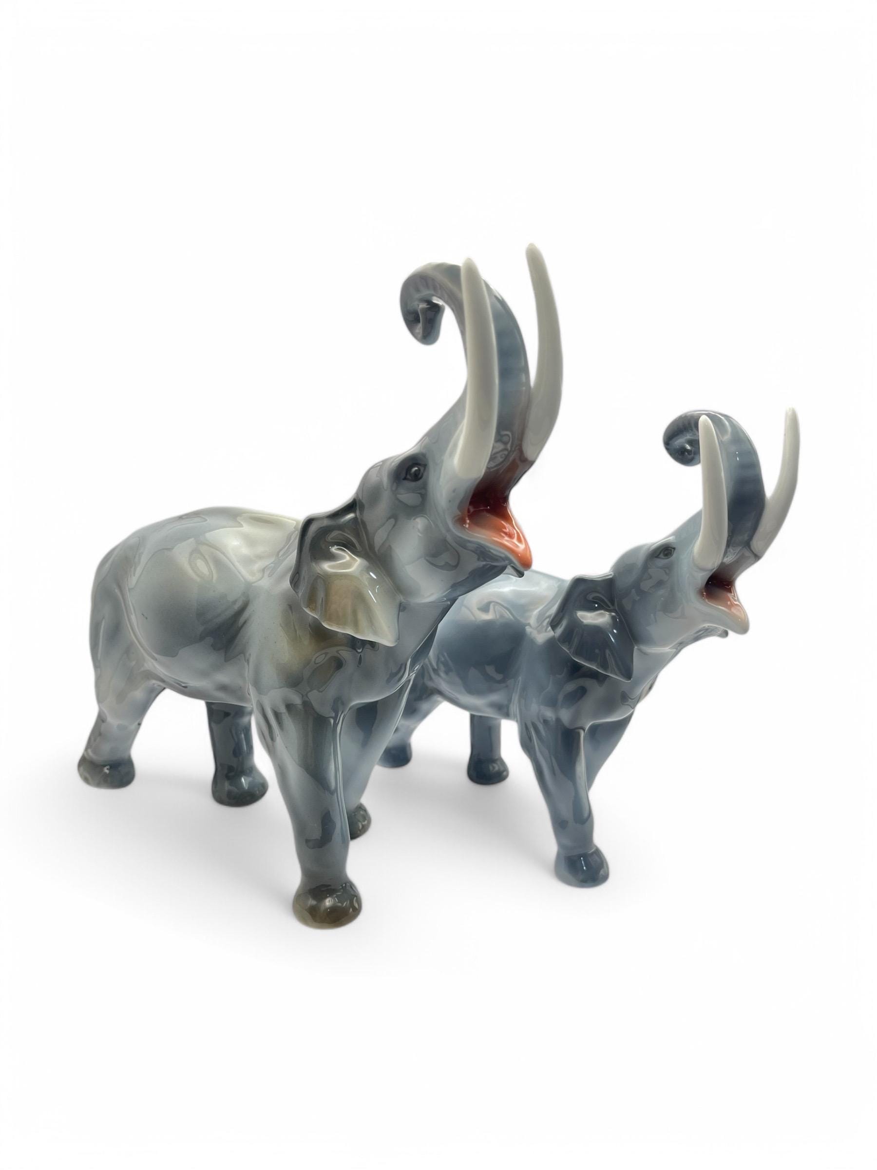 A refined pair of porcelain elephant figurines crafted by Wallendorf Schaubach Kunst of Germany, known for their exceptional craftsmanship and attention to detail. With trunks raised high, these elephants are said to bring good luck and positive energy to any space.