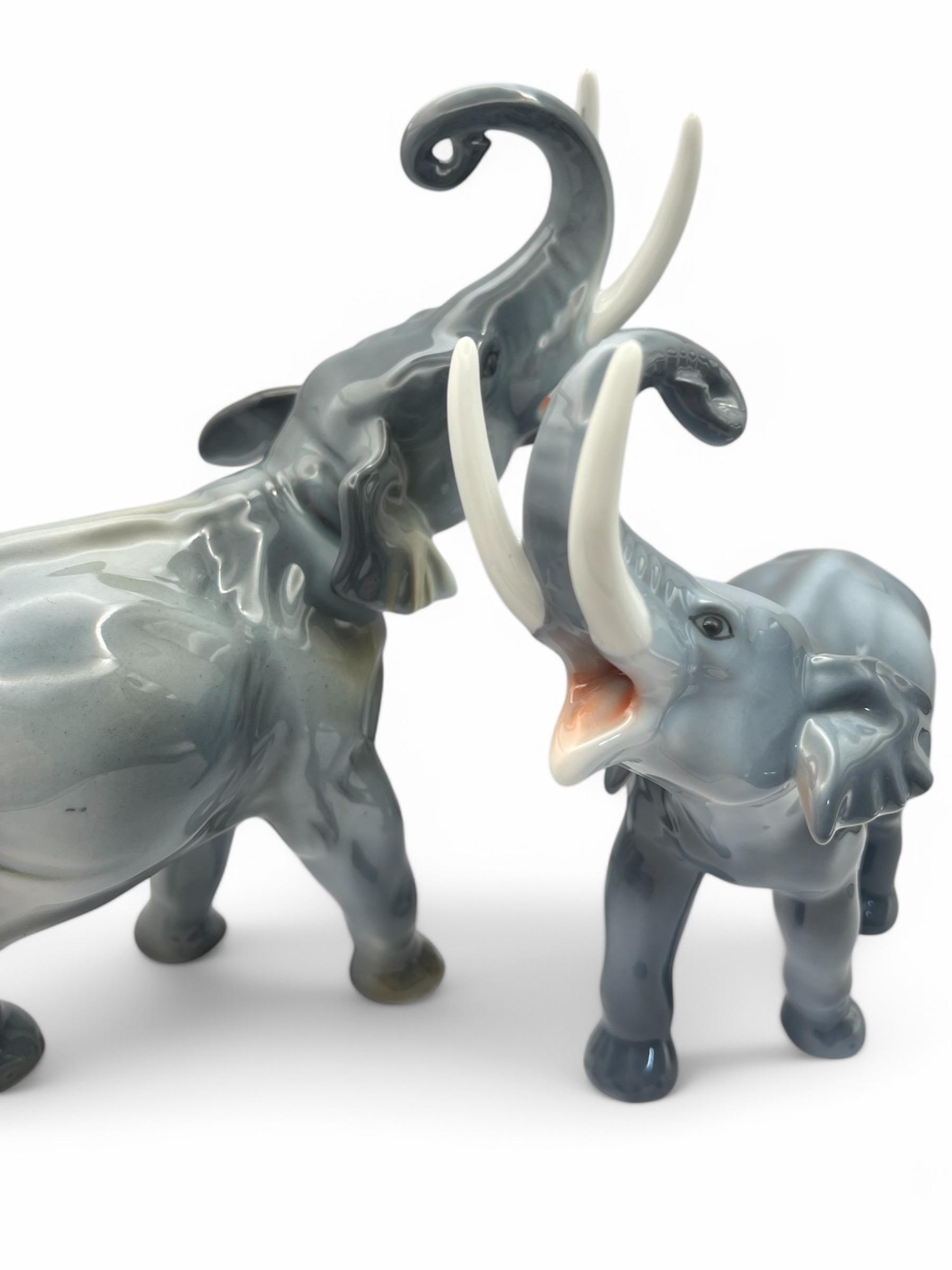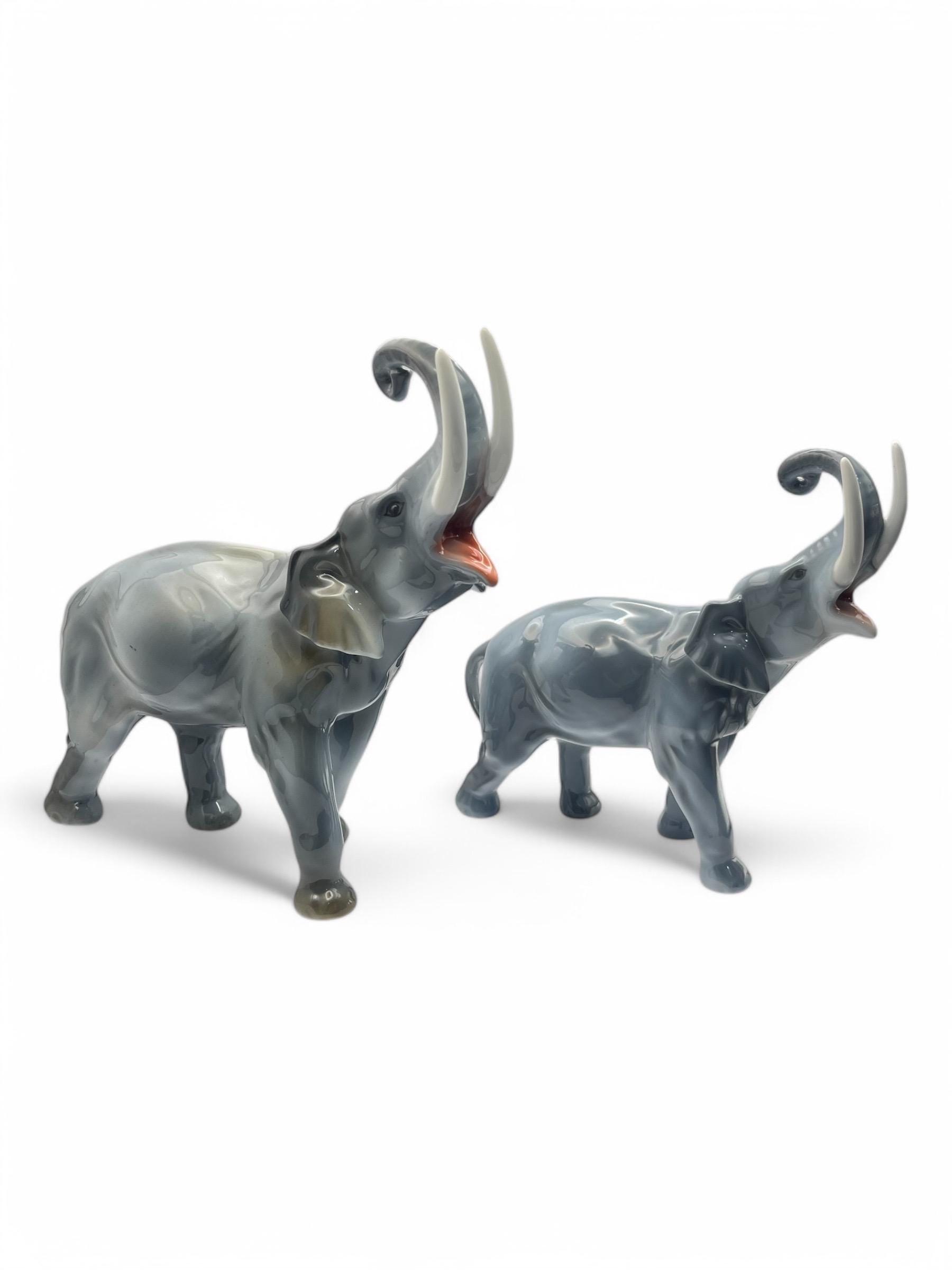 The larger elephant measures approximately 21 cm (8 1/4 inches) in height and 22 cm (8 3/4 inches) in width. The smaller elephant stands about 17 cm (6 3/4 inches) tall and 19 cm (7 1/2 inches) wide.