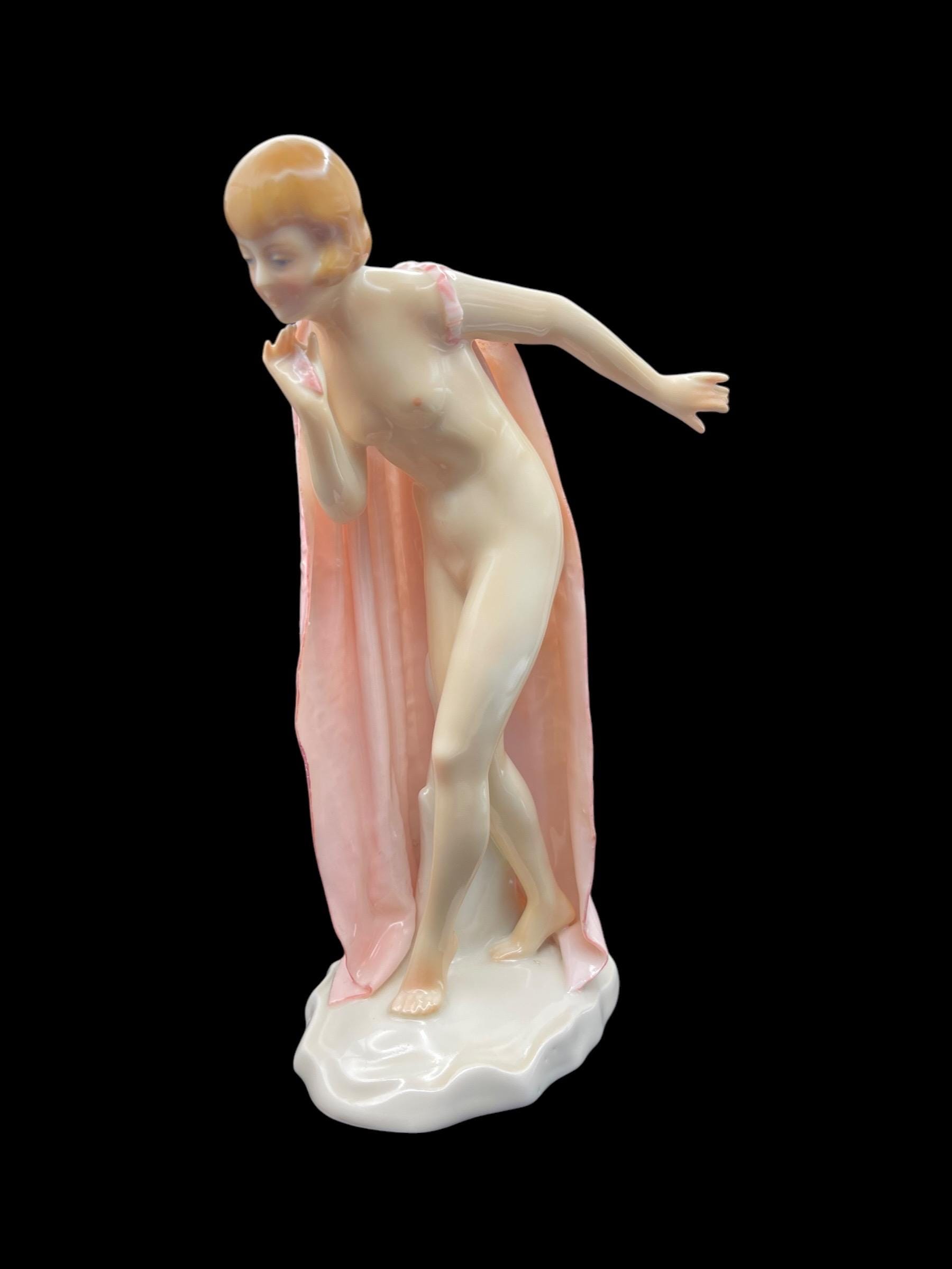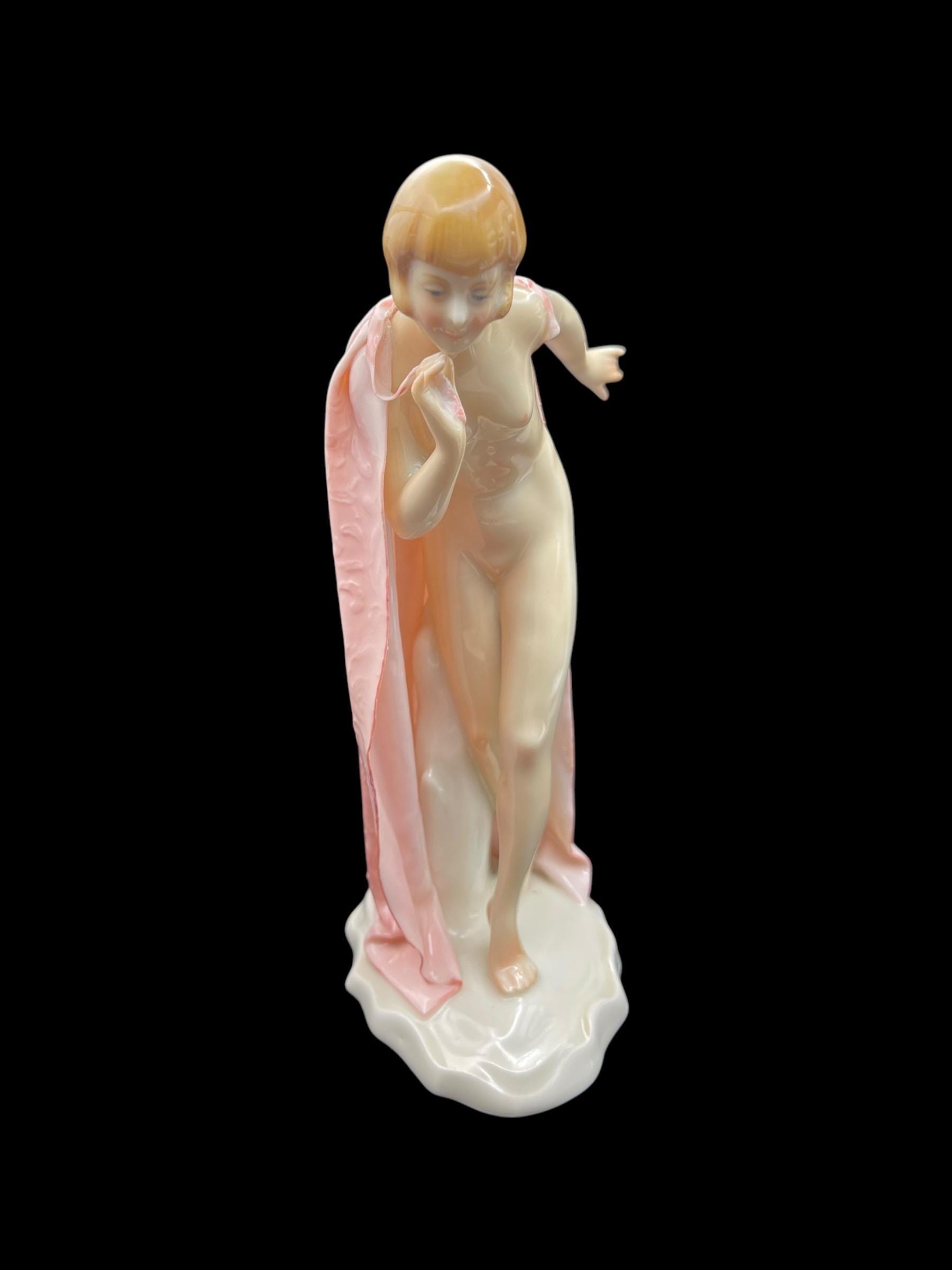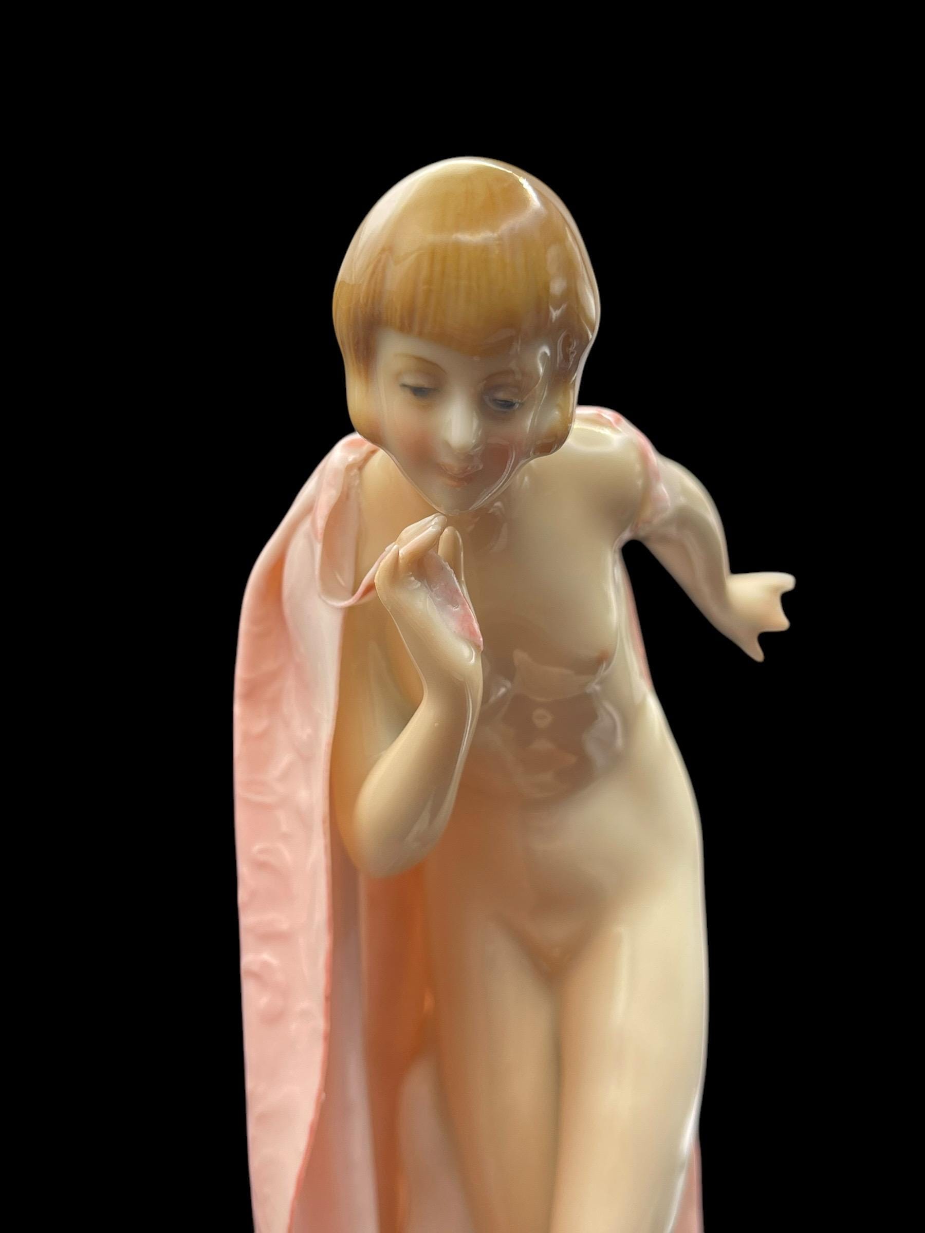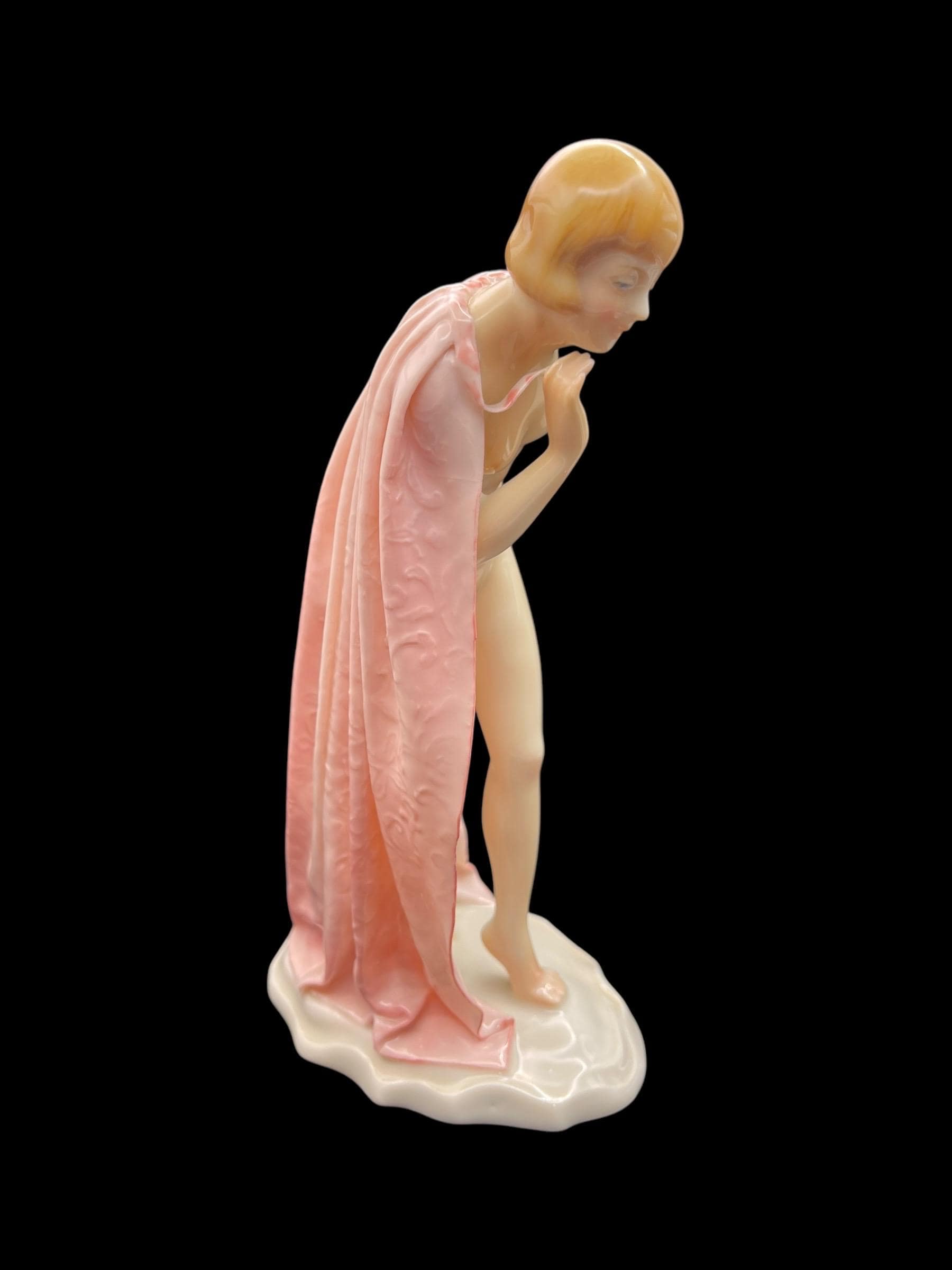 This elegant porcelain figurine by Karl Ens captures a young nude girl gracefully wrapped in a soft pink robe. With her delicate posture and Art Deco-inspired haircut, she embodies early 20th-century European charm. Crafted in Volkstedt, Thuringia, Germany, this piece showcases the masterful hand-painting and glazing techniques typical of Karl Ens porcelain. The robe features intricate raised detailing and a gentle, flowing texture that enhances the figurine’s ethereal beauty.