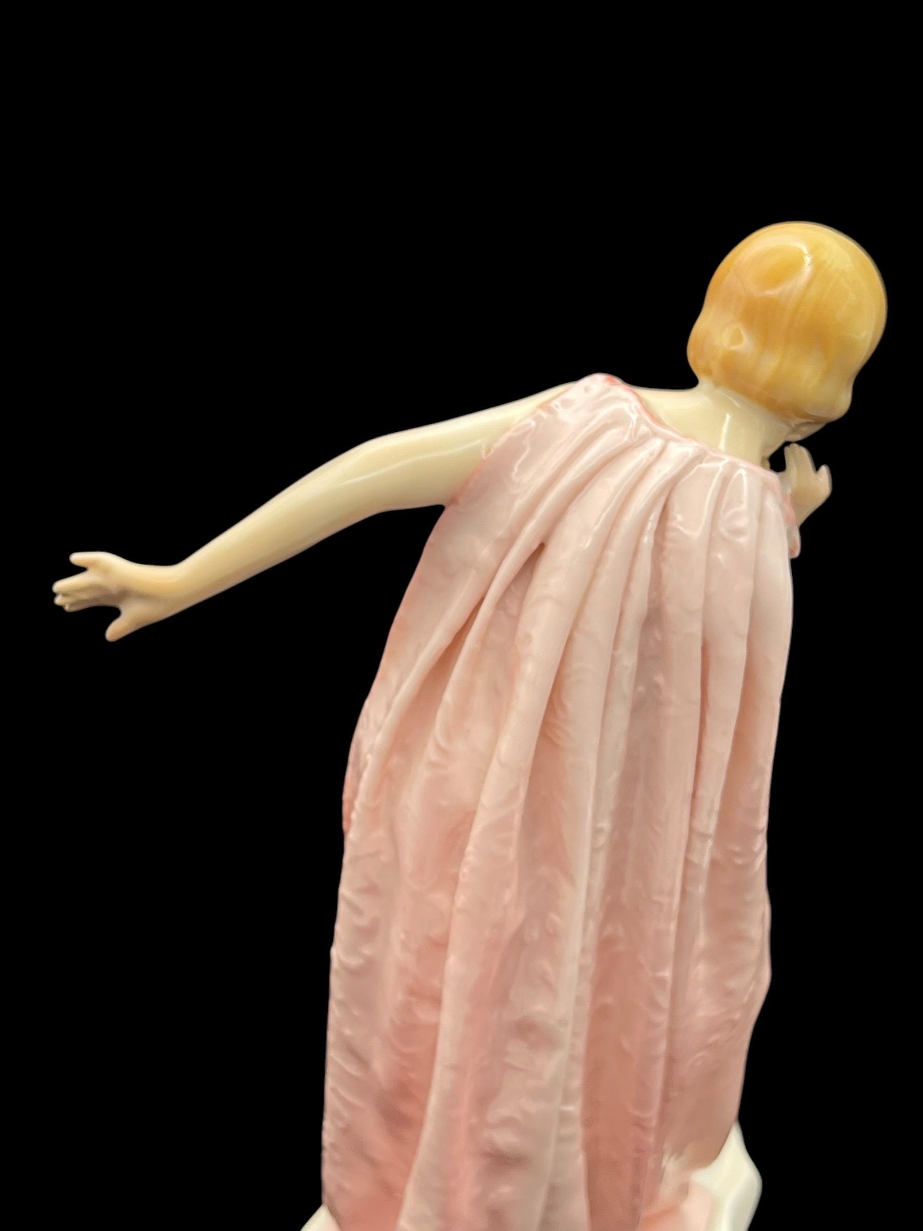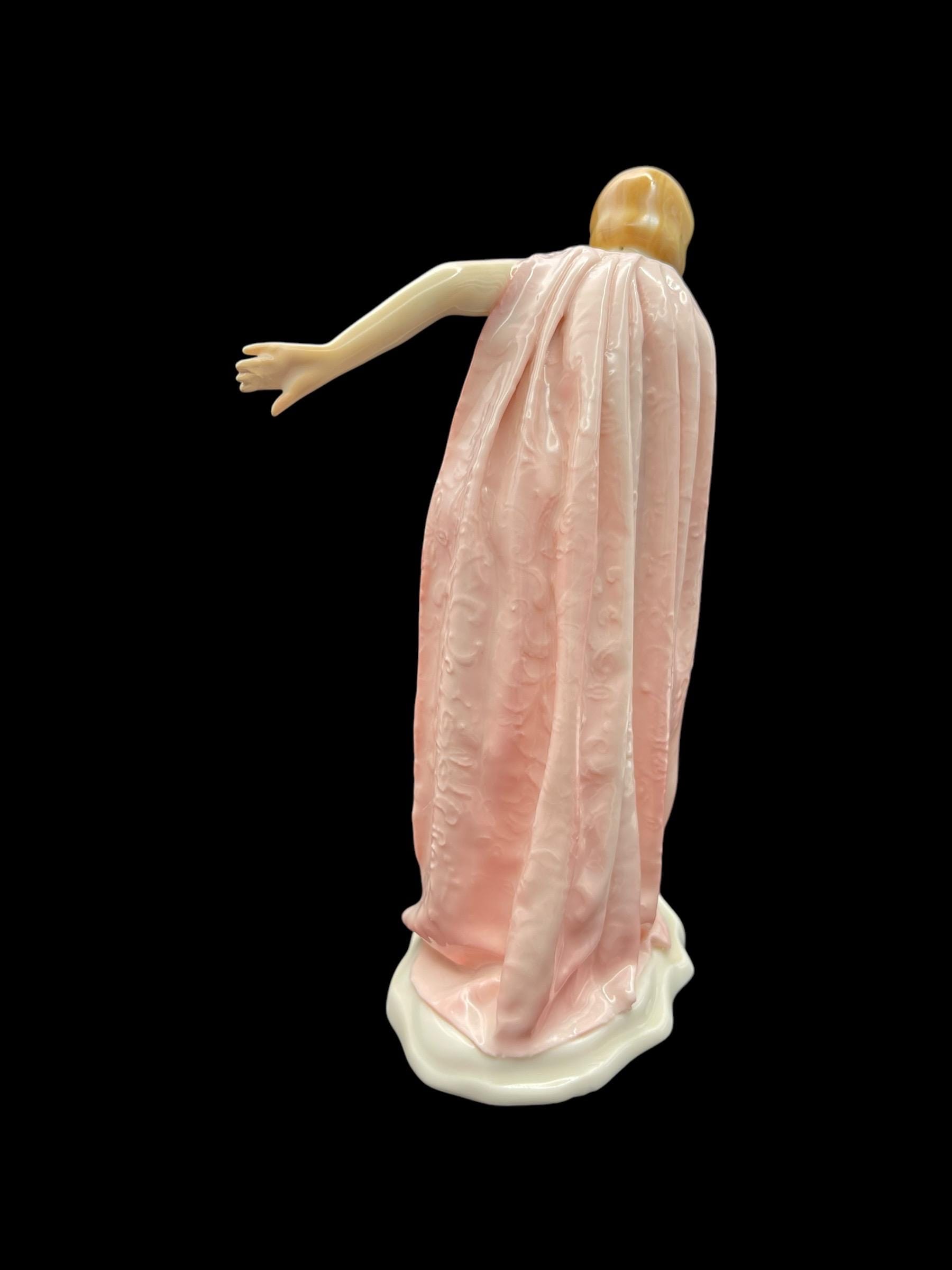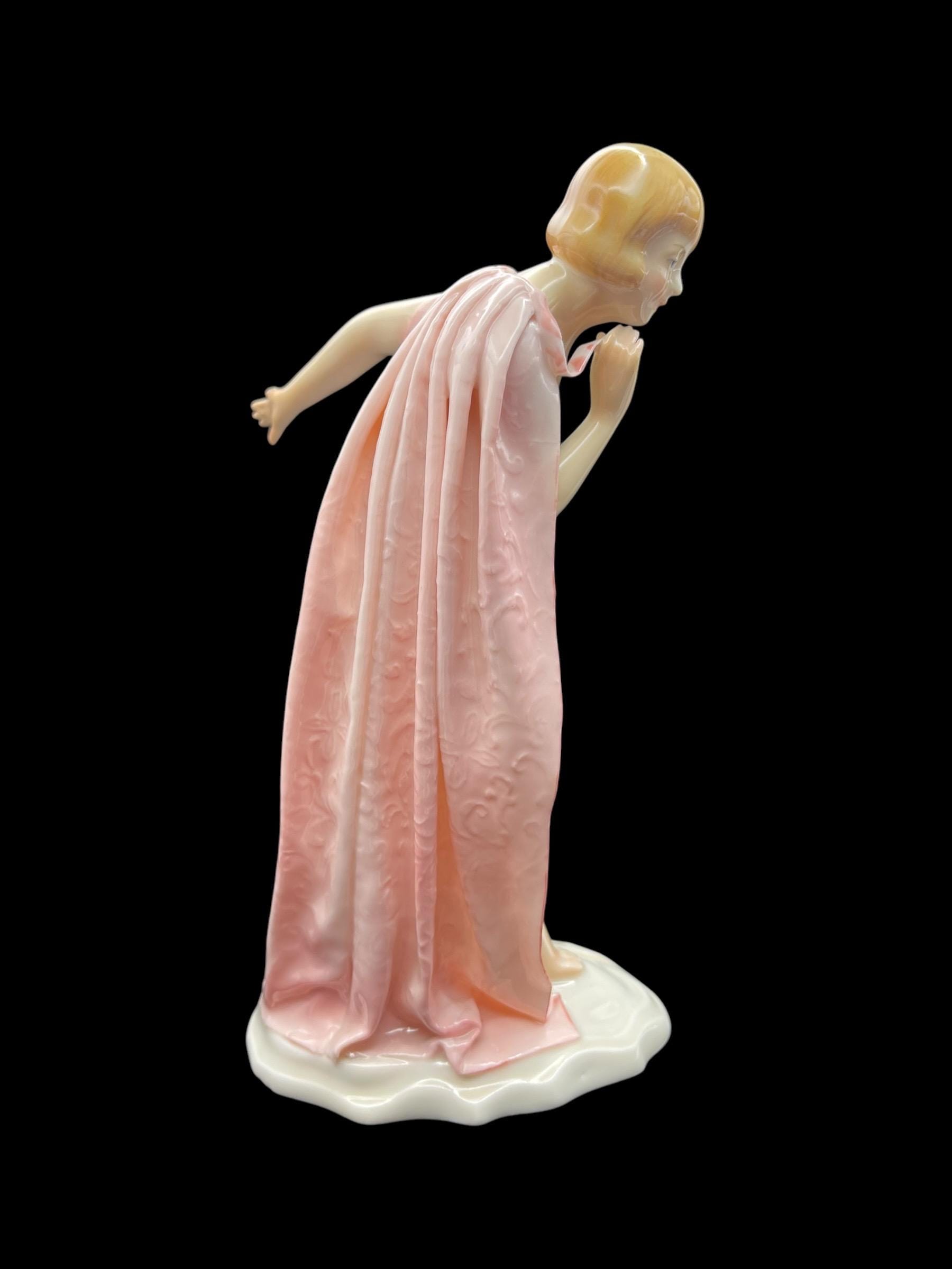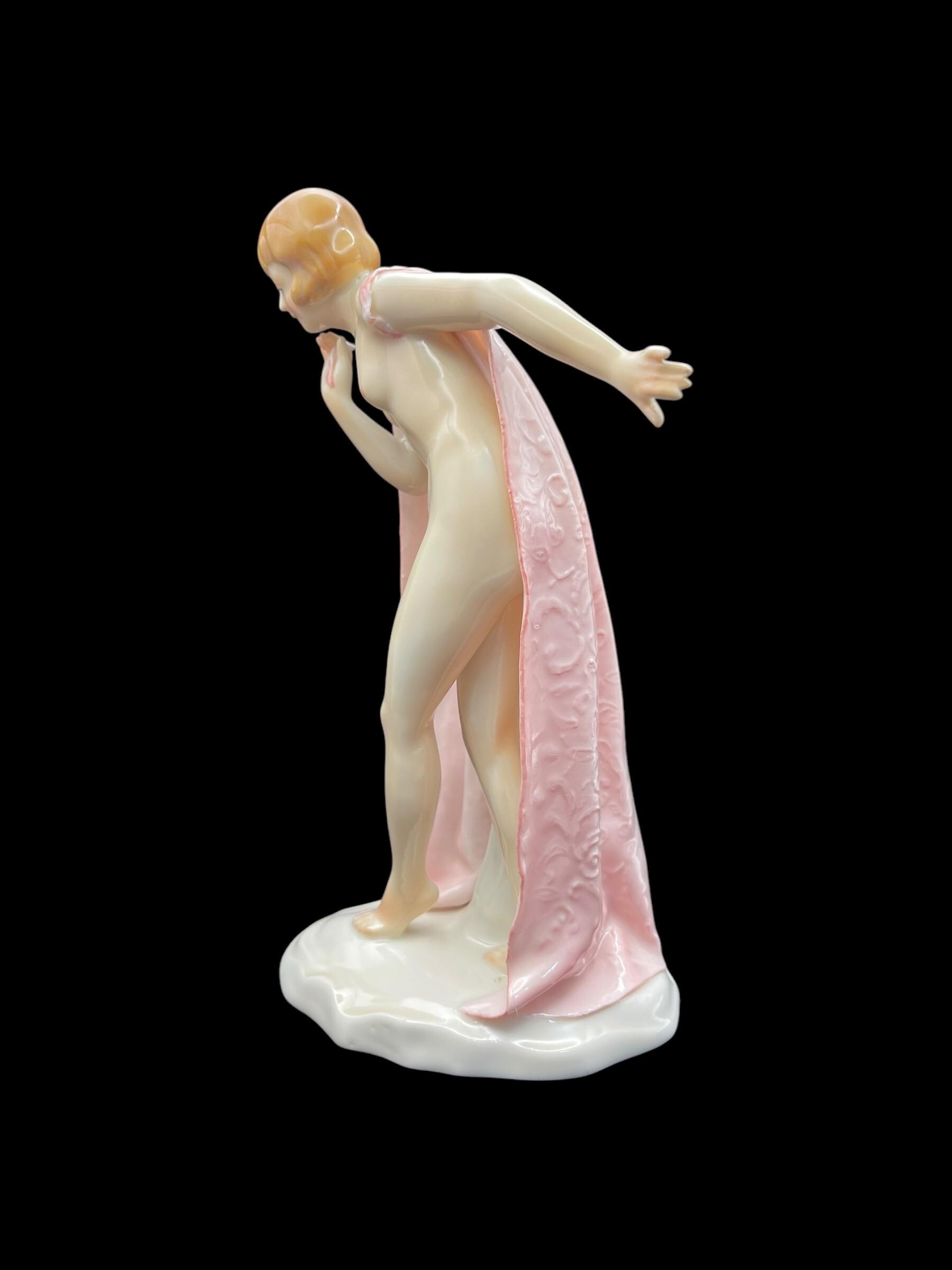 This elegant porcelain figurine by Karl Ens captures a young nude girl gracefully wrapped in a soft pink robe. With her delicate posture and Art Deco-inspired haircut, she embodies early 20th-century European charm. Crafted in Volkstedt, Thuringia, Germany, this piece showcases the masterful hand-painting and glazing techniques typical of Karl Ens porcelain. The robe features intricate raised detailing and a gentle, flowing texture that enhances the figurine’s ethereal beauty.